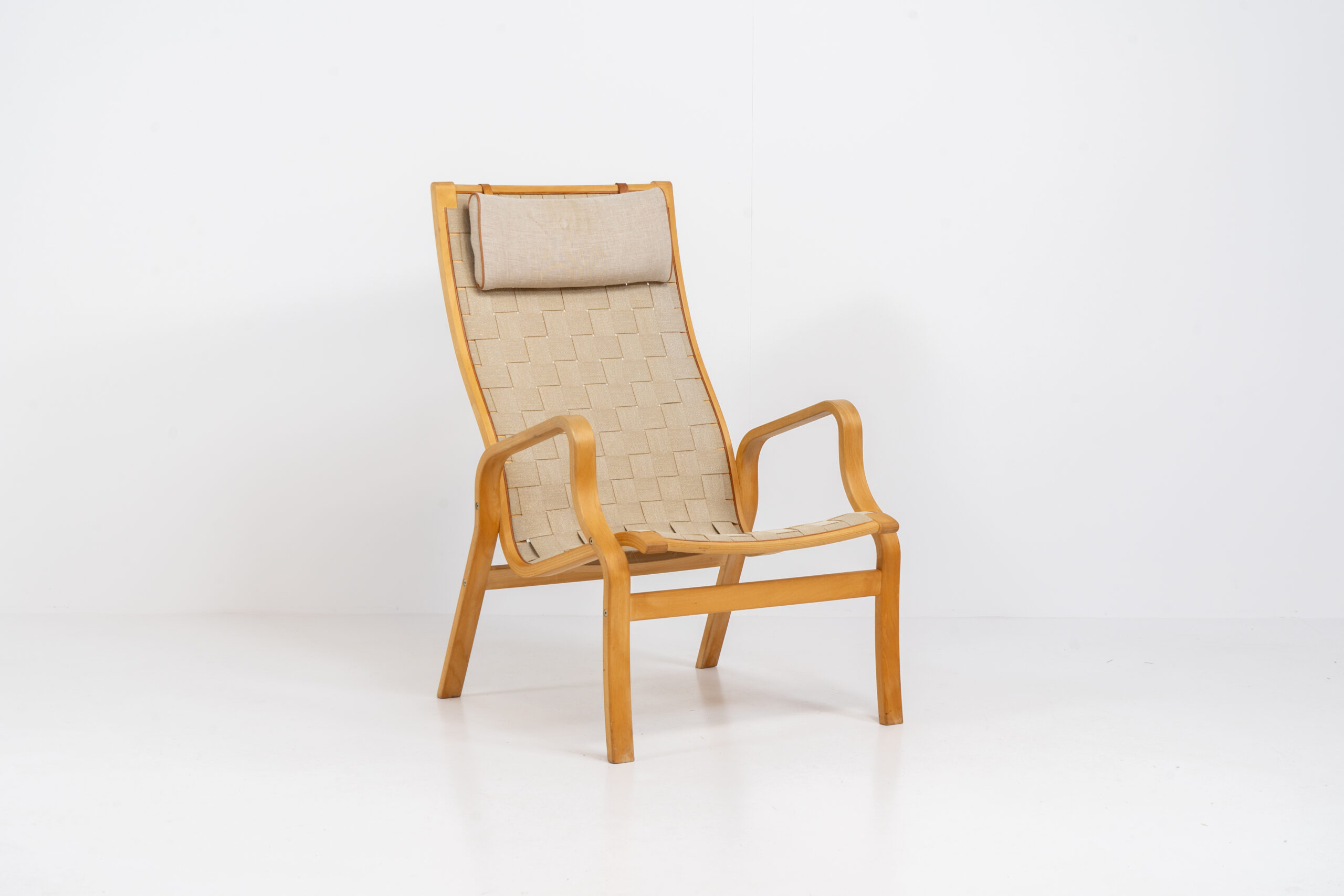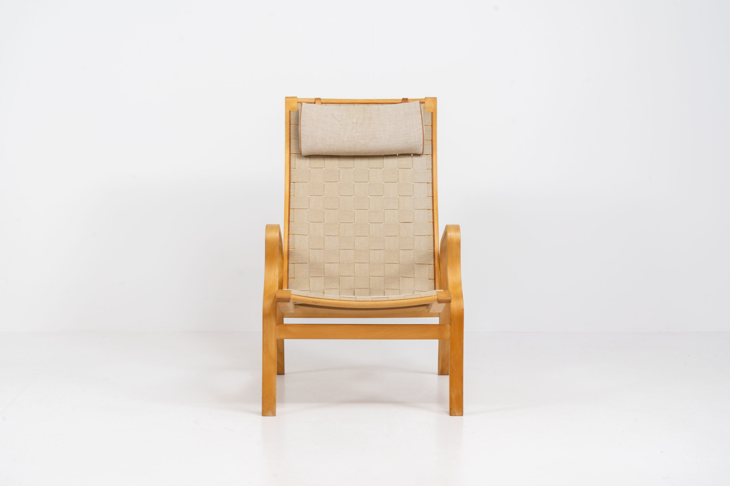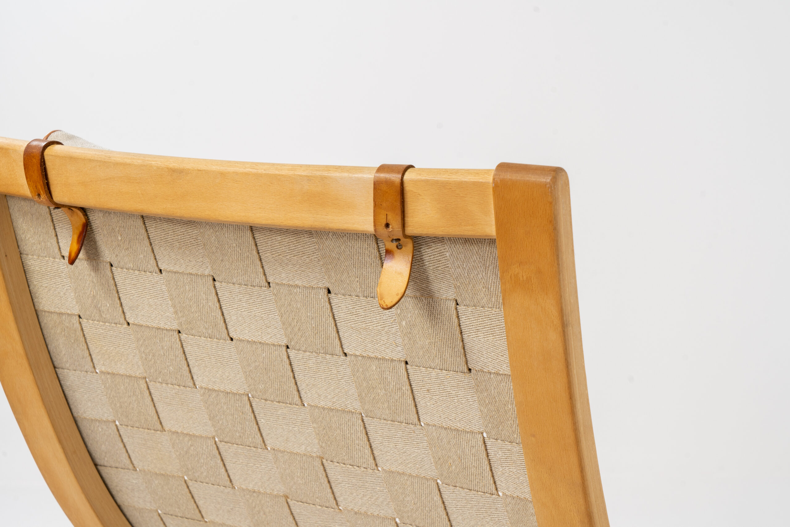 A classic example of modern Danish design! It consists of a beech bentwood frame, a woven strap webbing and an adjustable canvas headrest, finished with leather details.