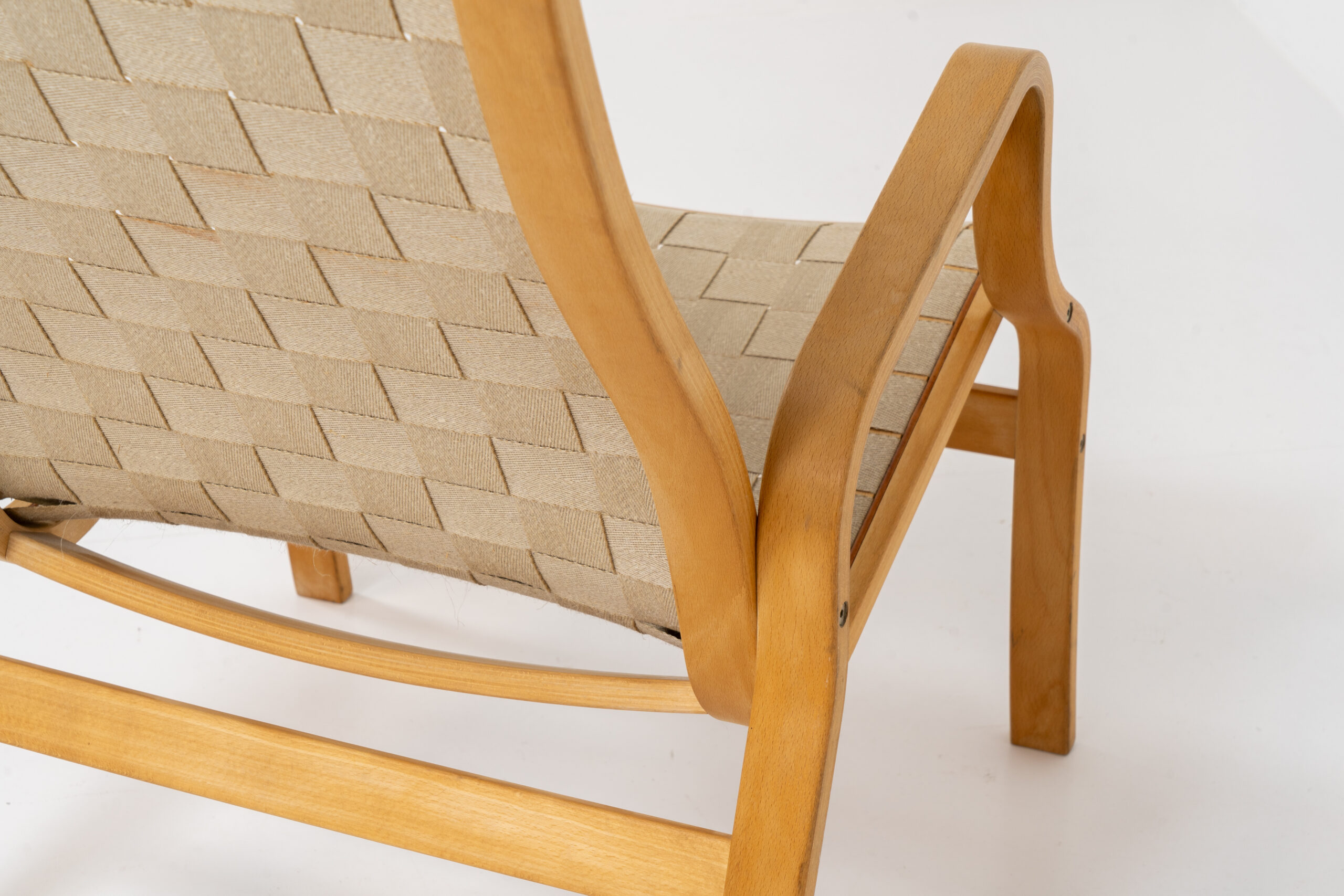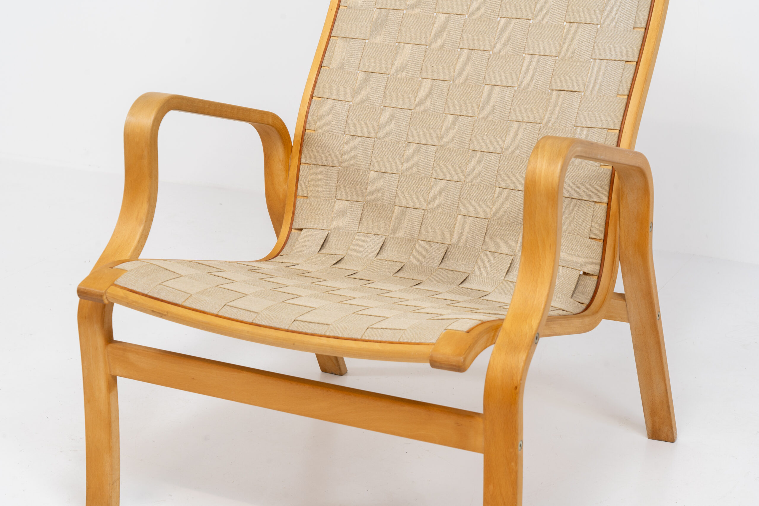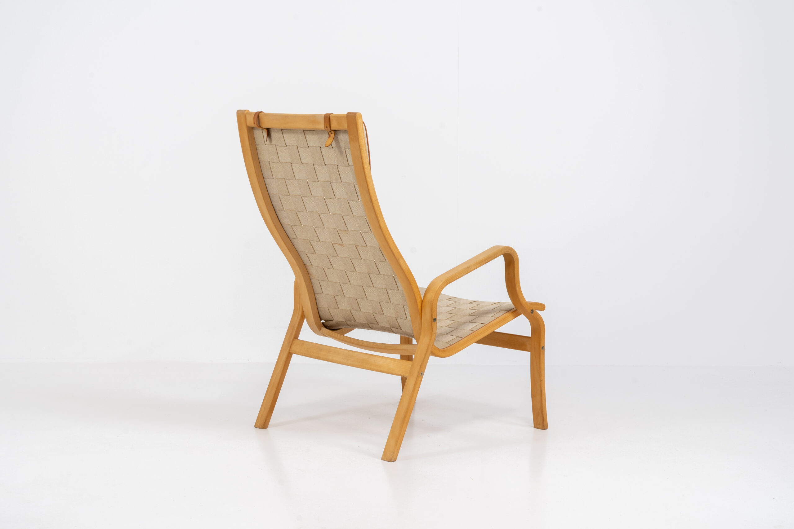 A classic example of modern Danish design! It consists of a beech bentwood frame, a woven strap webbing and an adjustable canvas headrest, finished with leather details.