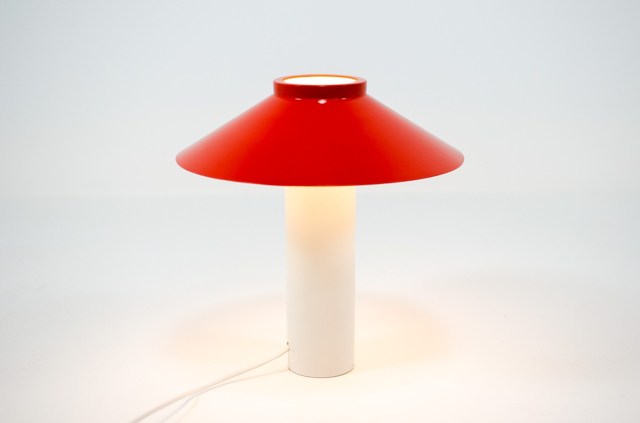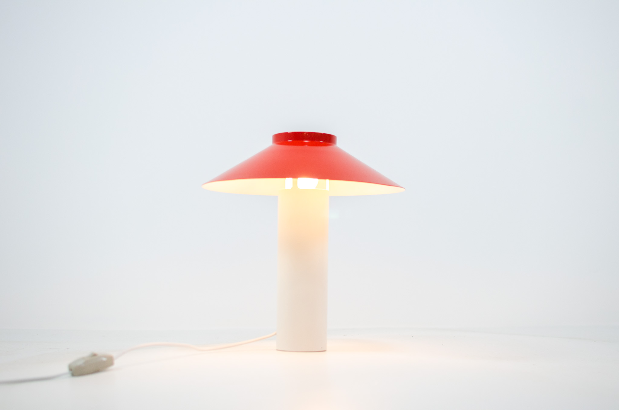 This minimalist mushroom lamp is made out of powder coated metal. It consists of 2 pieces, the body and the red shade, what you see is what you get.