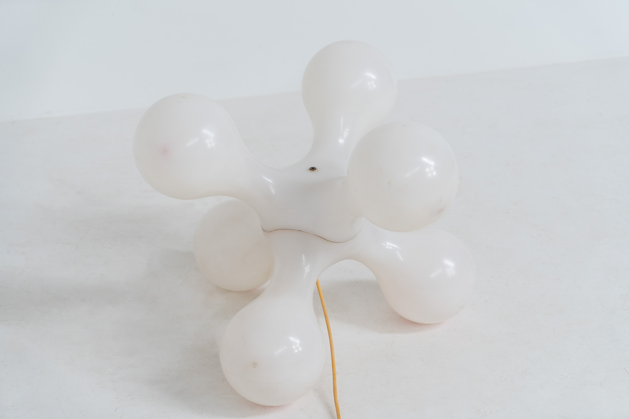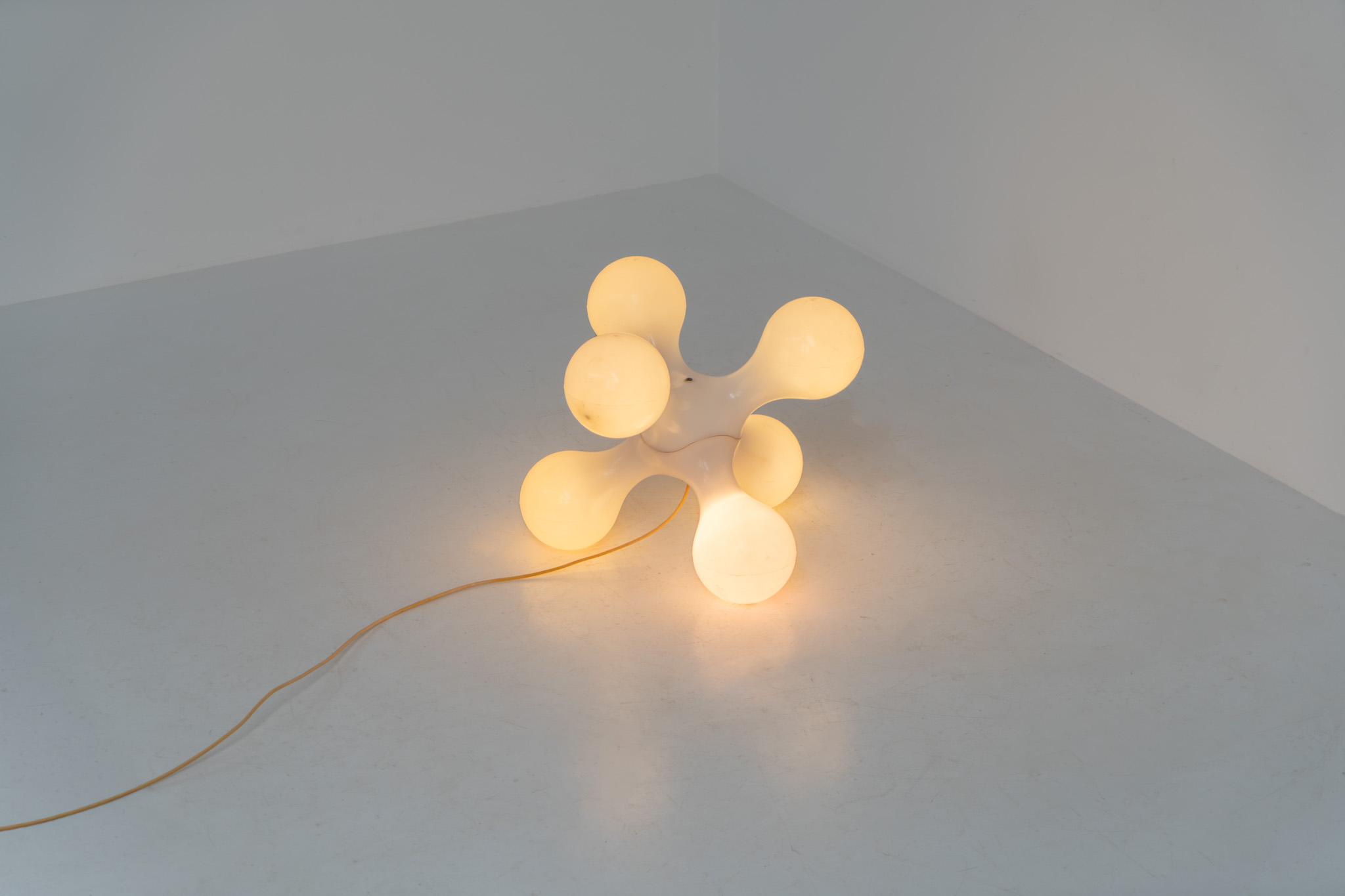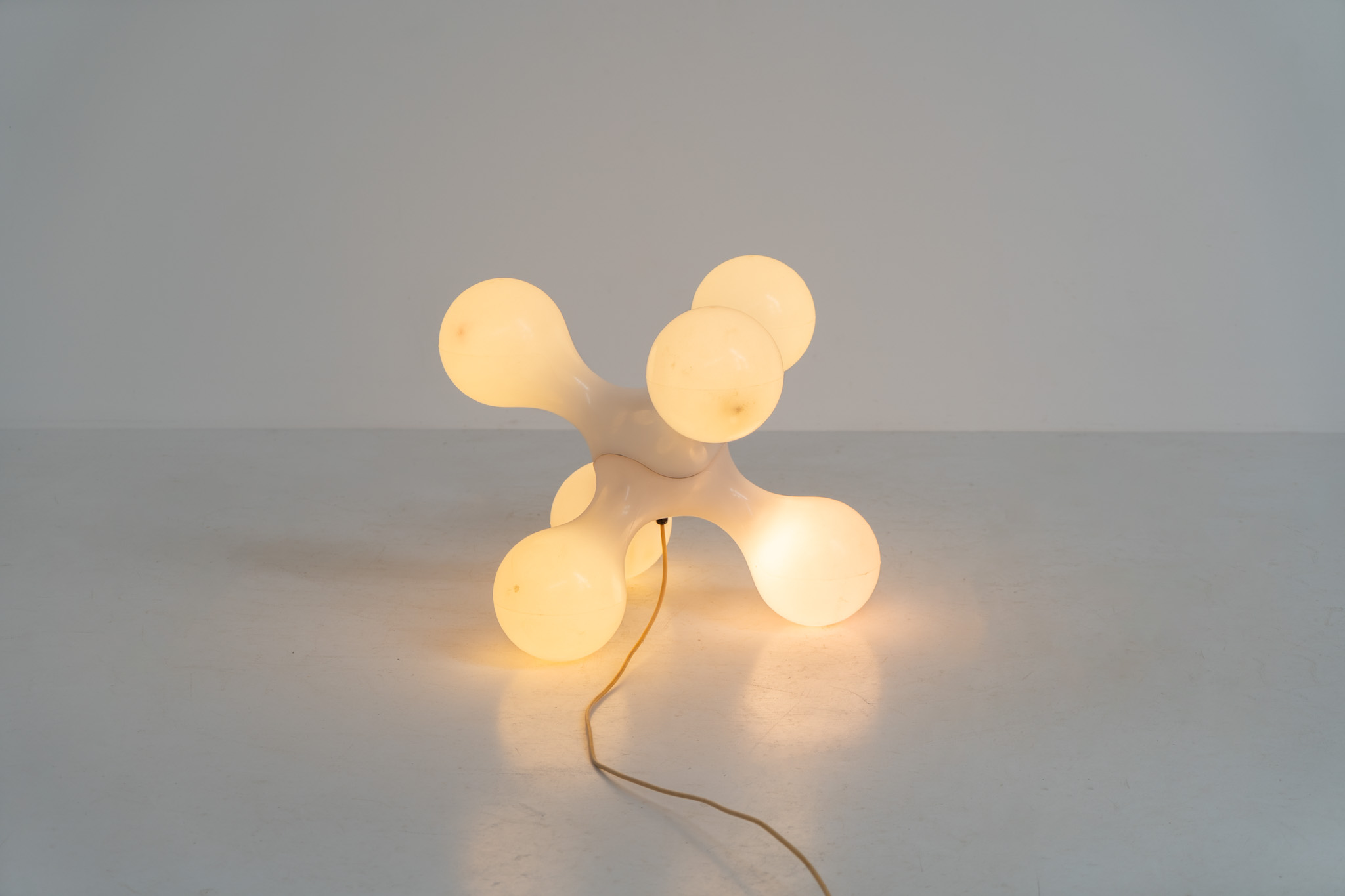Inspired by the iconic Atomium in Brussels, this striking lamp features a molded plastic structure with six internal light sources, creating a warm and atmospheric glow.