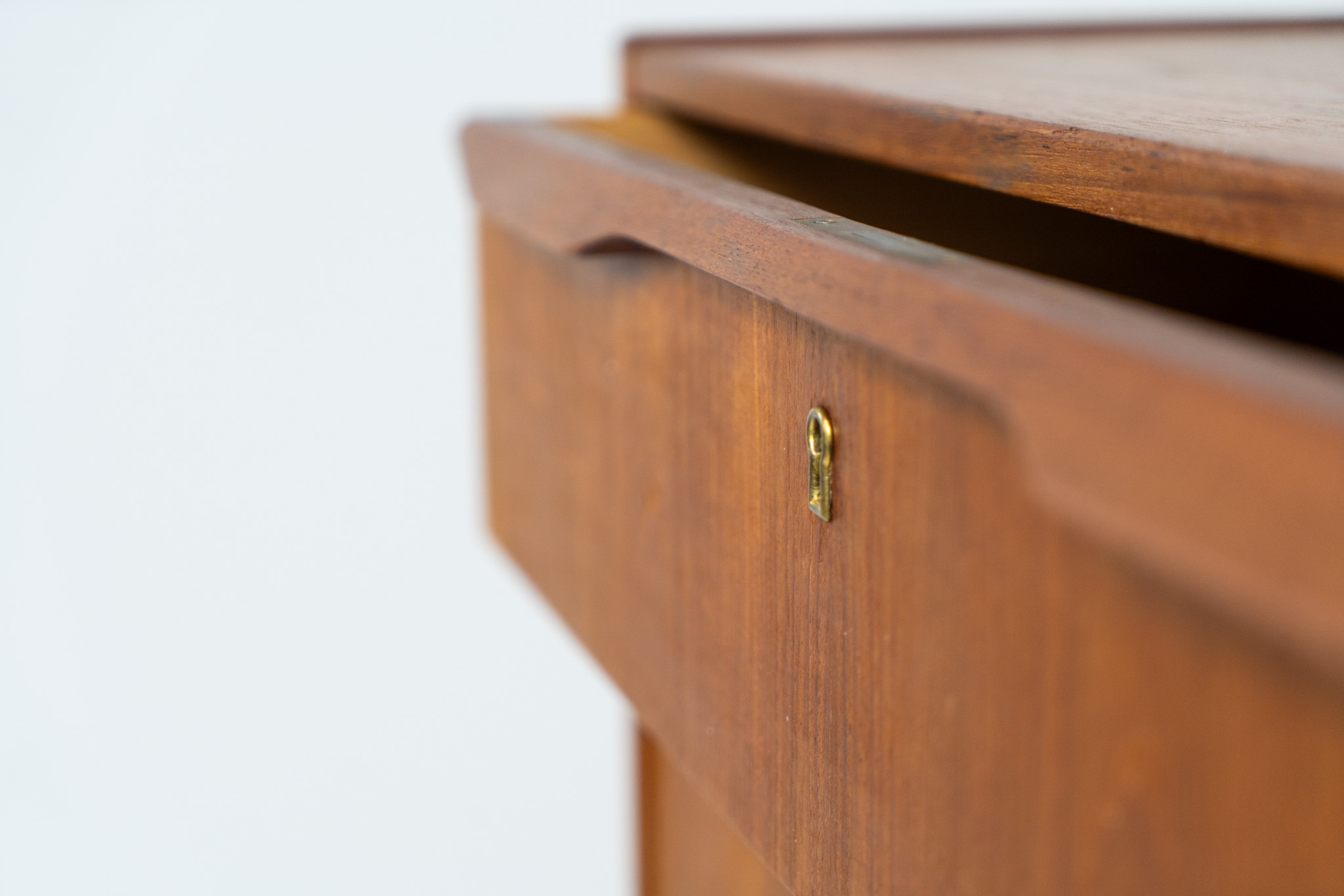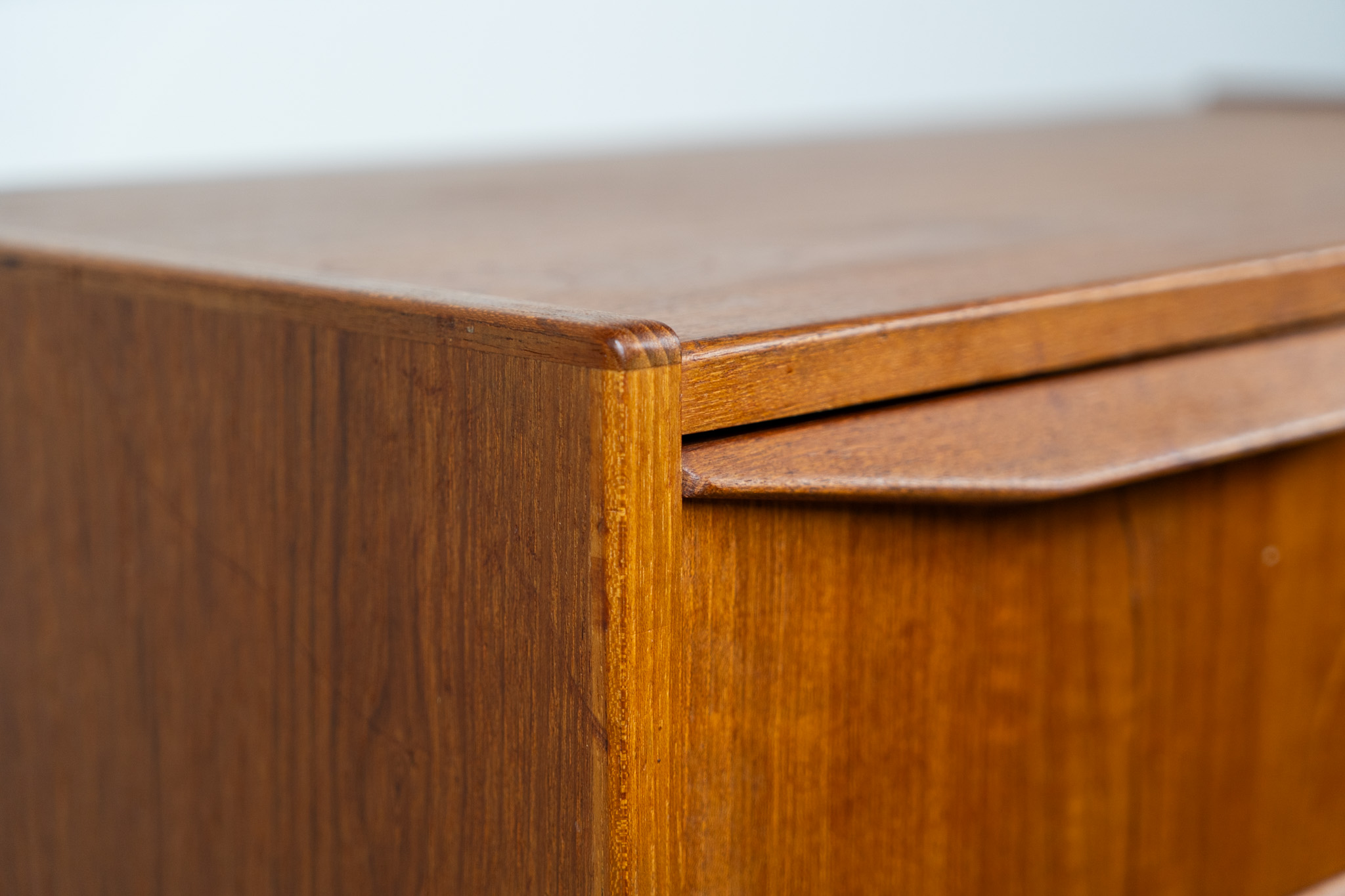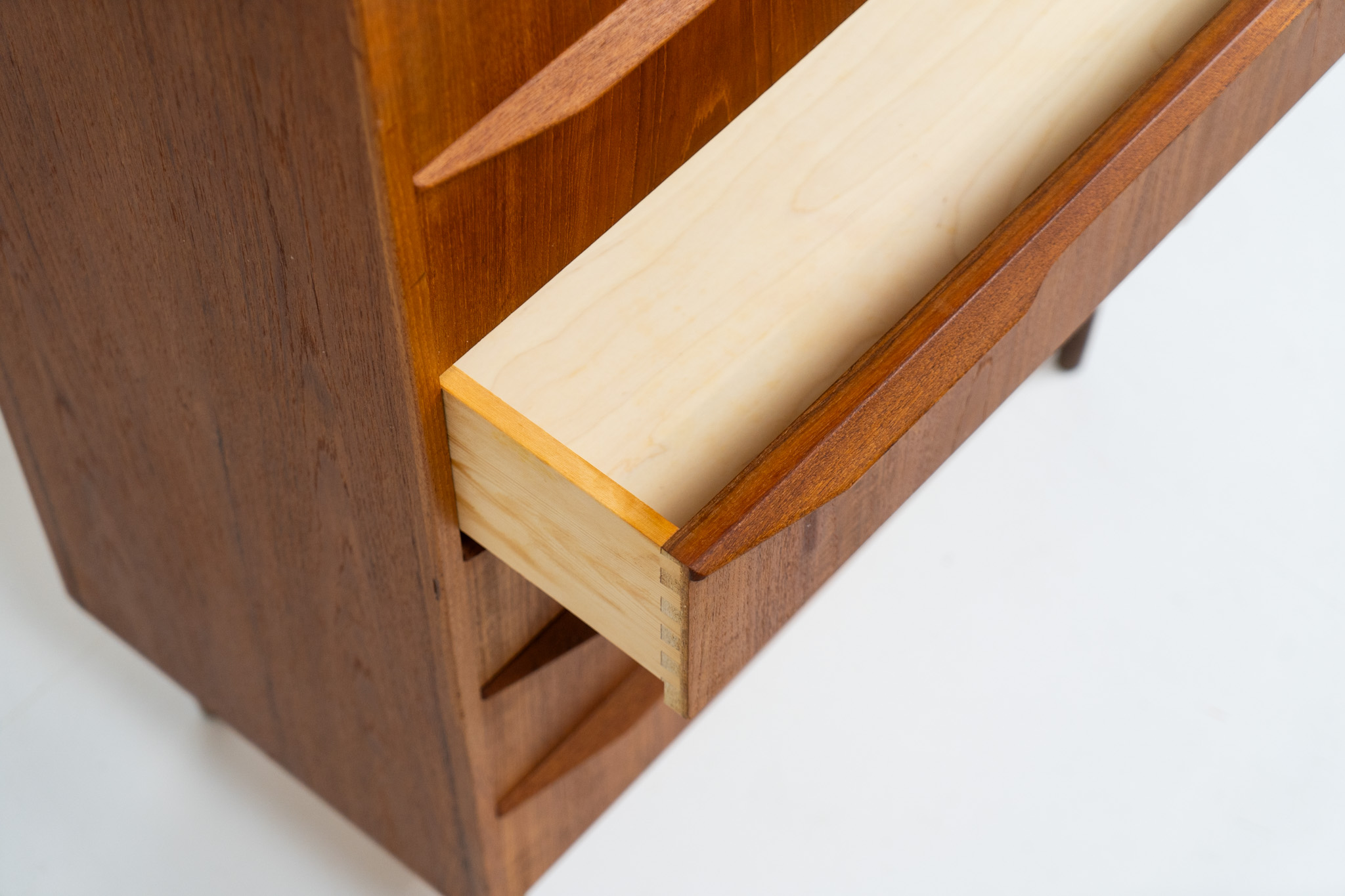 It contains six drawers with beautiful sculpted handles. The teak has a very nice and warm woodgrain.