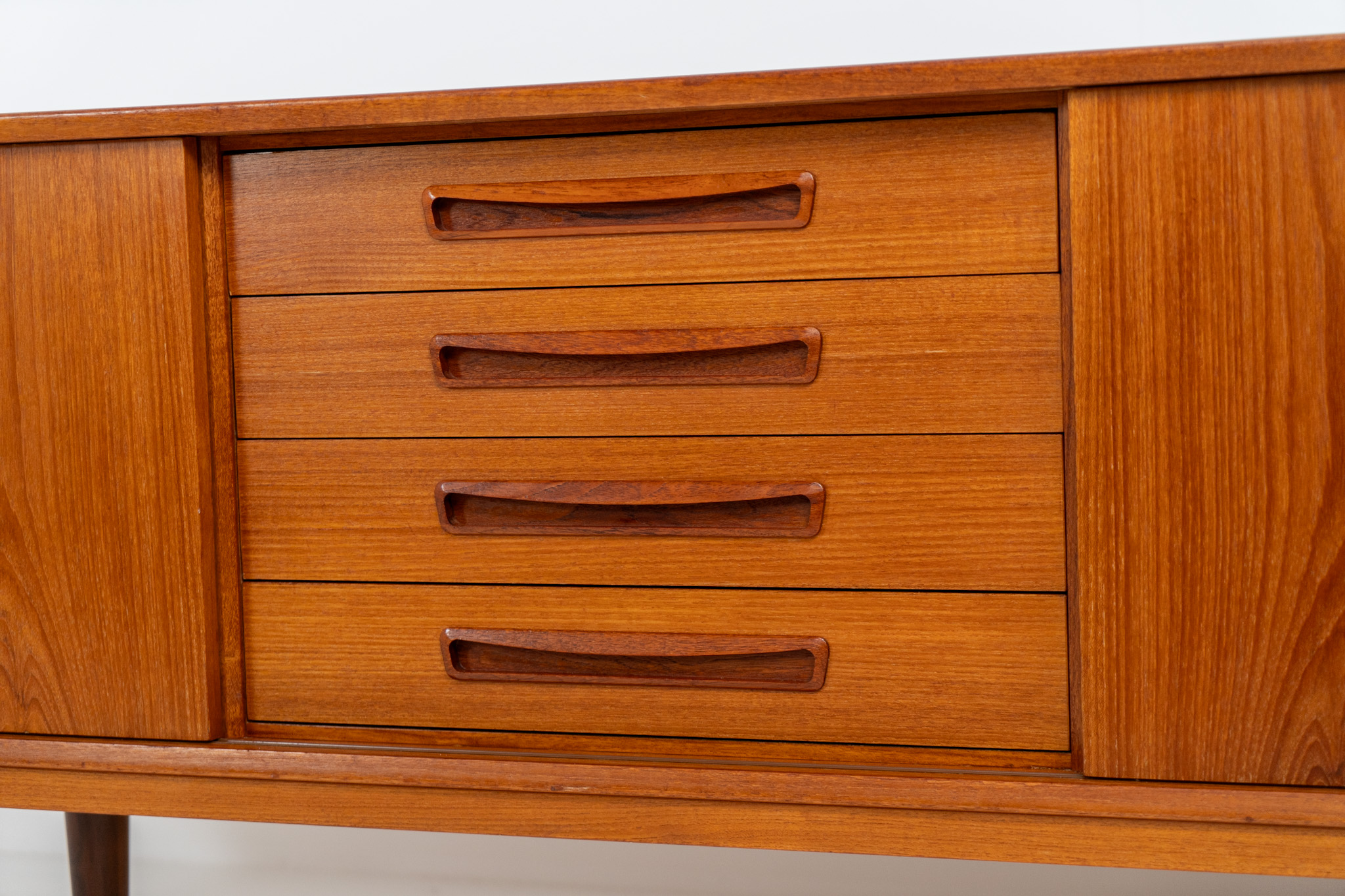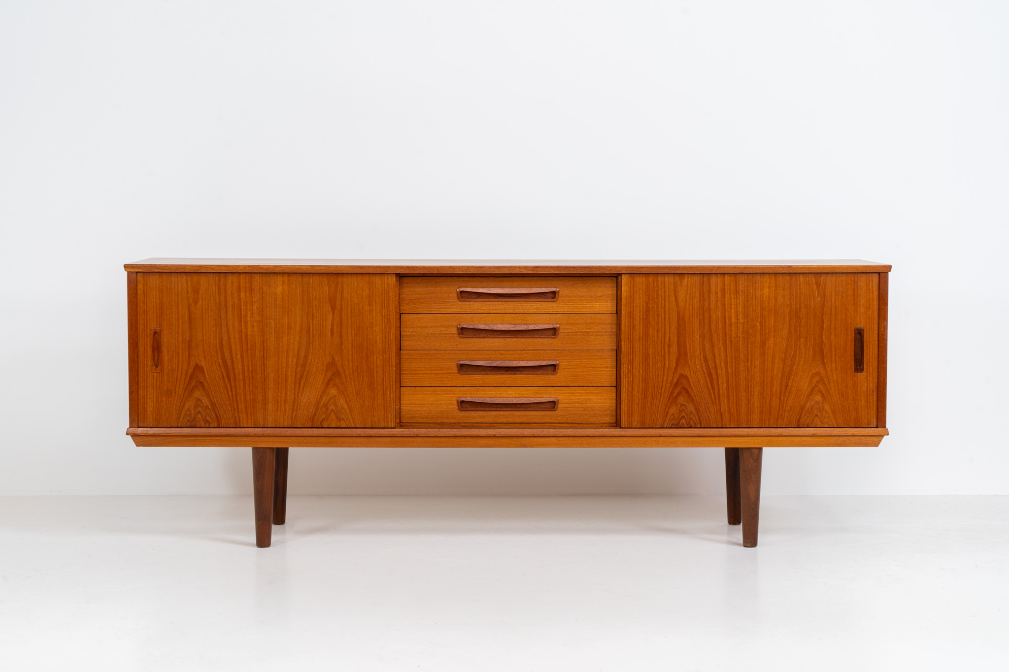 It contains two sliding doors with shelves on the inside and four drawers with stunning organic inset handles on them.