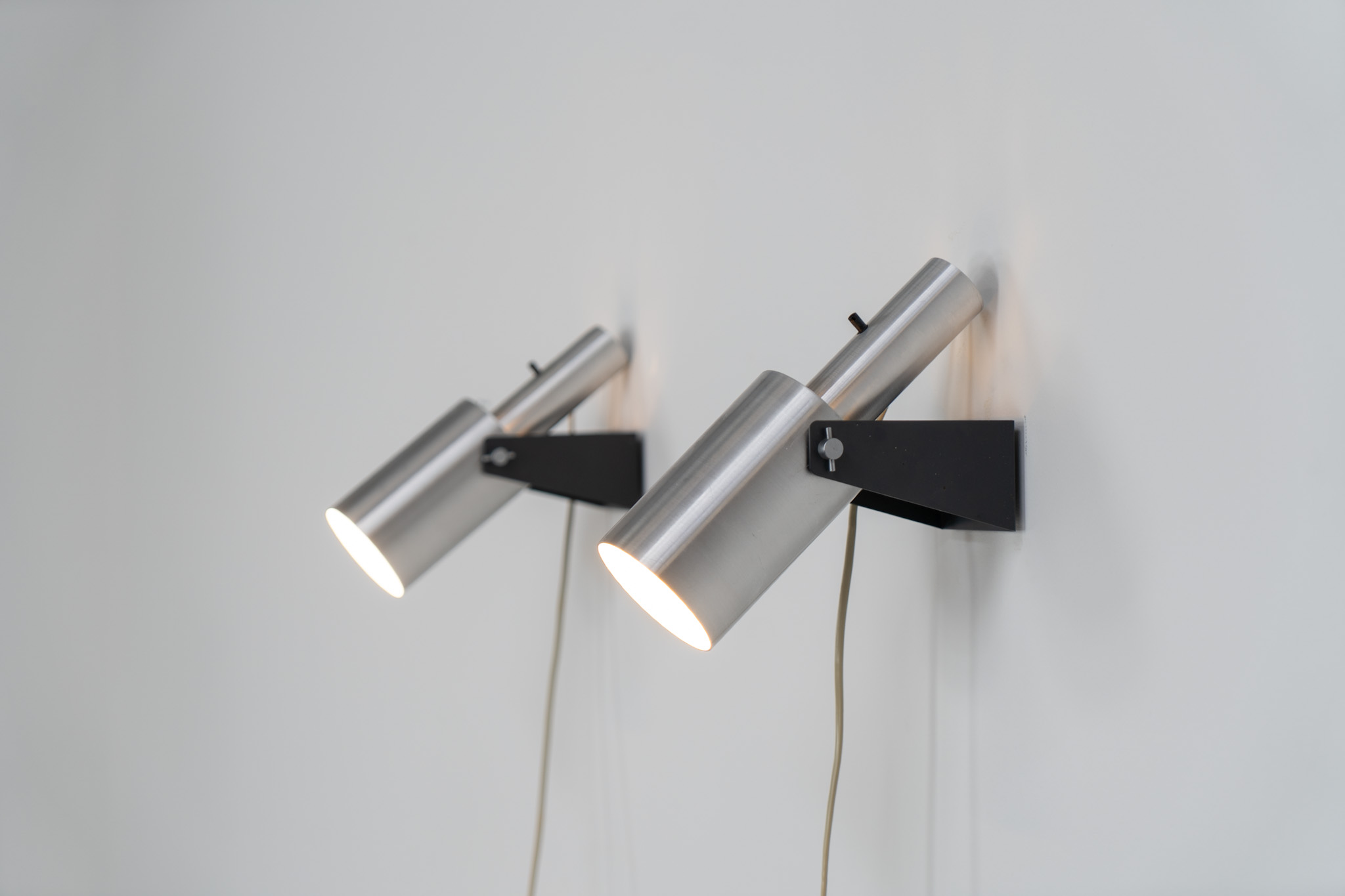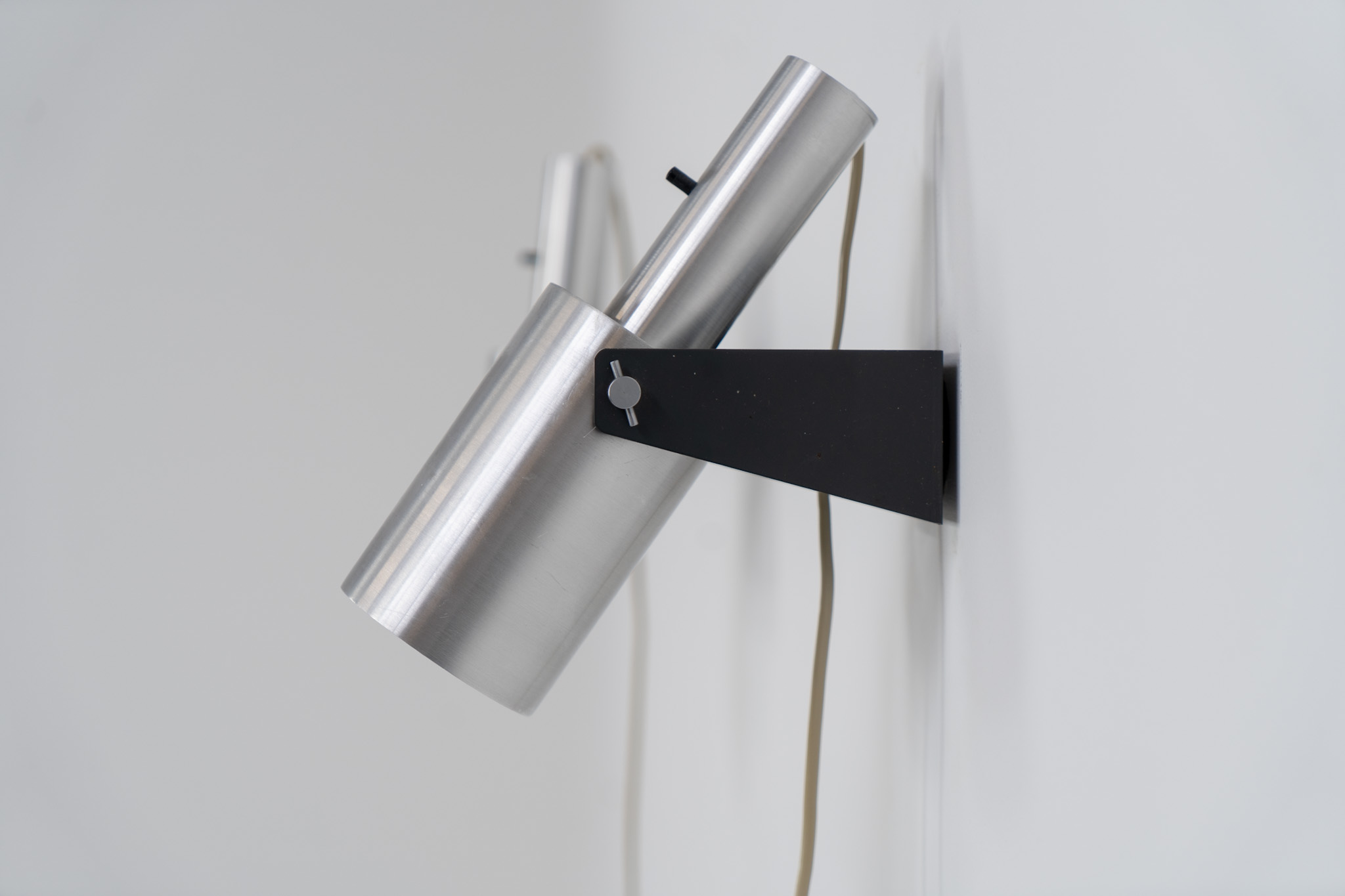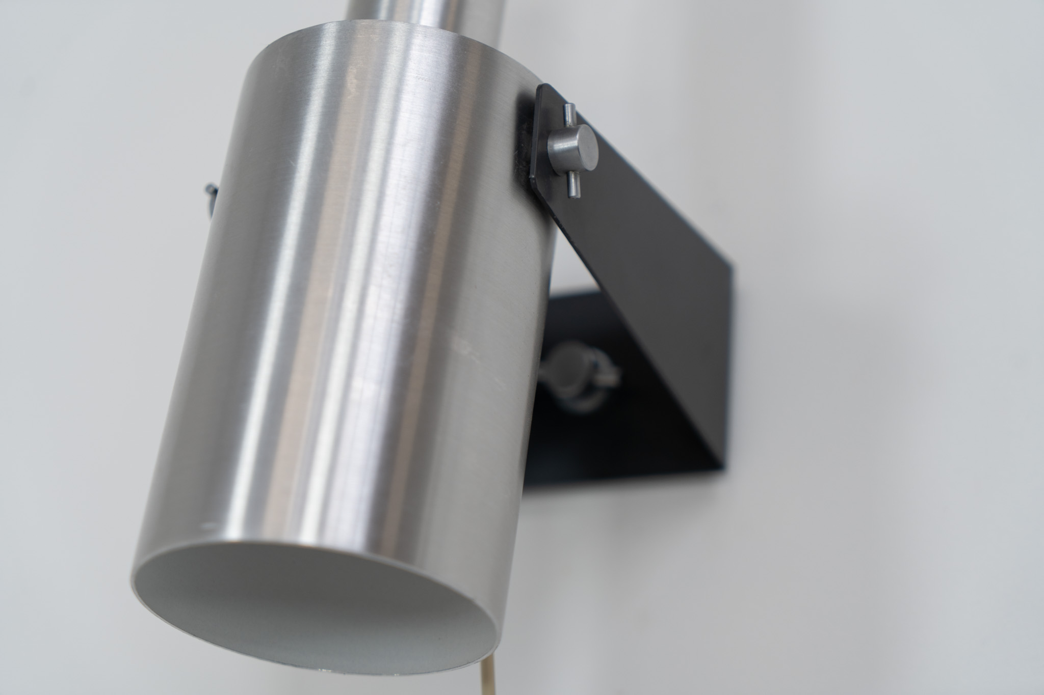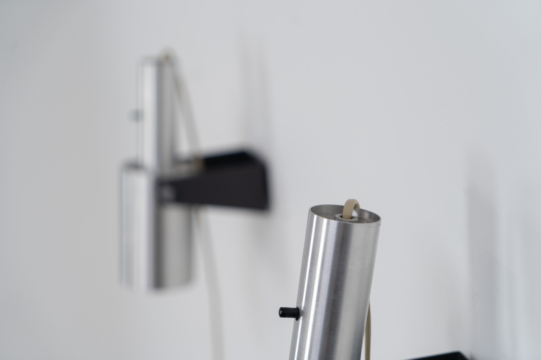 These modernist fixtures feature a black lacquered metal base and a brushed aluminium lamp shade, they are easily adjustable in multiple angles and directions.
