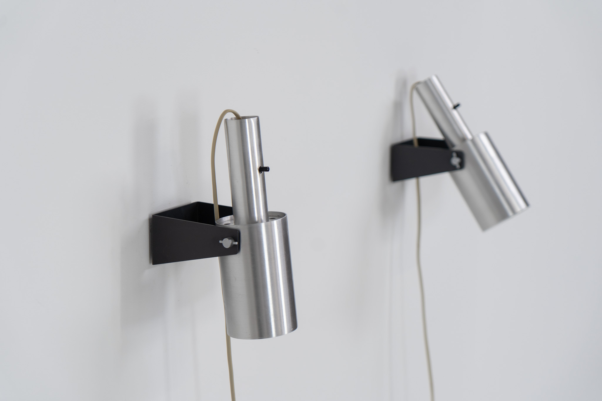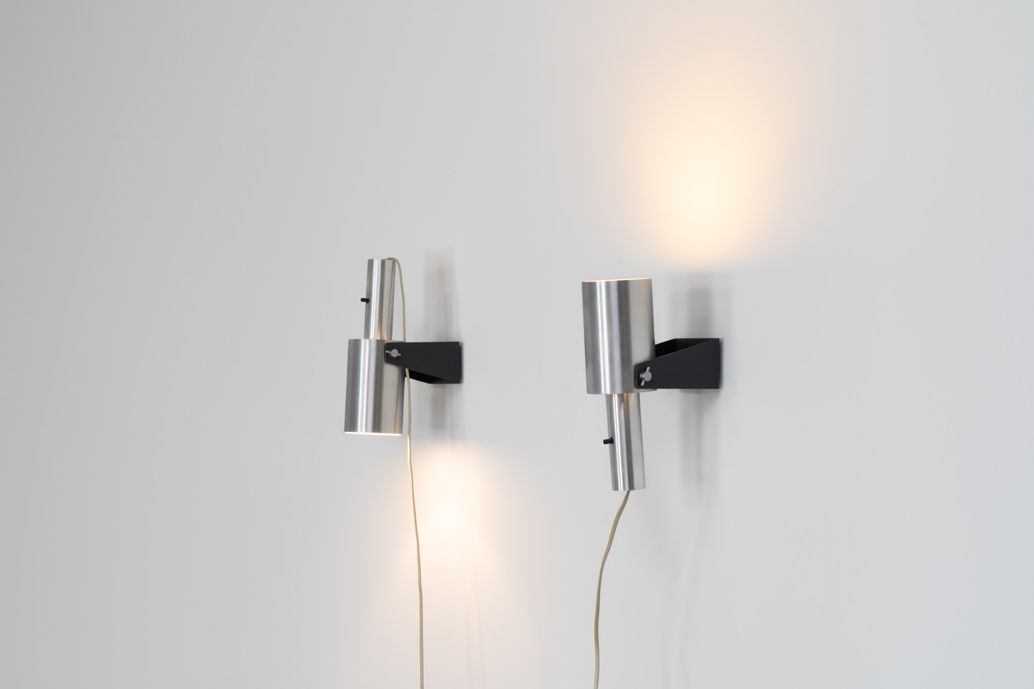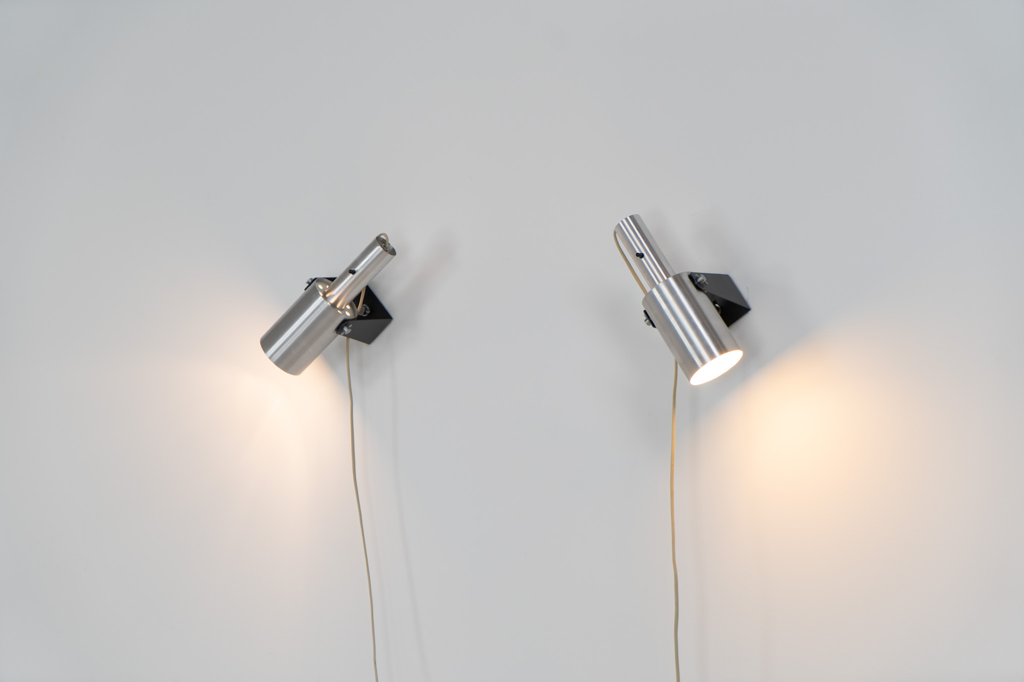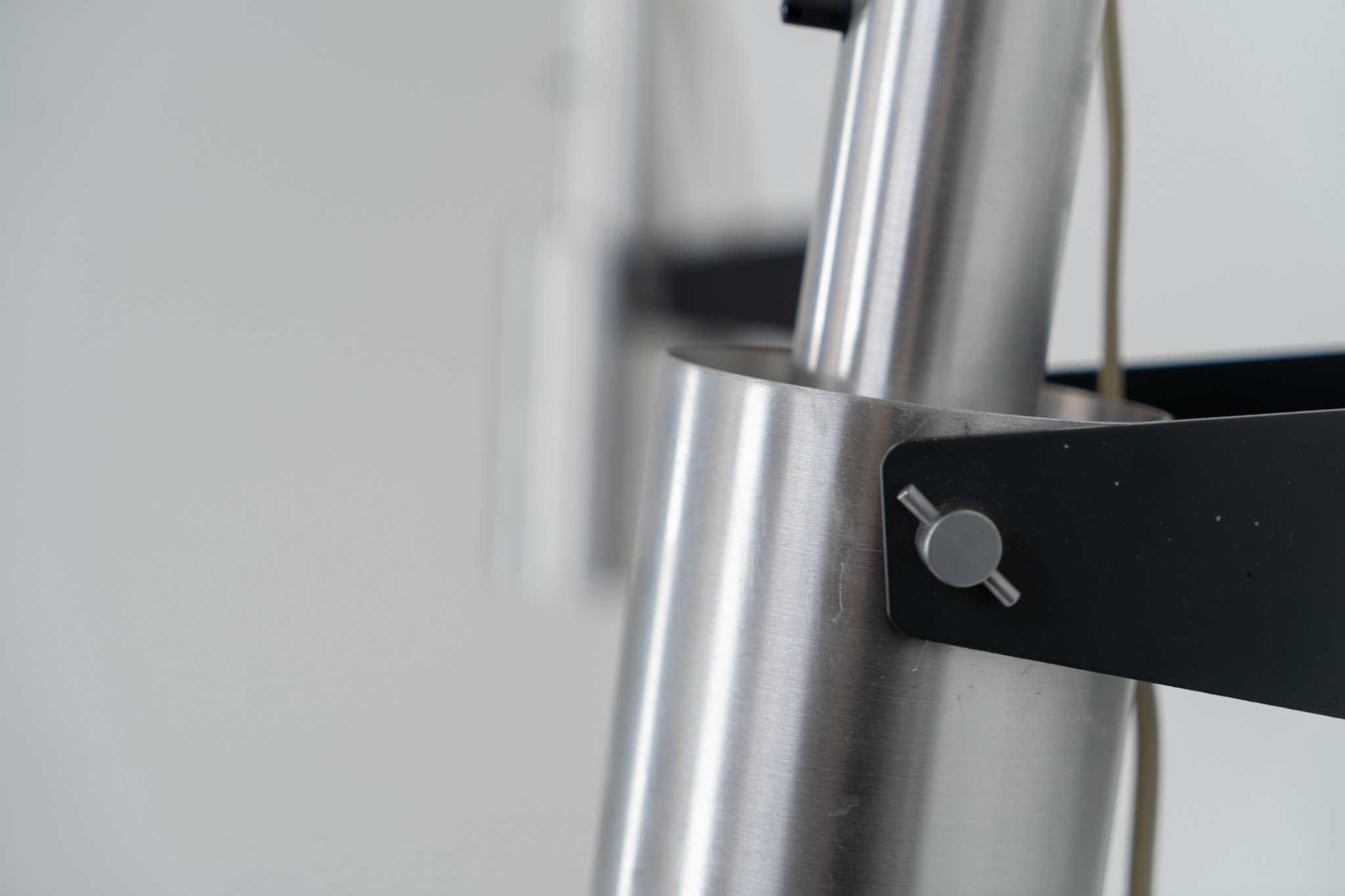 These modernist fixtures feature a black lacquered metal base and a brushed aluminium lamp shade, they are easily adjustable in multiple angles and directions.