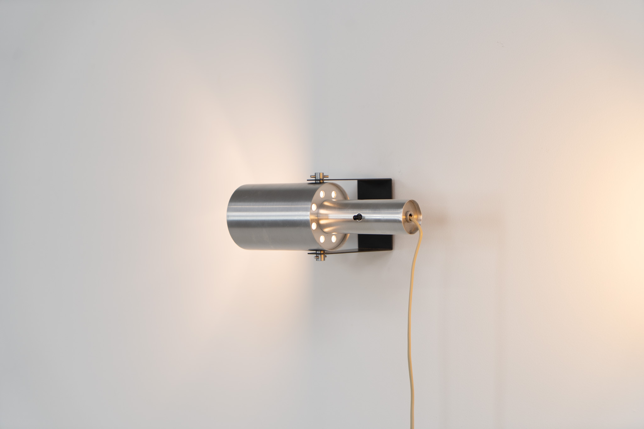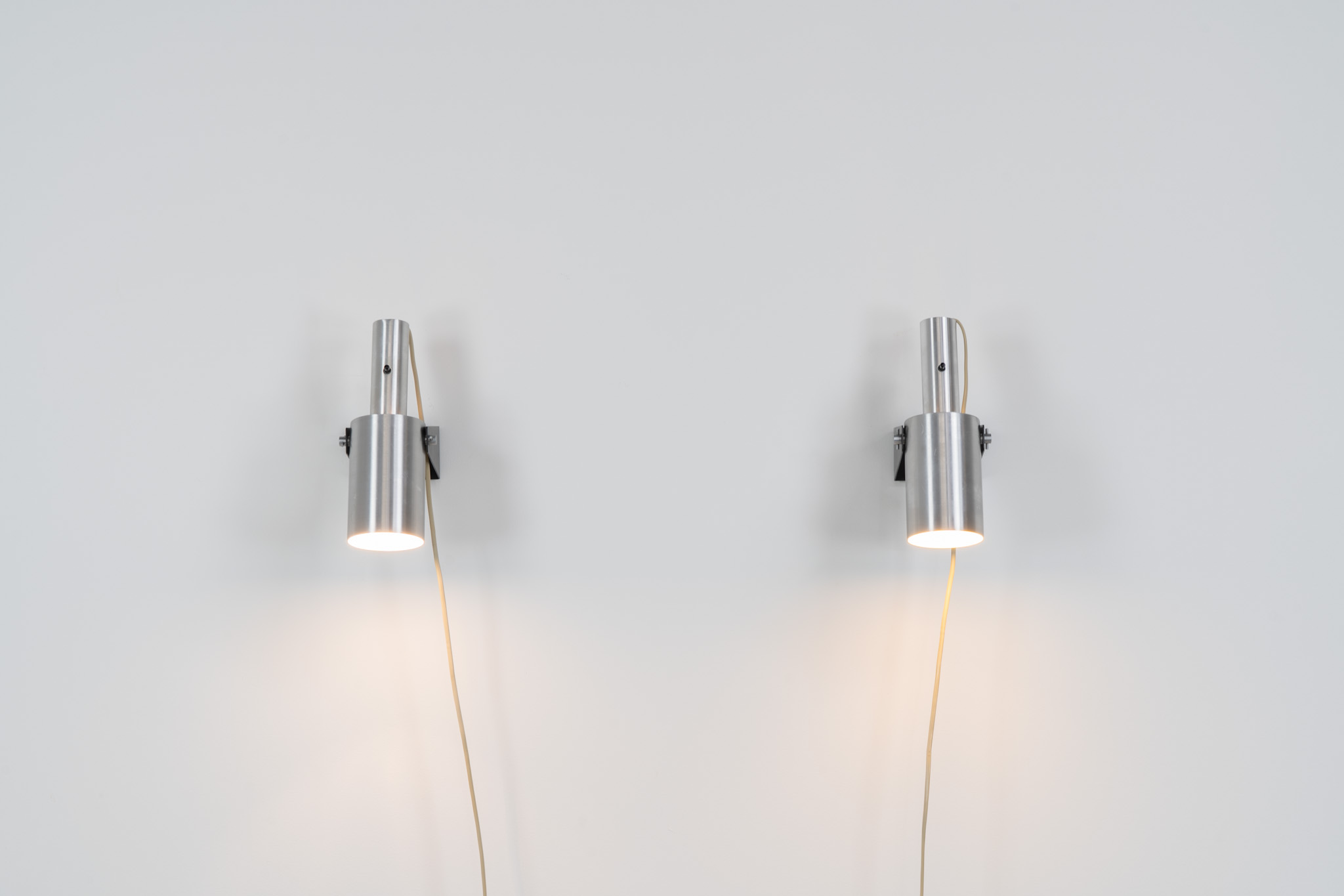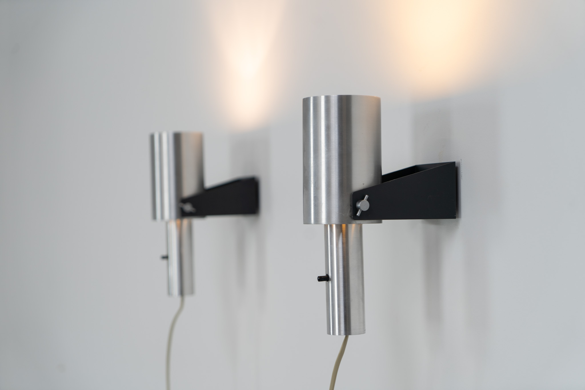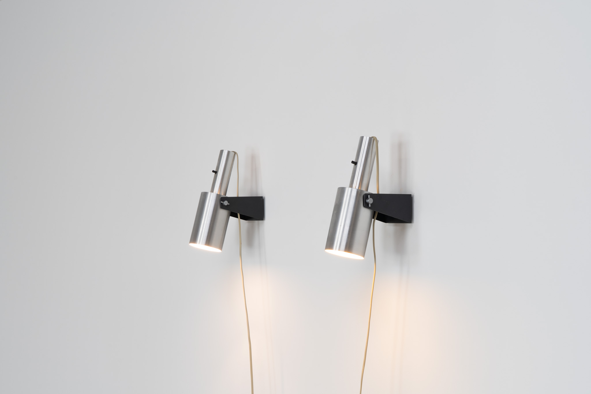 These modernist fixtures feature a black lacquered metal base and a brushed aluminium lamp shade, they are easily adjustable in multiple angles and directions.