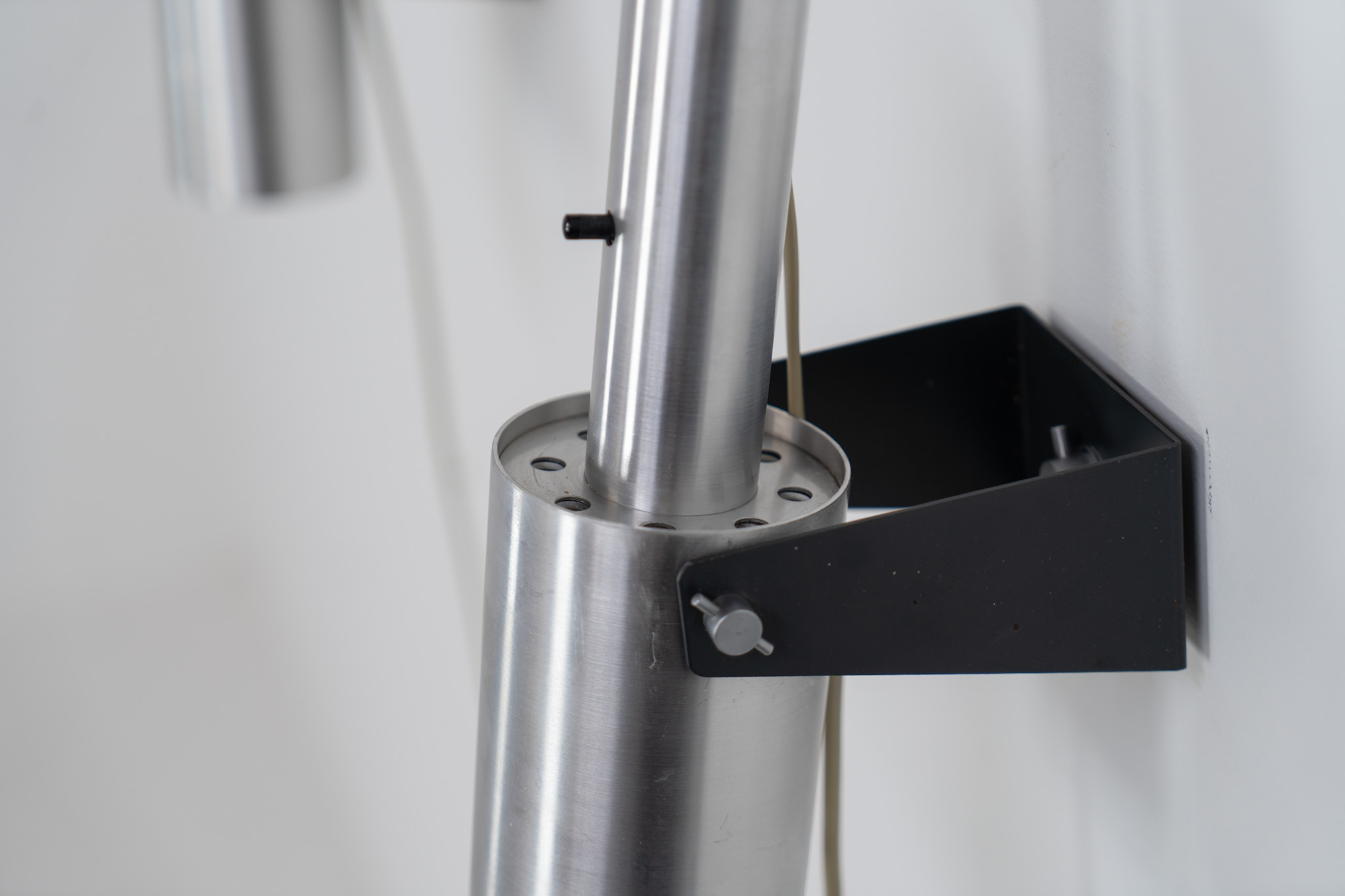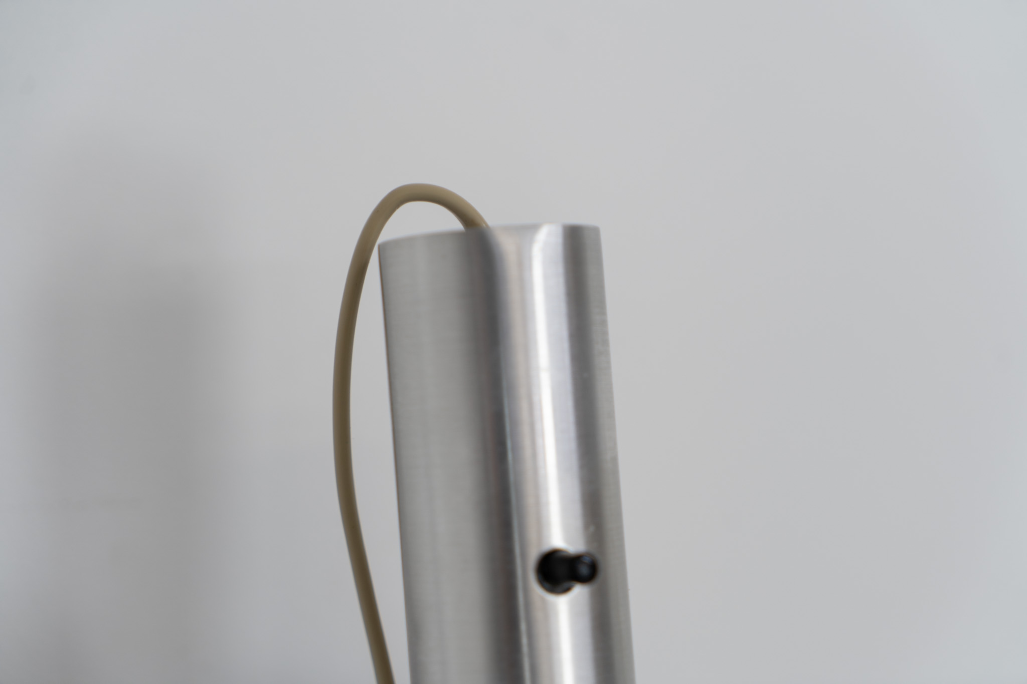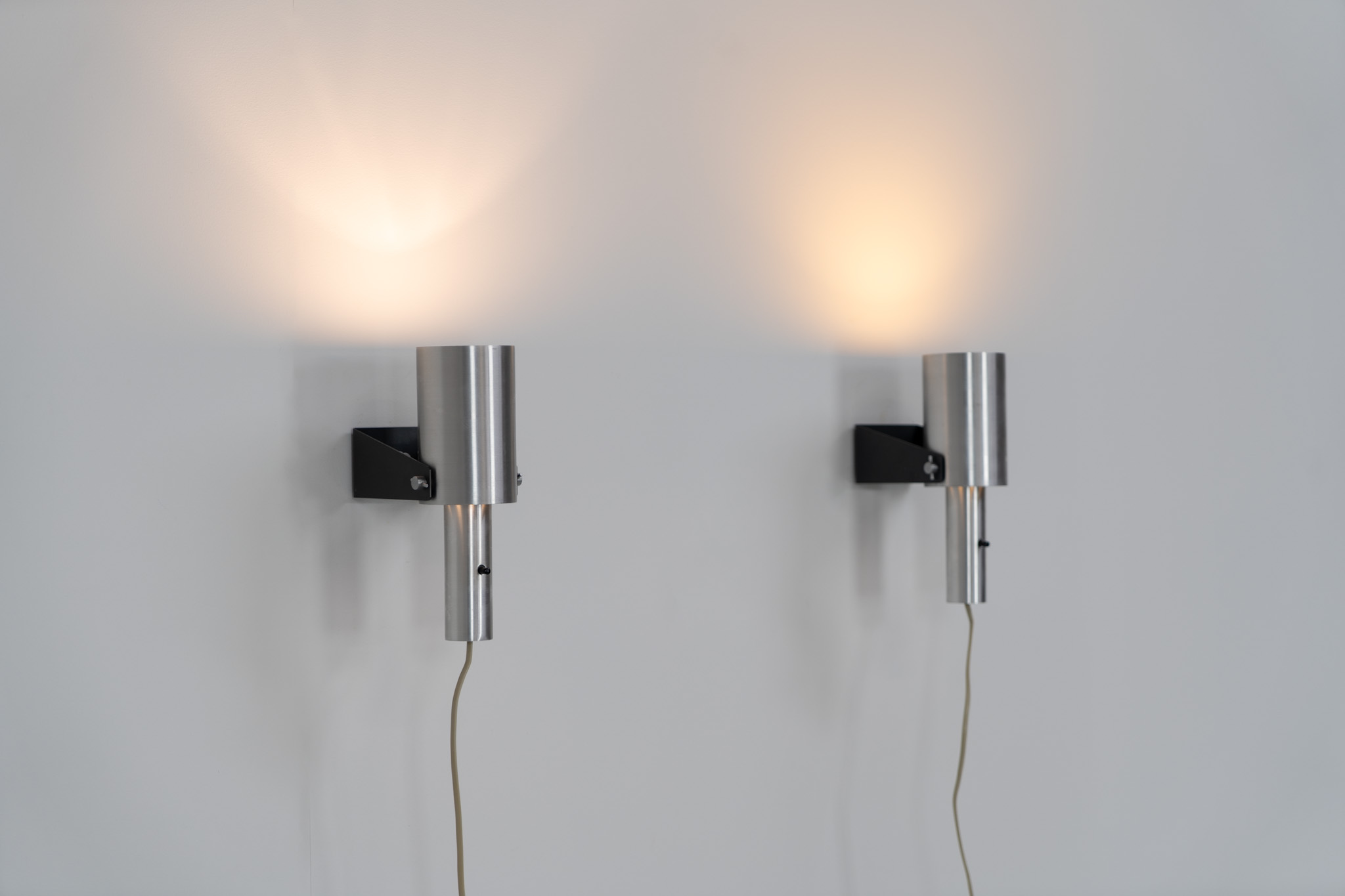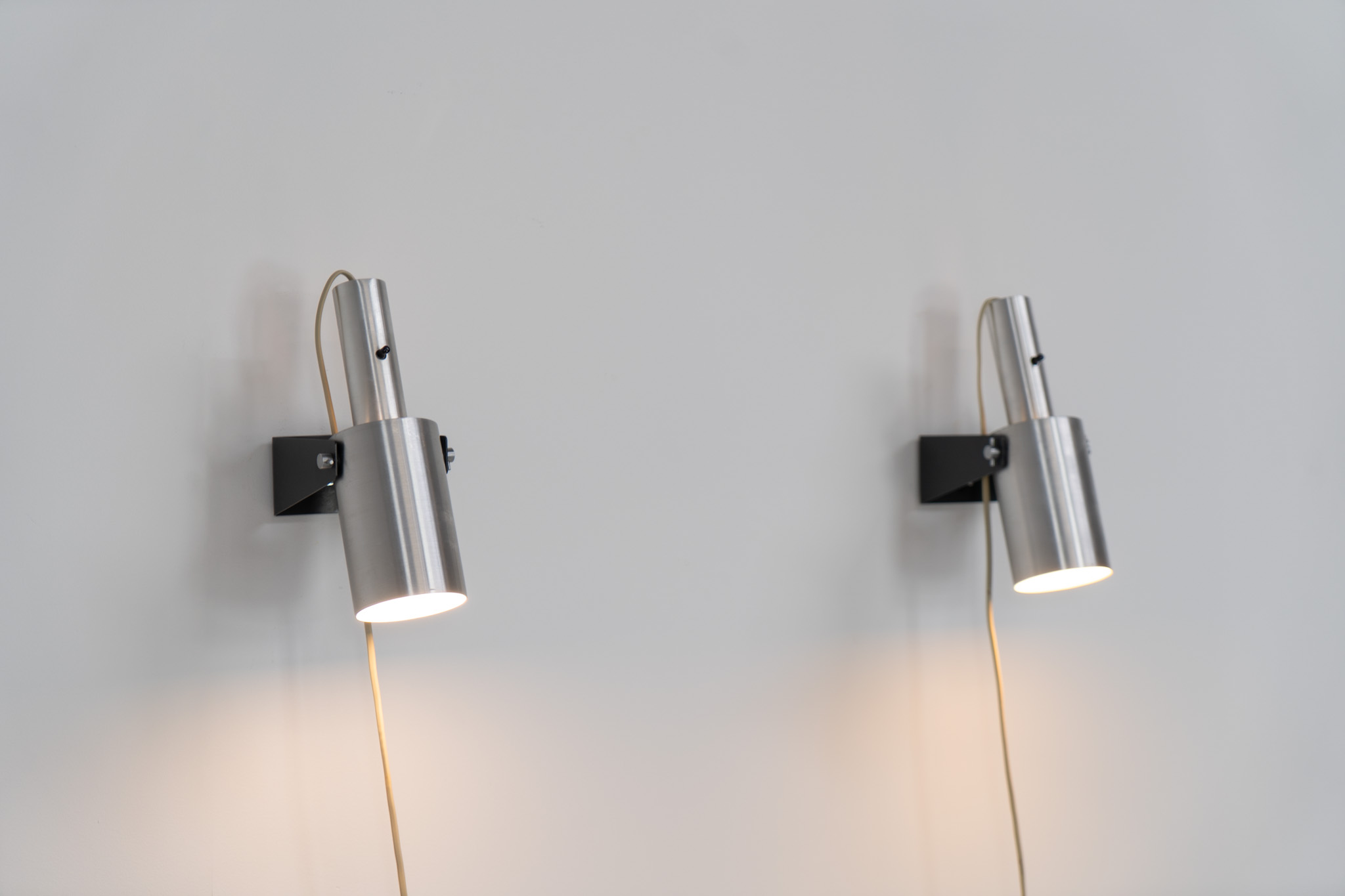 These modernist fixtures feature a black lacquered metal base and a brushed aluminium lamp shade, they are easily adjustable in multiple angles and directions.
