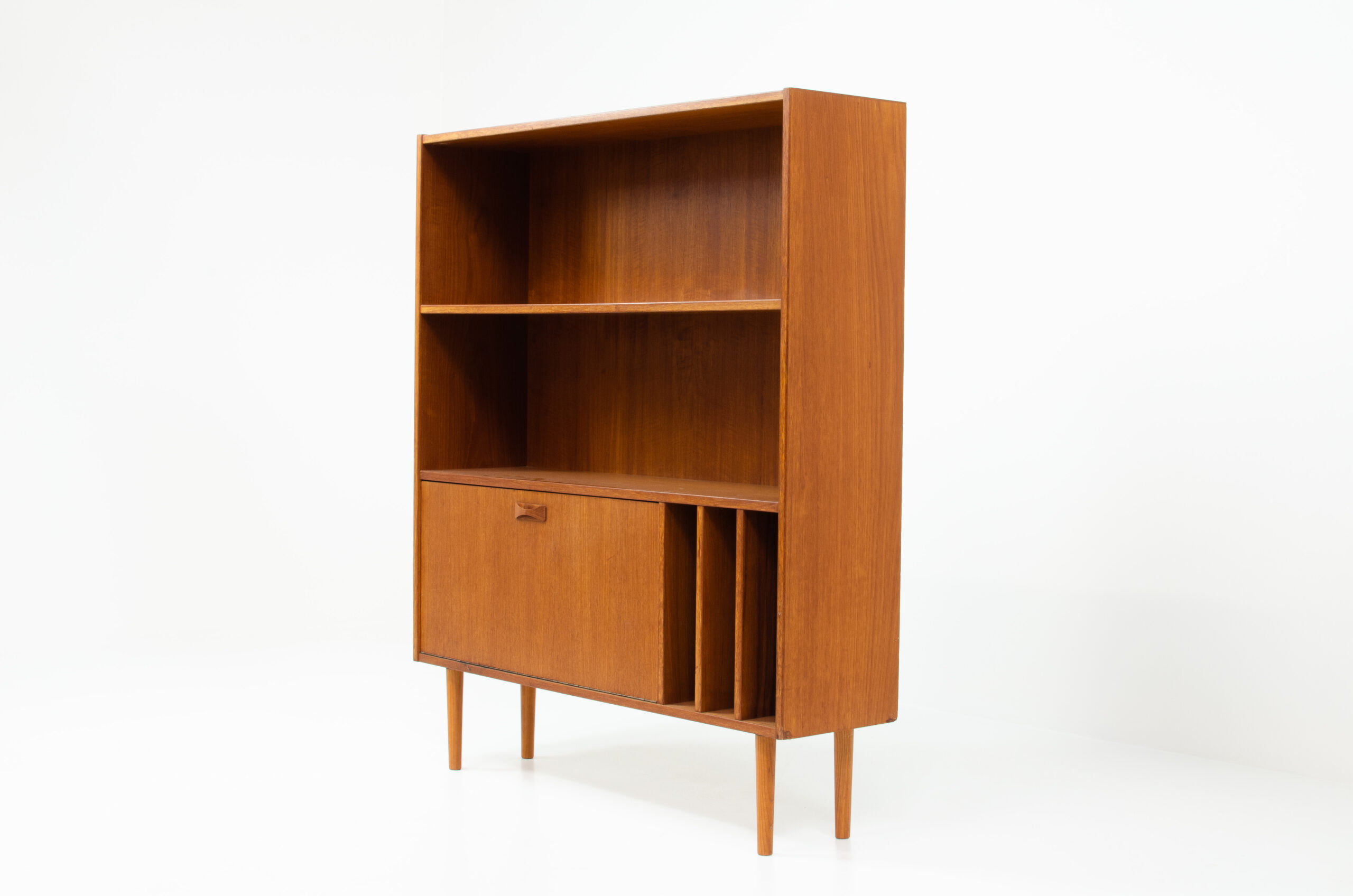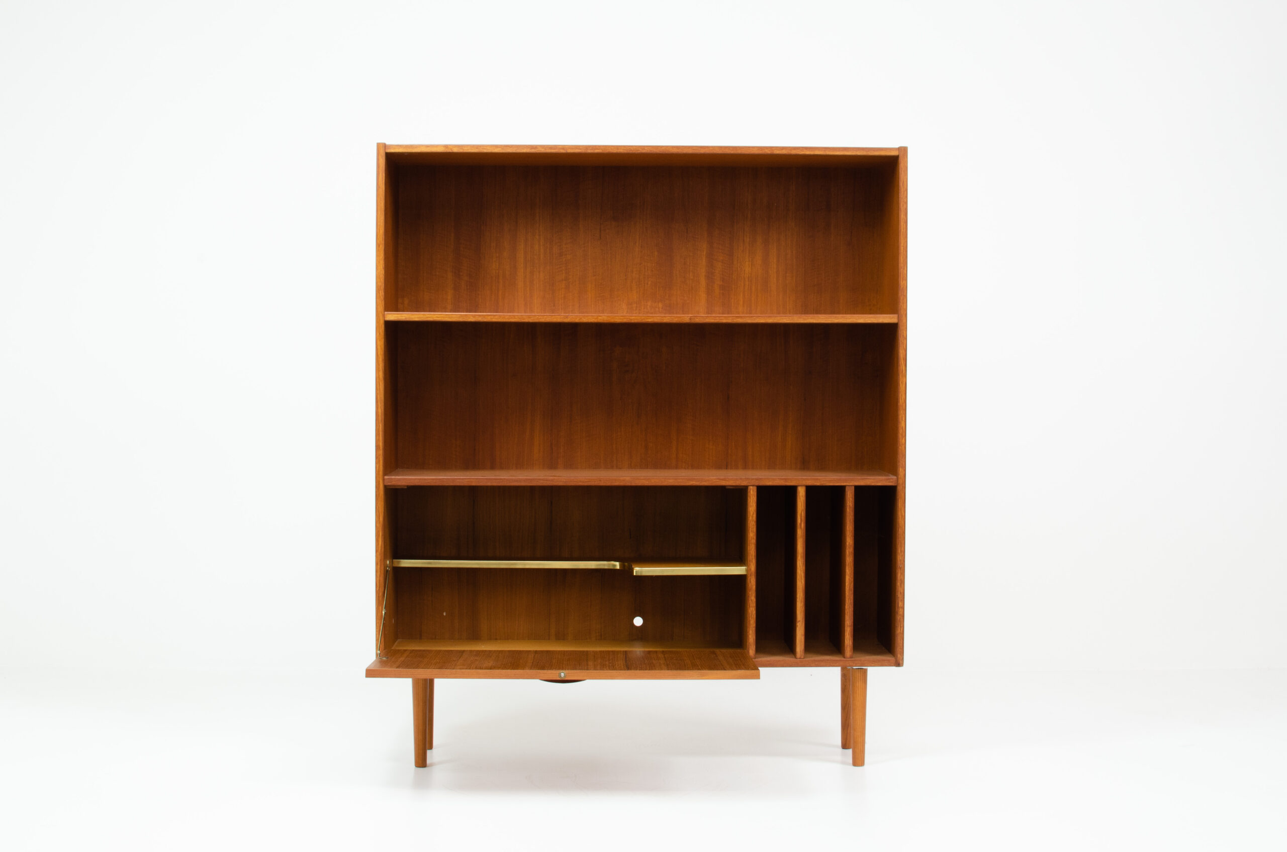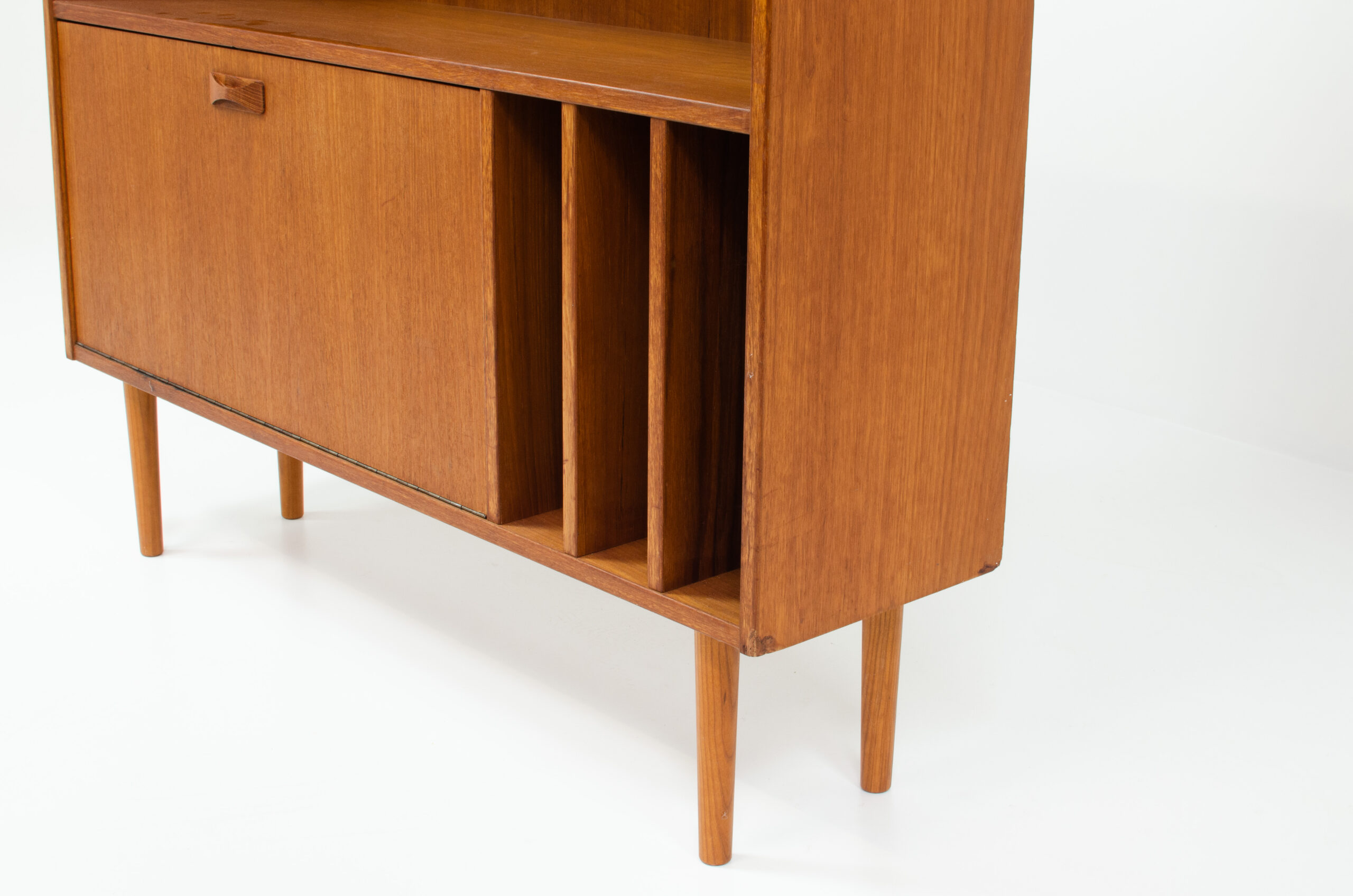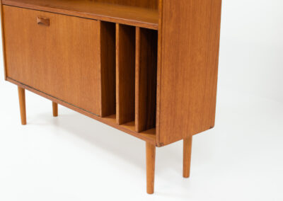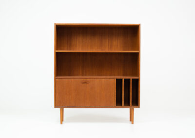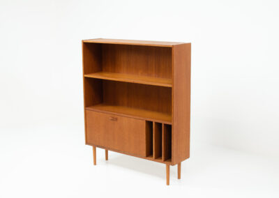 A convenient and multifunctional piece containing 2 bookshelves, a dropdown door with space for bottles and glasses and 3 record deviders.
