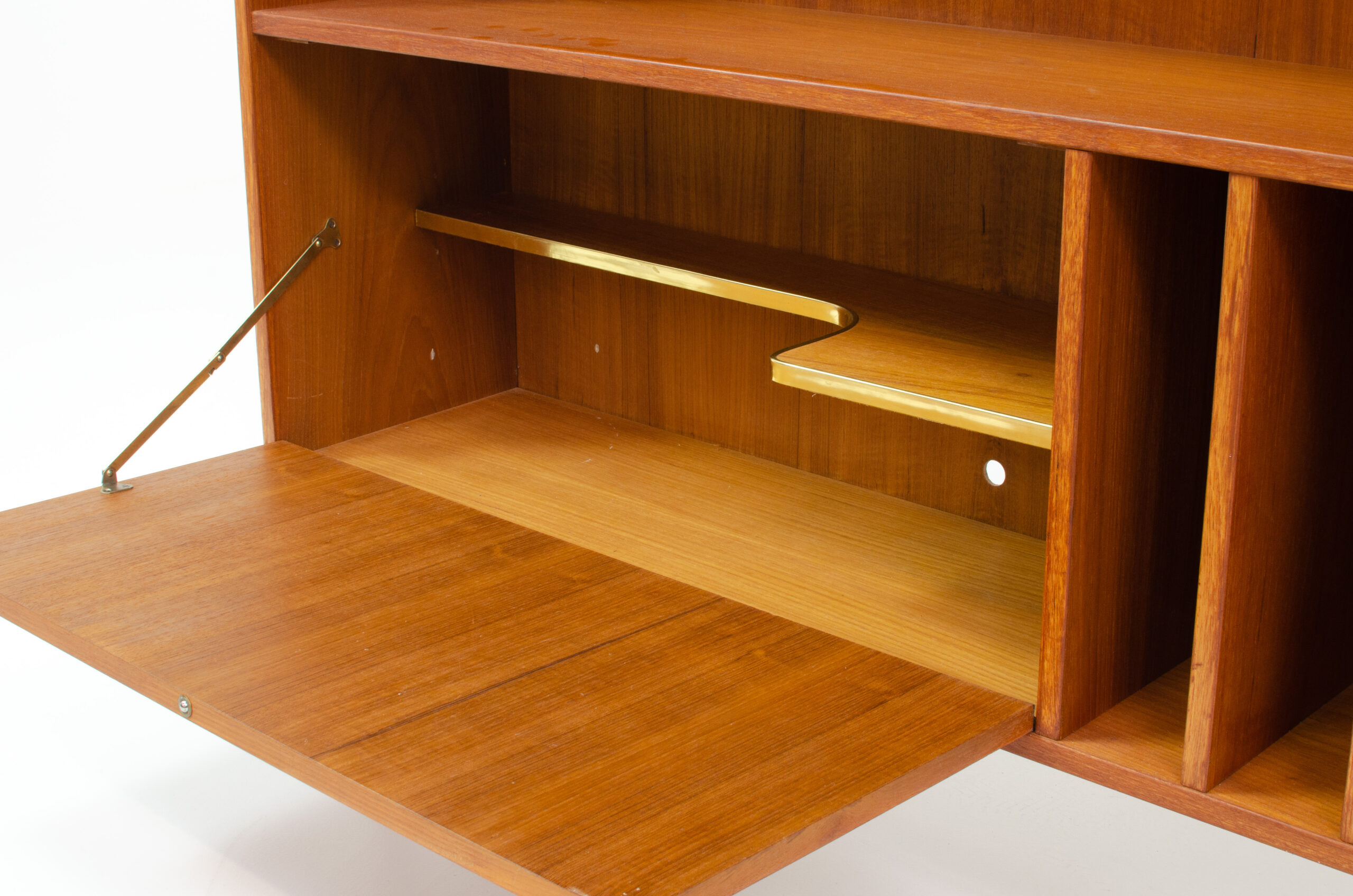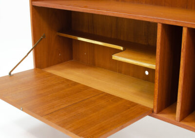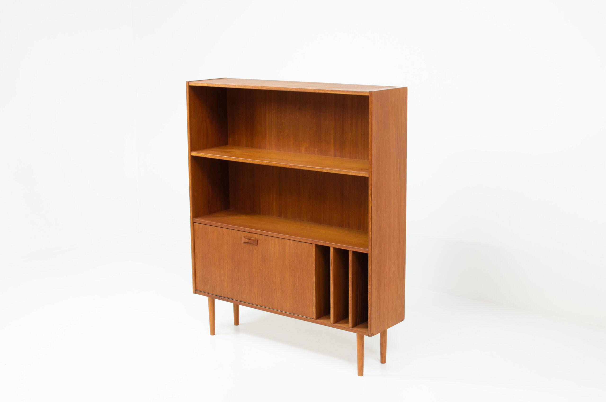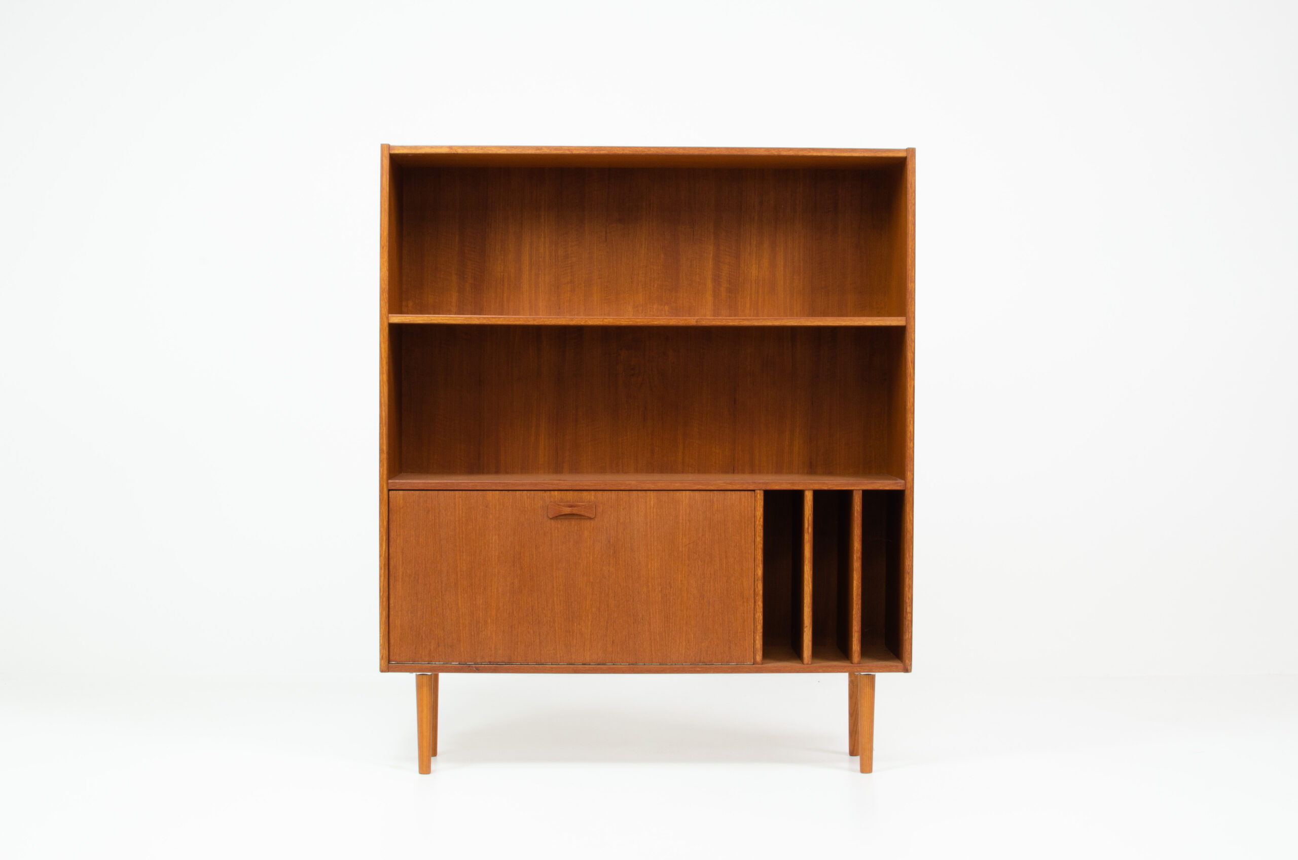 A convenient and multifunctional piece containing 2 bookshelves, a dropdown door with space for bottles and glasses and 3 record deviders.