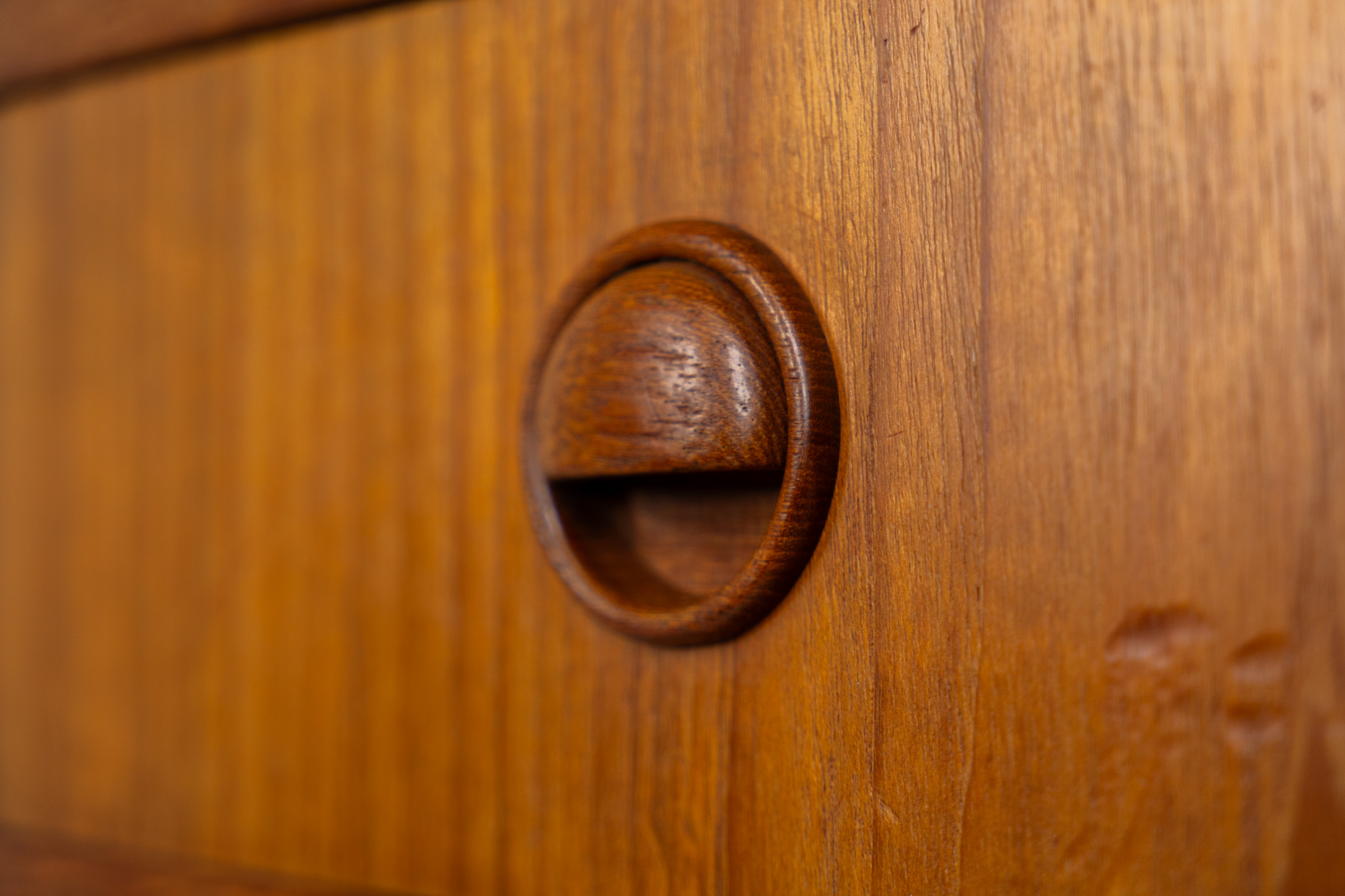 A very convenient and elegant piece with six drawers and nice organic sculpted handles, crafted out of teak.