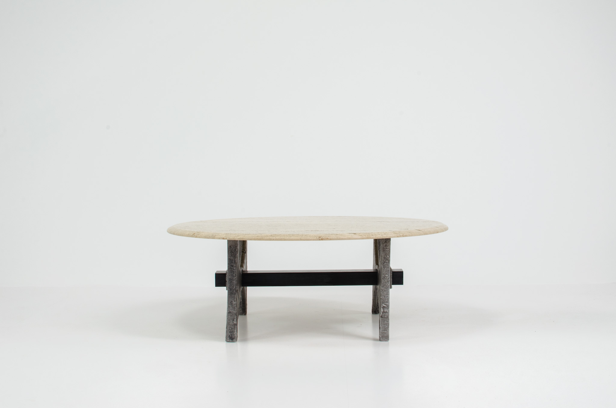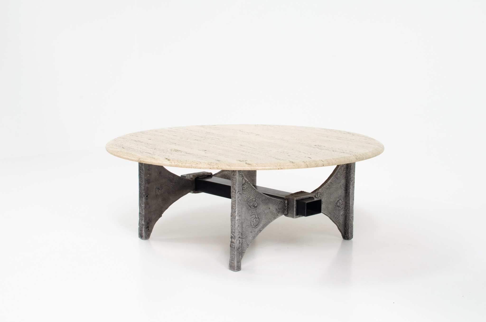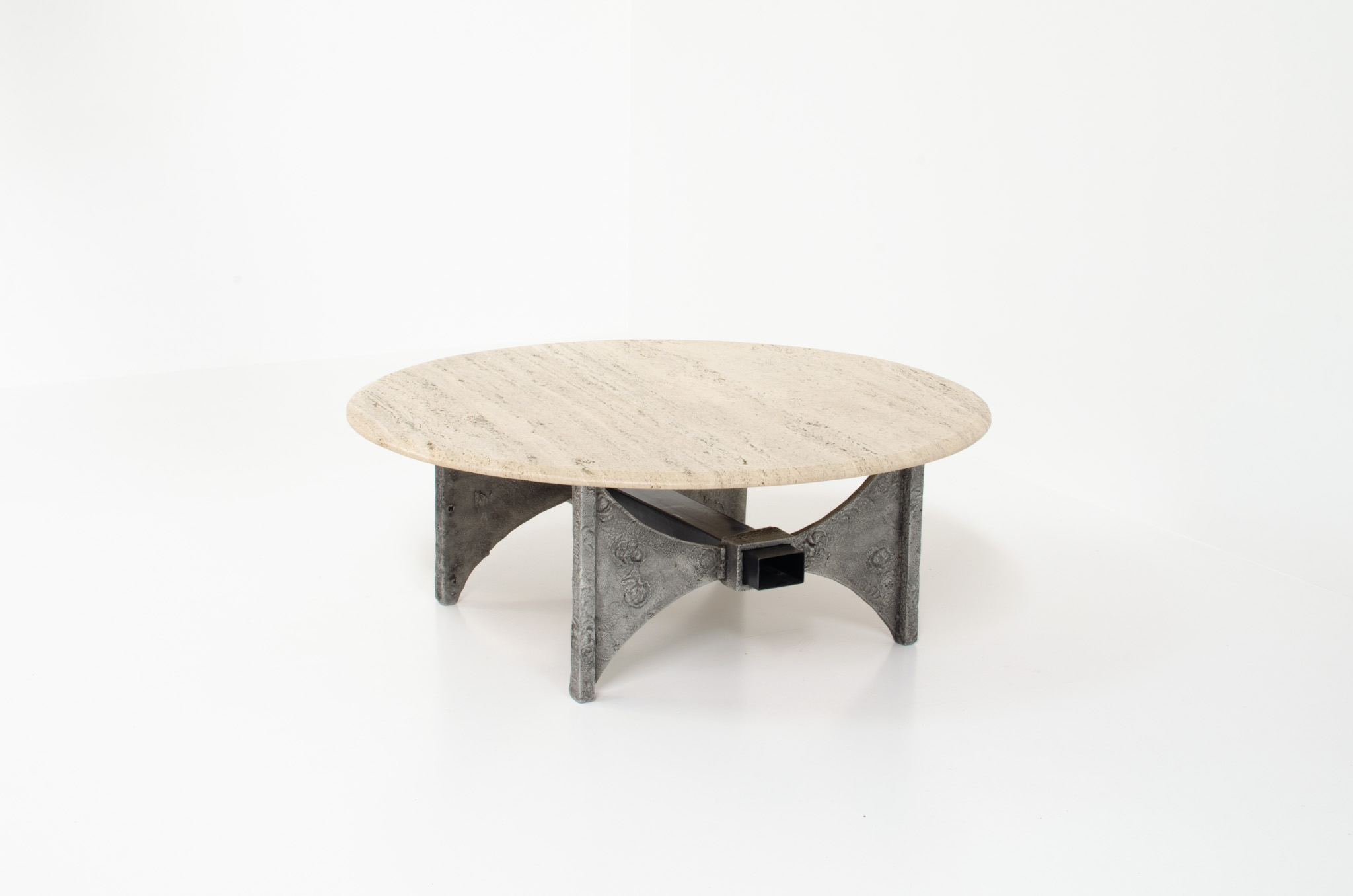 It features a large roughly grained table top with beveled edges in solid travertine and stands on a cast iron foot.
