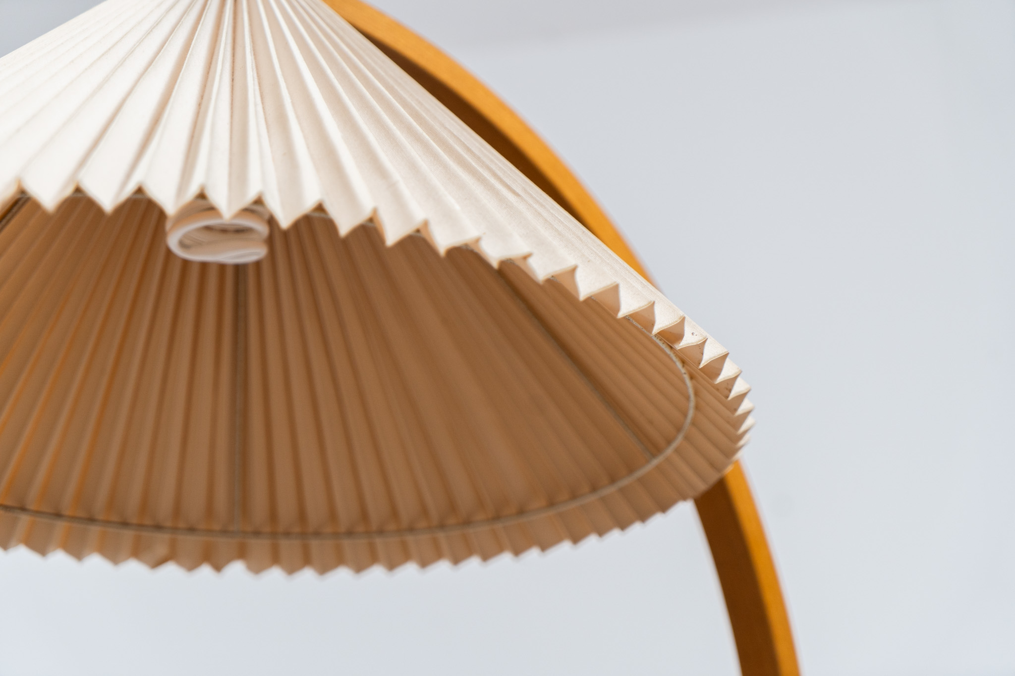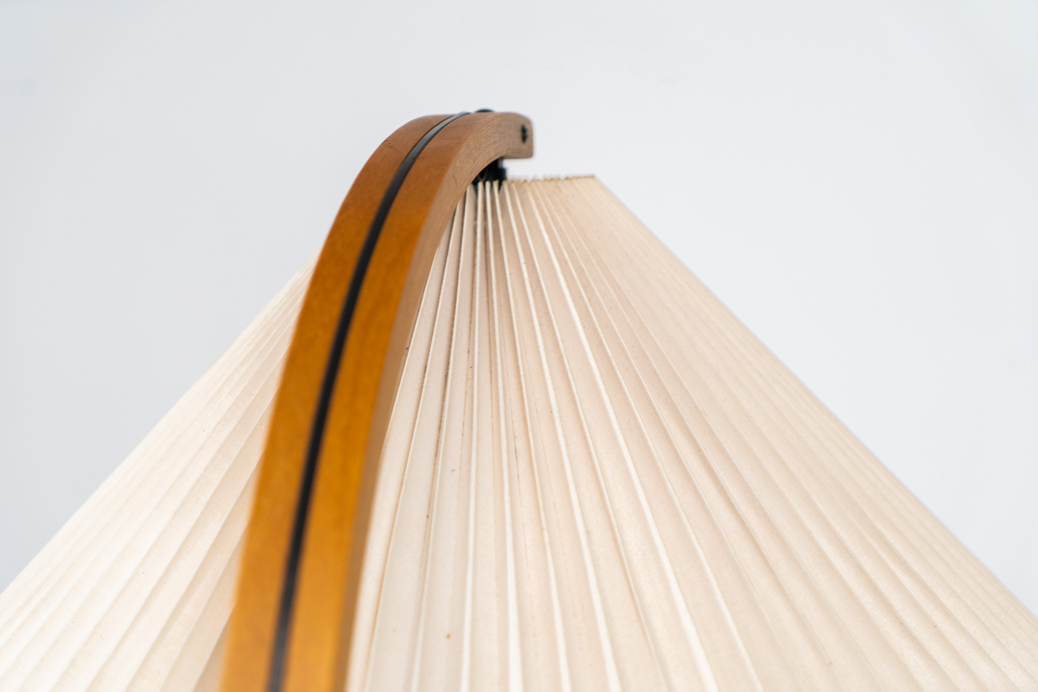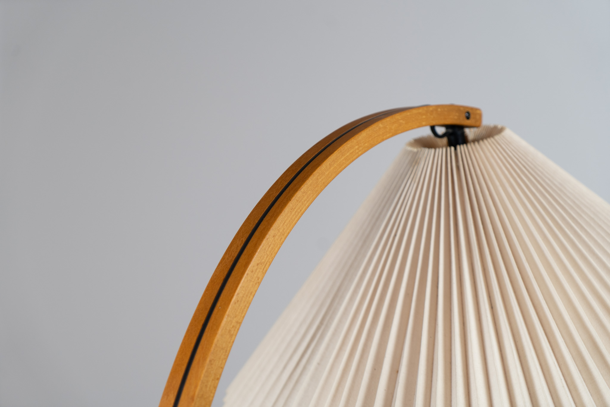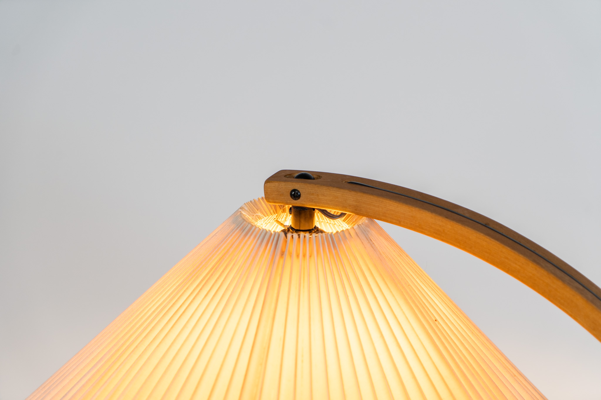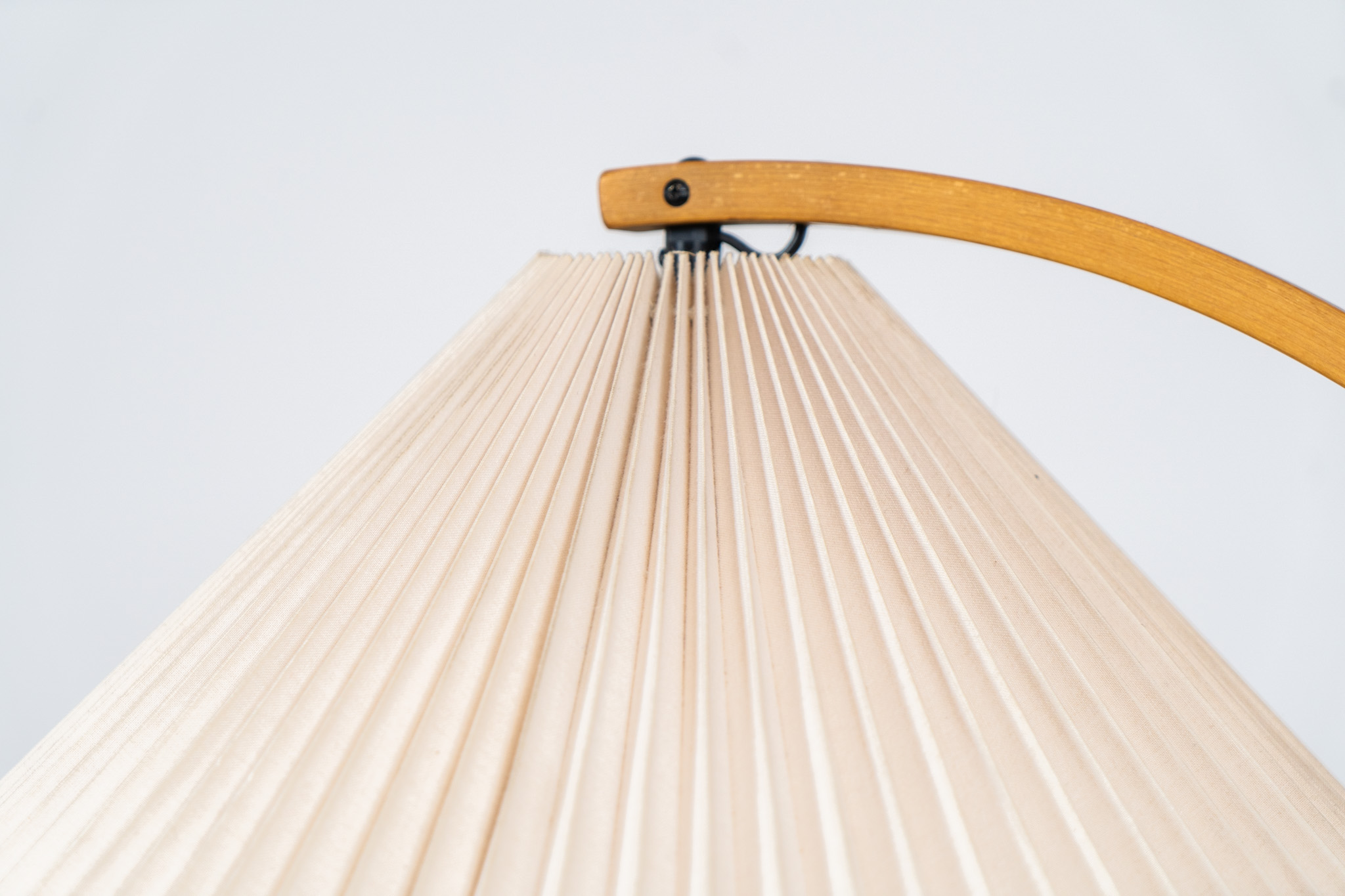 This iconic and hard to find piece features a graceful beech ark, a cast iron base and its original linen pleated shade.