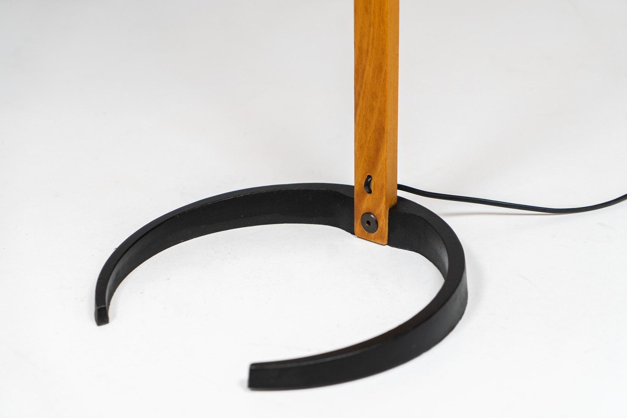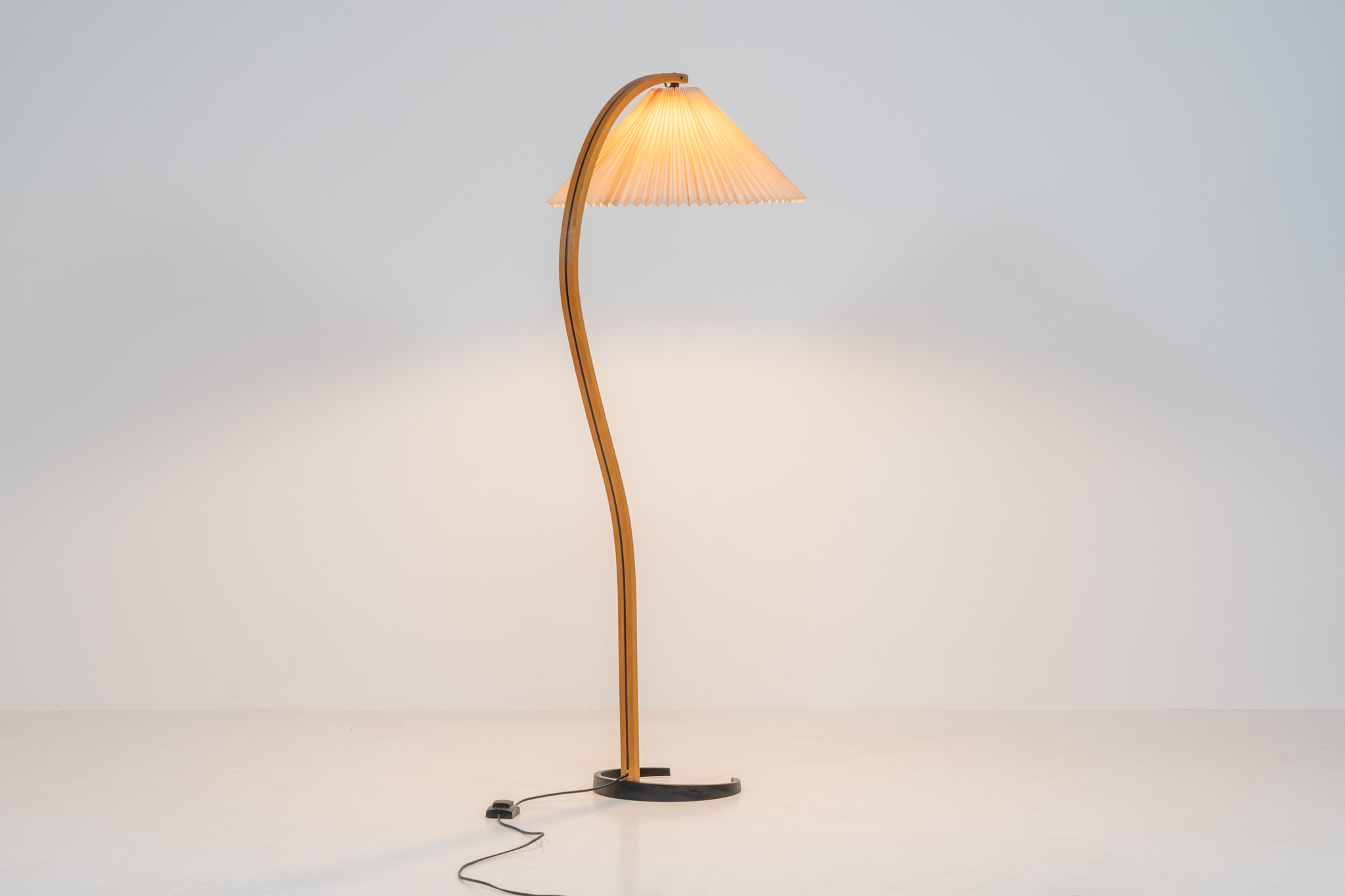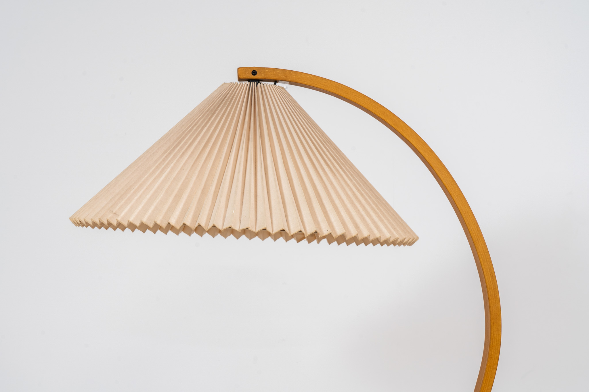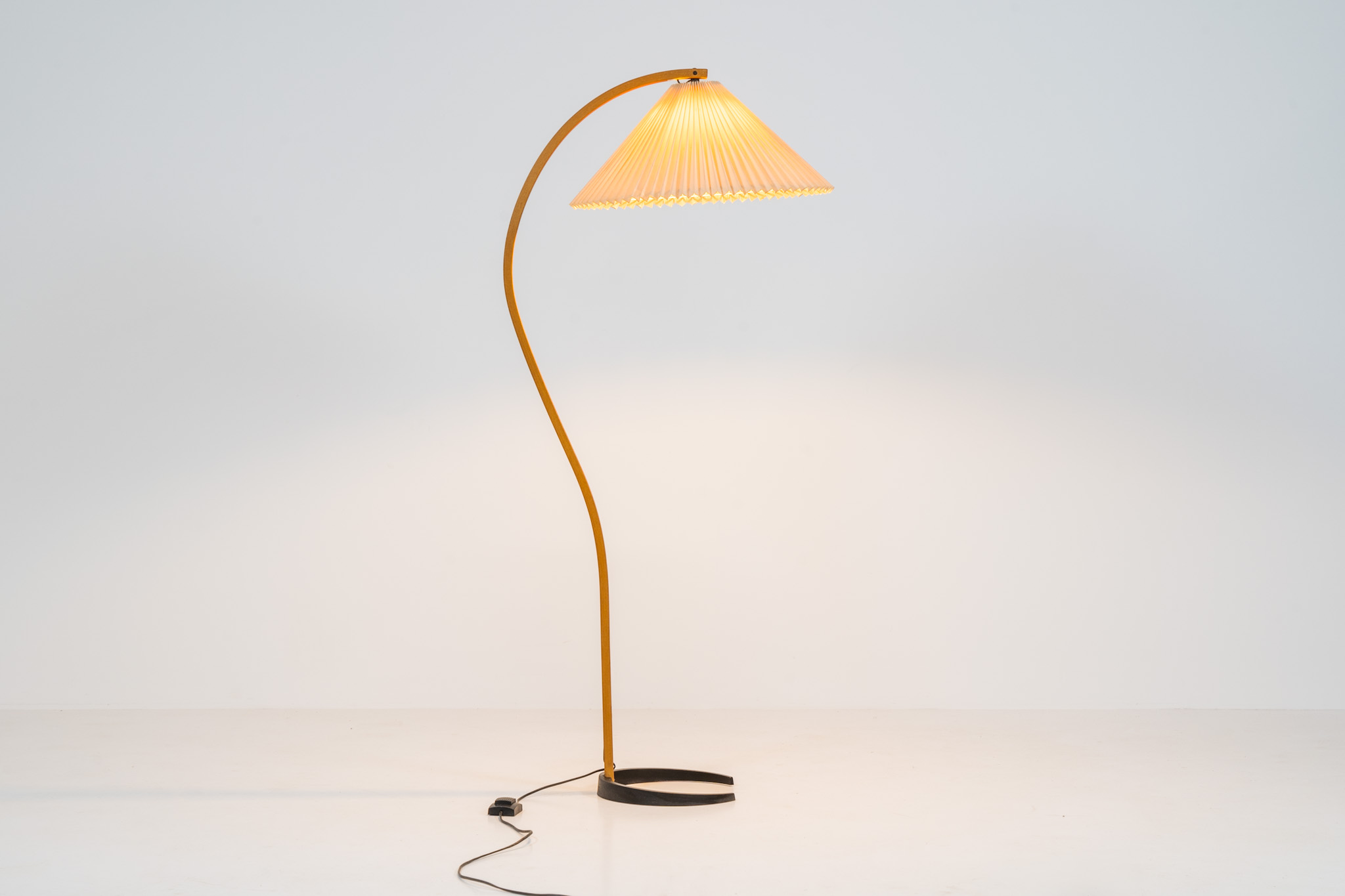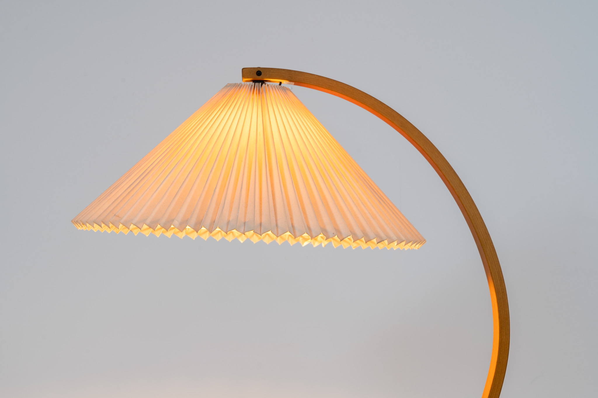 This iconic and hard to find piece features a graceful beech ark, a cast iron base and its original linen pleated shade.