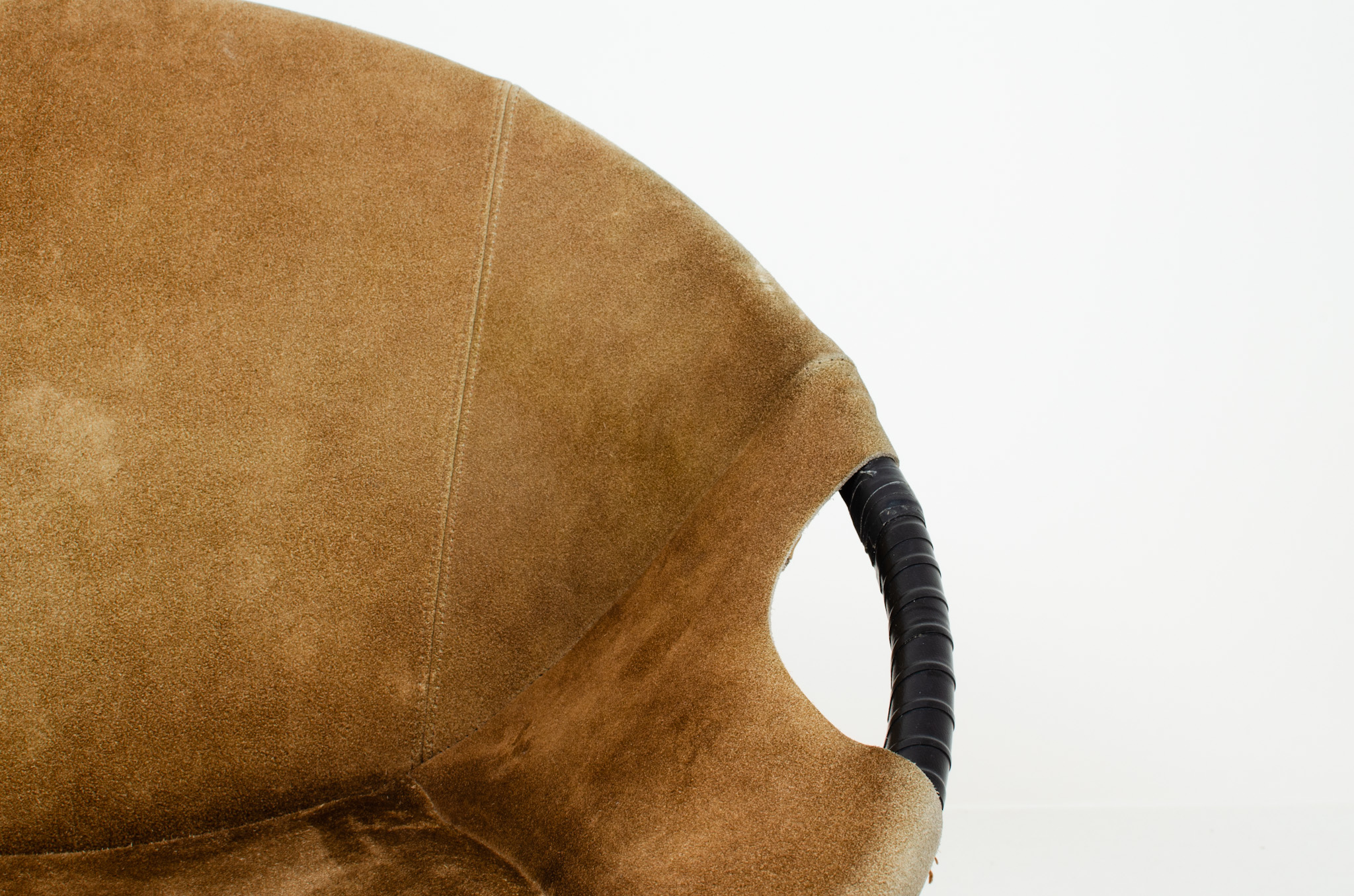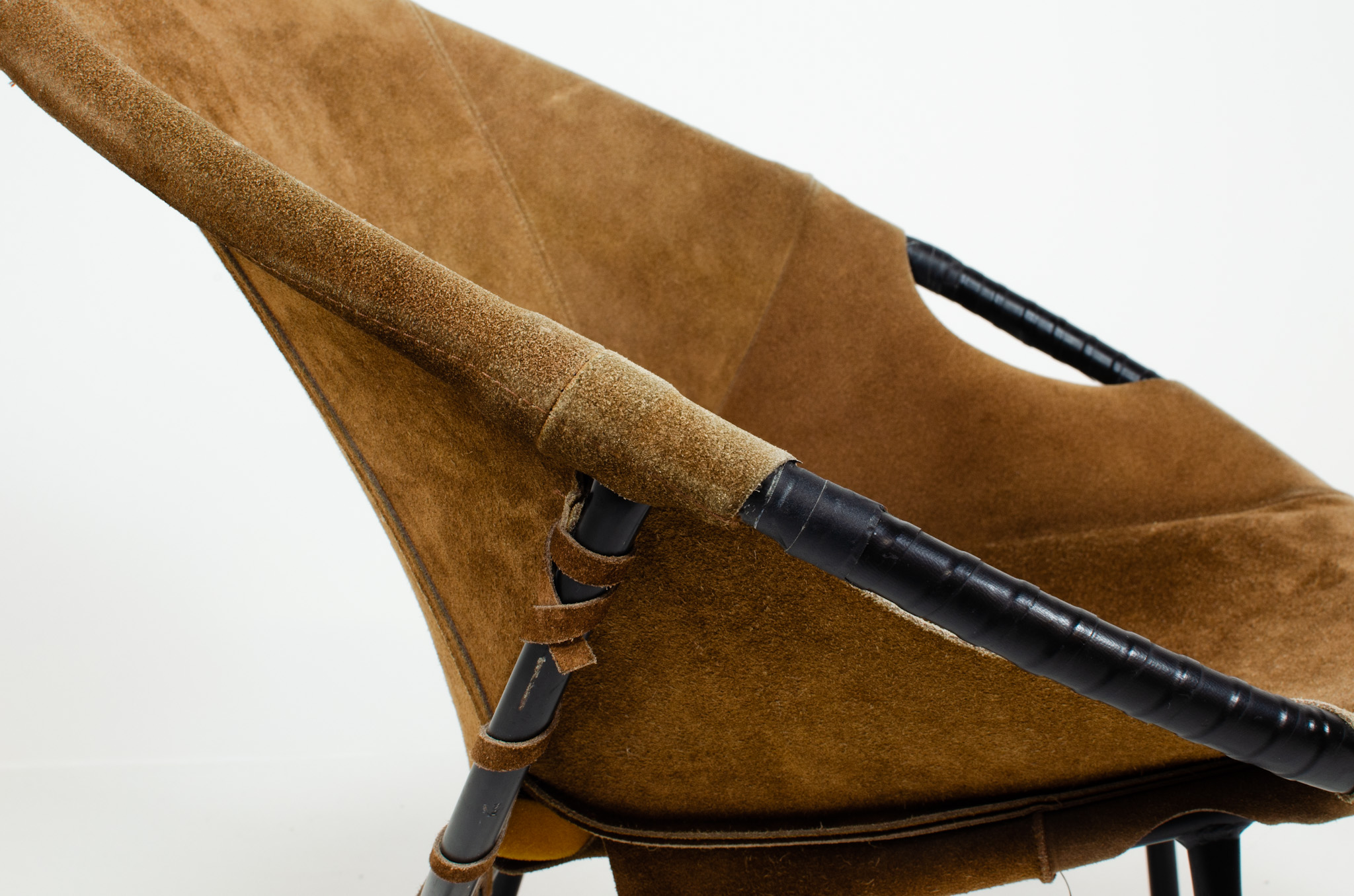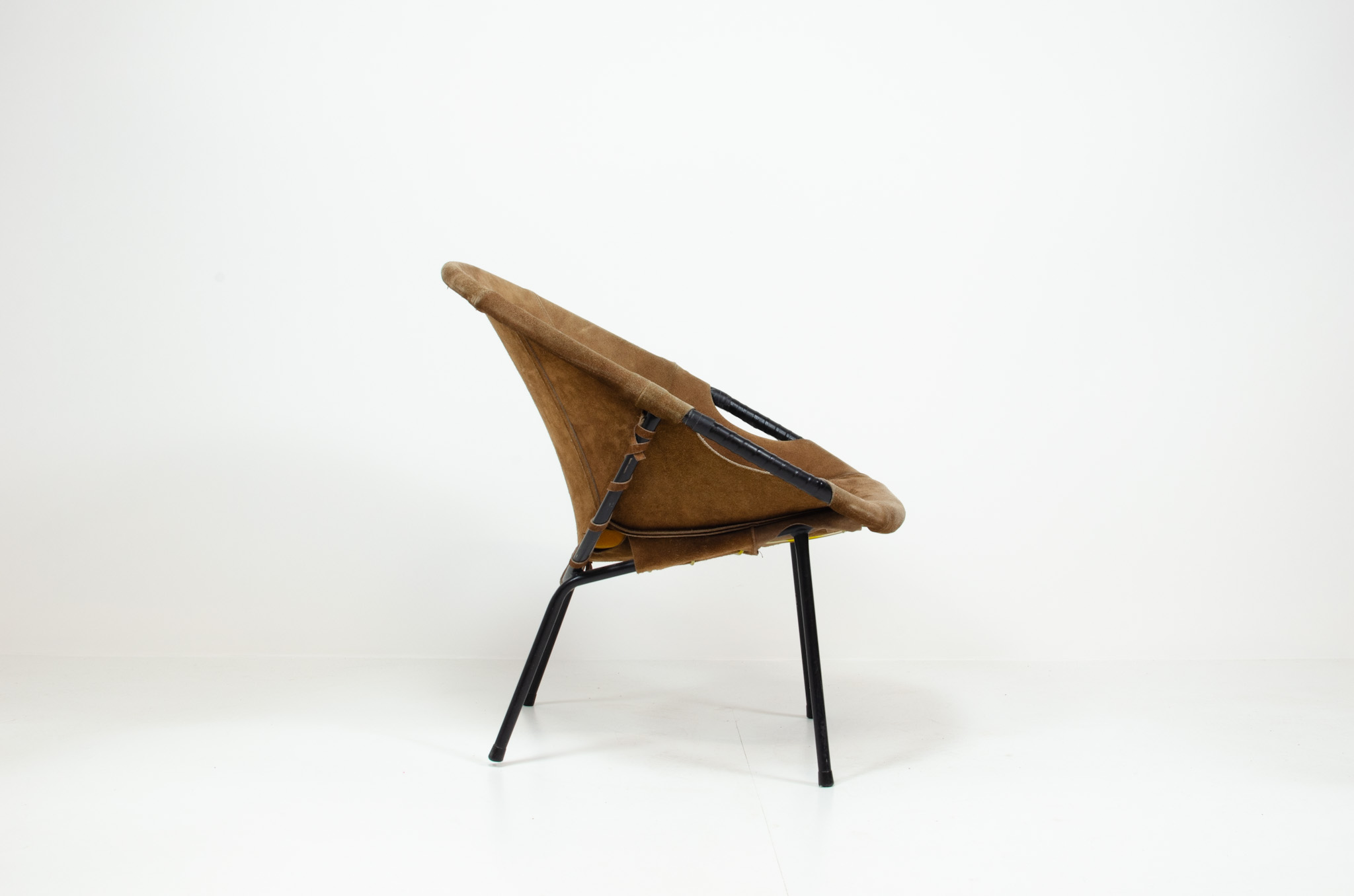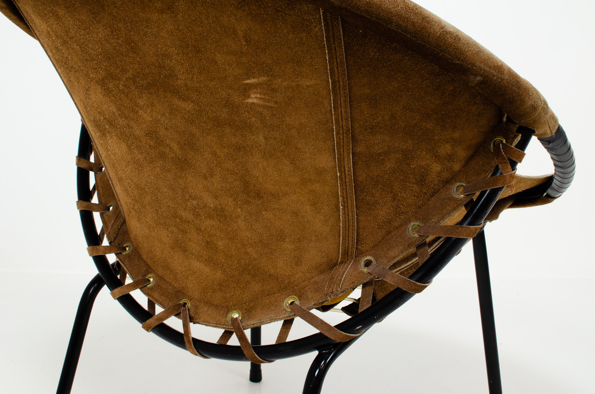 It features a black metal frame and suede leather seat. This chair is in good original vintage condition with normal traces of age.