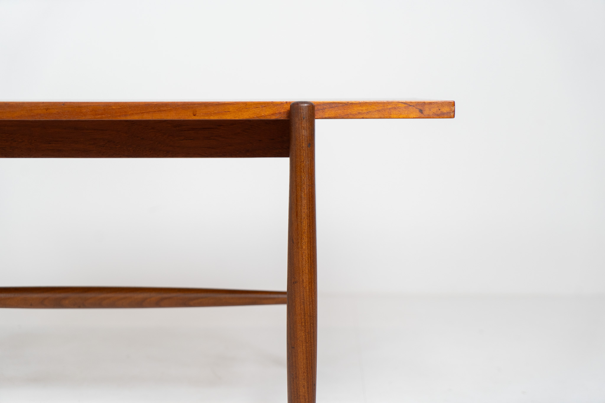 It consists of a tapered solid teak frame and a teak veneered table top.