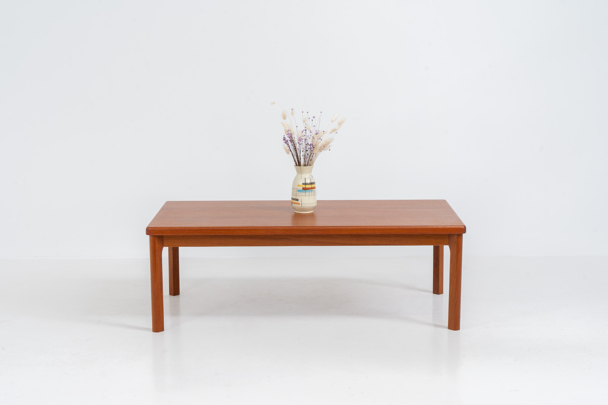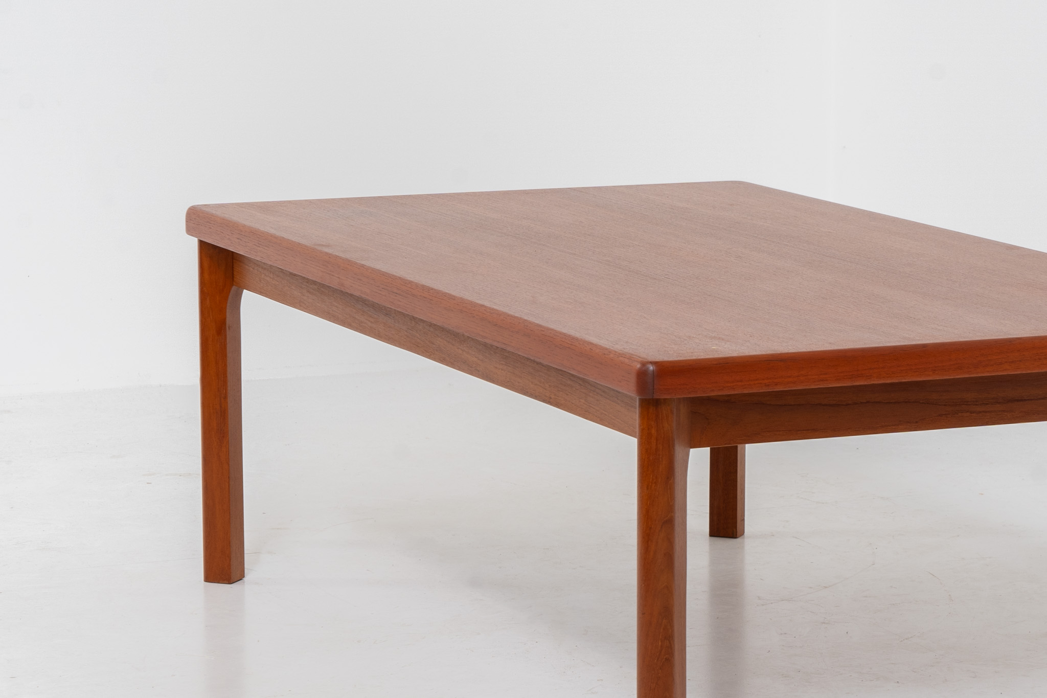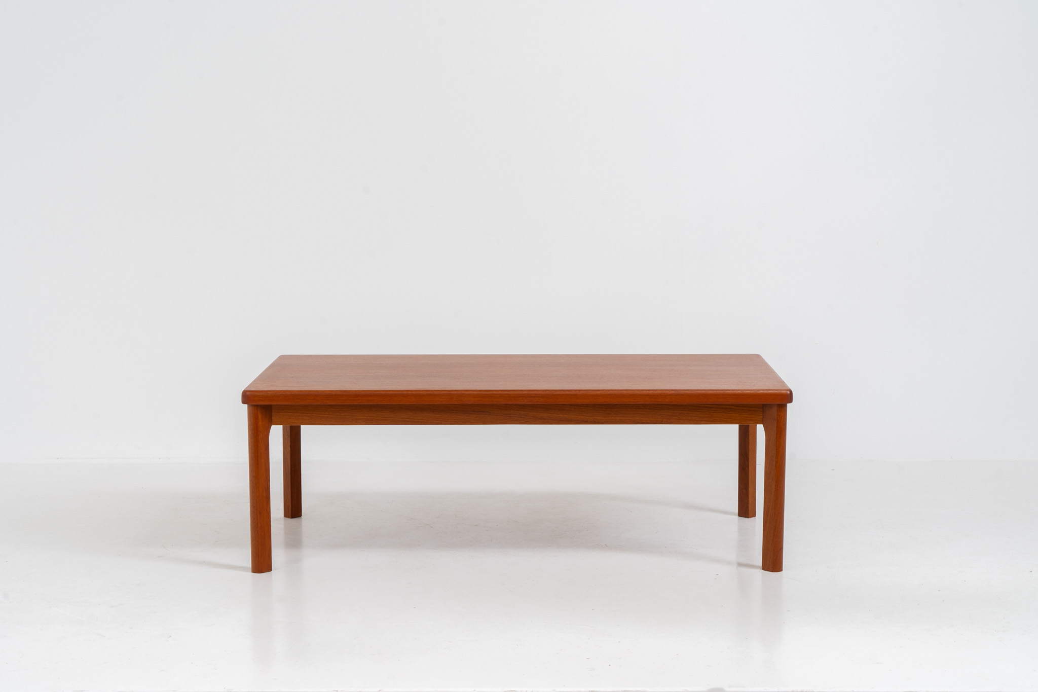 A simple sleek coffee table made out of teak. It features a nice warm wood grain and nicely sculpted solid legs.