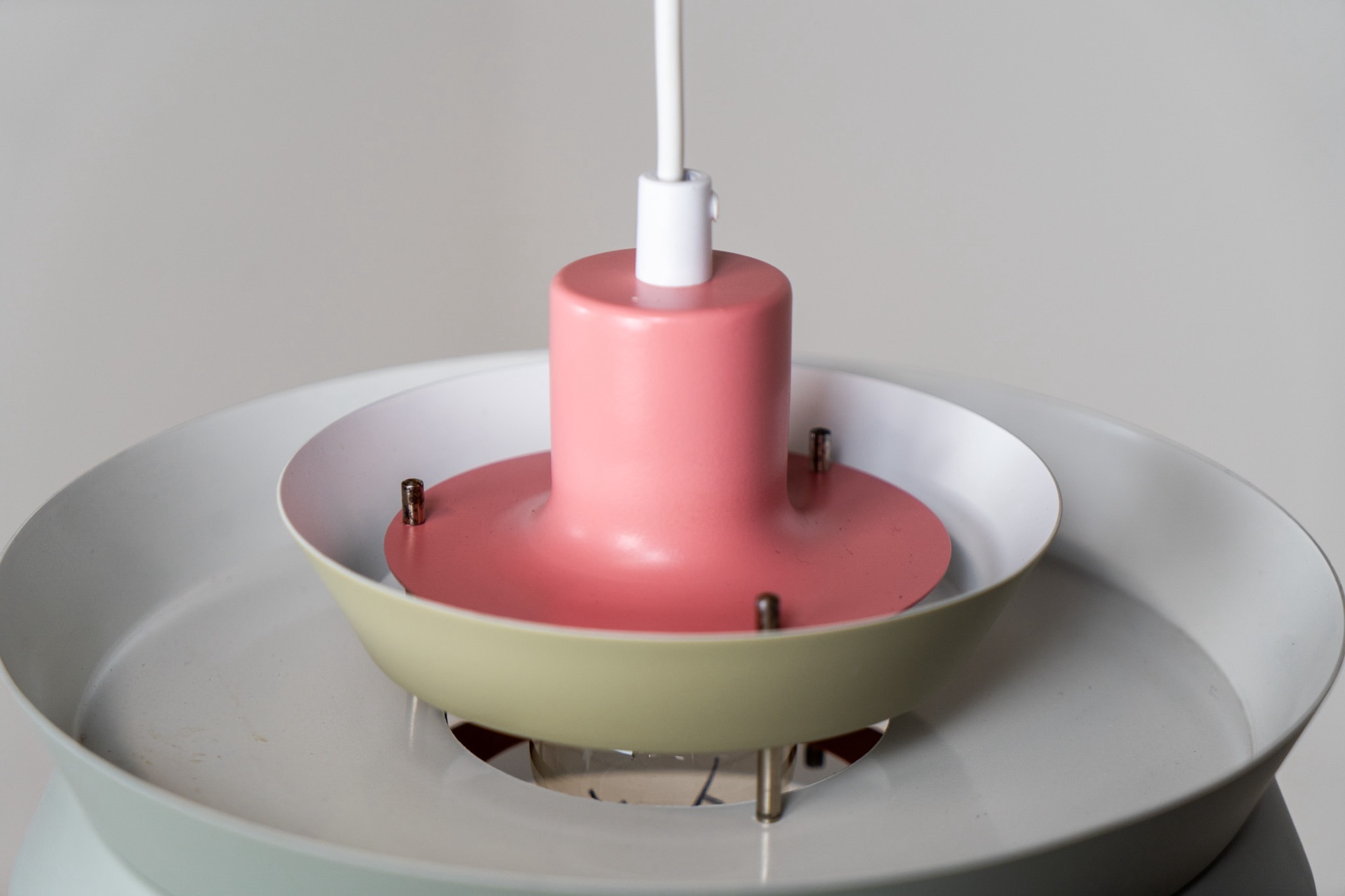 It is made out of four aluminium shades laquered in of pink, grey and orange.