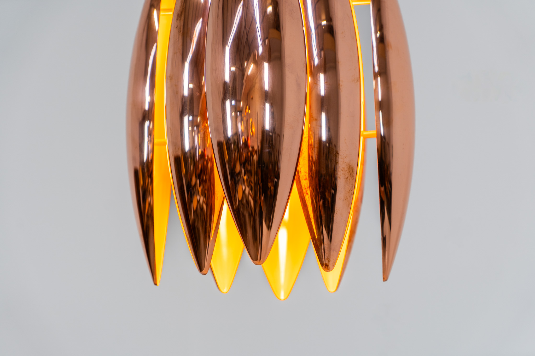 An iconic example of Scandinavian modernism! This exceptional high-end piece is constructed from layered copper shells, elegantly separated by brass spacers, offering a spectacular sculptural presence. The interior is lacquered in orange, creating a warm and atmospheric glow. When illuminated, the lamp disperses light beautifully and projects a subtle star-like pattern onto the ceiling.