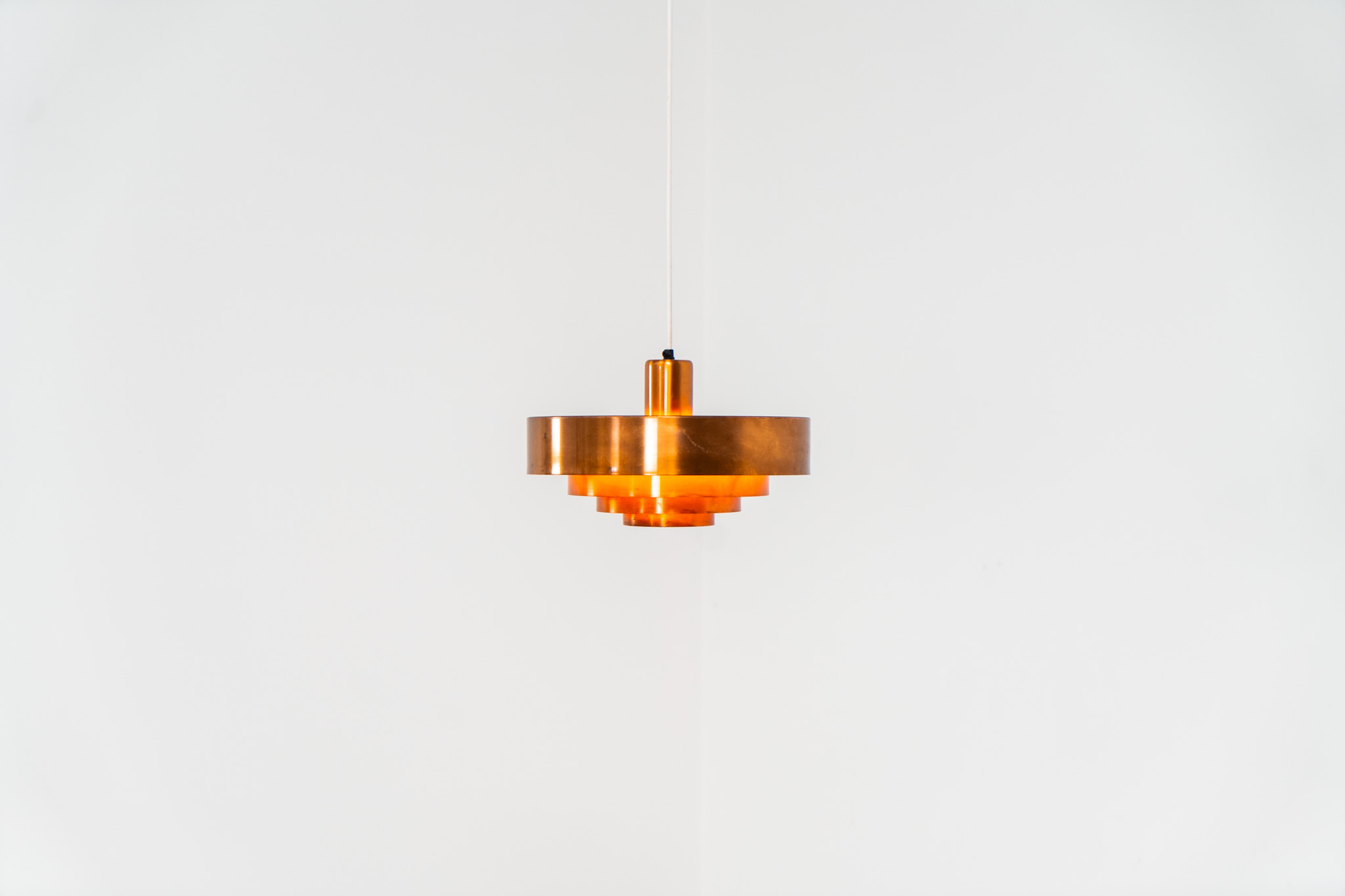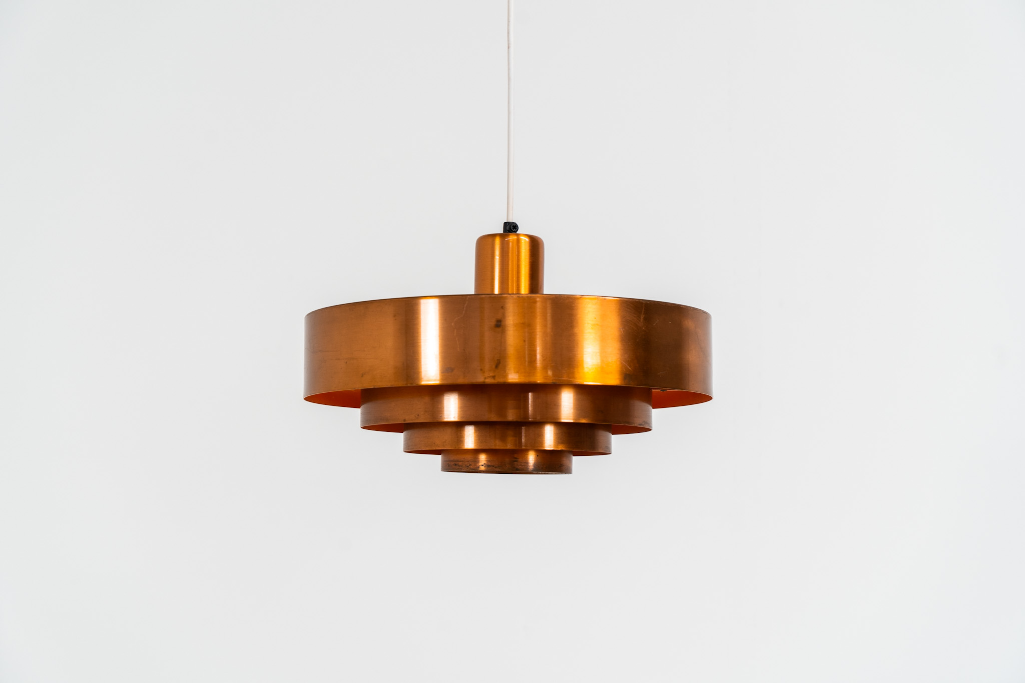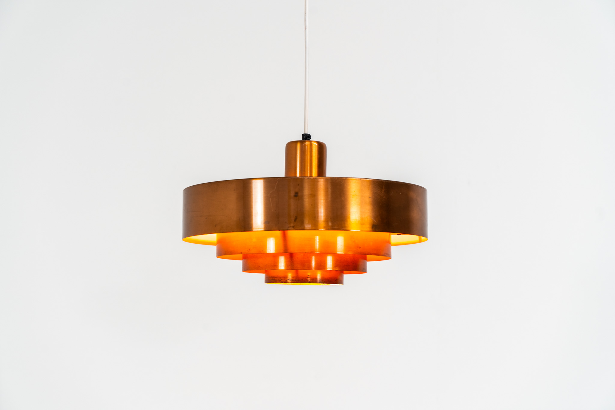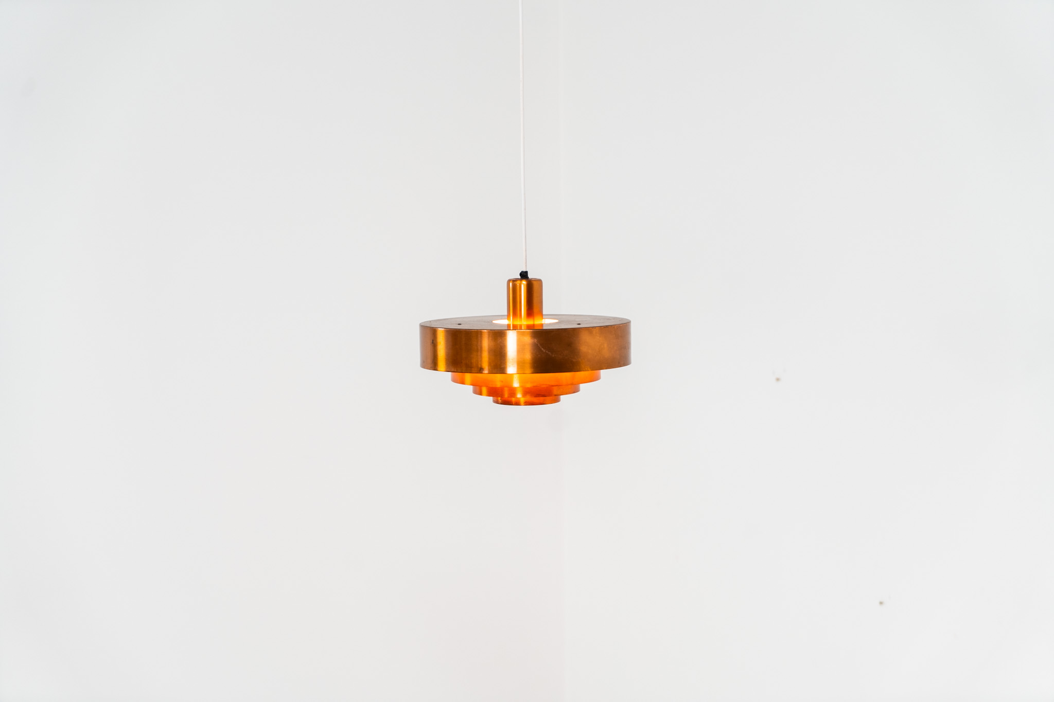 In our opinion, this is one of Hammerborg’s most stunning designs and increasingly hard to find. Made from solid copper rings with orange detailing on the interior, this lamp is a striking piece, both on and off.