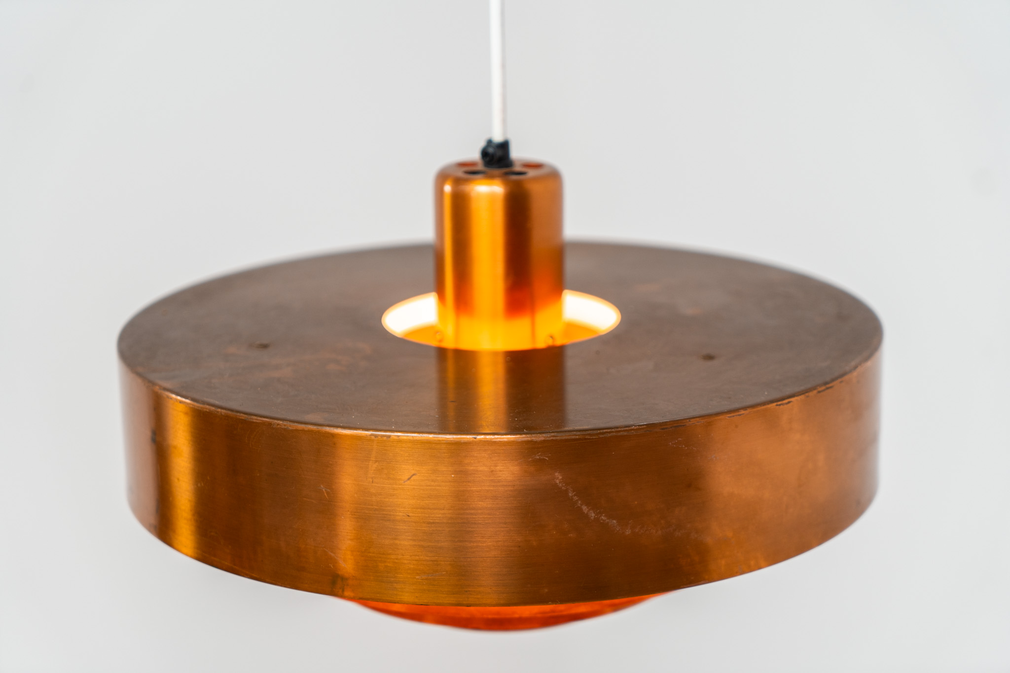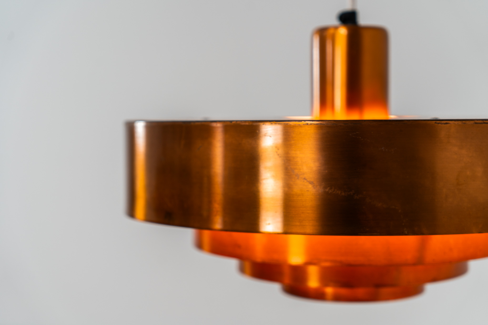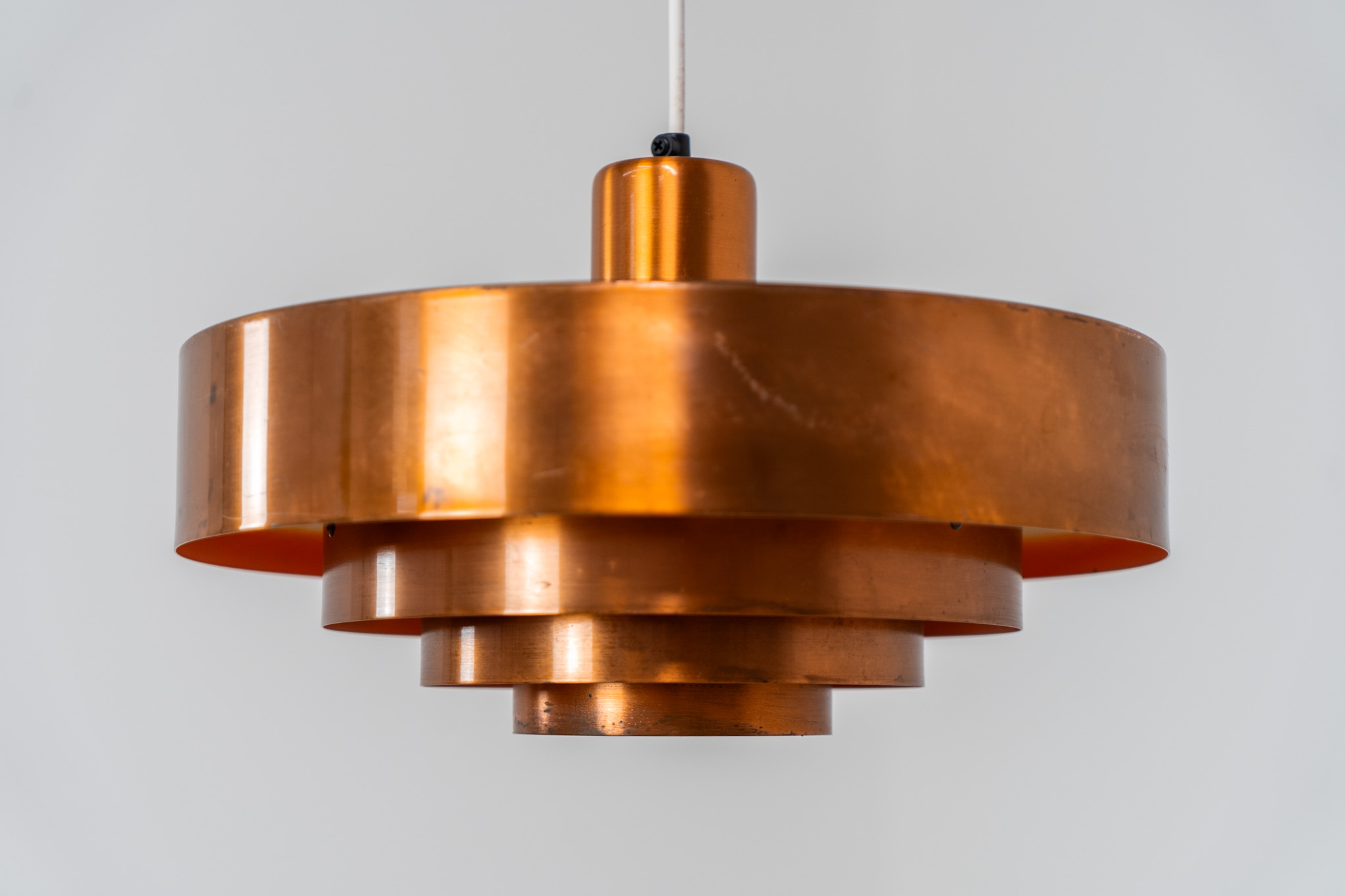 In our opinion, this is one of Hammerborg’s most stunning designs and increasingly hard to find. Made from solid copper rings with orange detailing on the interior, this lamp is a striking piece, both on and off.