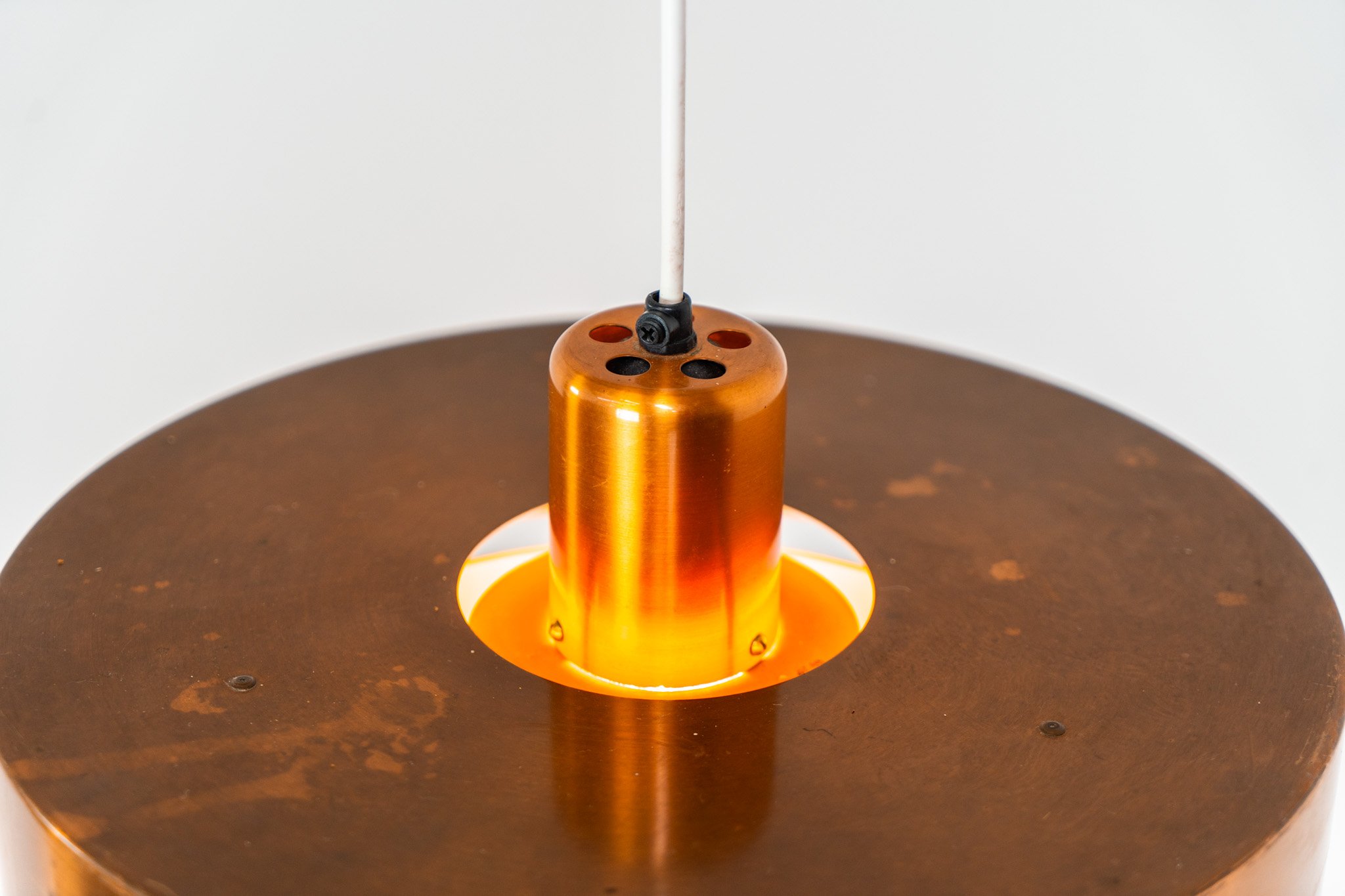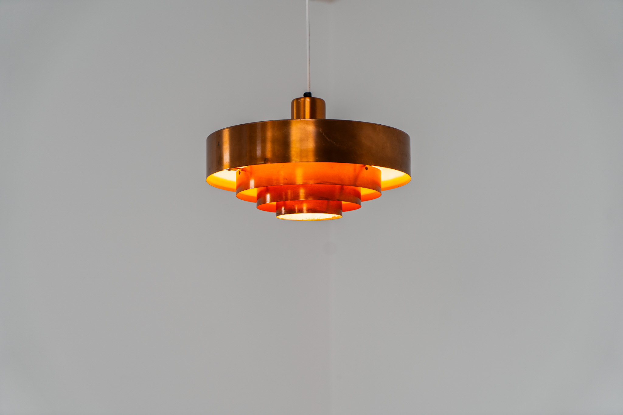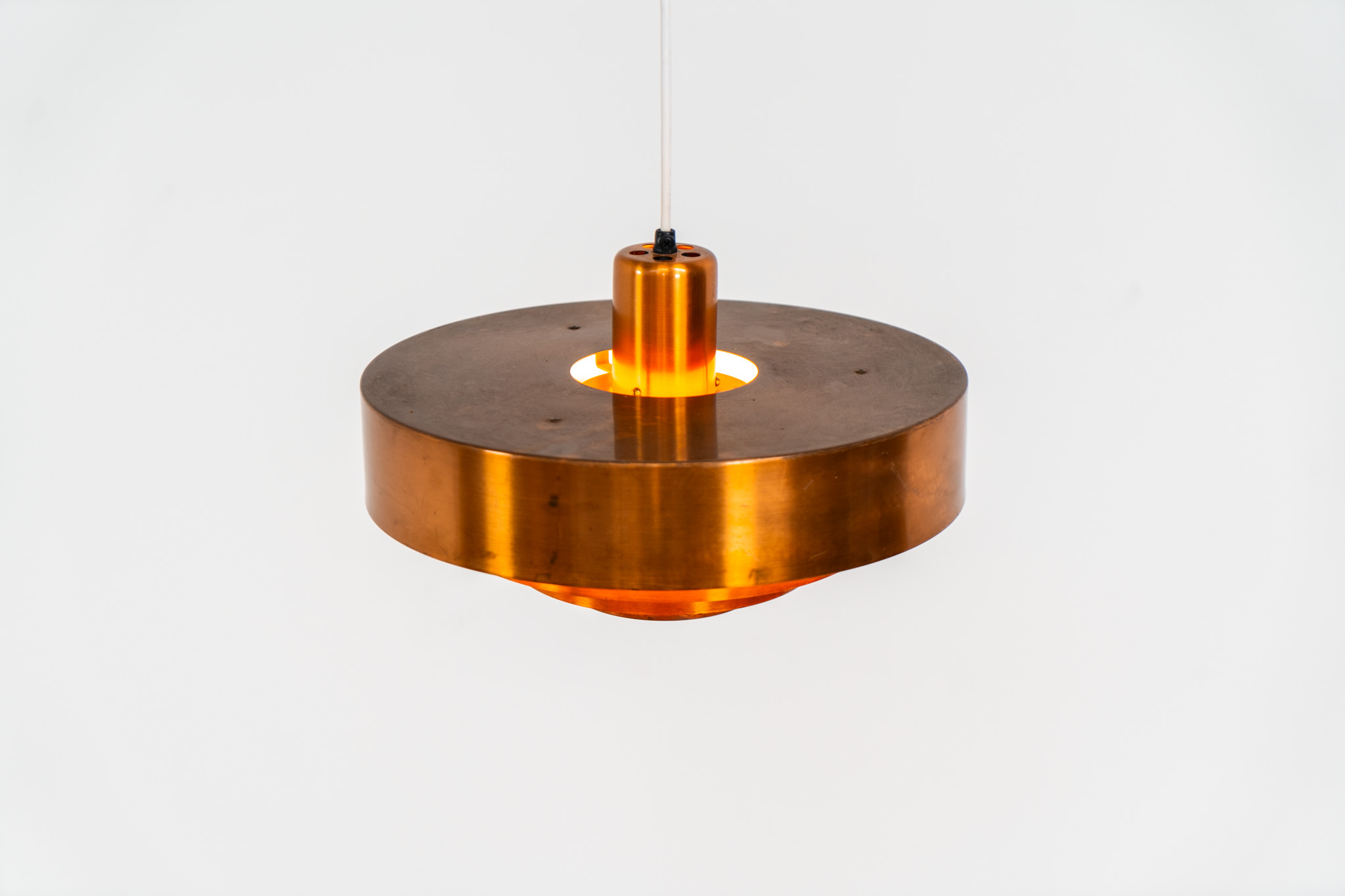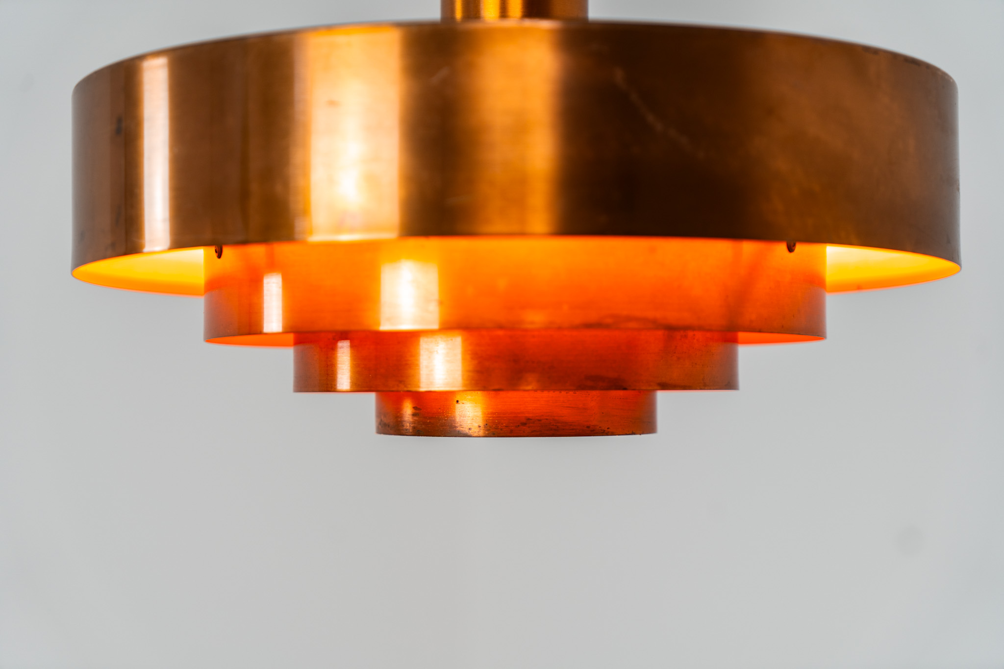 In our opinion, this is one of Hammerborg’s most stunning designs and increasingly hard to find. Made from solid copper rings with orange detailing on the interior, this lamp is a striking piece, both on and off.