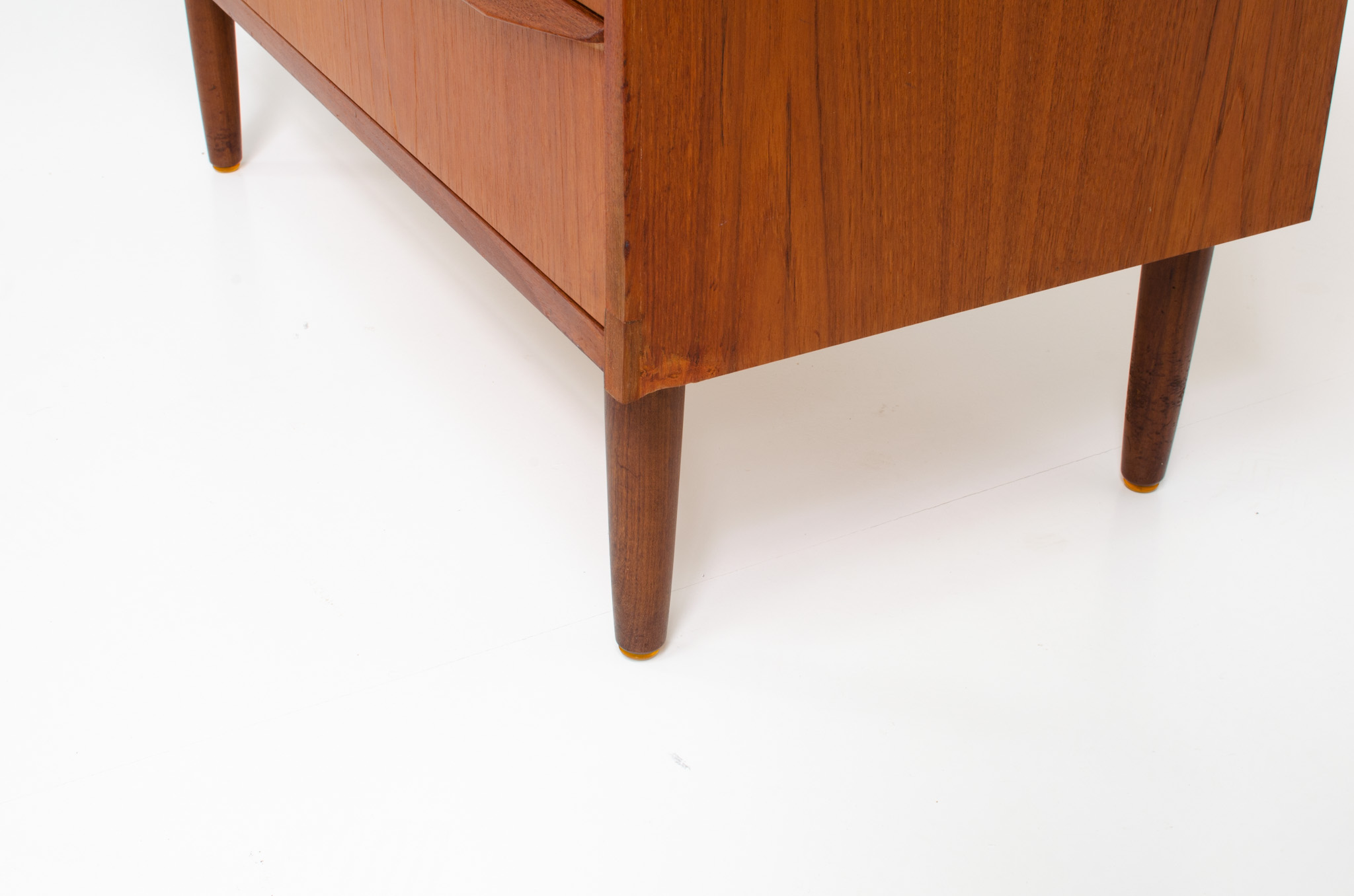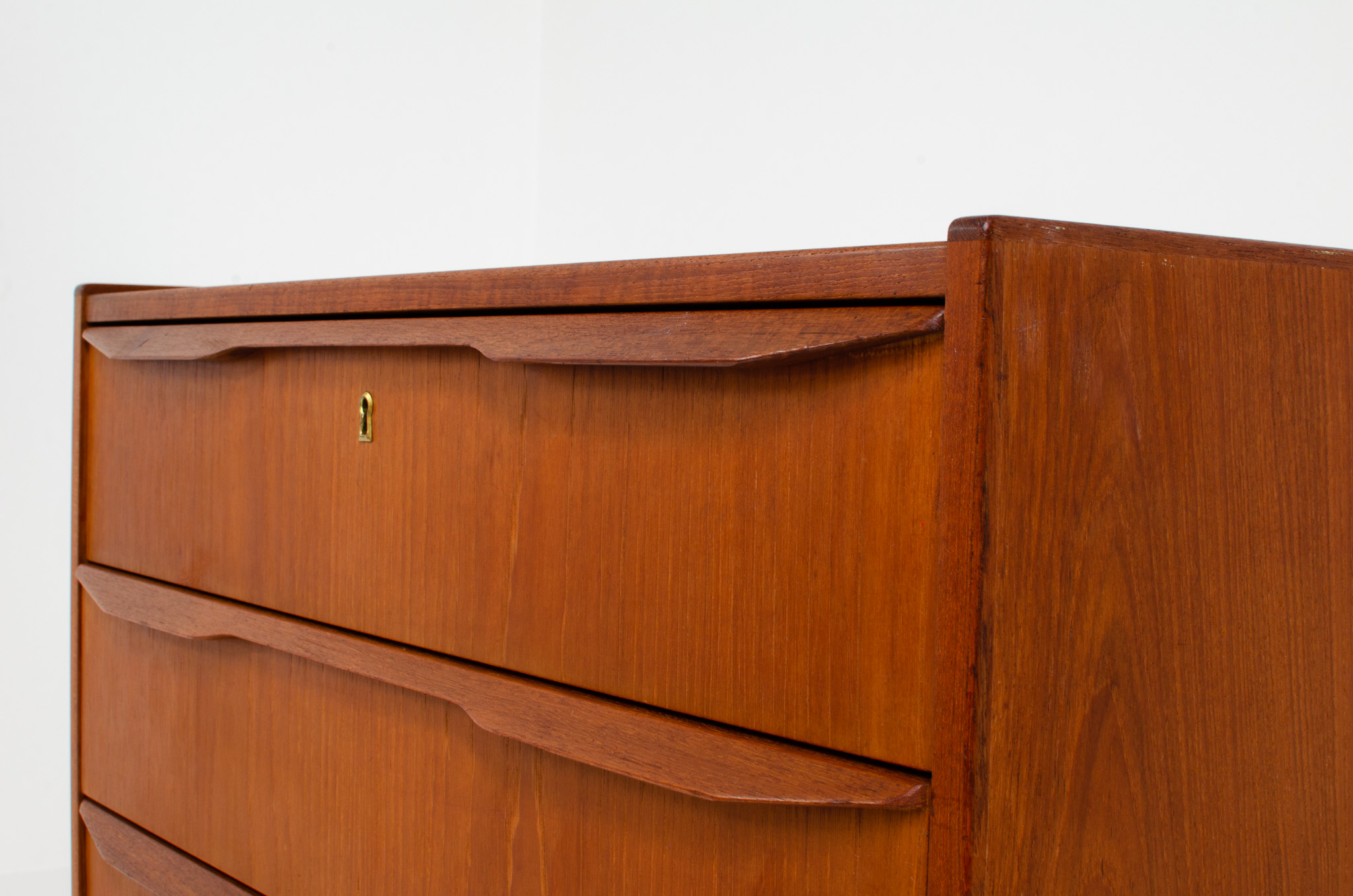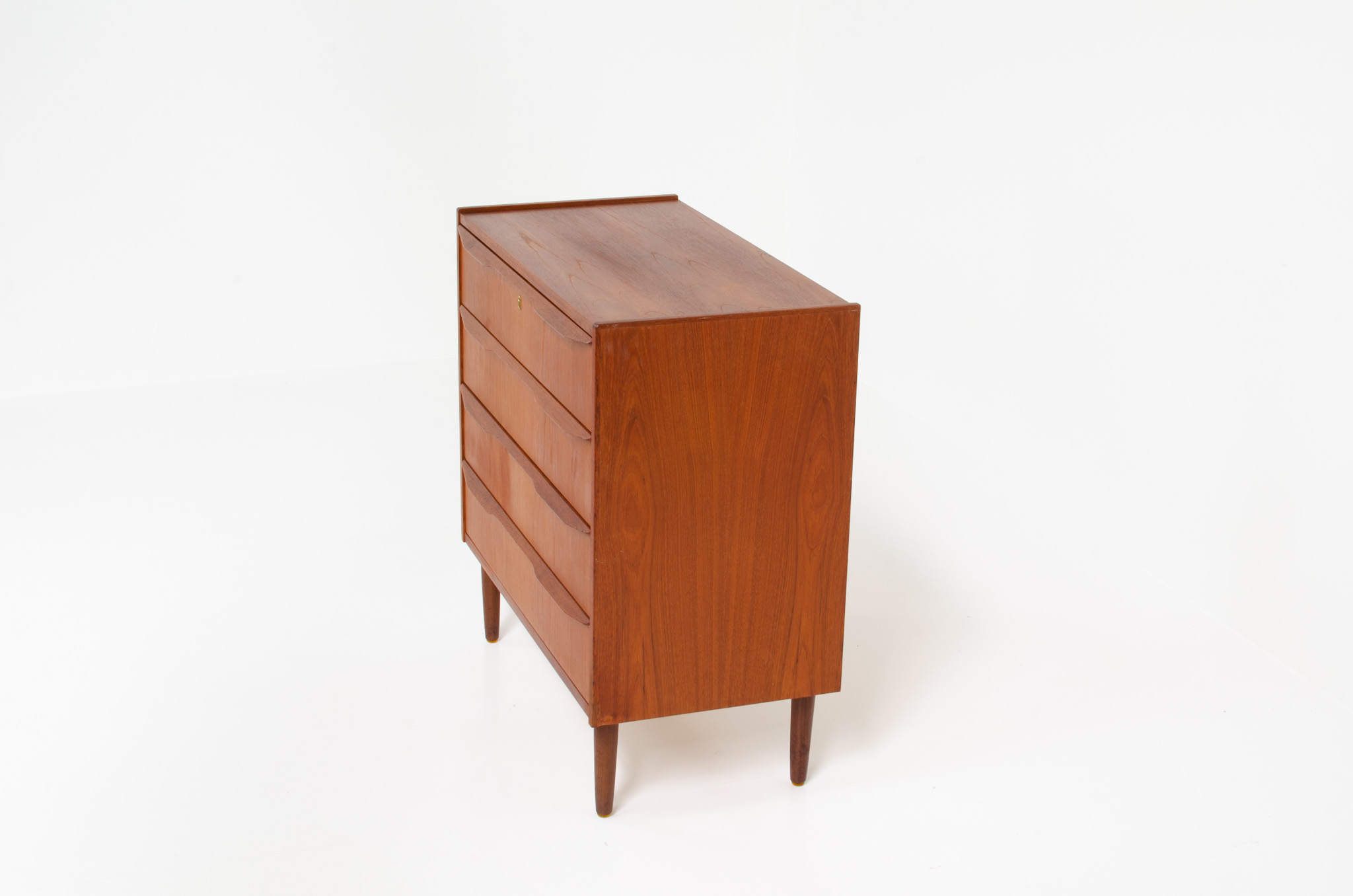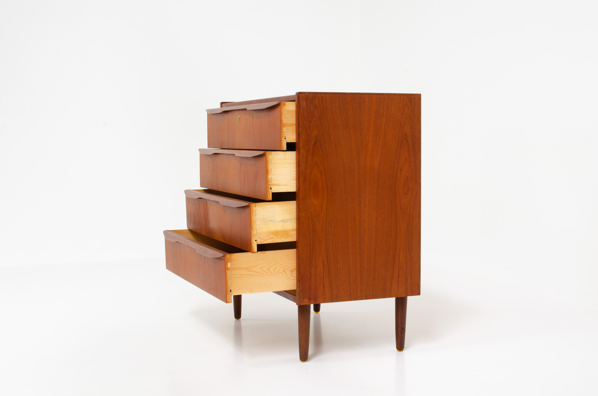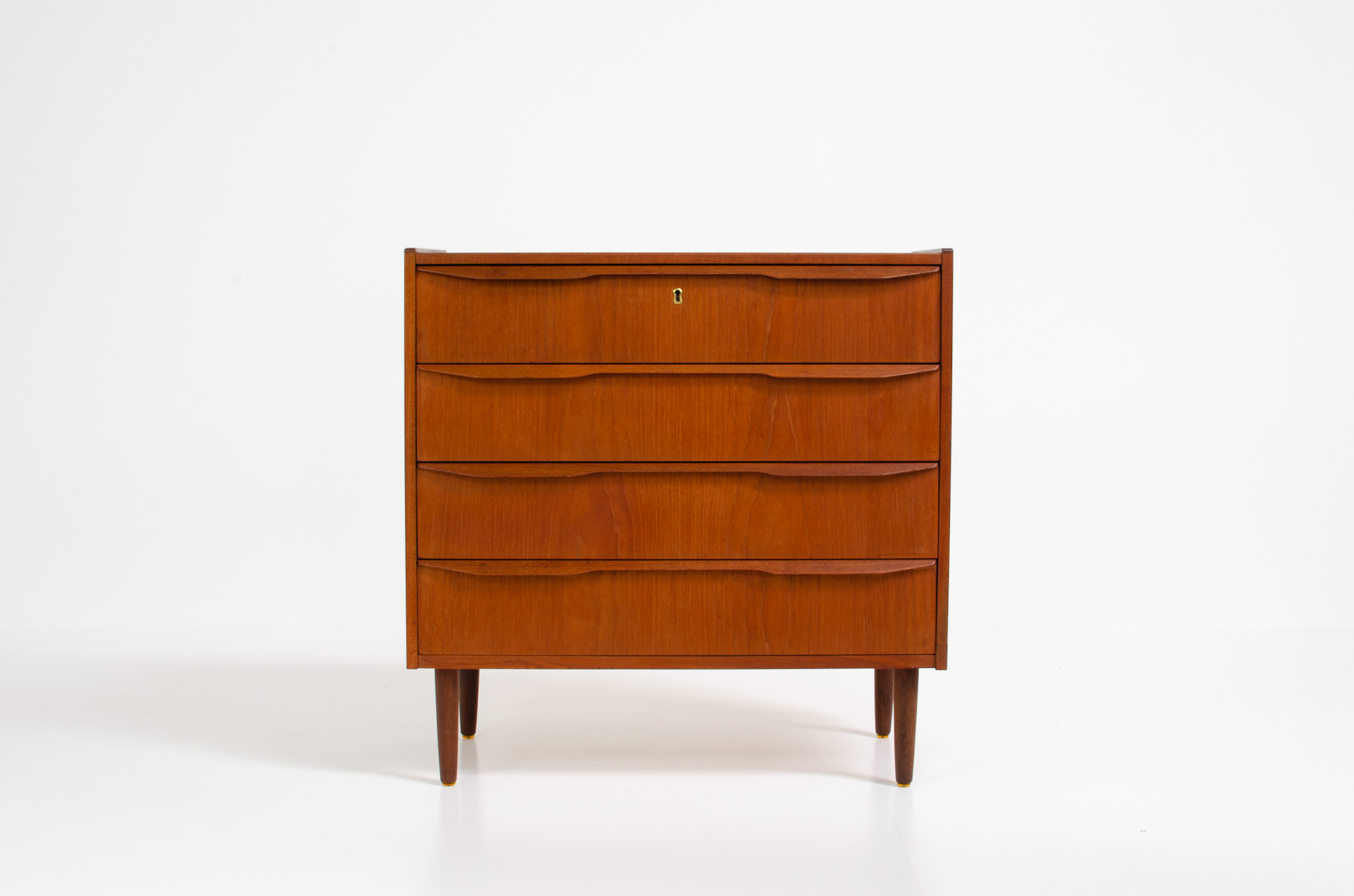 An elegant piece with four drawers featuring a nice woodgrain and amazing sculpted handles. In good condition with a repair mark on one corner.