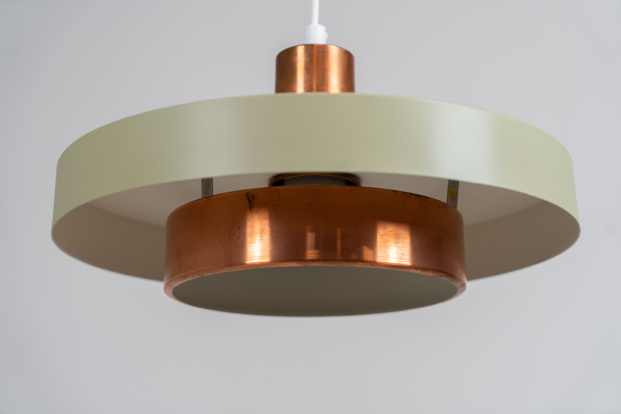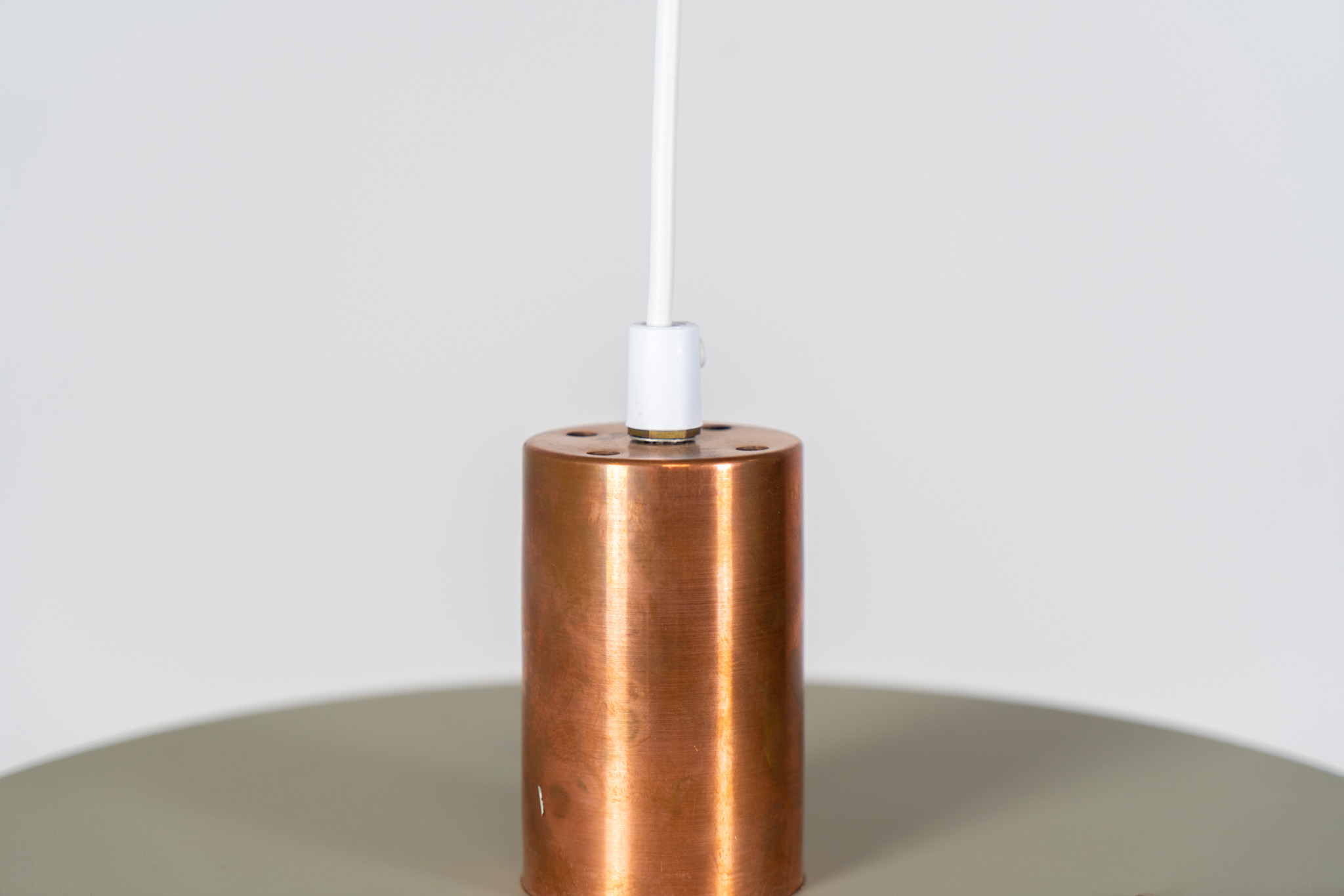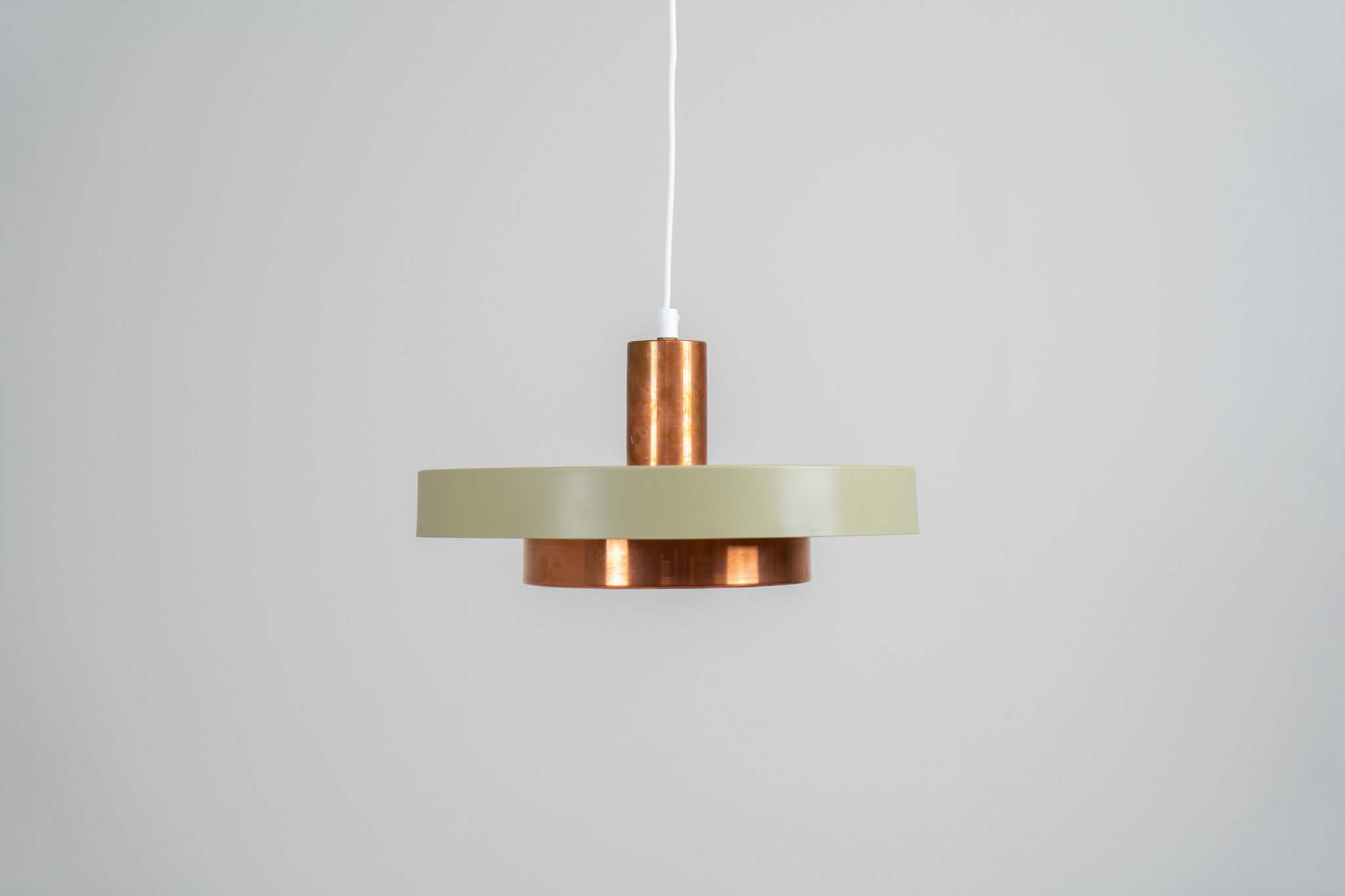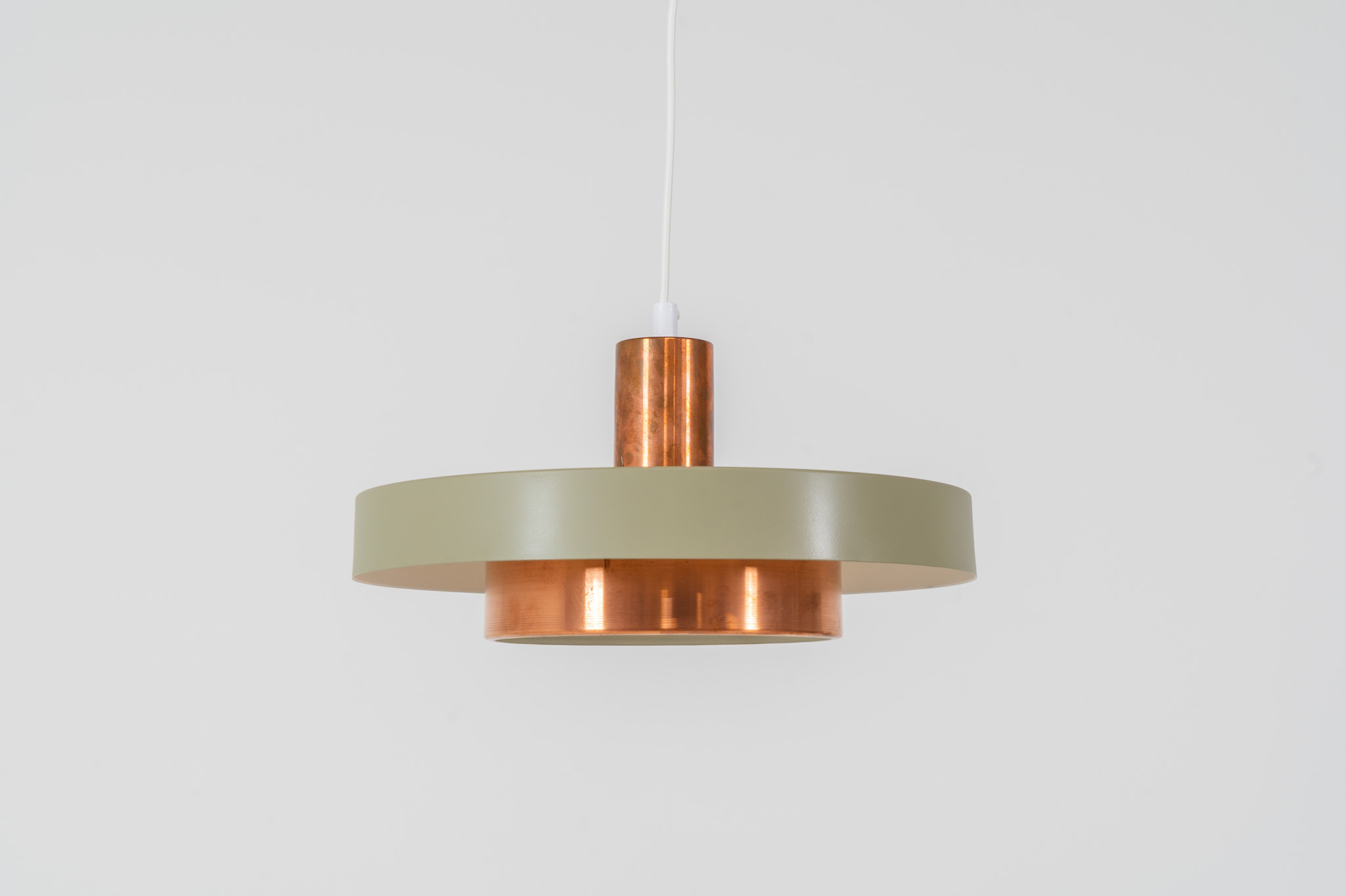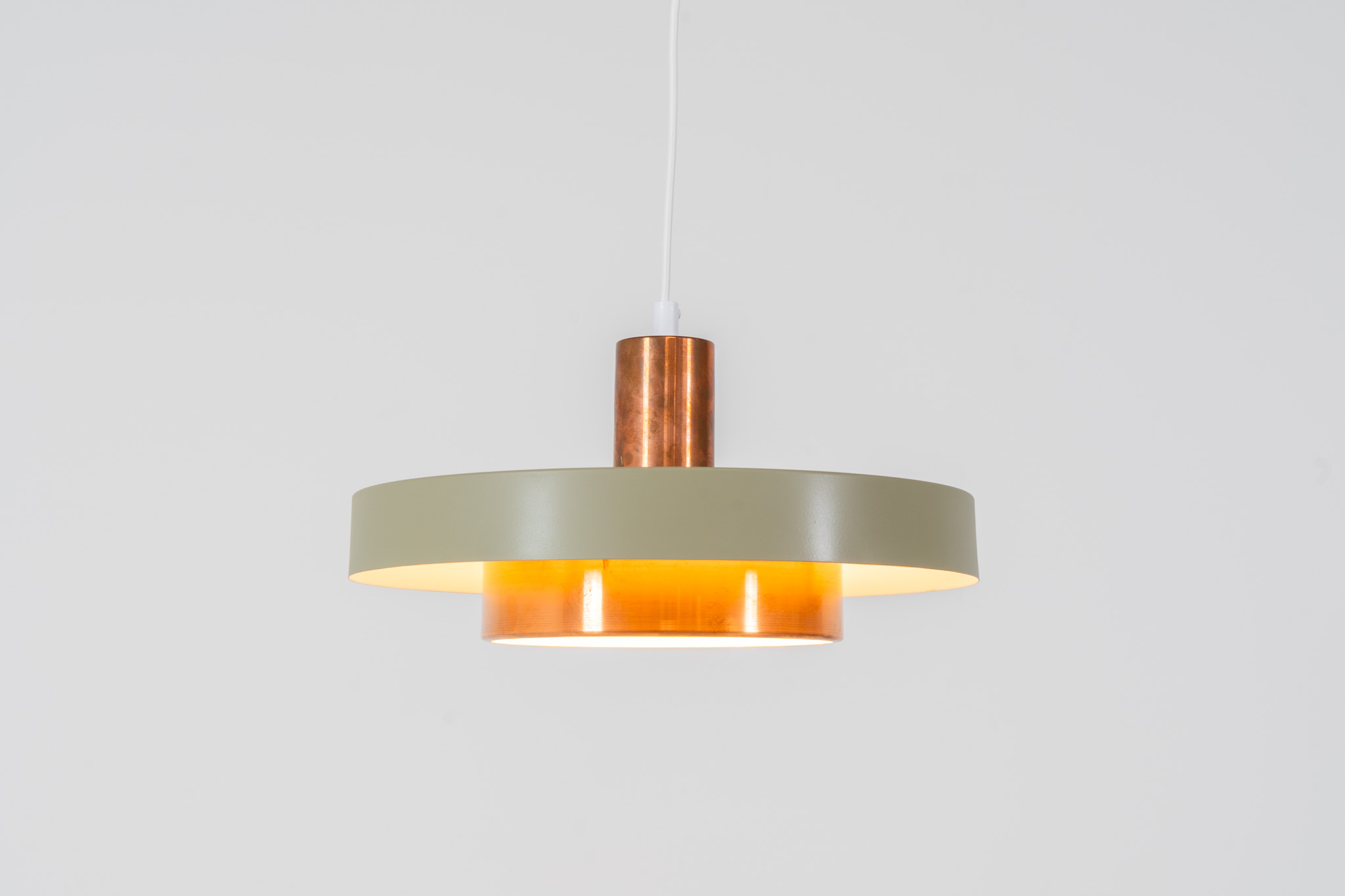 This Danish pendant light from the 1960s features a stunning combination of a copper shade and an olive green lacquered aluminum shade.