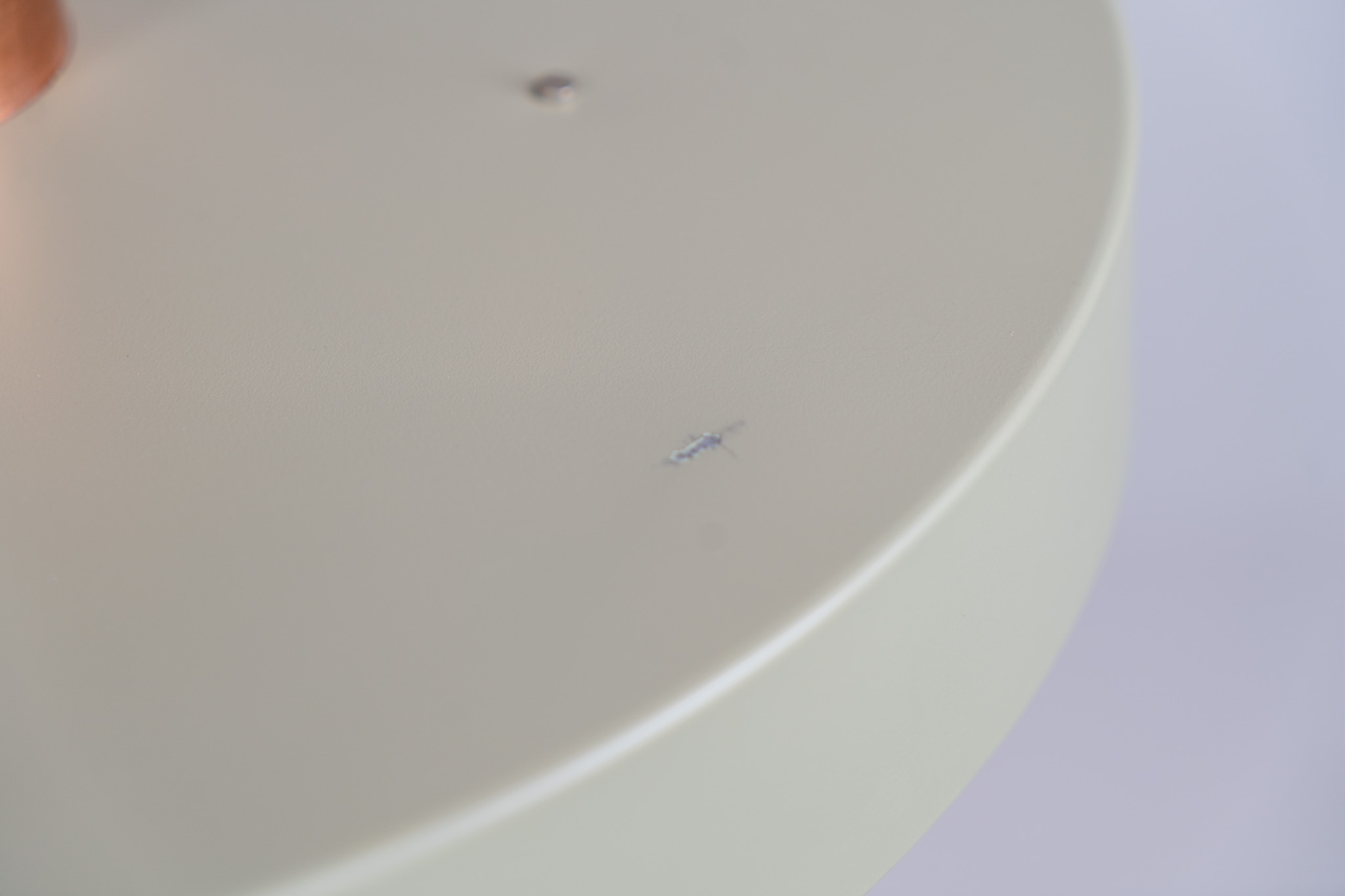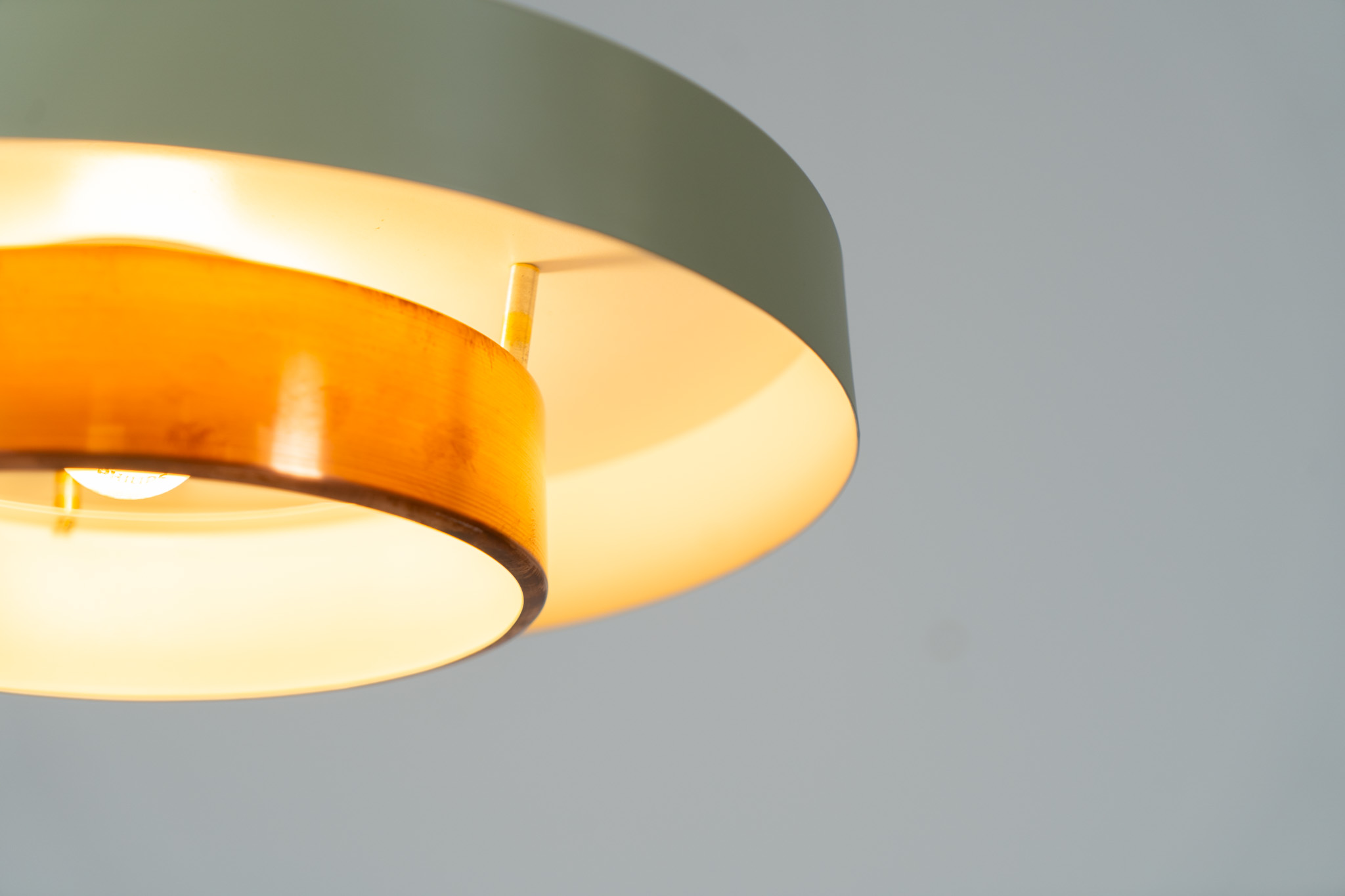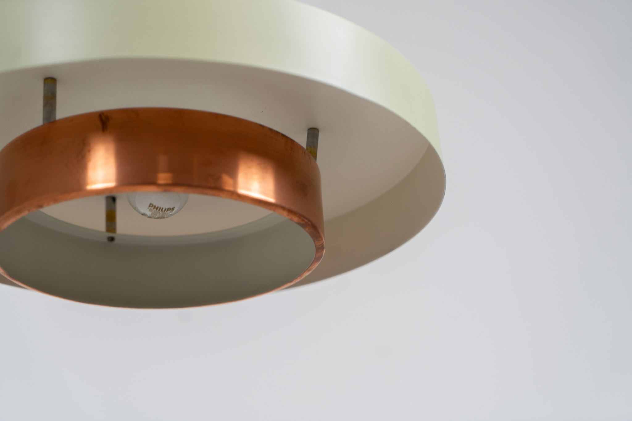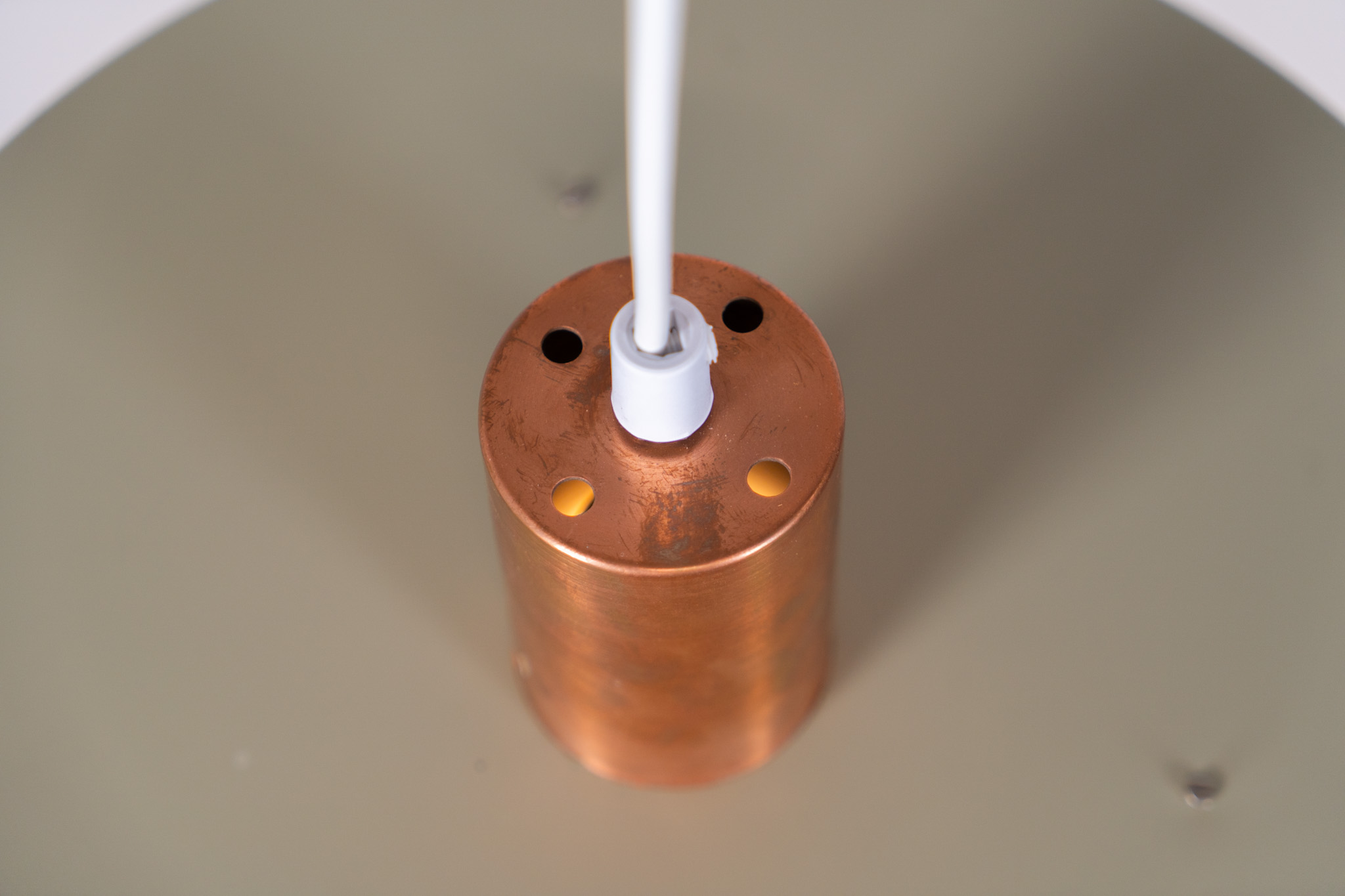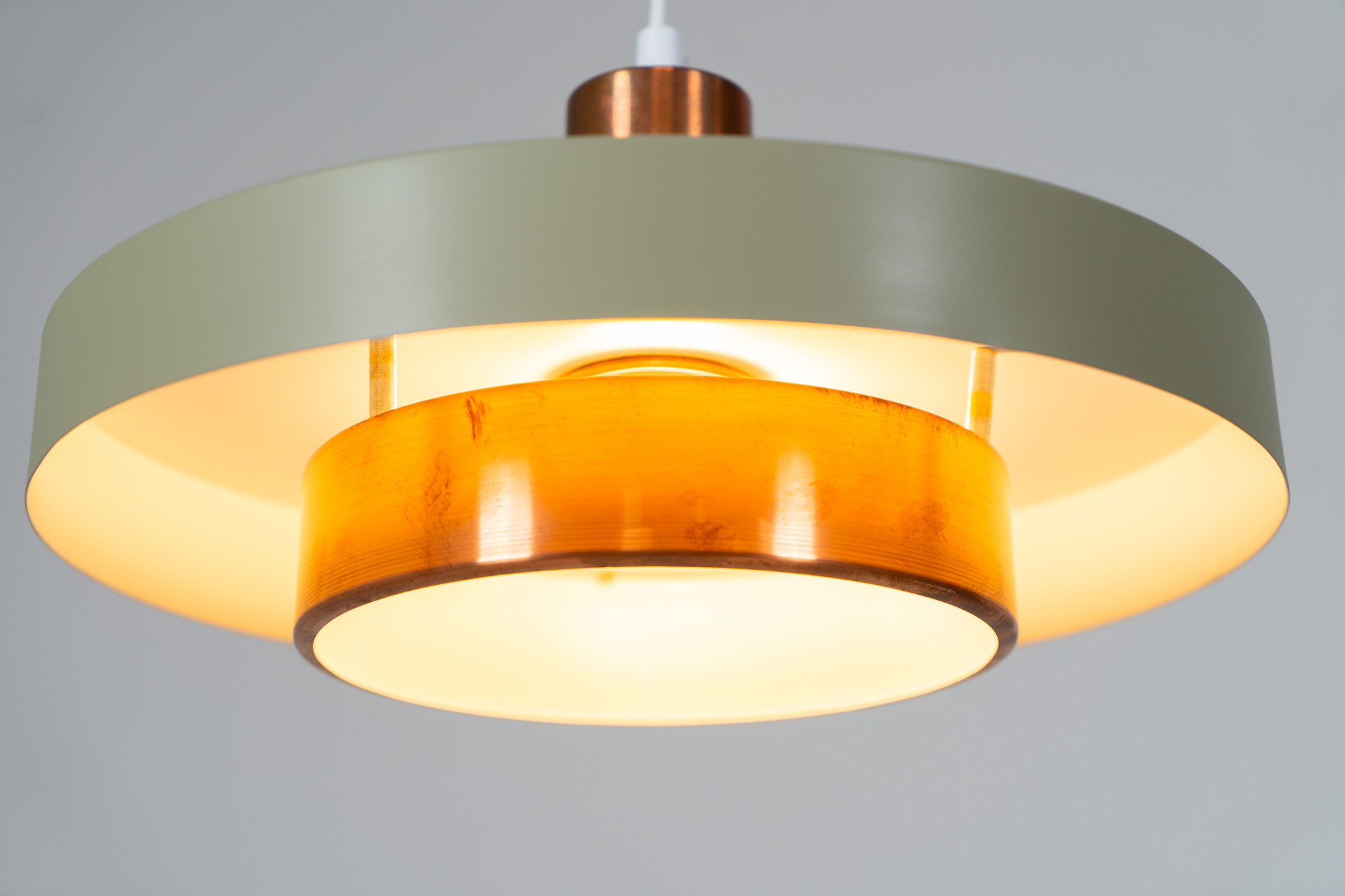 This Danish pendant light from the 1960s features a stunning combination of a copper shade and an olive green lacquered aluminum shade.