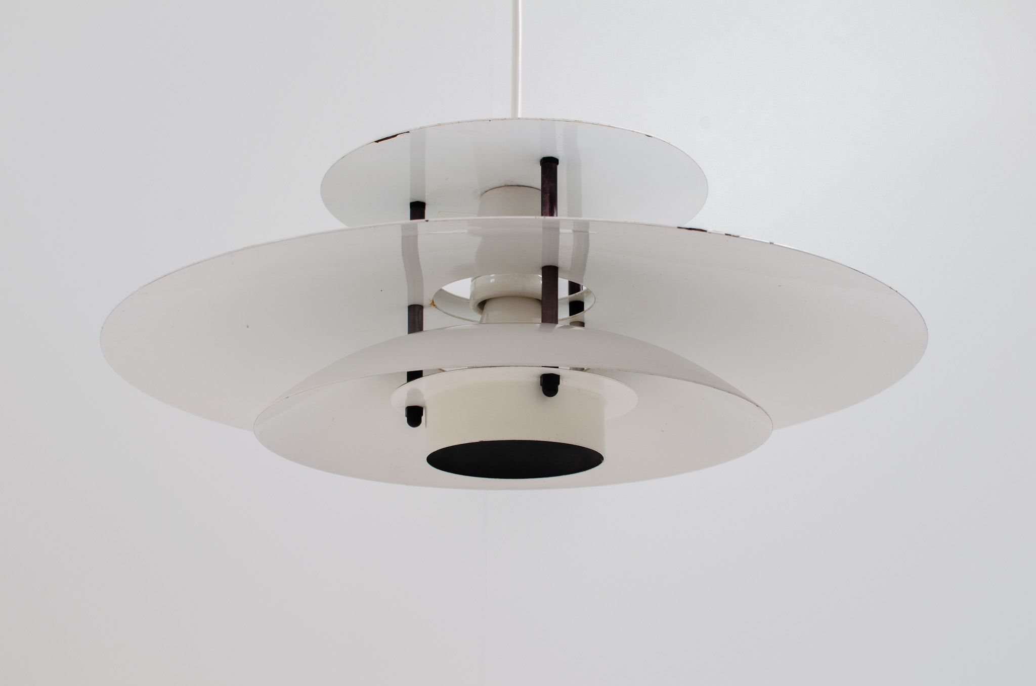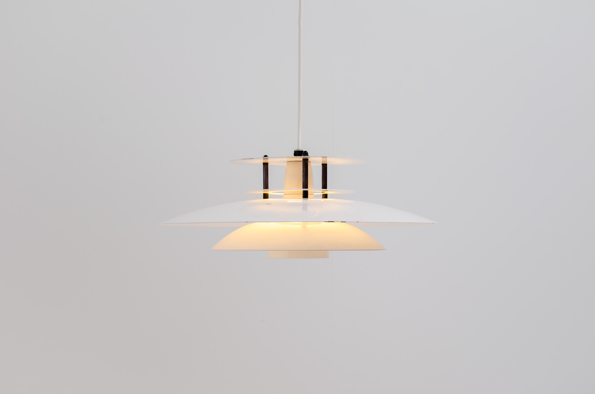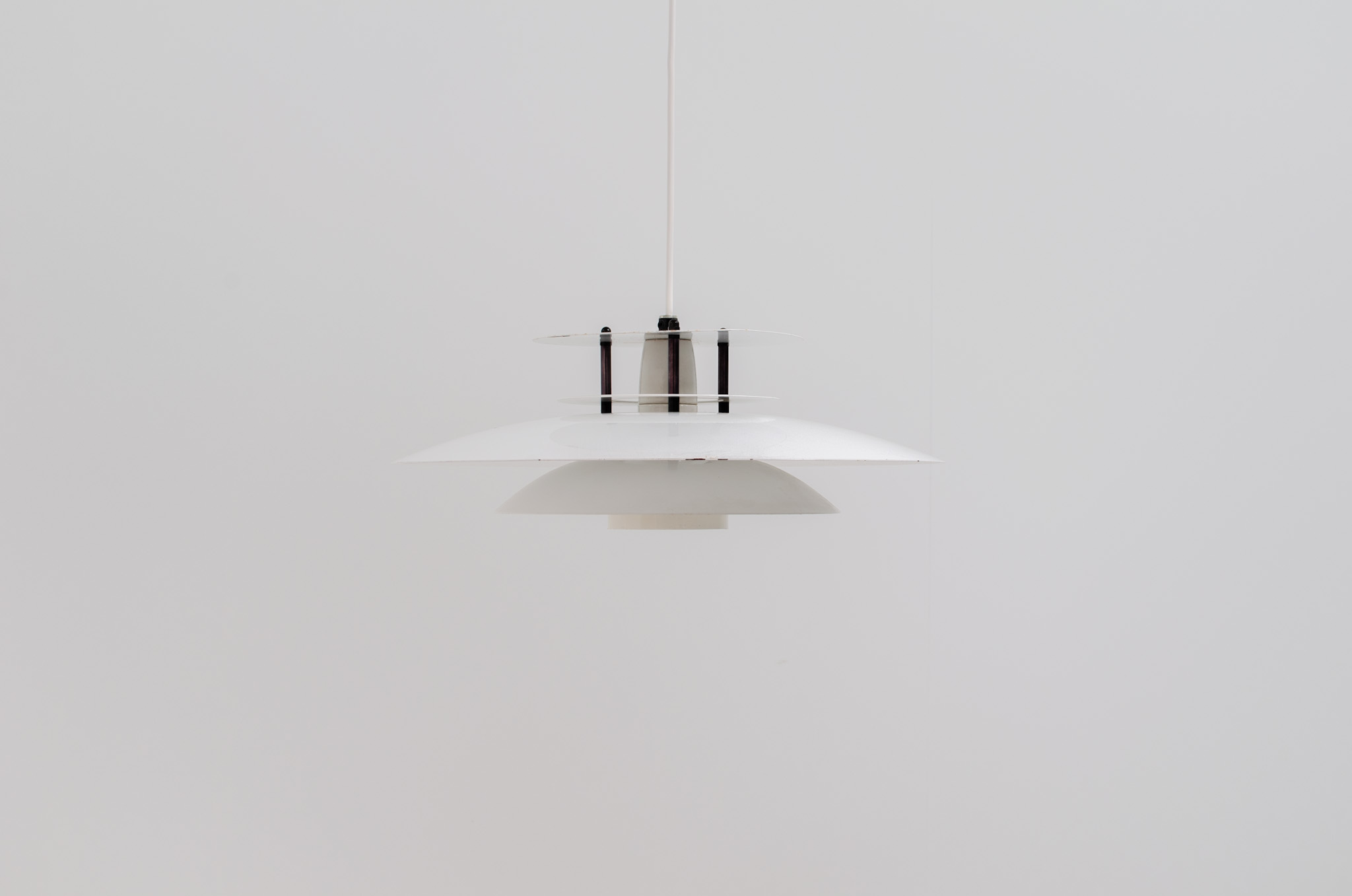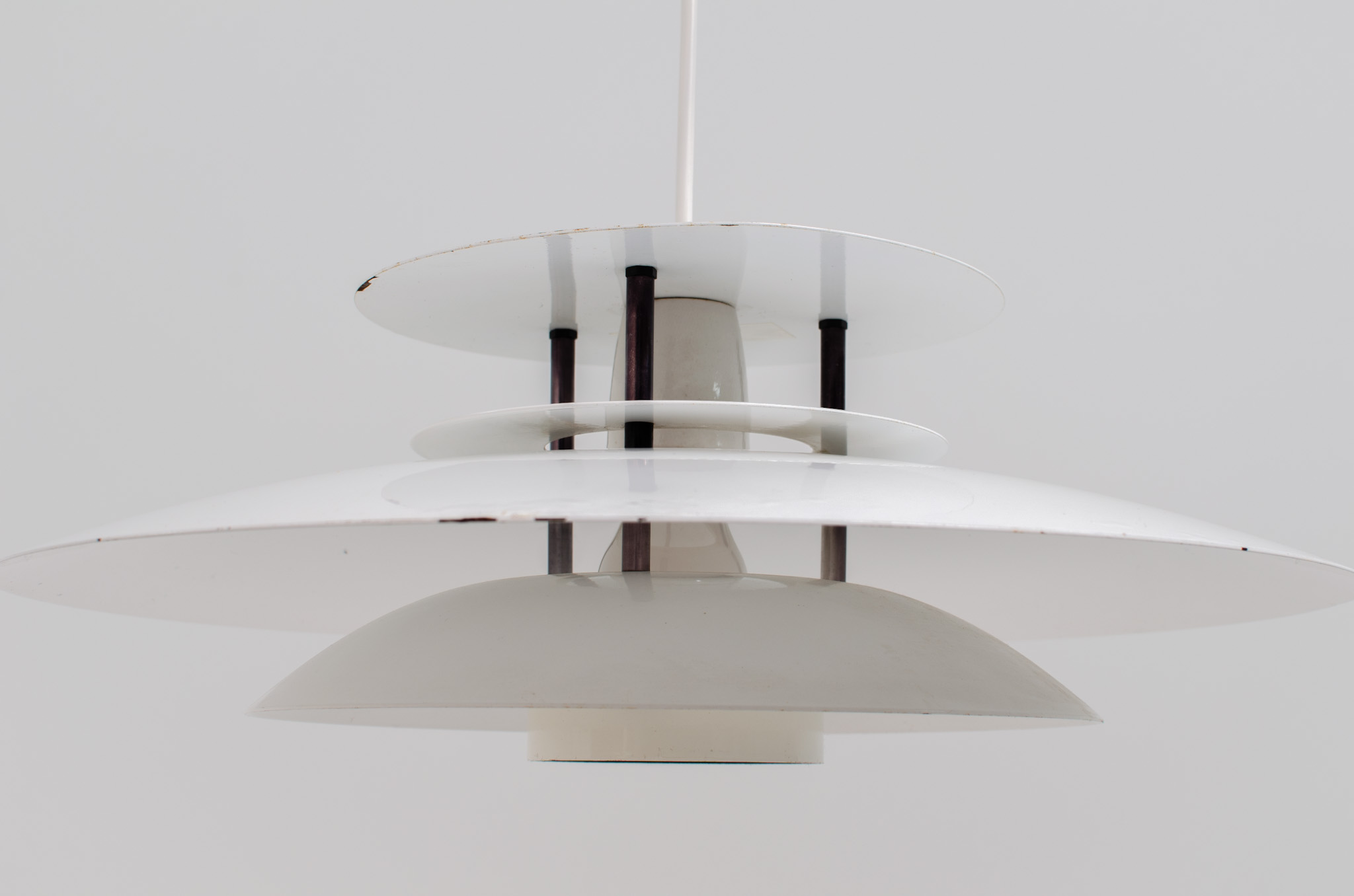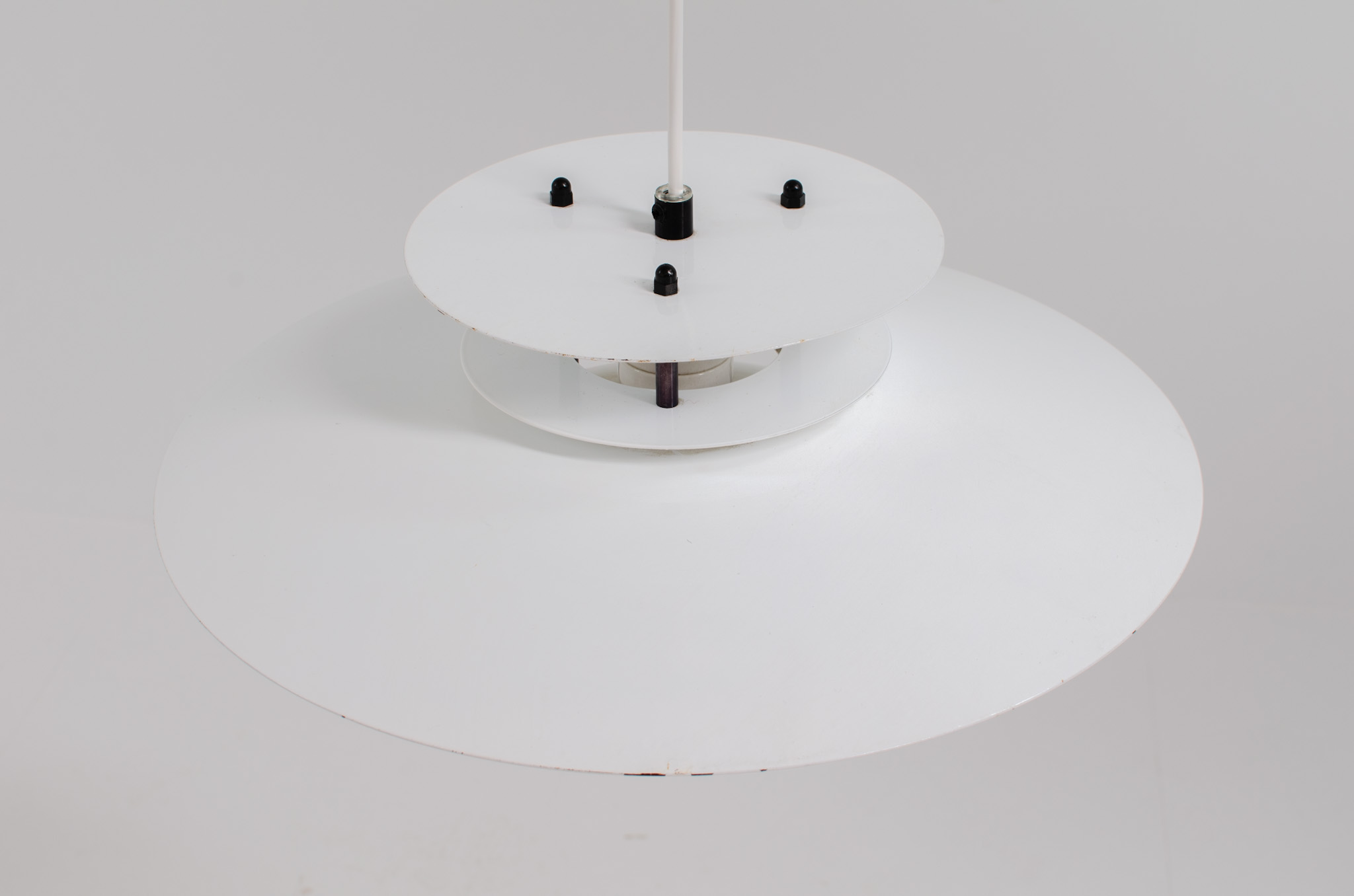 This one is made for the Laterna Danica range by Nordlux. It is made out of glossy white lacquered steel shades, separated with three aluminium black rods.
