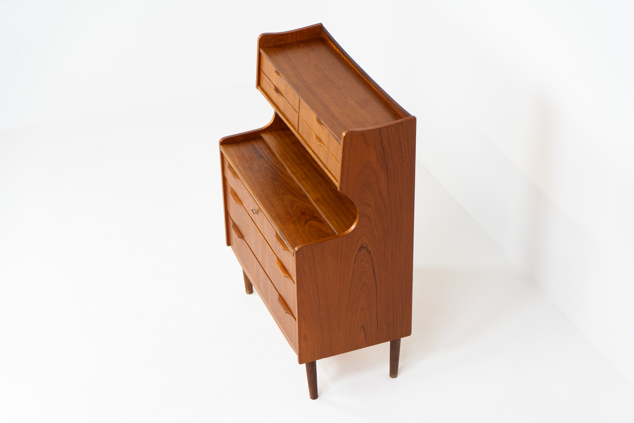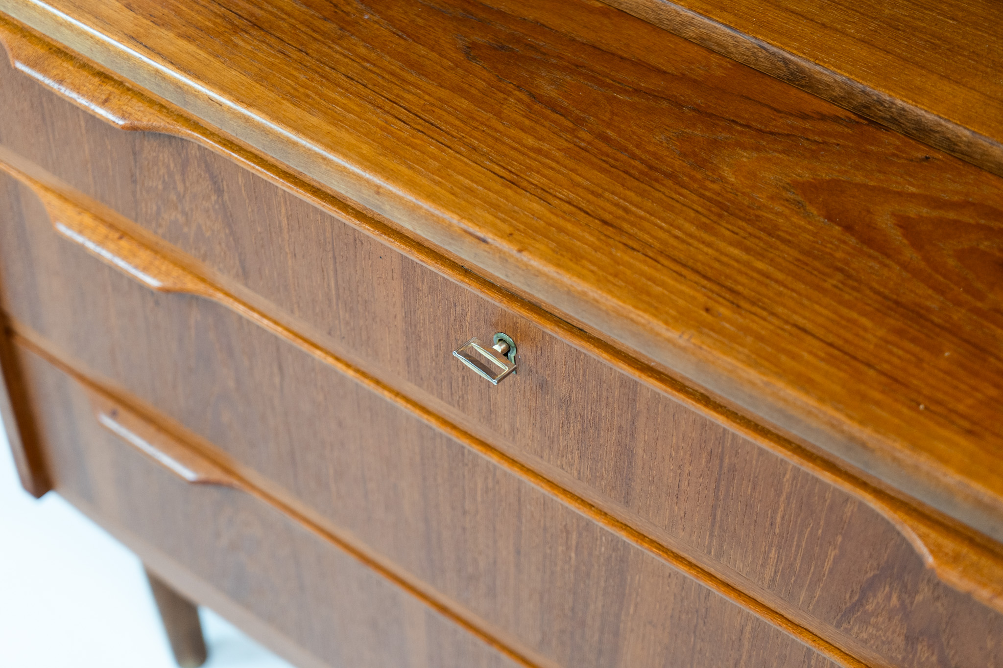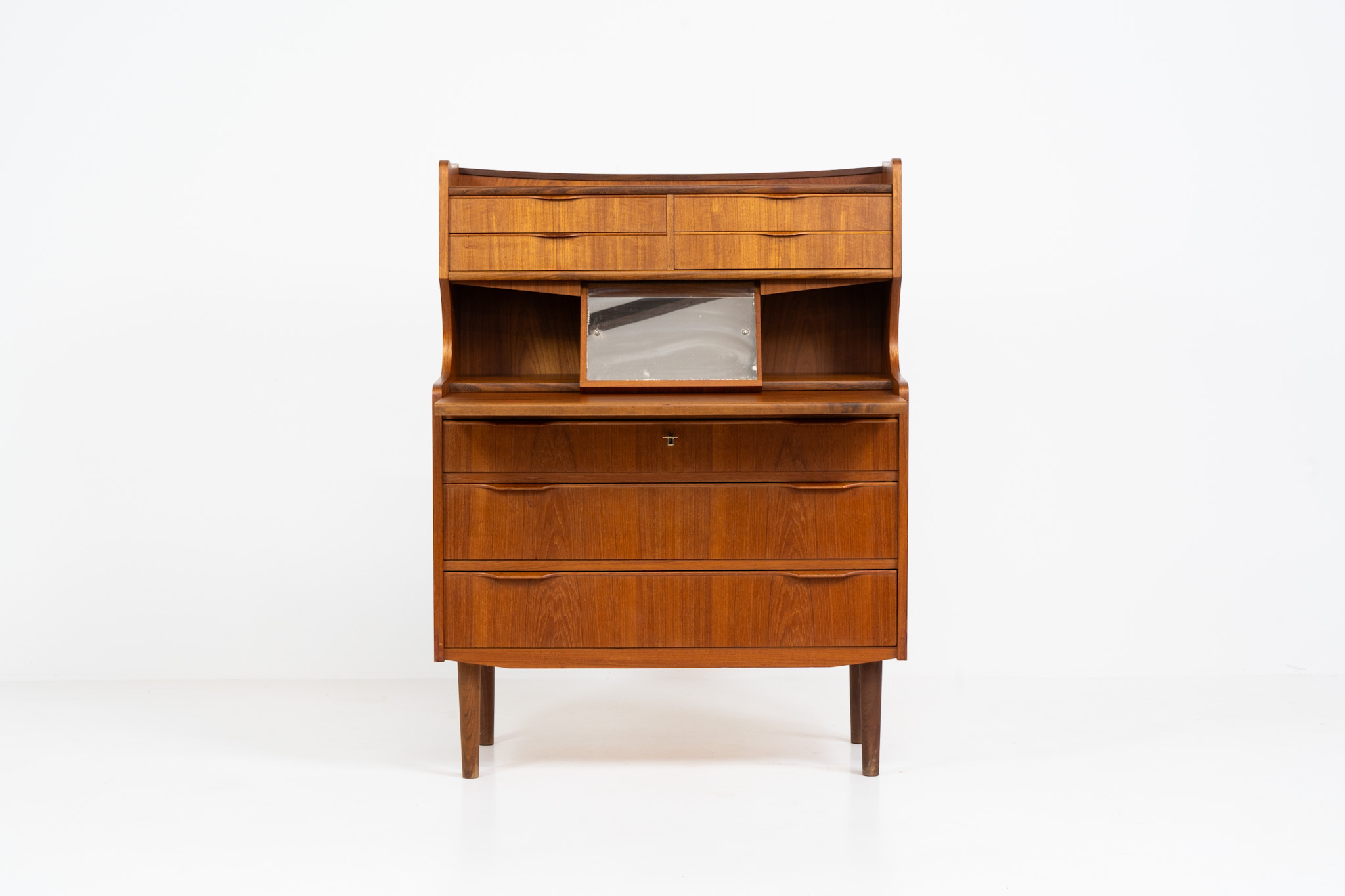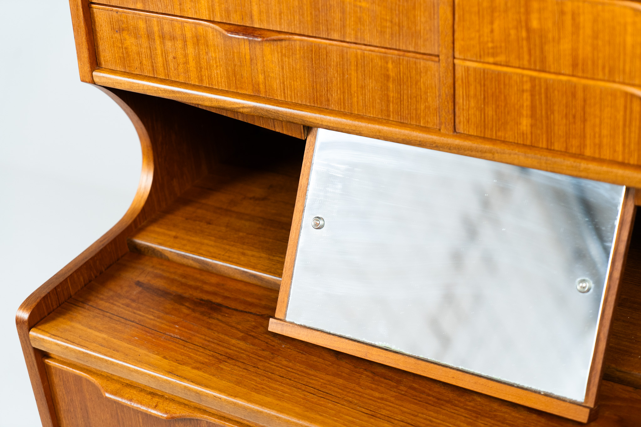 A highly versatile piece featuring seven drawers with beautiful handles, a pull-out leaf, a mirror and lots of storage space. A convenient piece that finds its way in any setting.