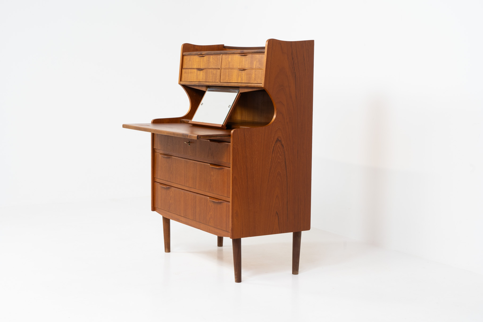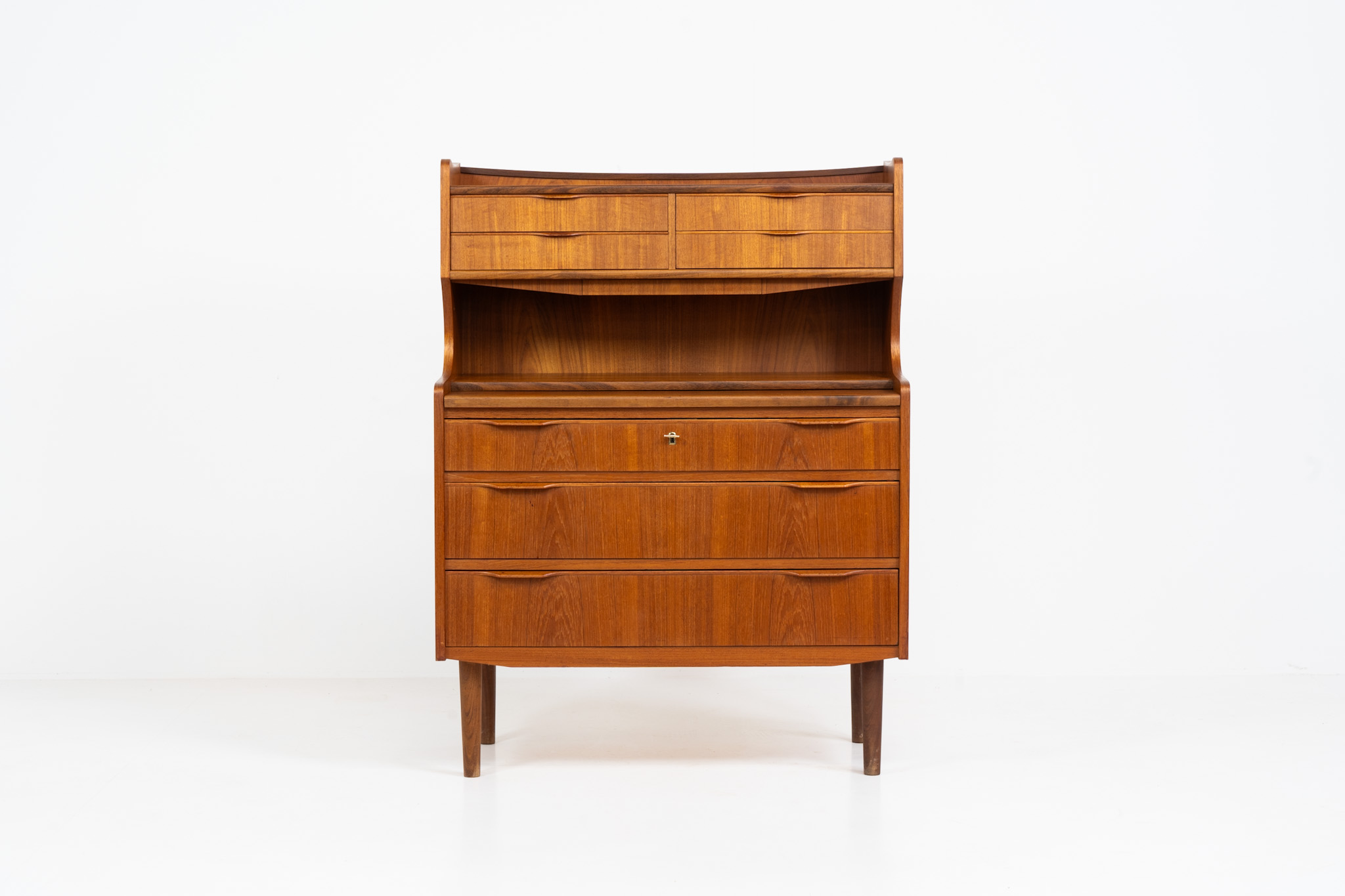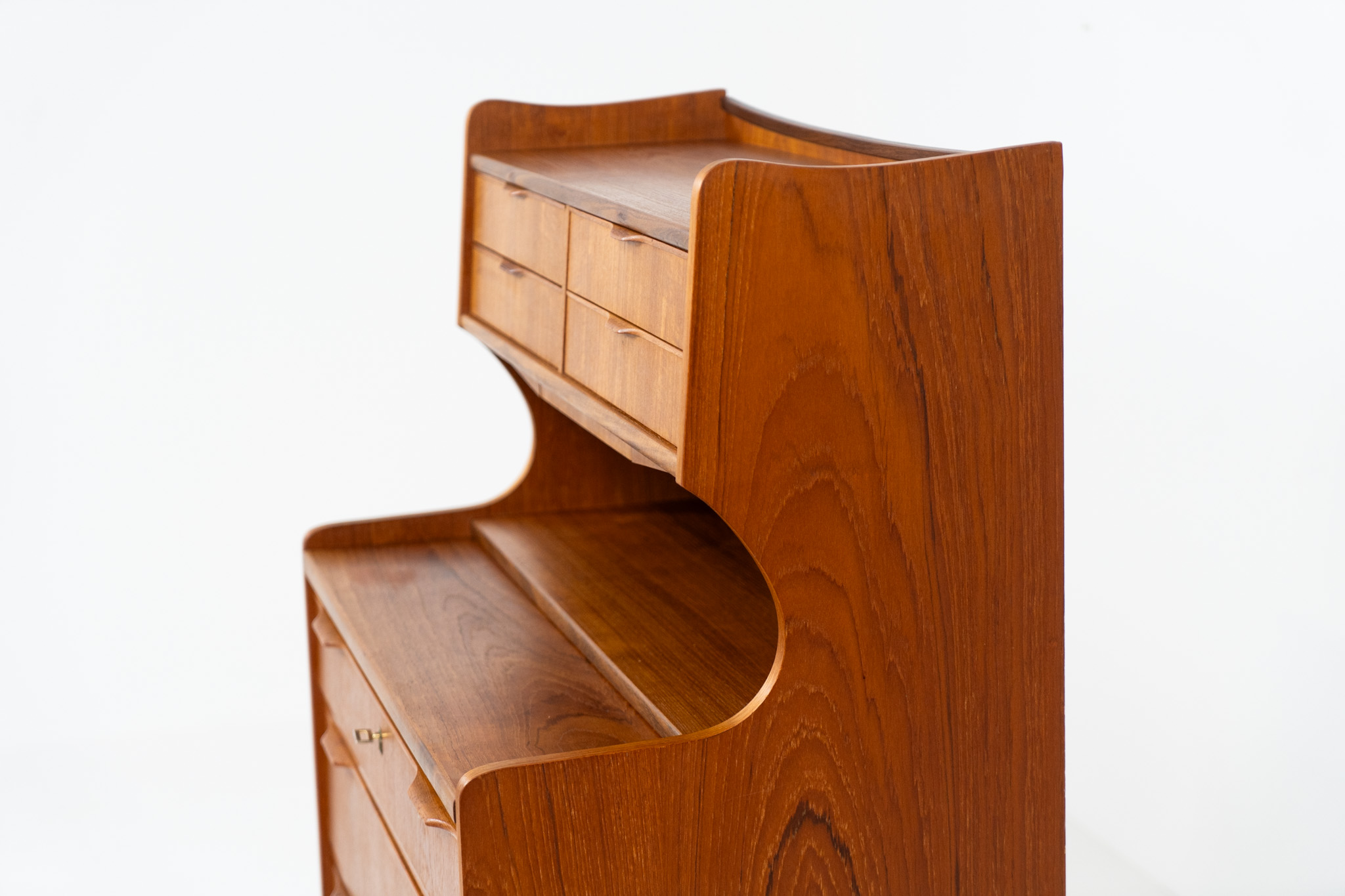 A highly versatile piece featuring seven drawers with beautiful handles, a pull-out leaf, a mirror and lots of storage space. A convenient piece that finds its way in any setting.