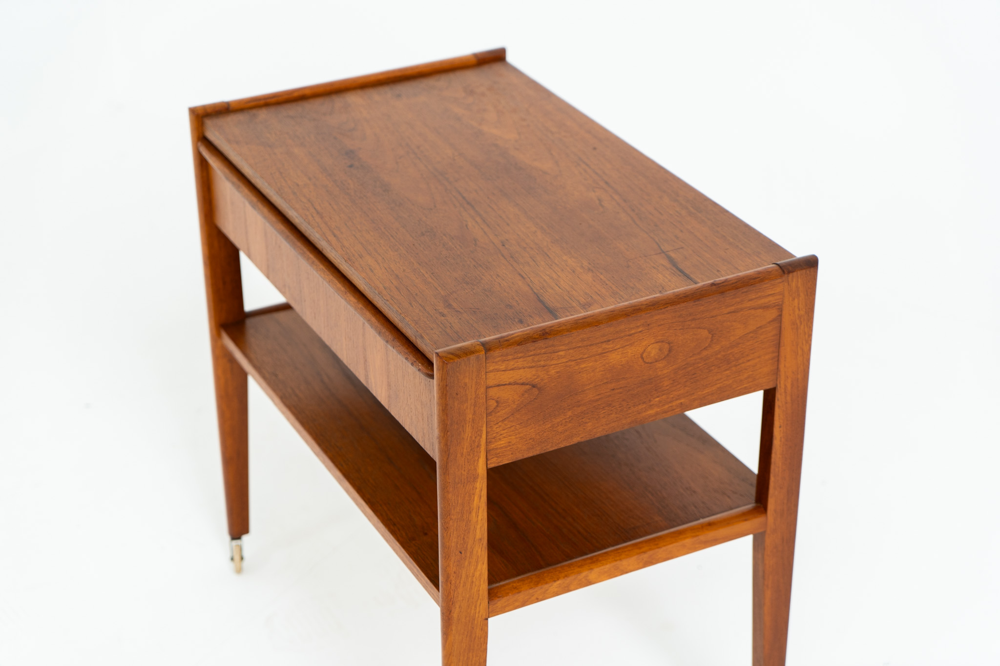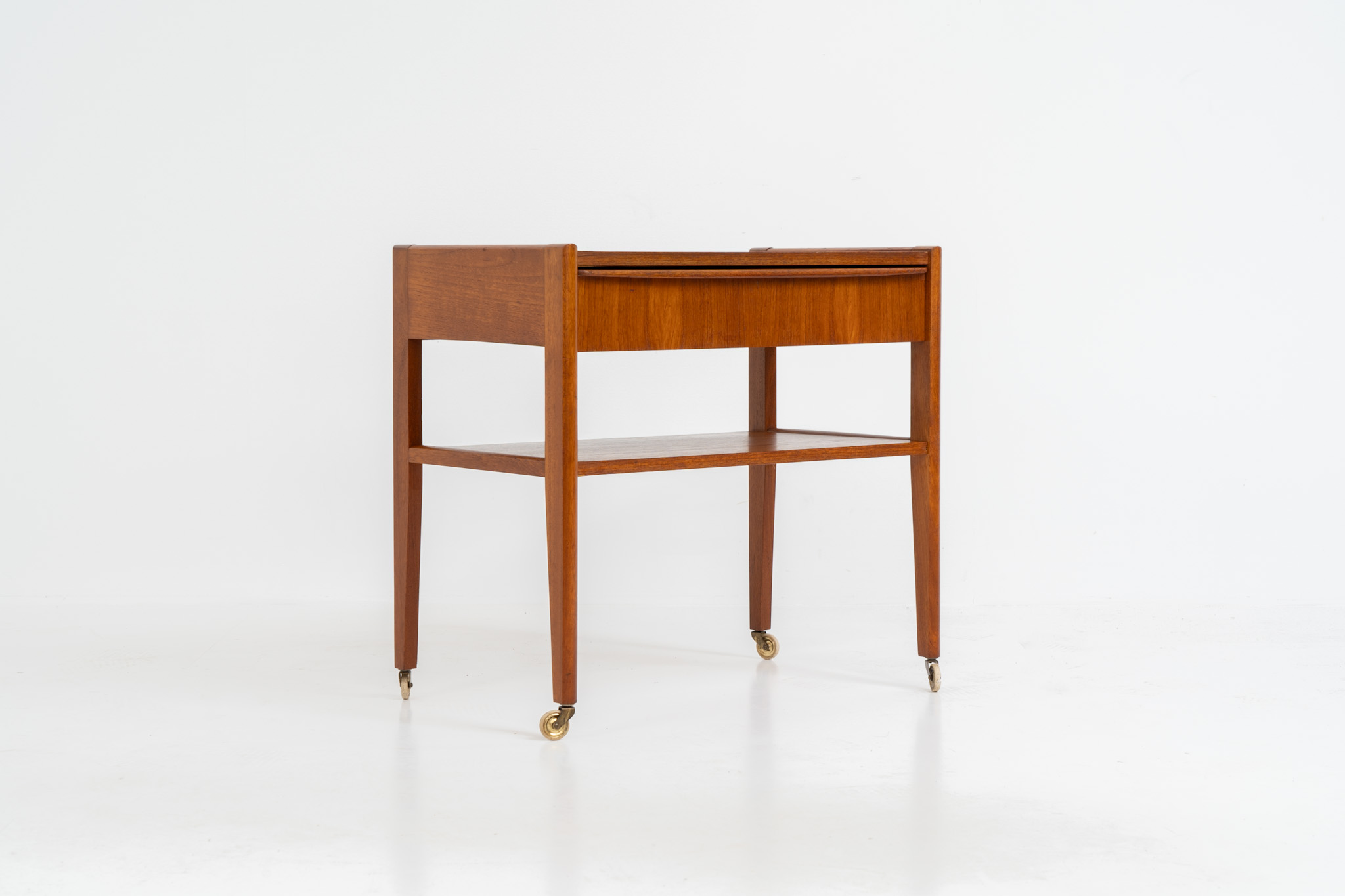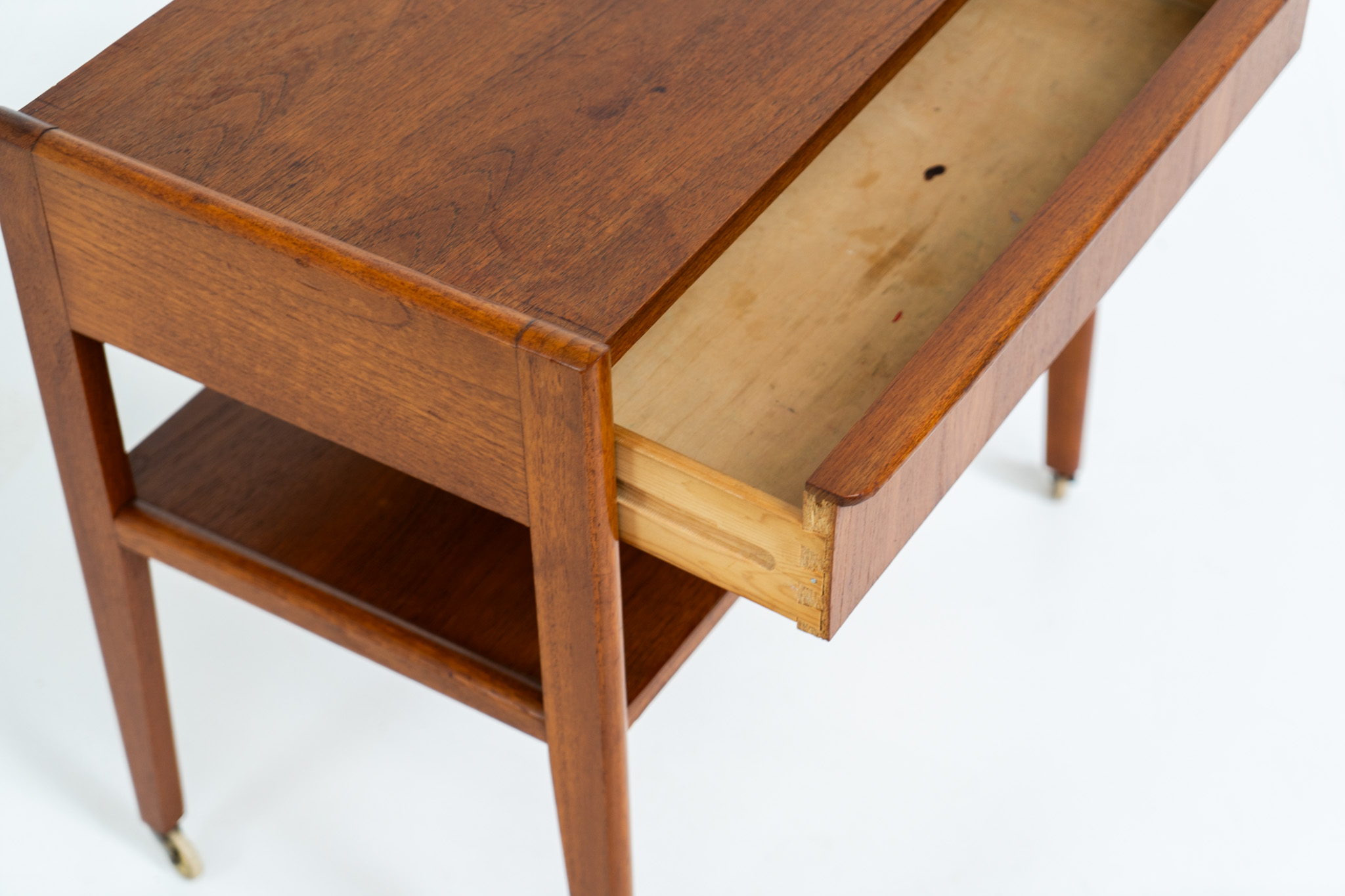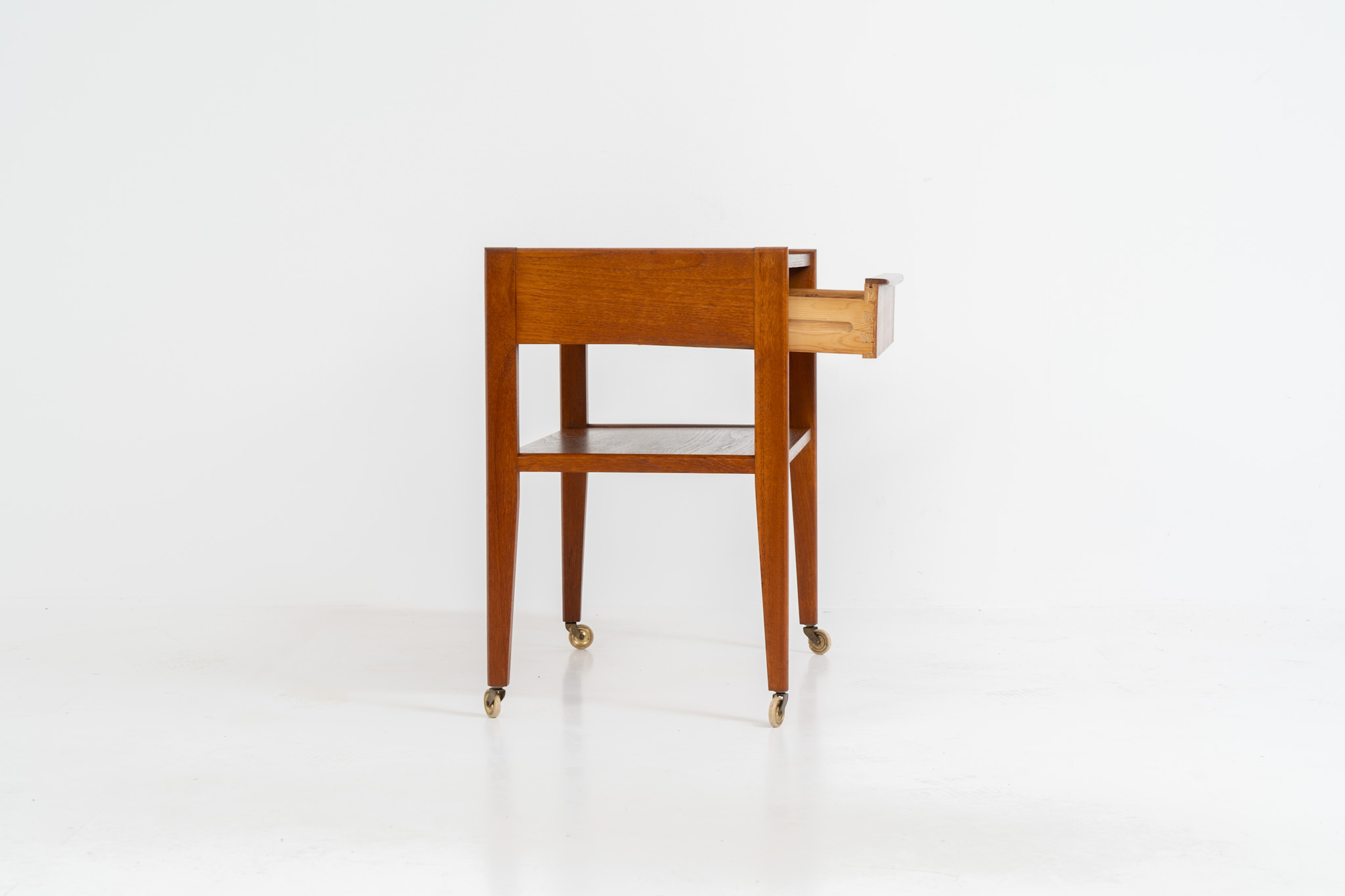 A simple rolling sidetable with one drawer featuring a nicely sculpted handle, a warm woodgrain and some brass details on the wheels.