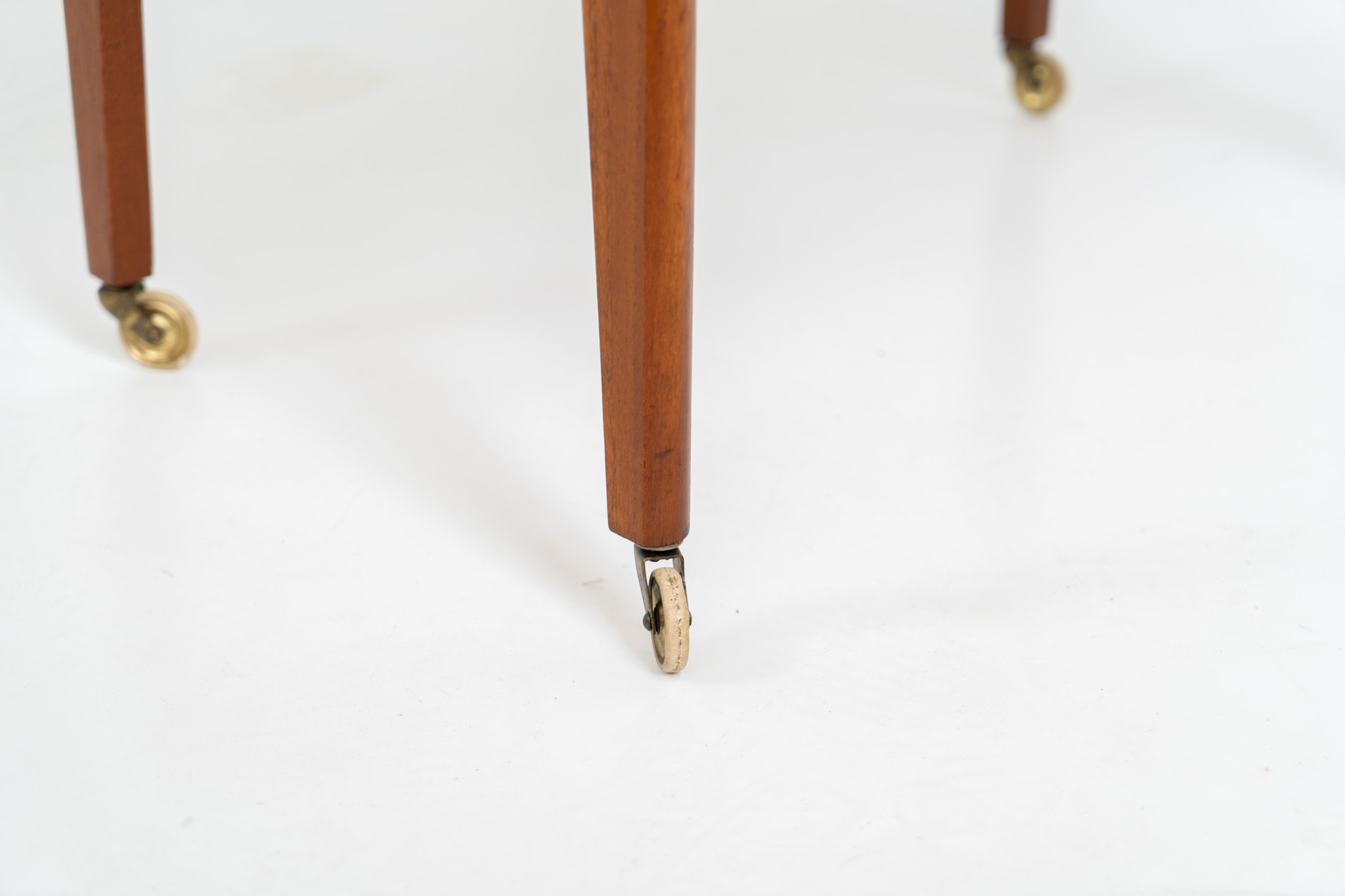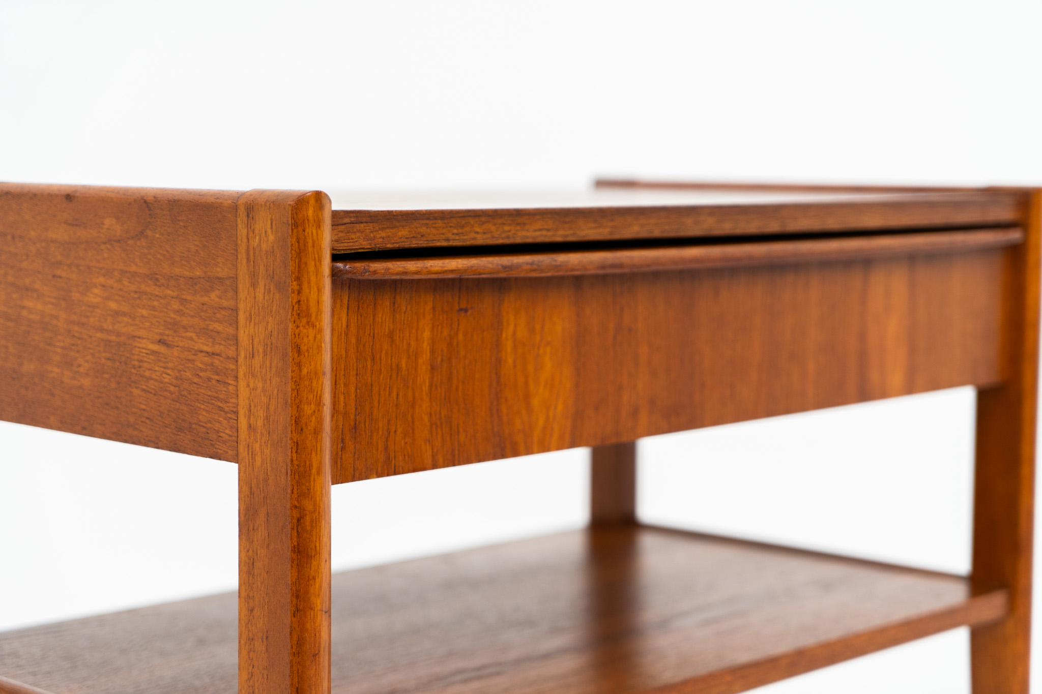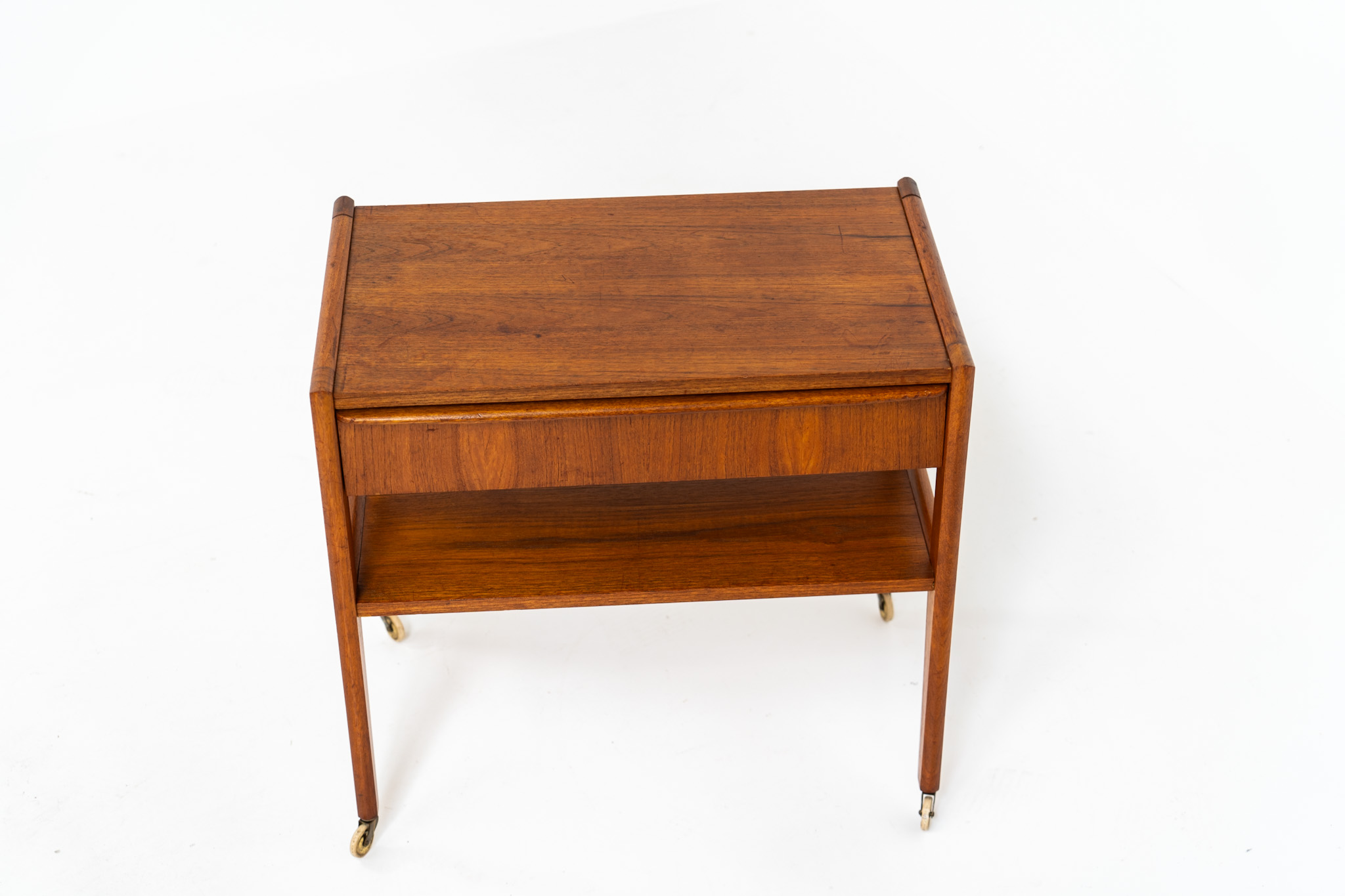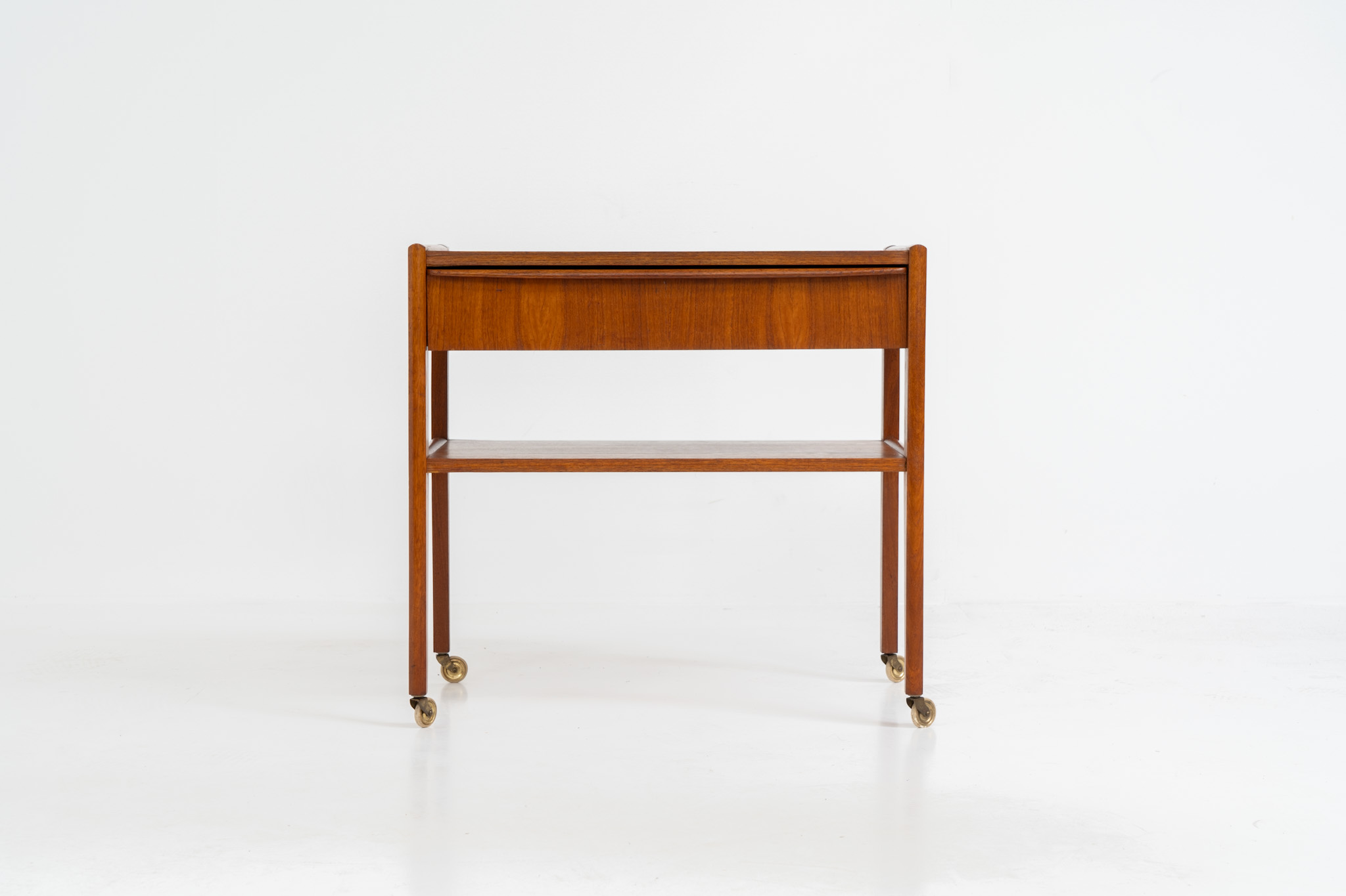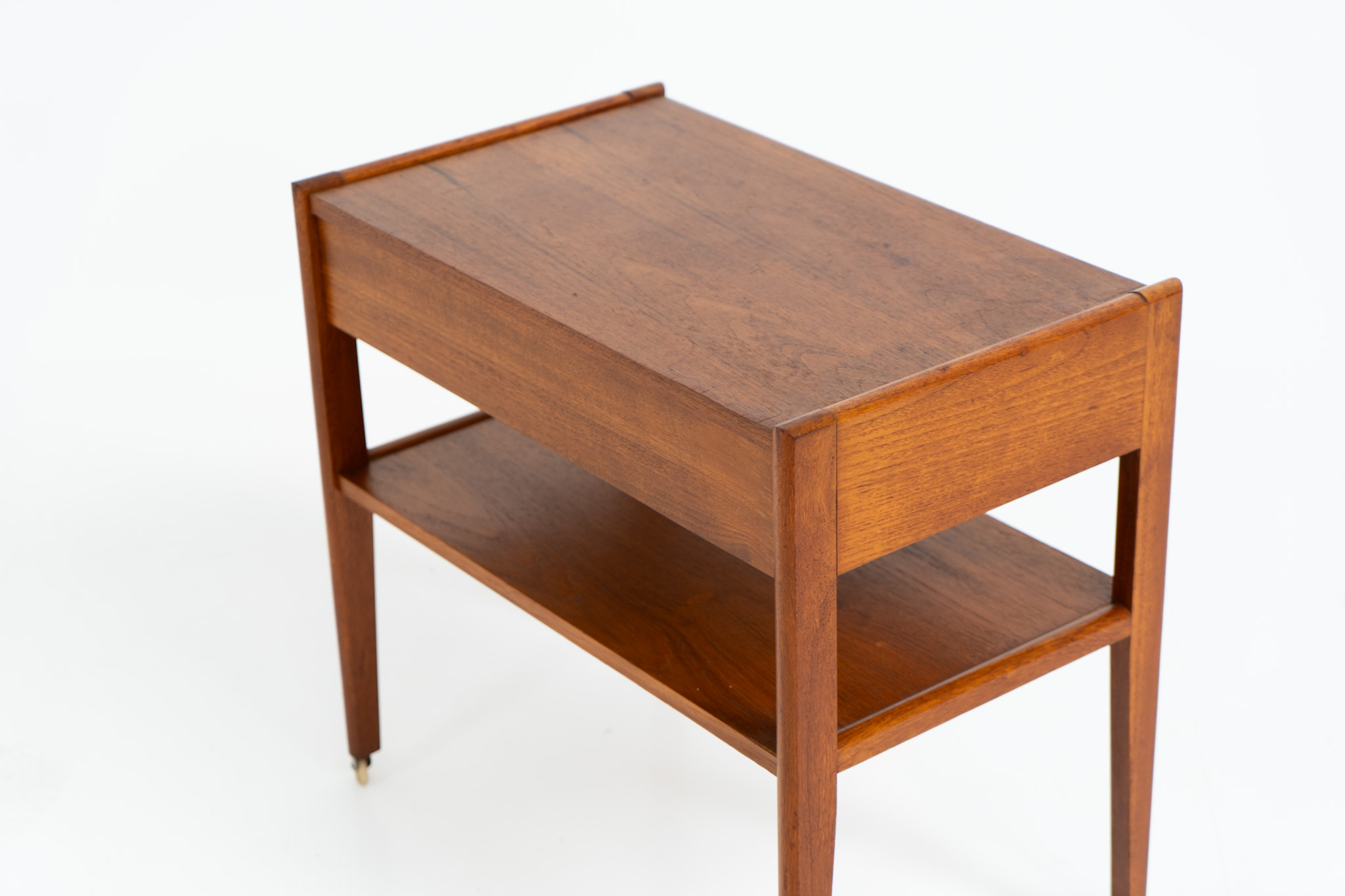 A simple rolling sidetable with one drawer featuring a nicely sculpted handle, a warm woodgrain and some brass details on the wheels.