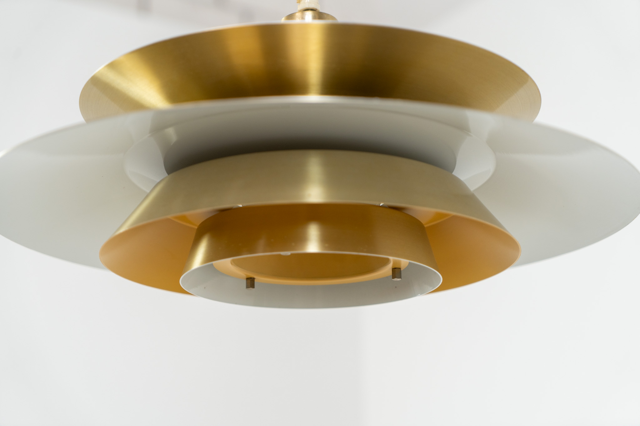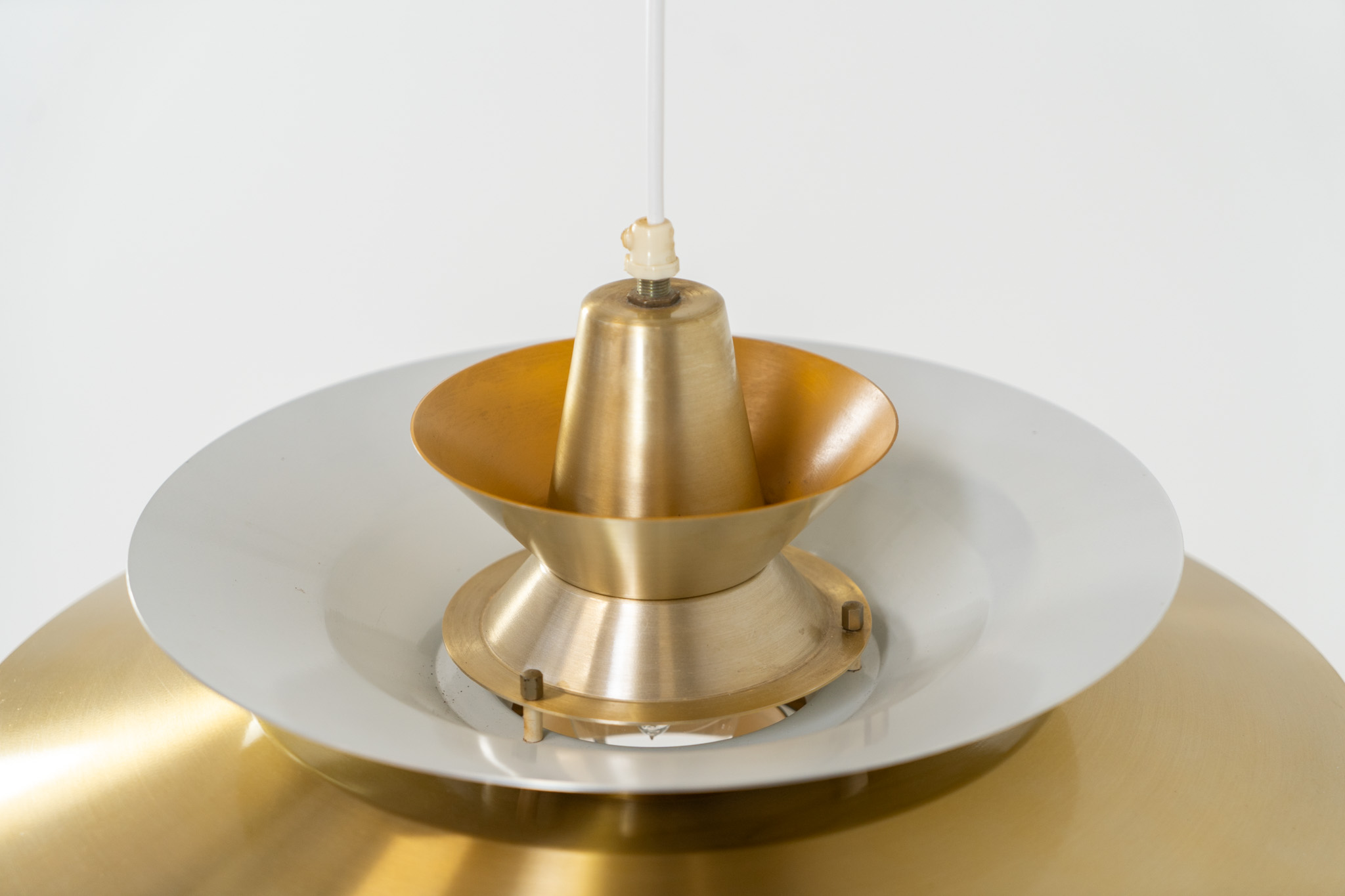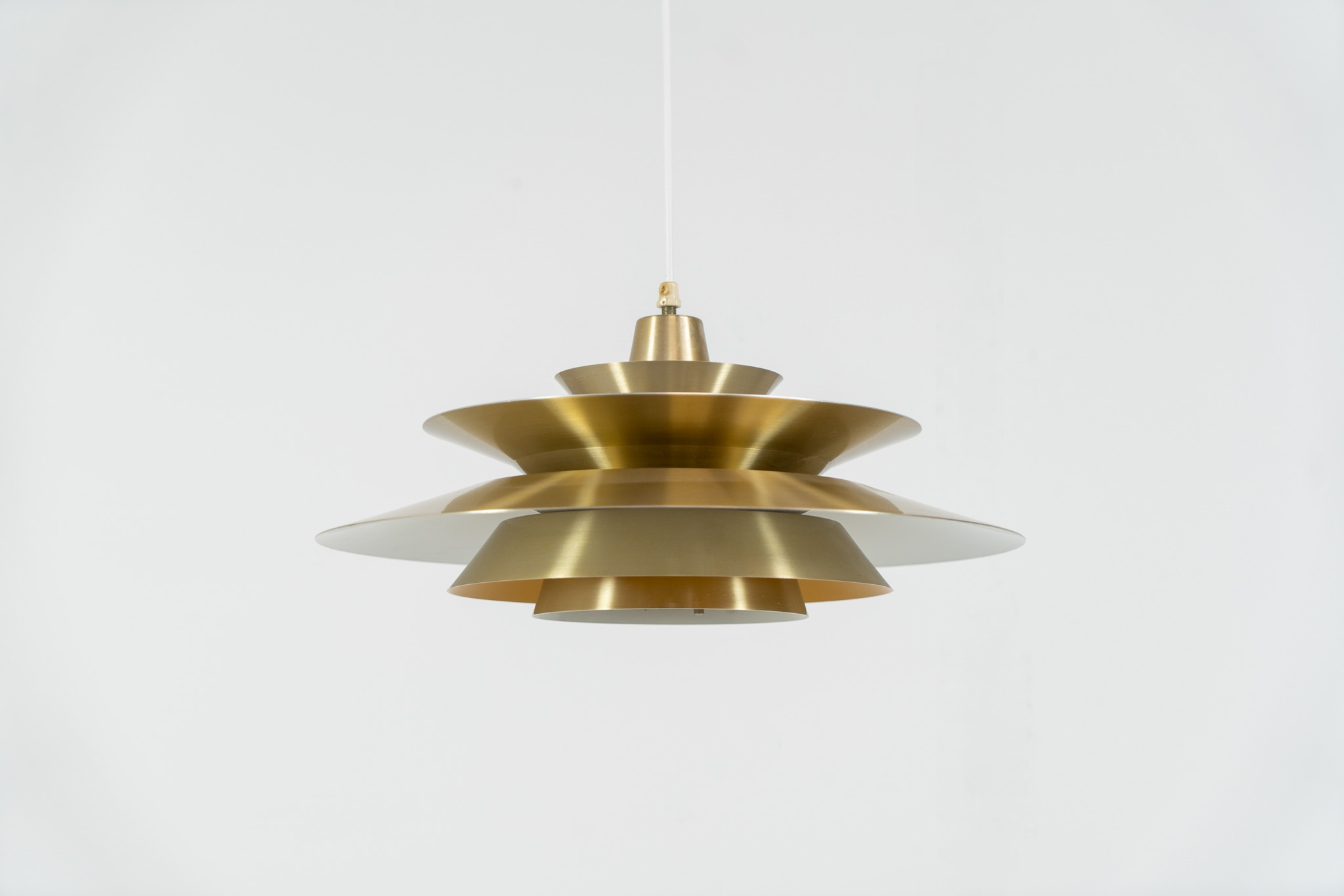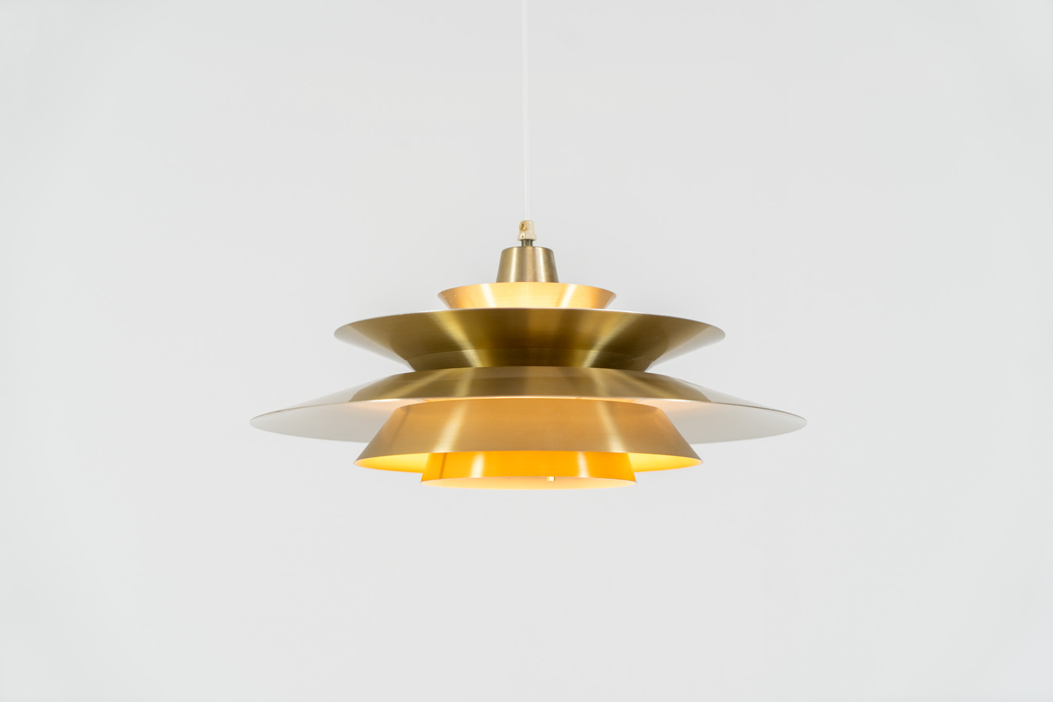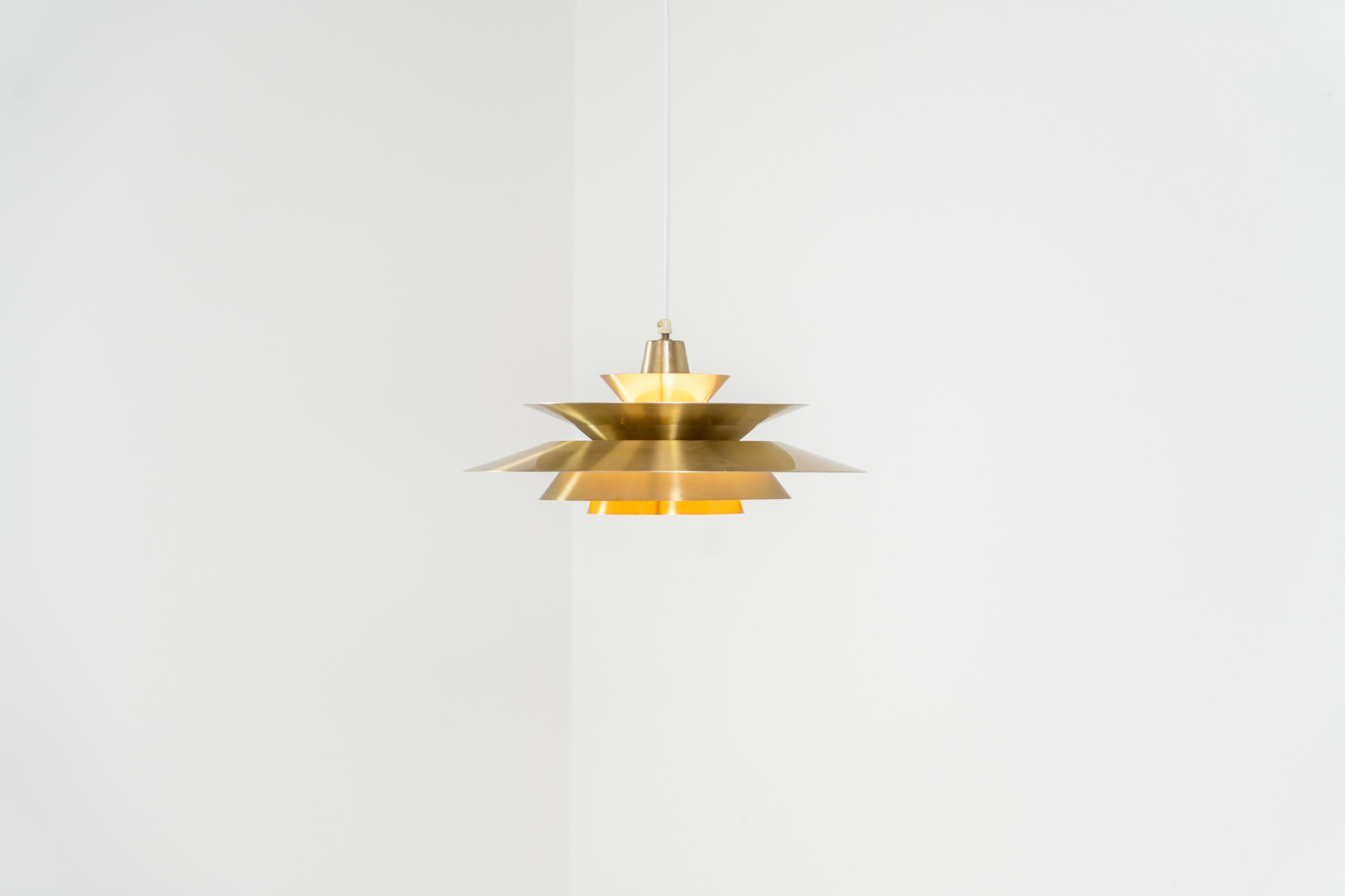 A very nice lamp made of five aluminium shades in a messing color, with yellow details on the inside. It is Nelly rewired and in very good condition!