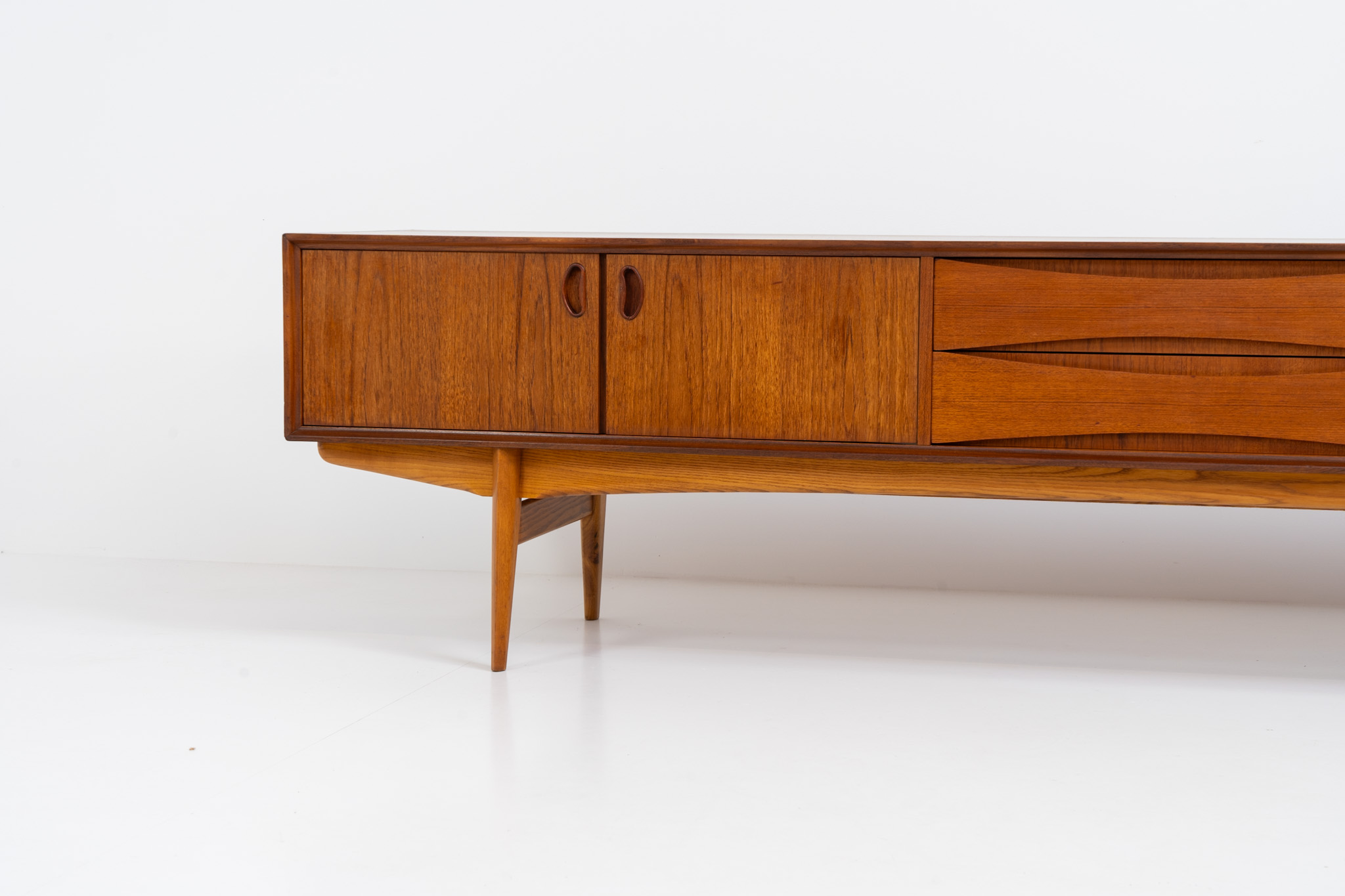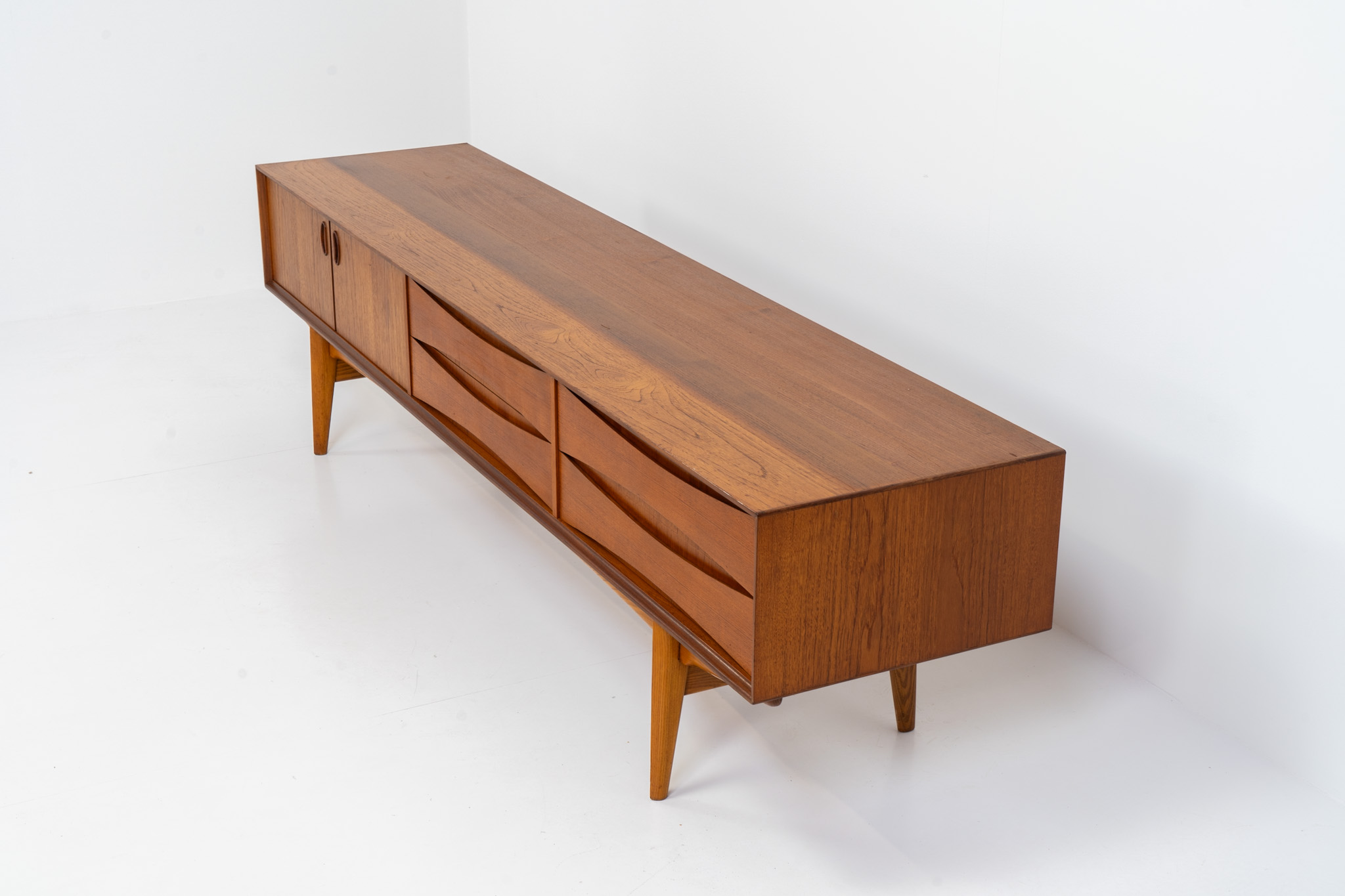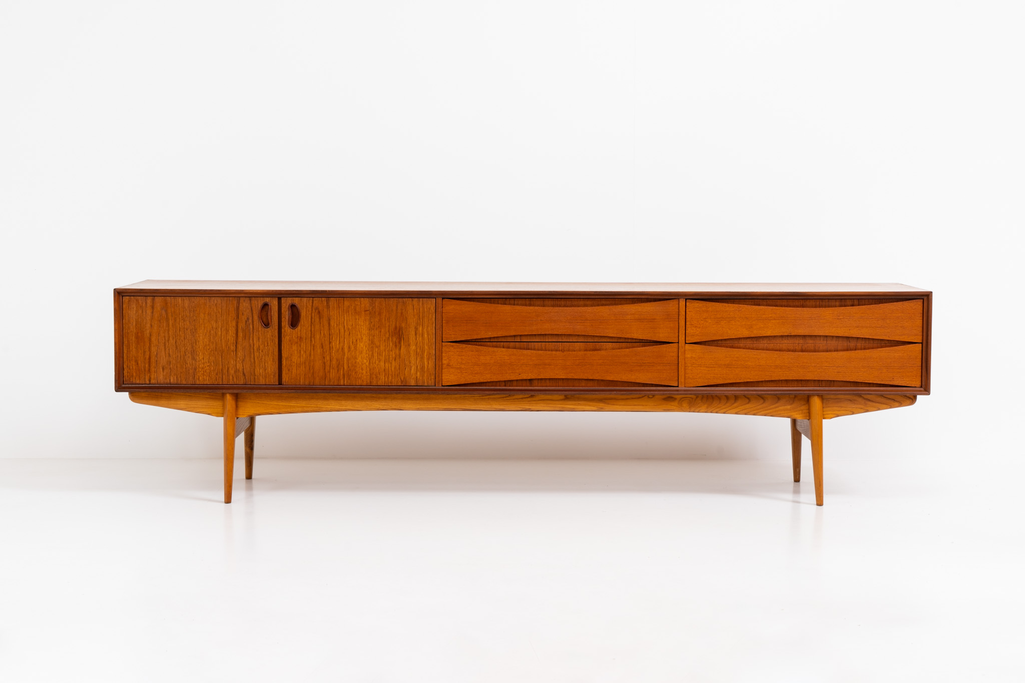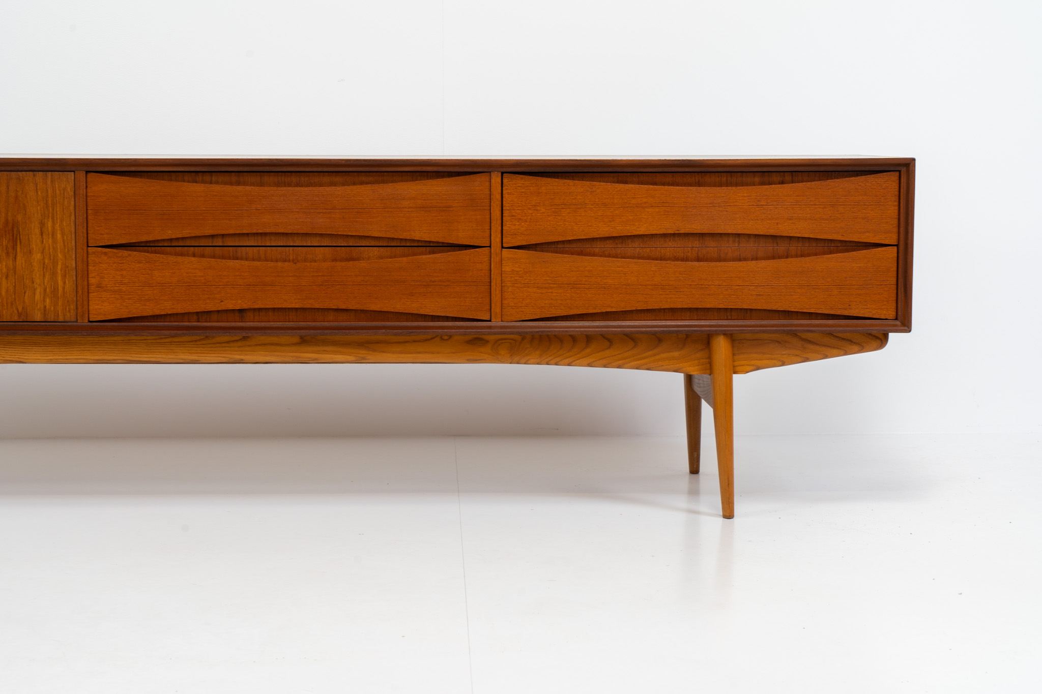 An amazing design with a lot of details and a highly sought after extra low height. Featuring two folding doors and four drawers with nice bent wood insides. This unusual low case piece can be perfectly used to put a tv on.