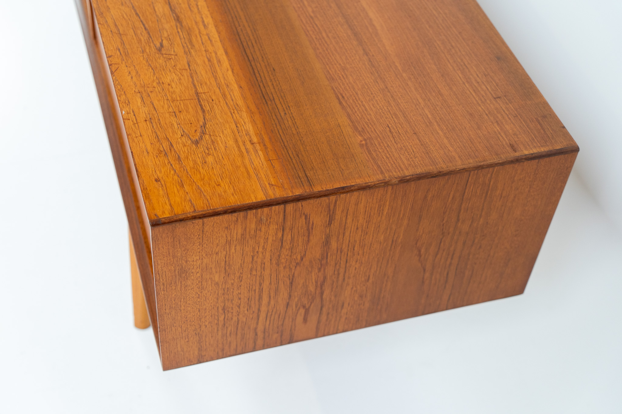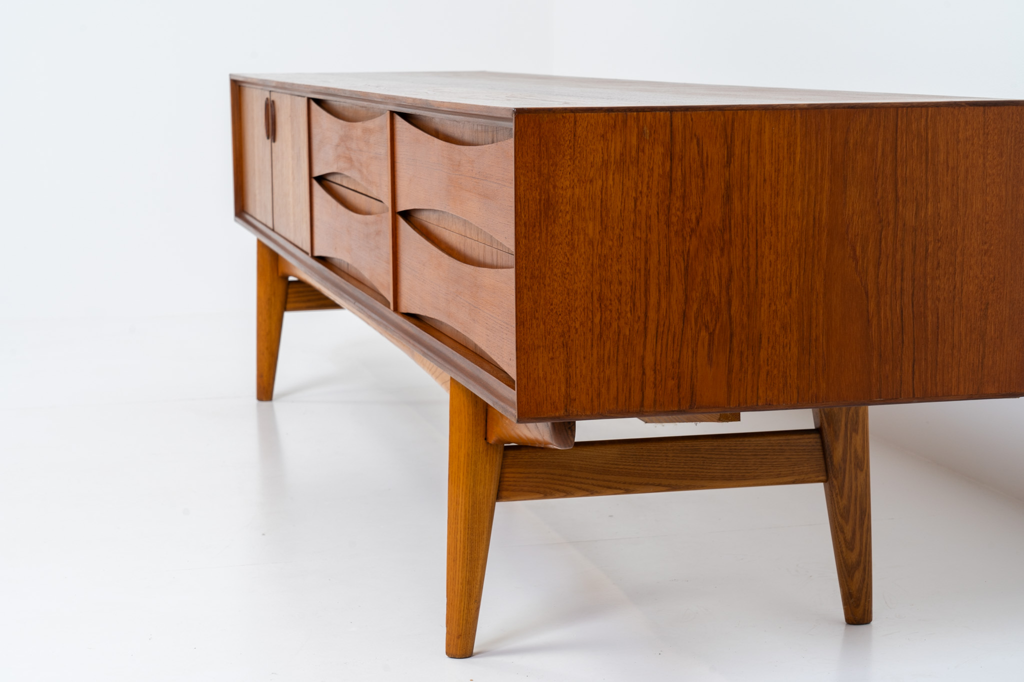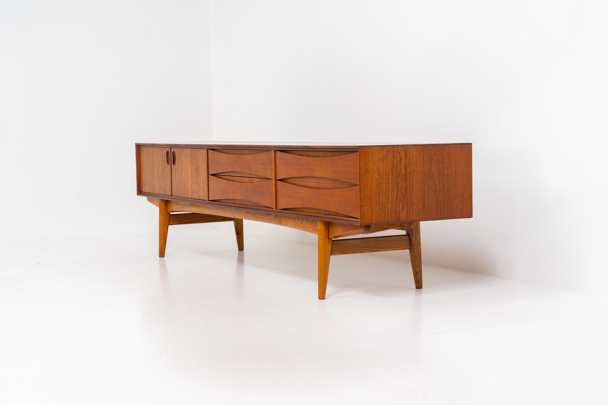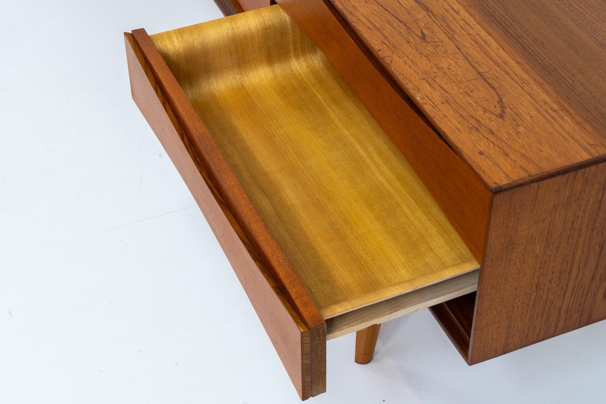 An amazing design with a lot of details and a highly sought after extra low height. Featuring two folding doors and four drawers with nice bent wood insides. This unusual low case piece can be perfectly used to put a tv on.