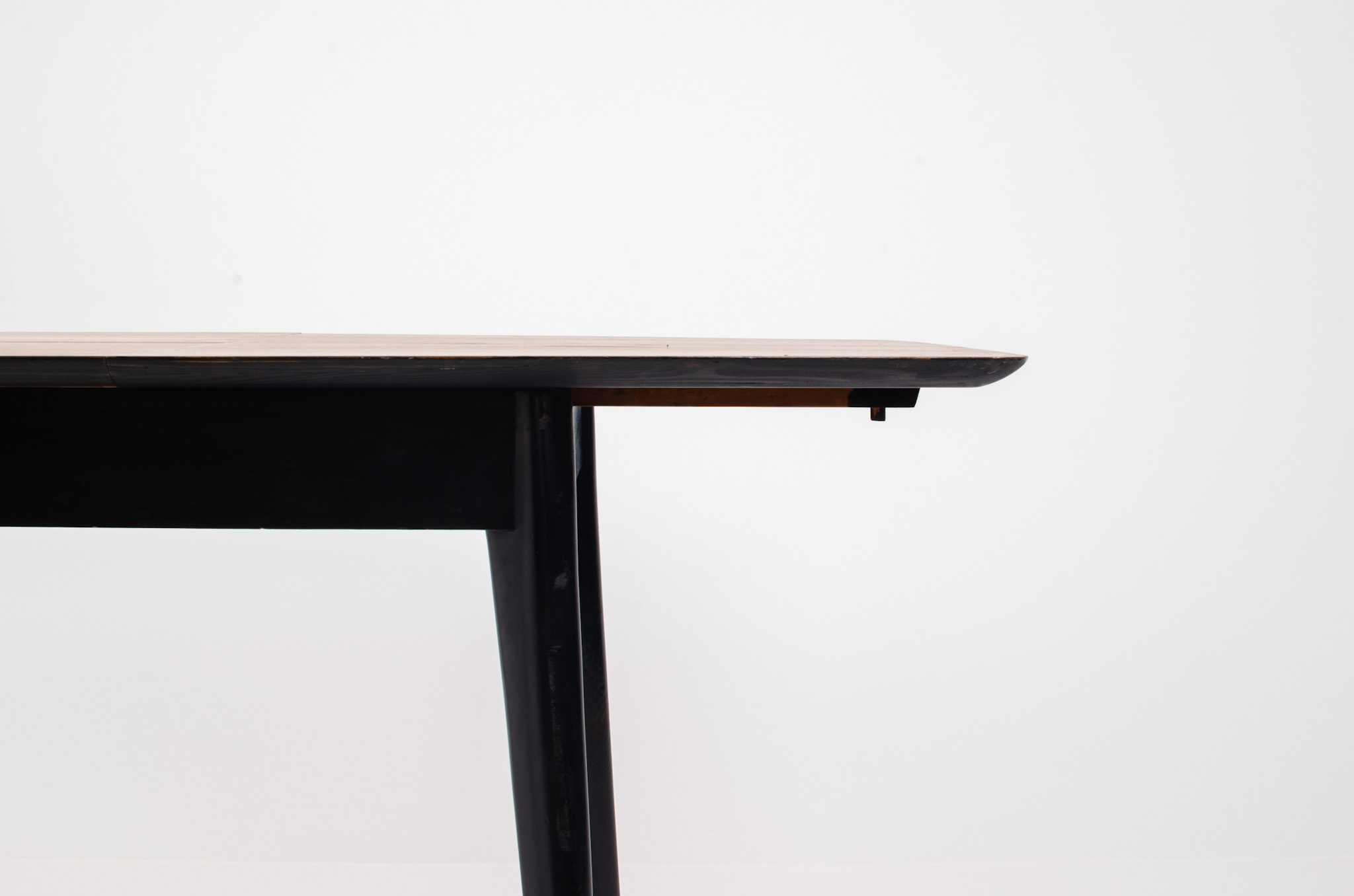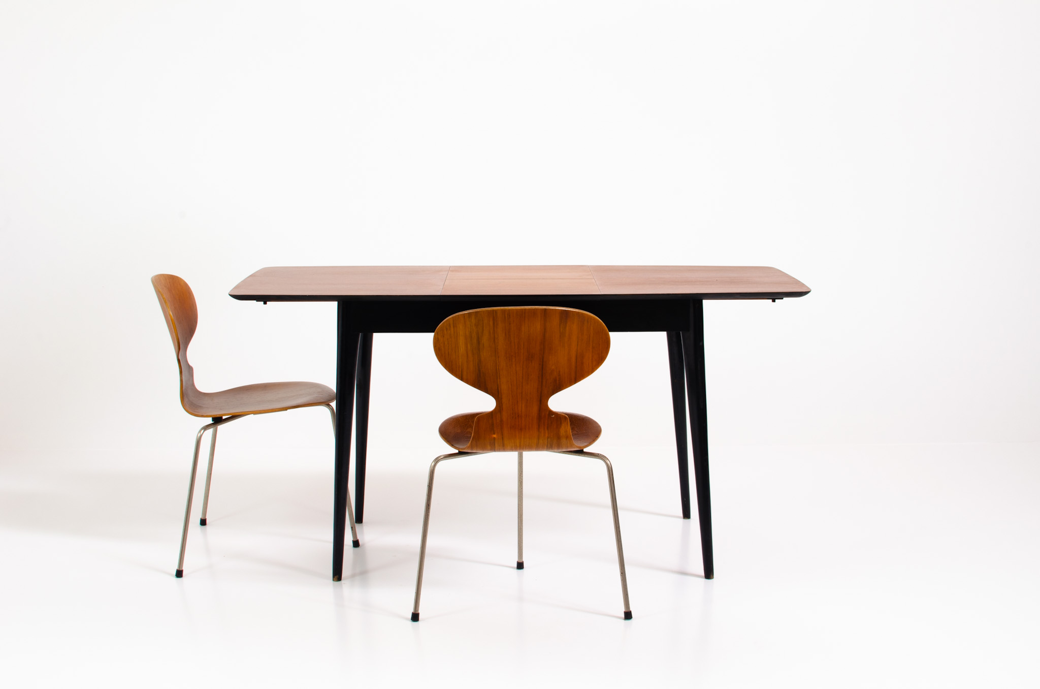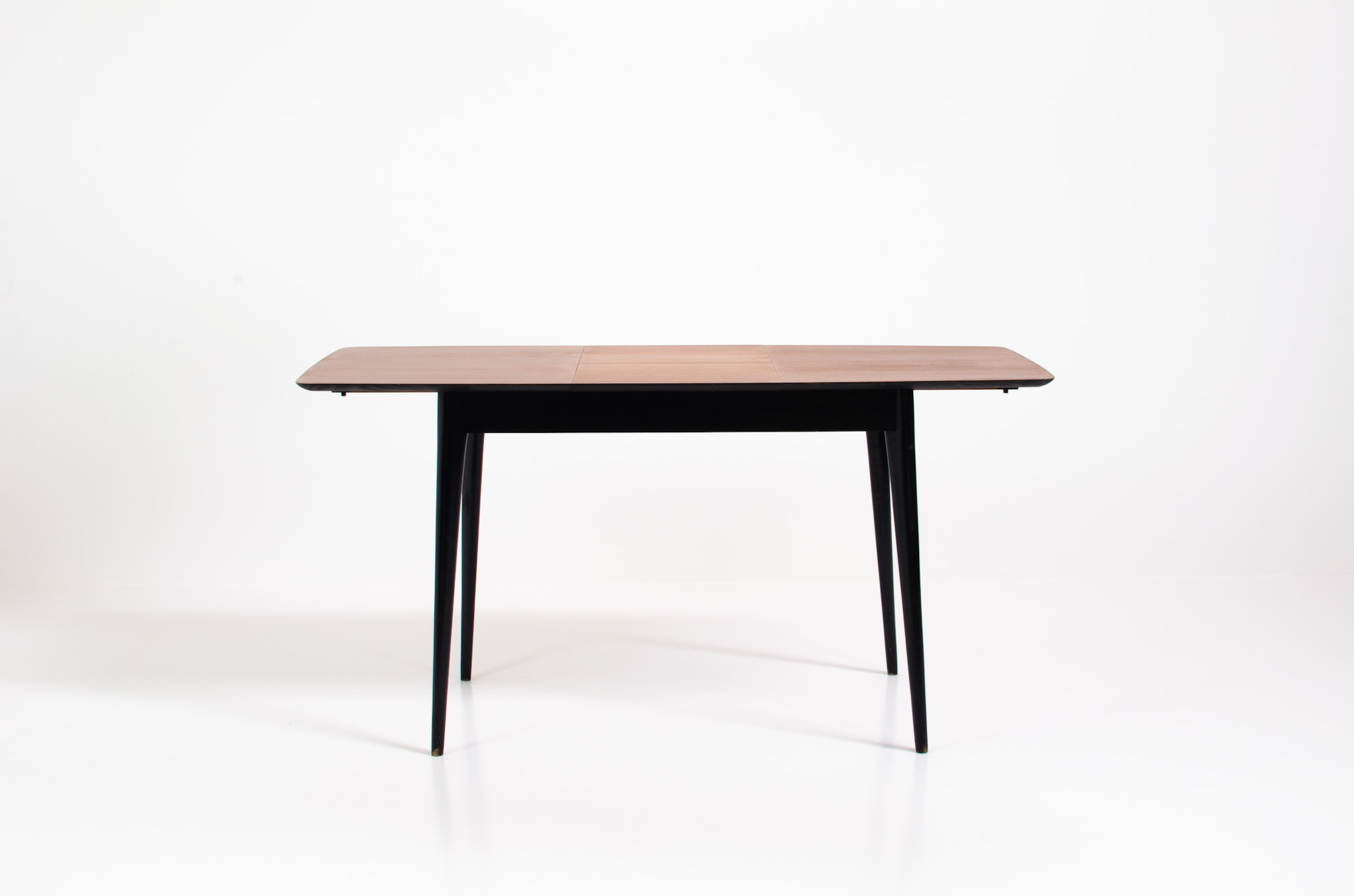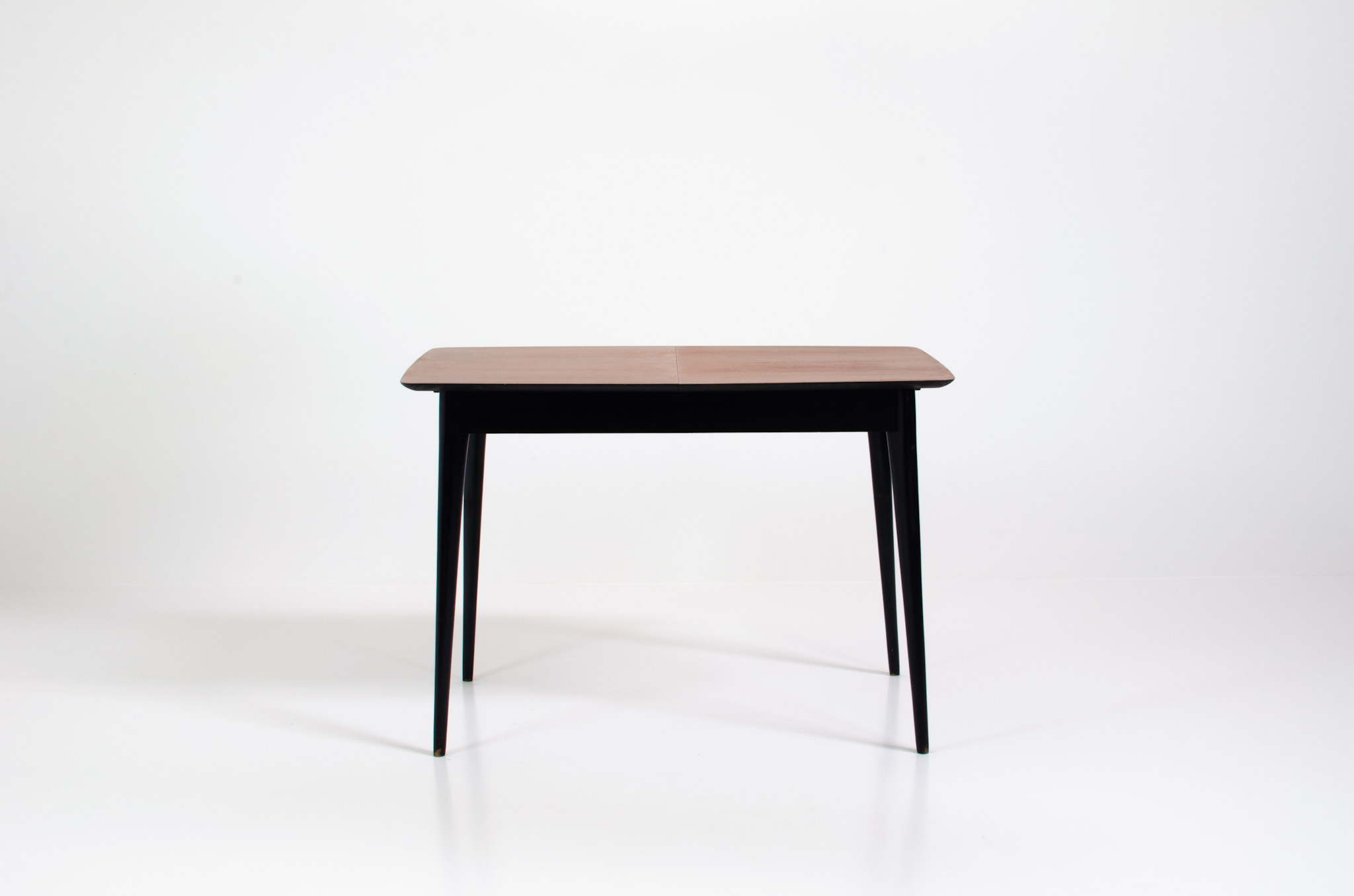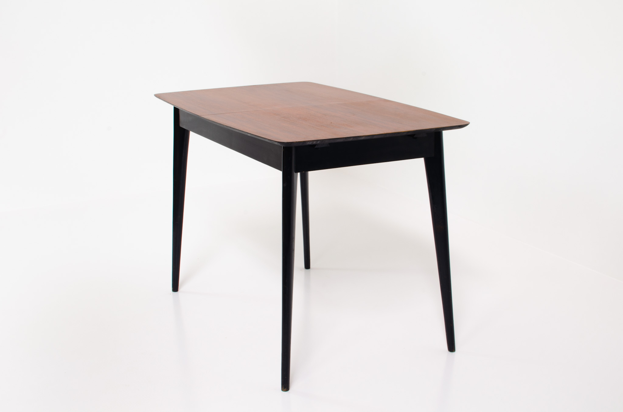 It features a nice contrast between the top in bubinga veneer and the black lacquered legs and bottom. It van easily be extended with a hidden butterfly leaf.