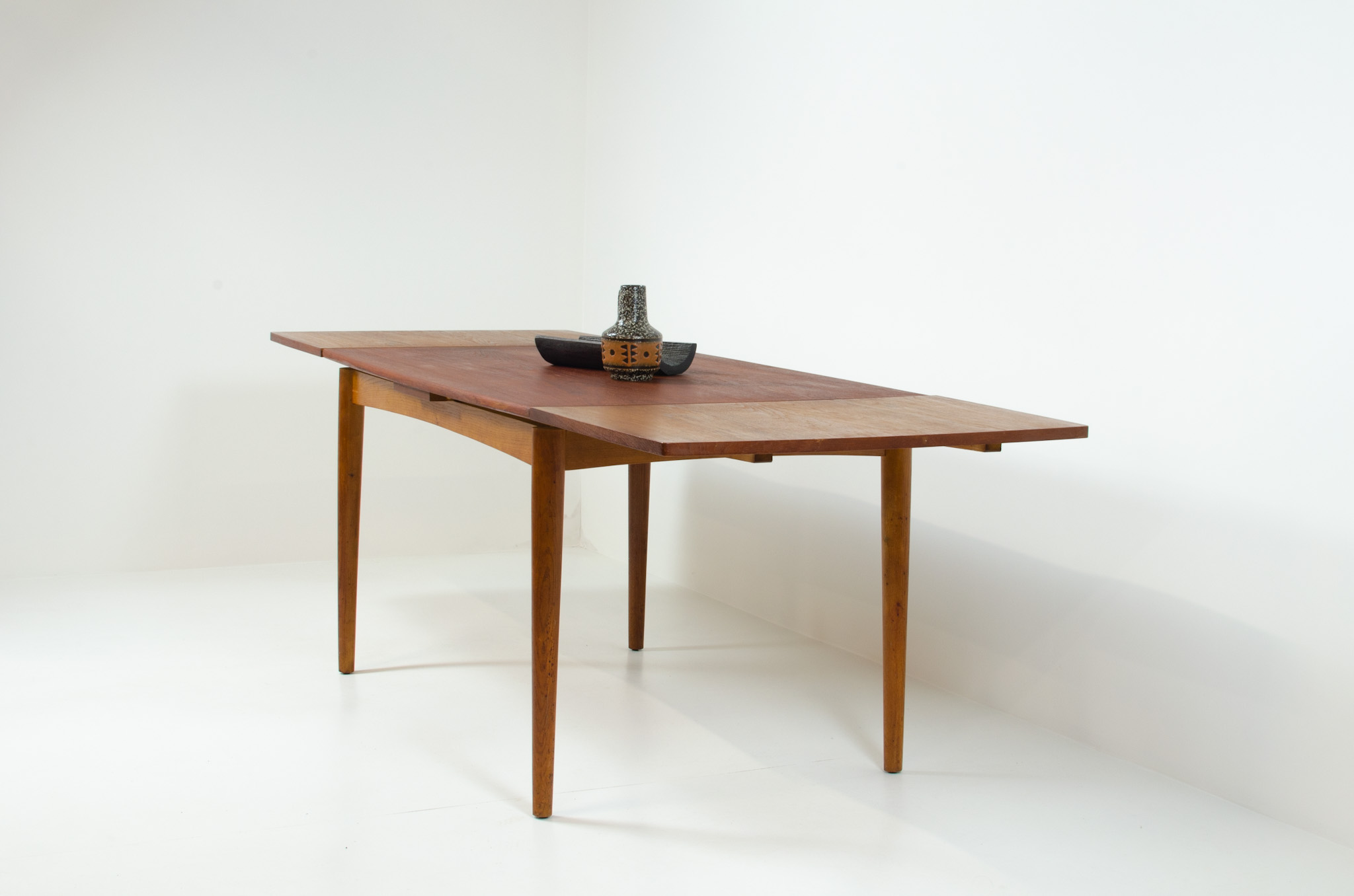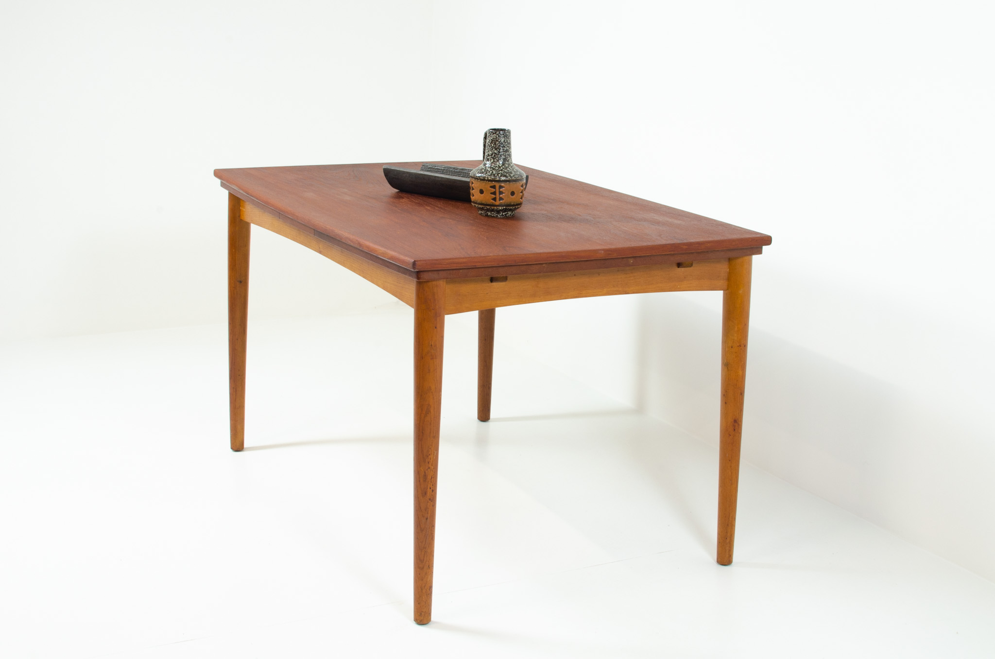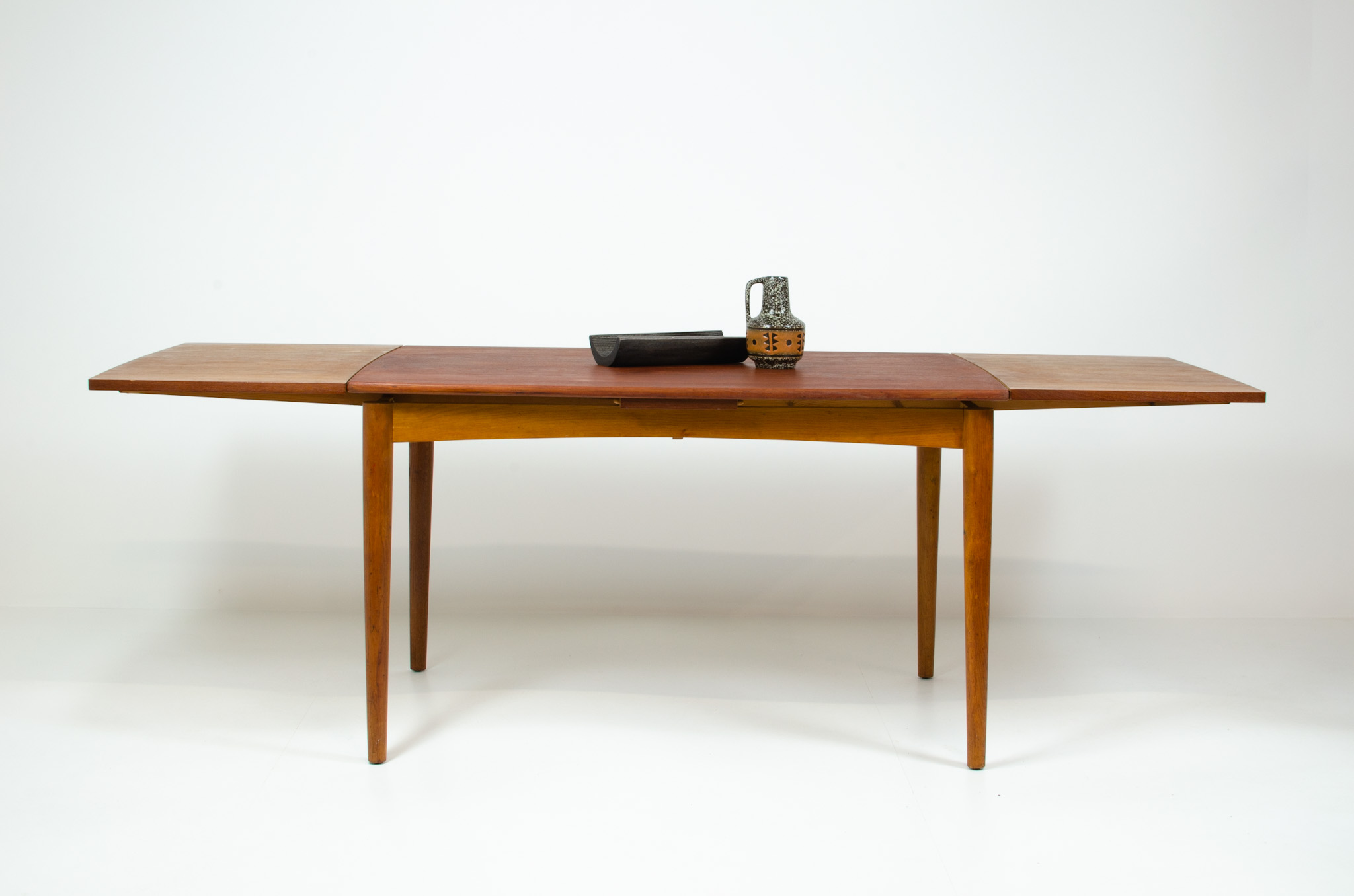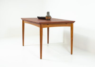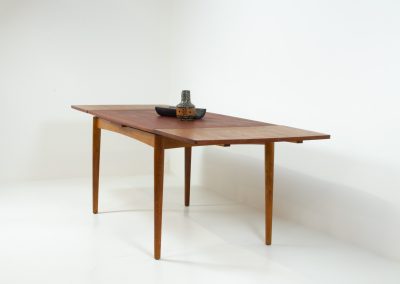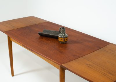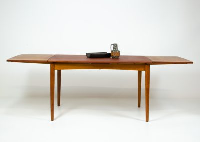 It is easily extendable with 2 hidden leafs and can fit 8 chairs. The extension leafs differ a bit in color.