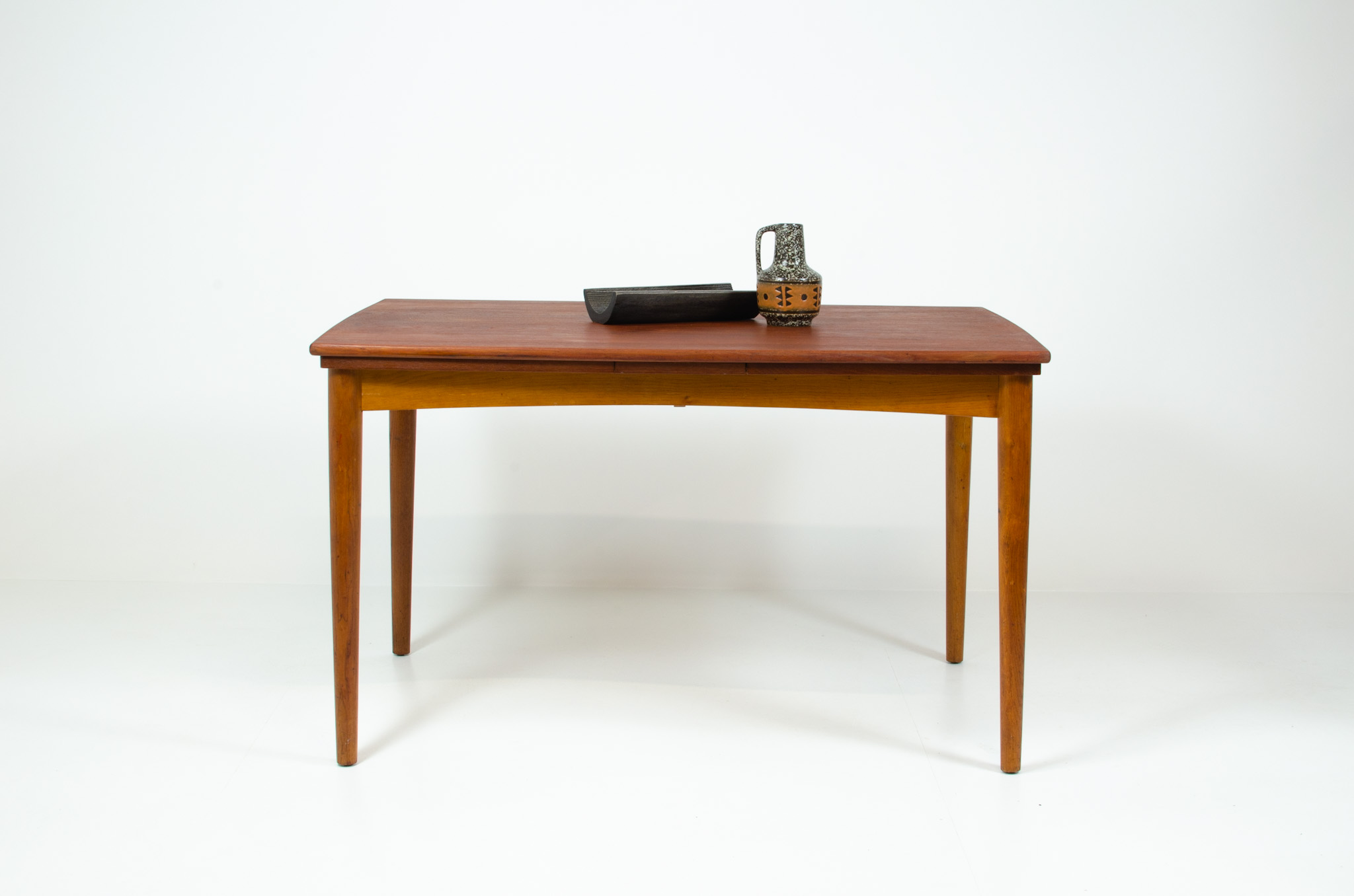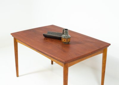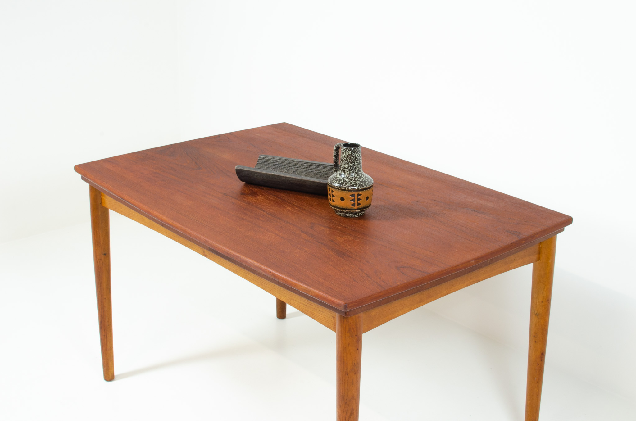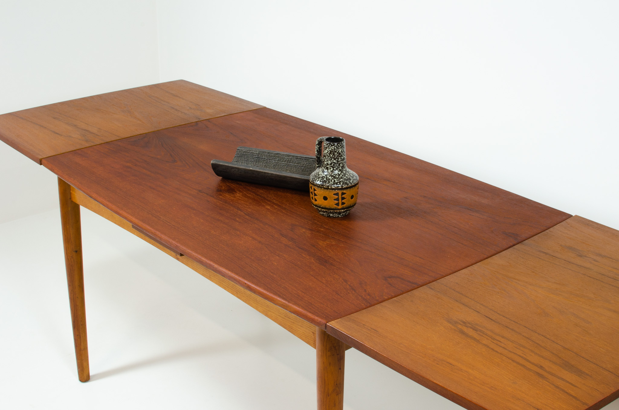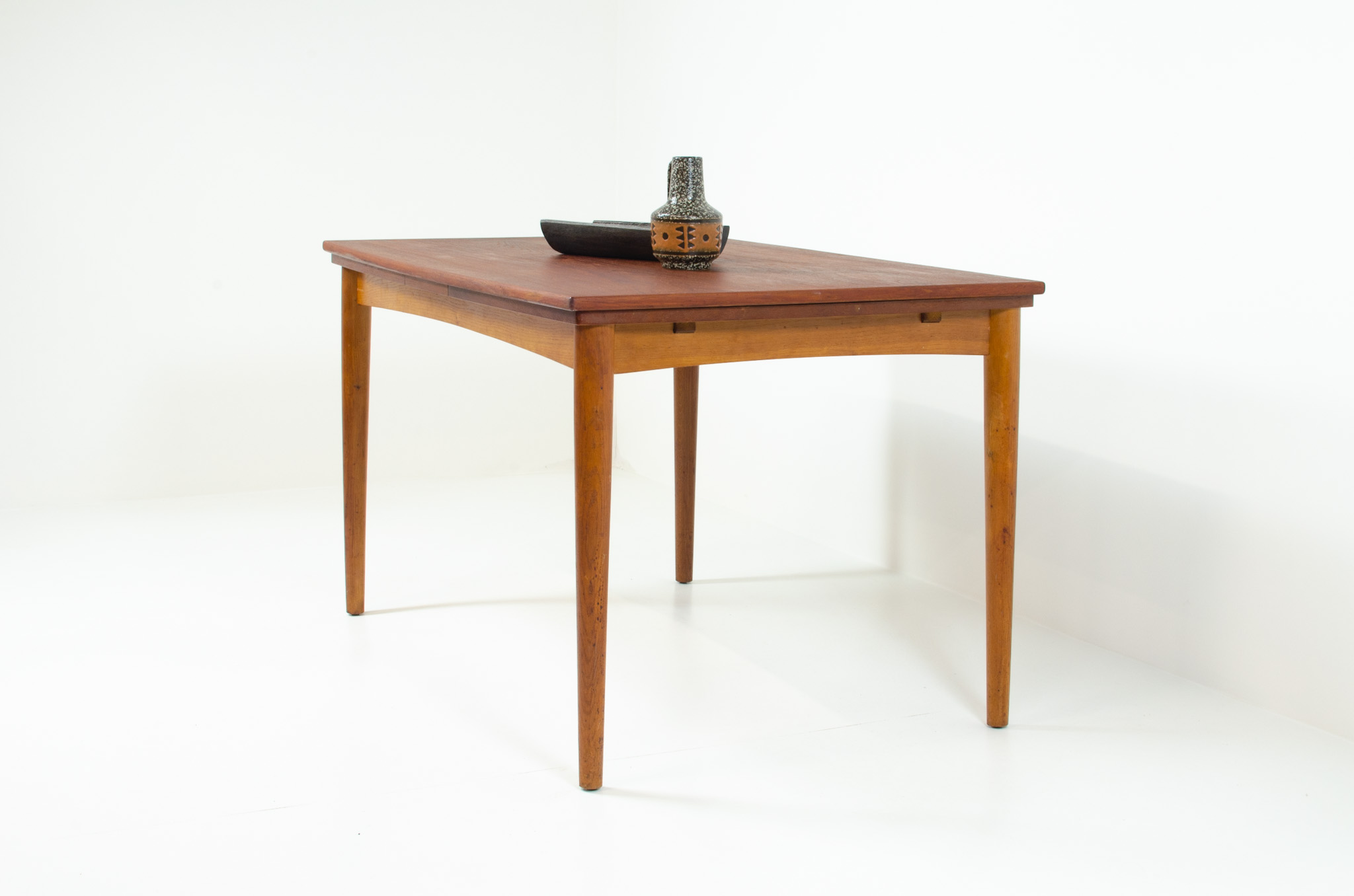 It is easily extendable with 2 hidden leafs and can fit 8 chairs. The extension leafs differ a bit in color.