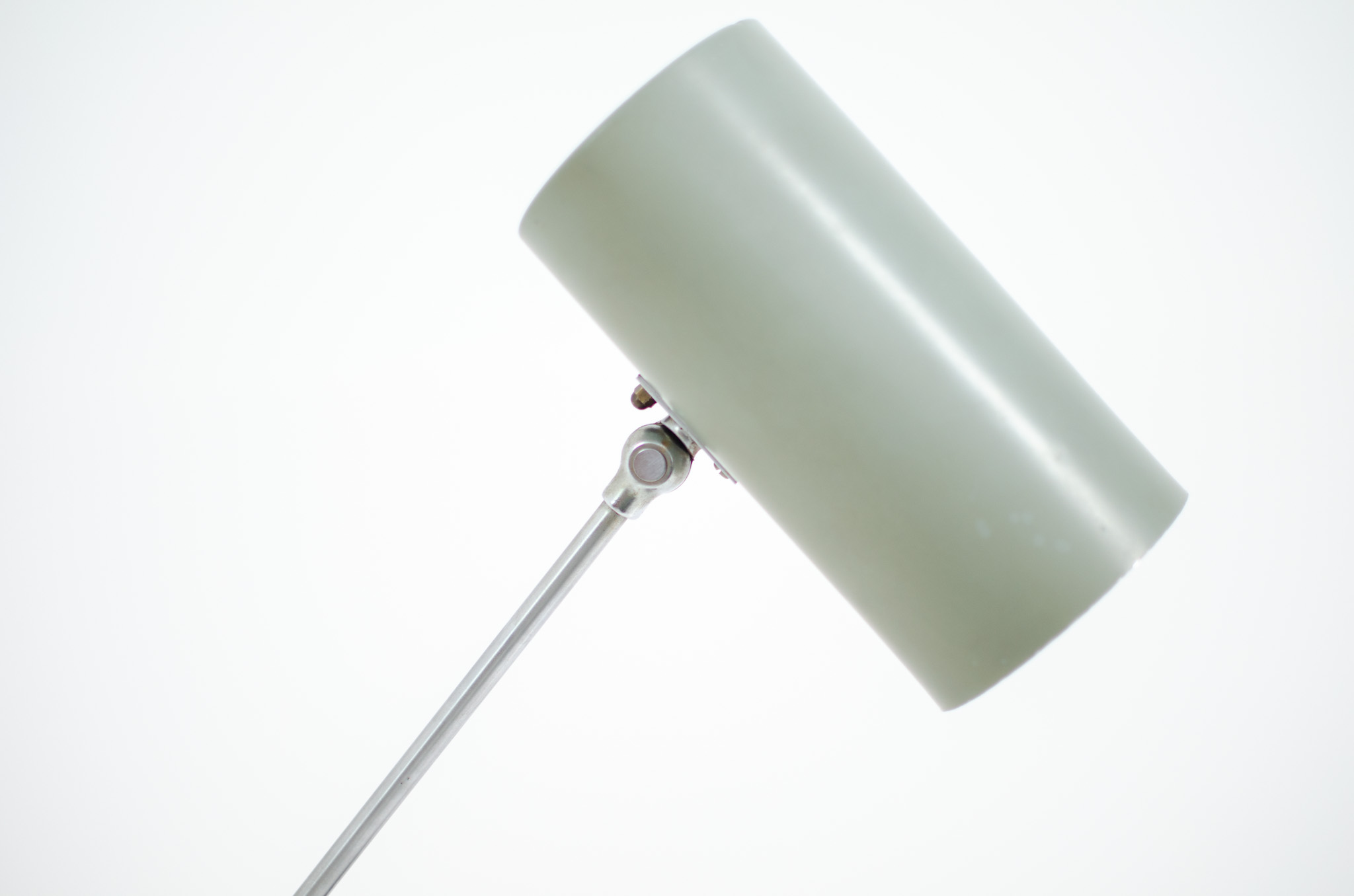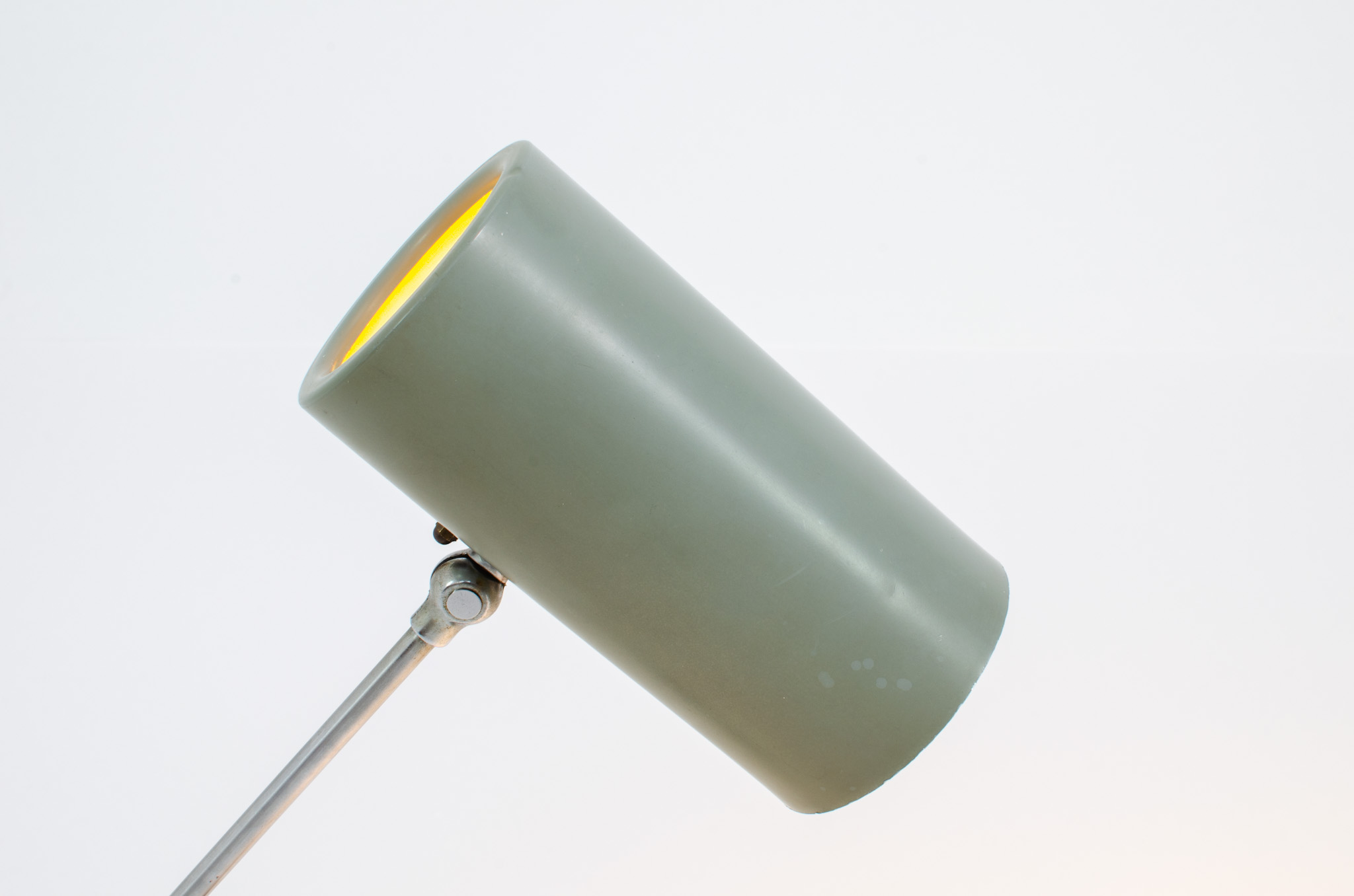 It’s made out of metal and is adjustable in angle and height. It is in very good condition, the lamp shade has a nice patina on it and shows some minor dents.