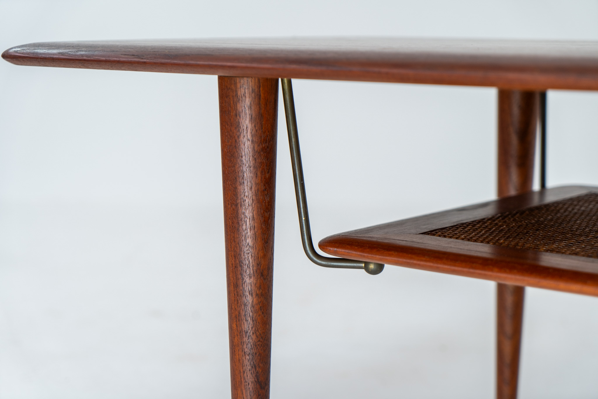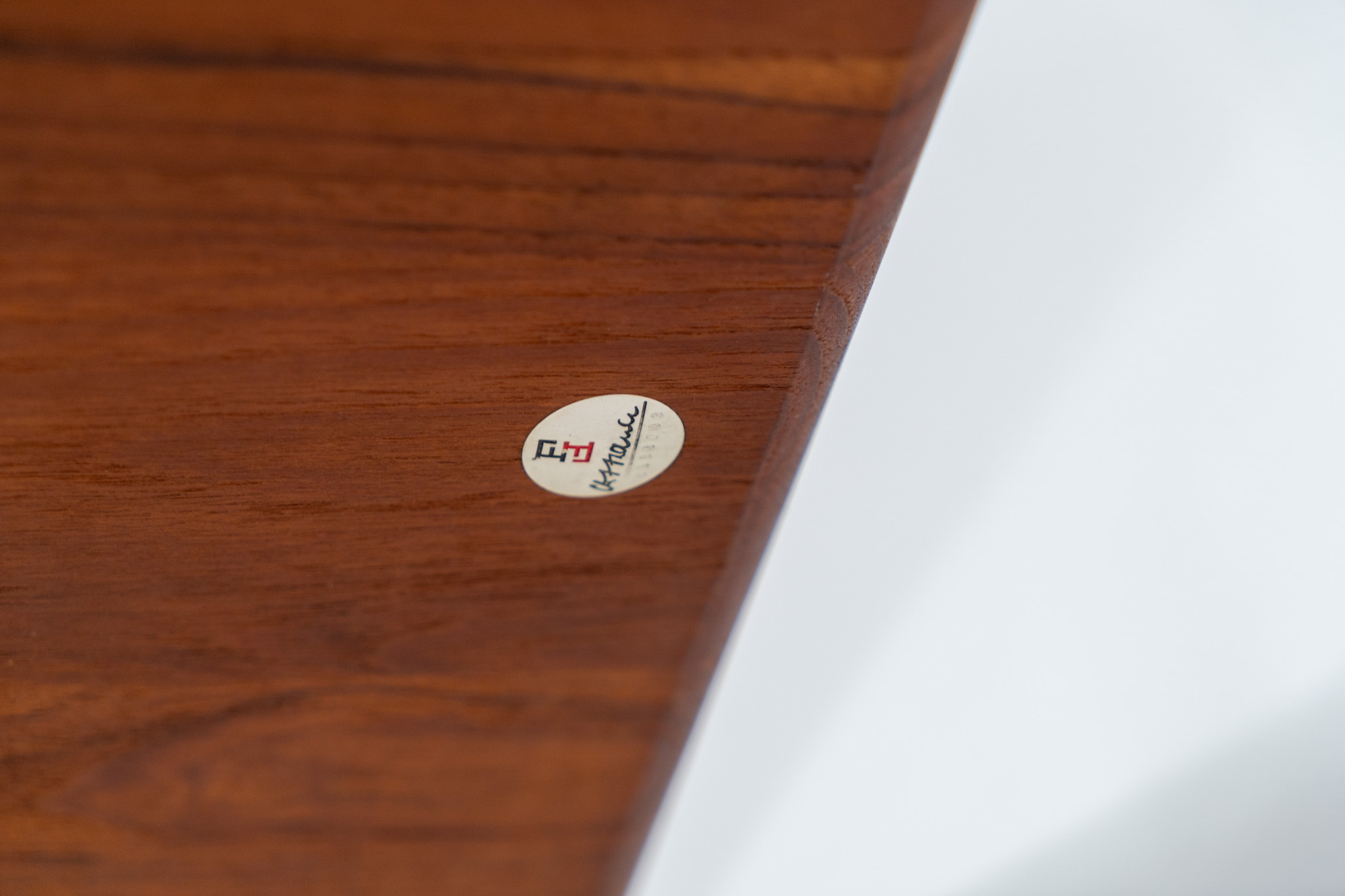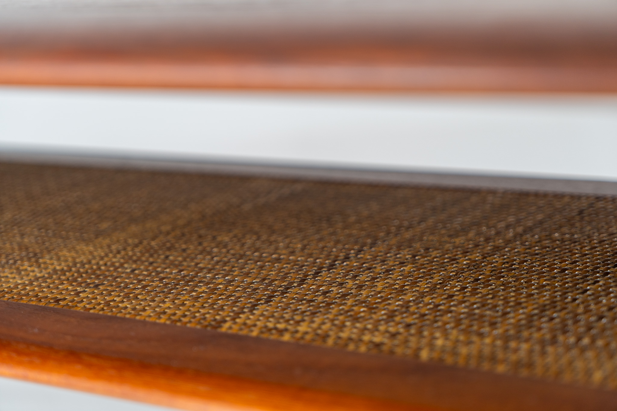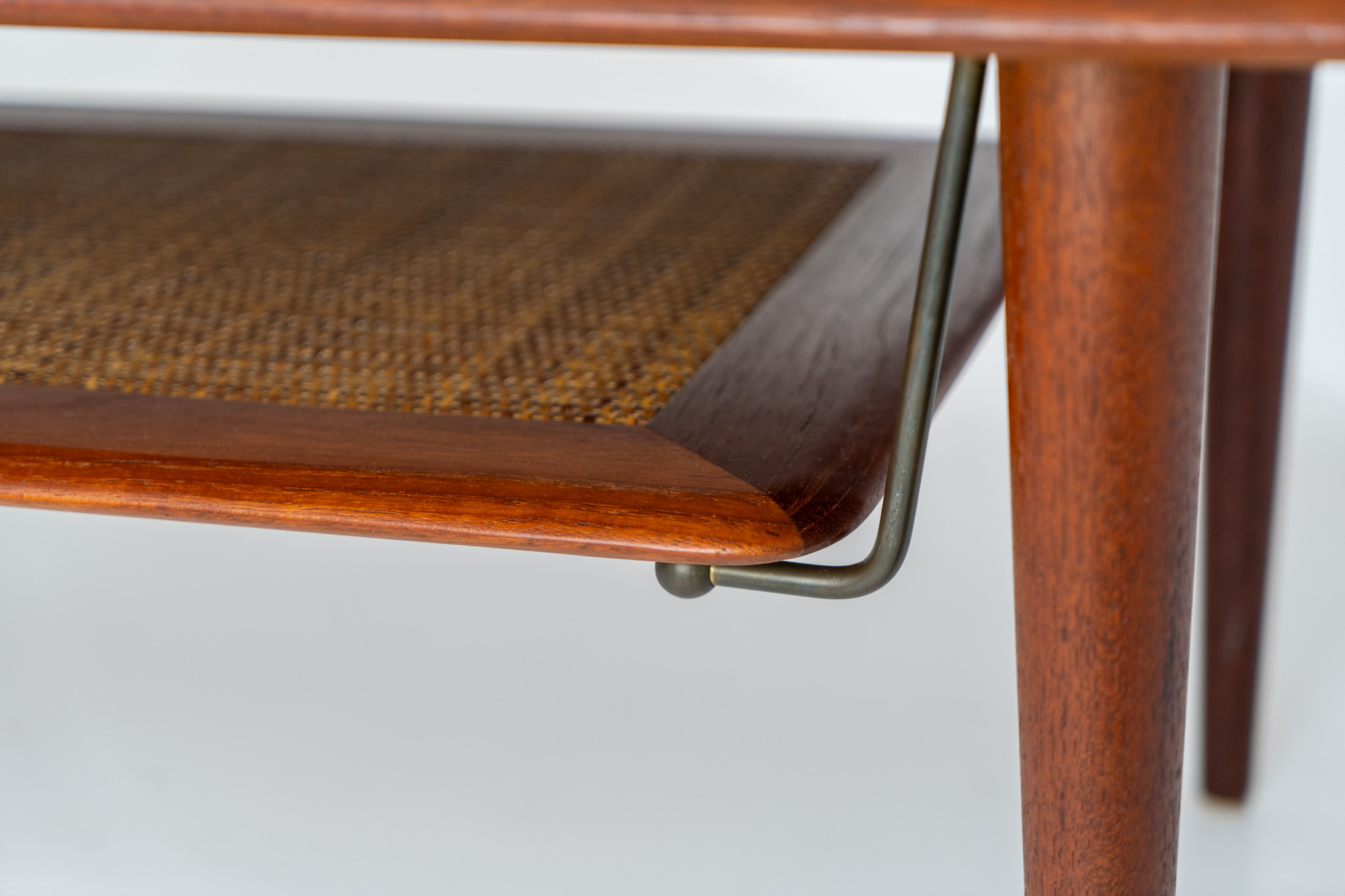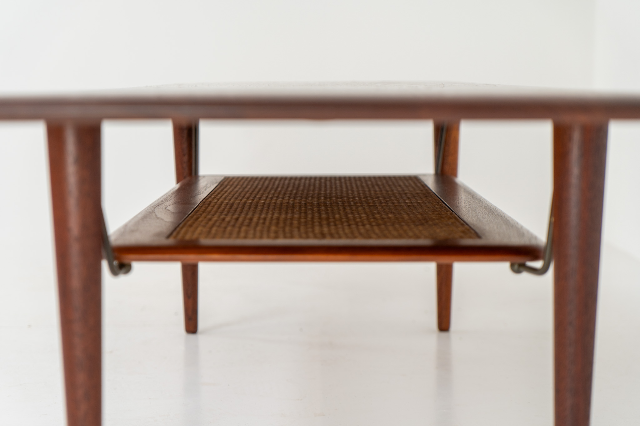This rare and important FD-516 model features a solid teak table top and solid legs. It has an additional magazine area made of rattan mesh, which is worn by brass fittings.