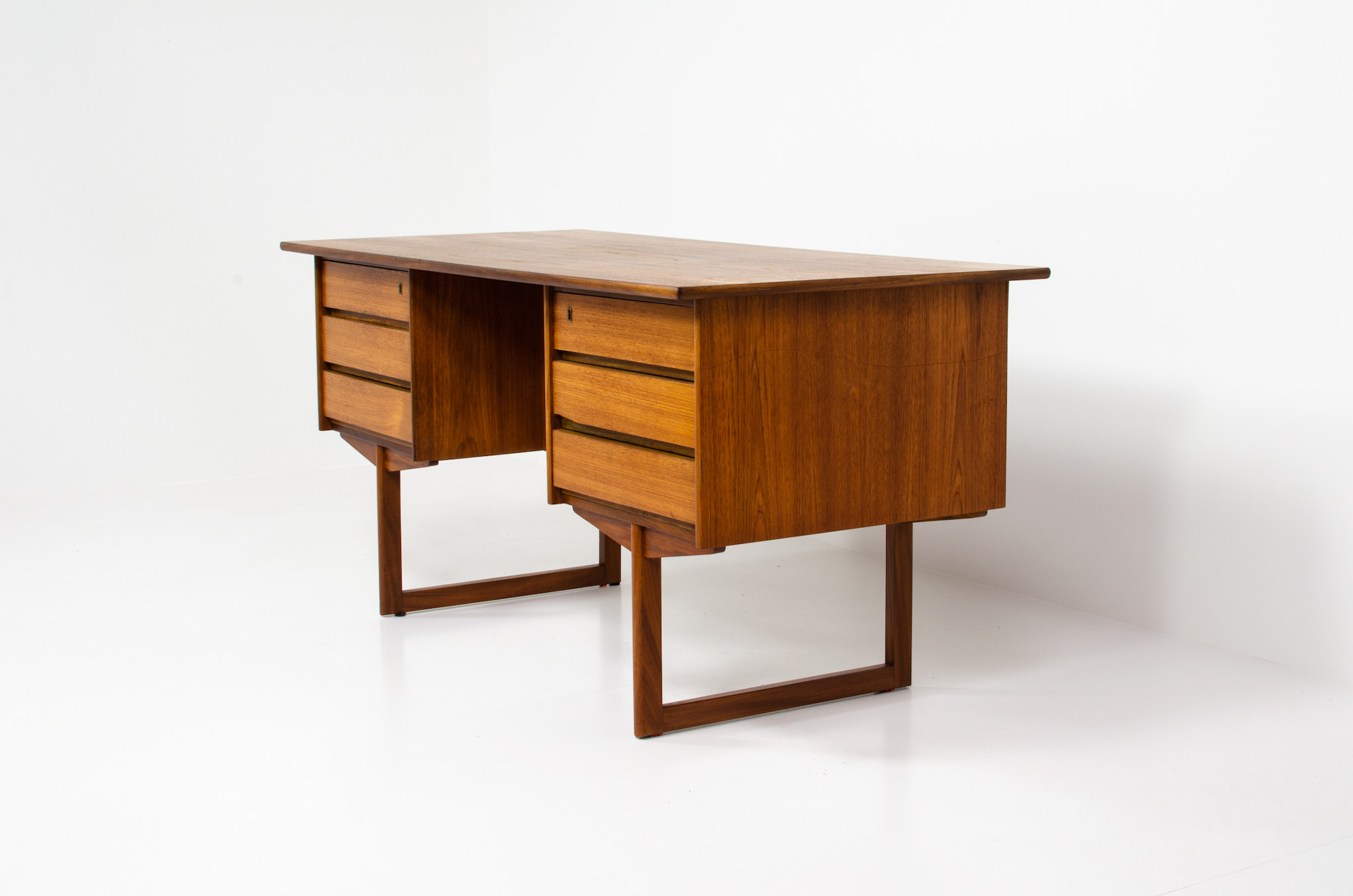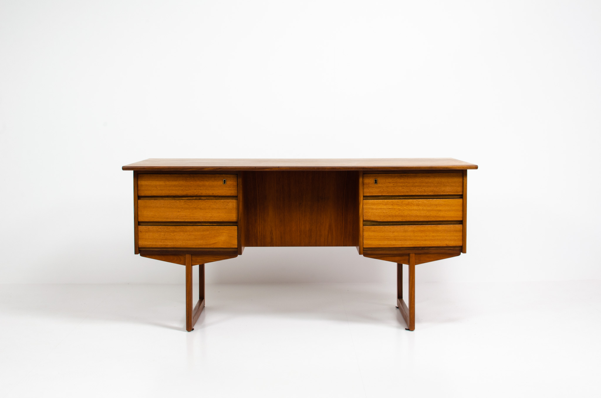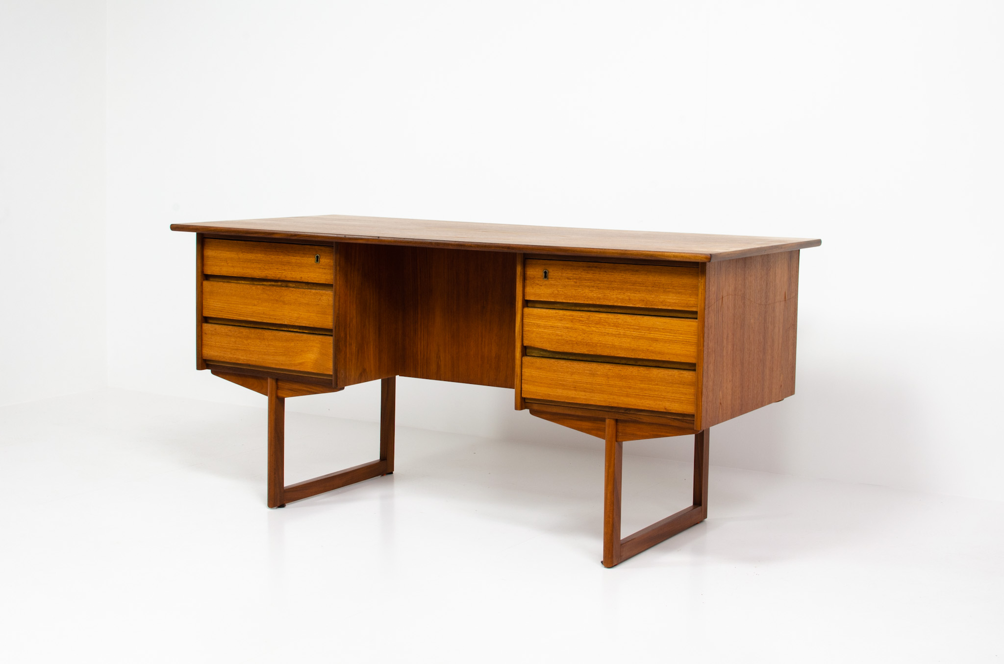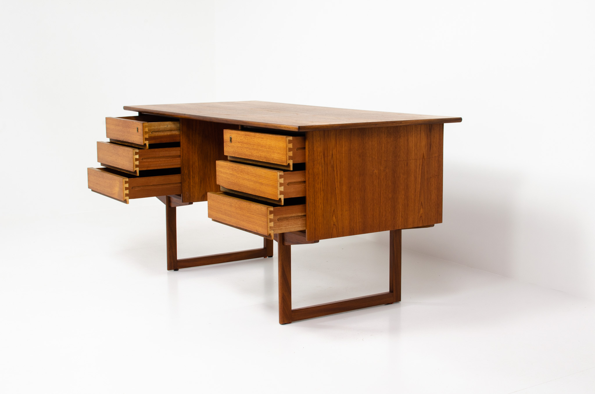 A very nice piece with 6 drawers (original key incl.). The desk is made of teak wood and is free-standing thanks to the finished back with an open storage space/bookcase. Perfect to place in the center of the room.