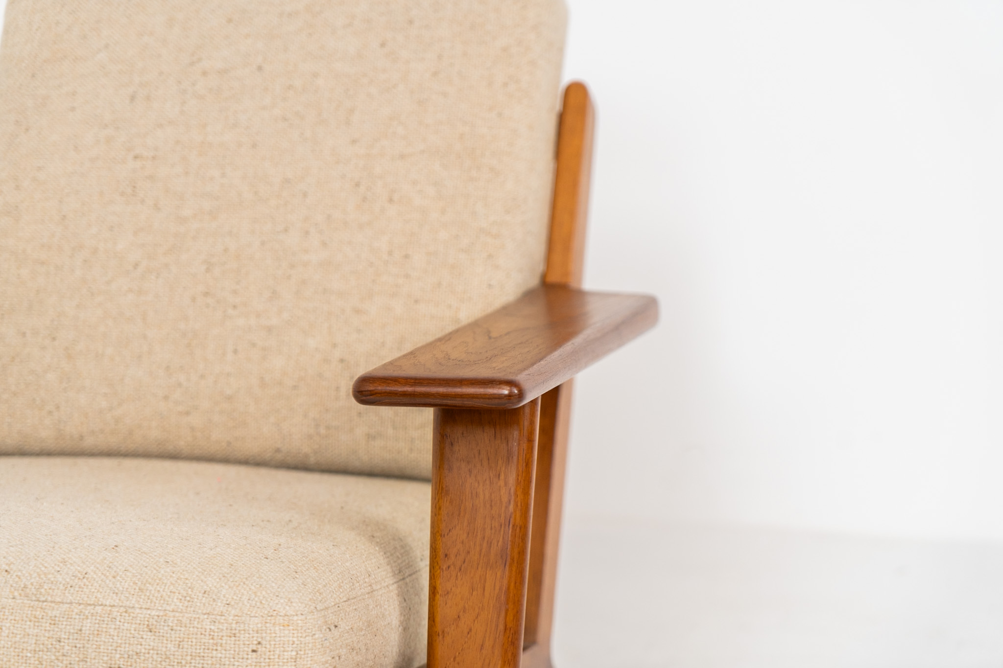 The chair features a dark-stained solid oak frame paired with beige wool cushions, creating a timeless and well-balanced contrast that highlights Wegner’s mastery of materials and proportion.