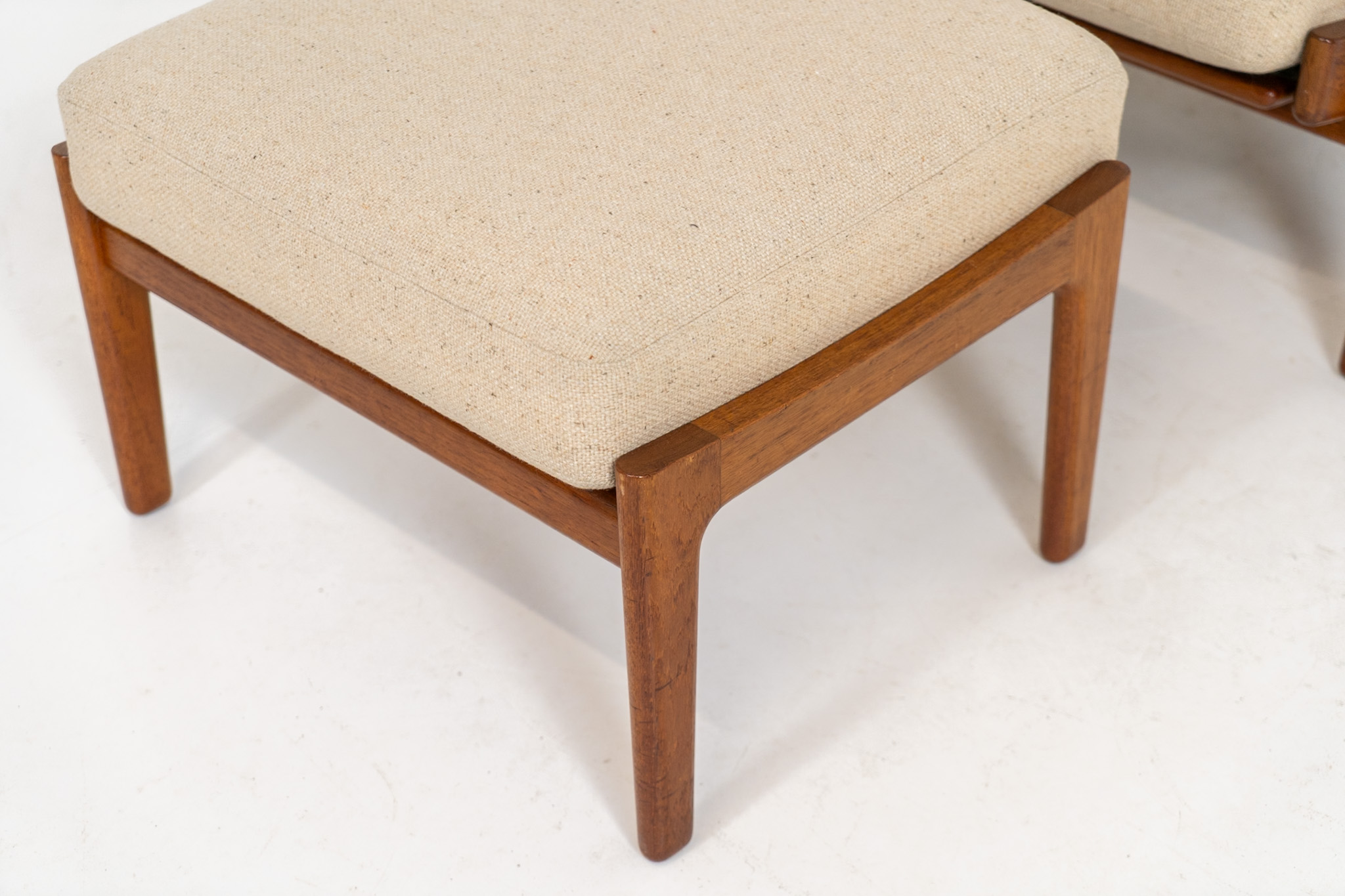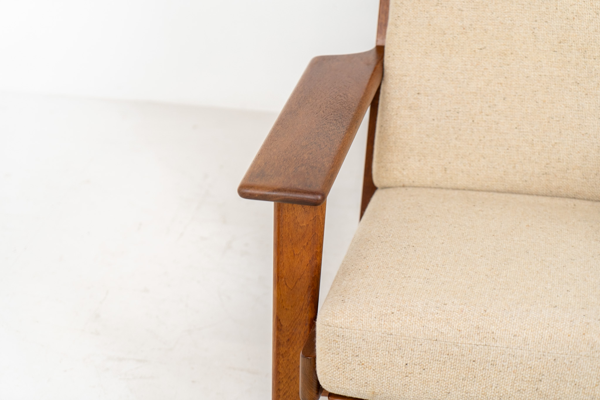 The chair features a dark-stained solid oak frame paired with beige wool cushions, creating a timeless and well-balanced contrast that highlights Wegner’s mastery of materials and proportion.