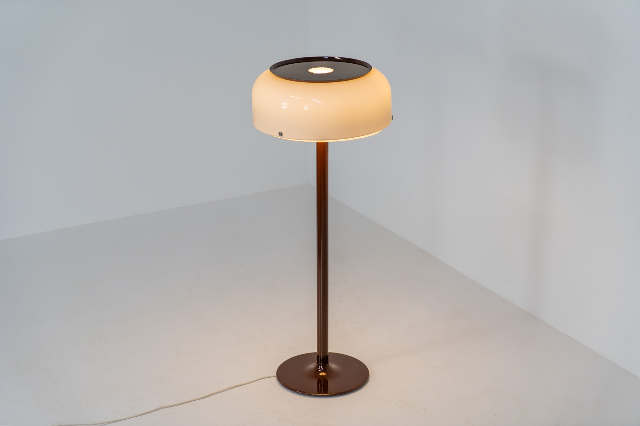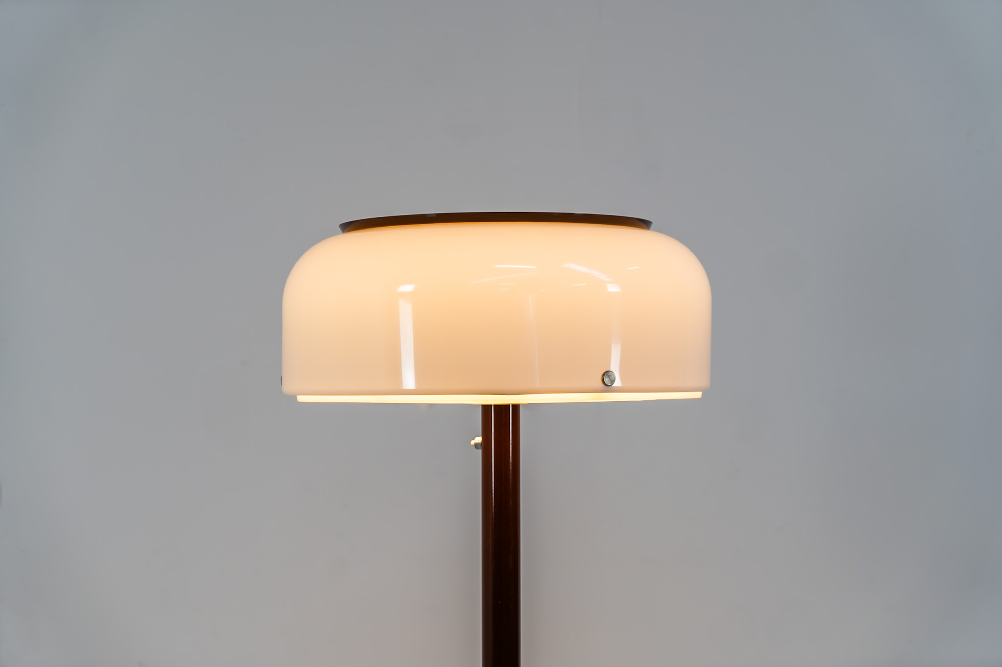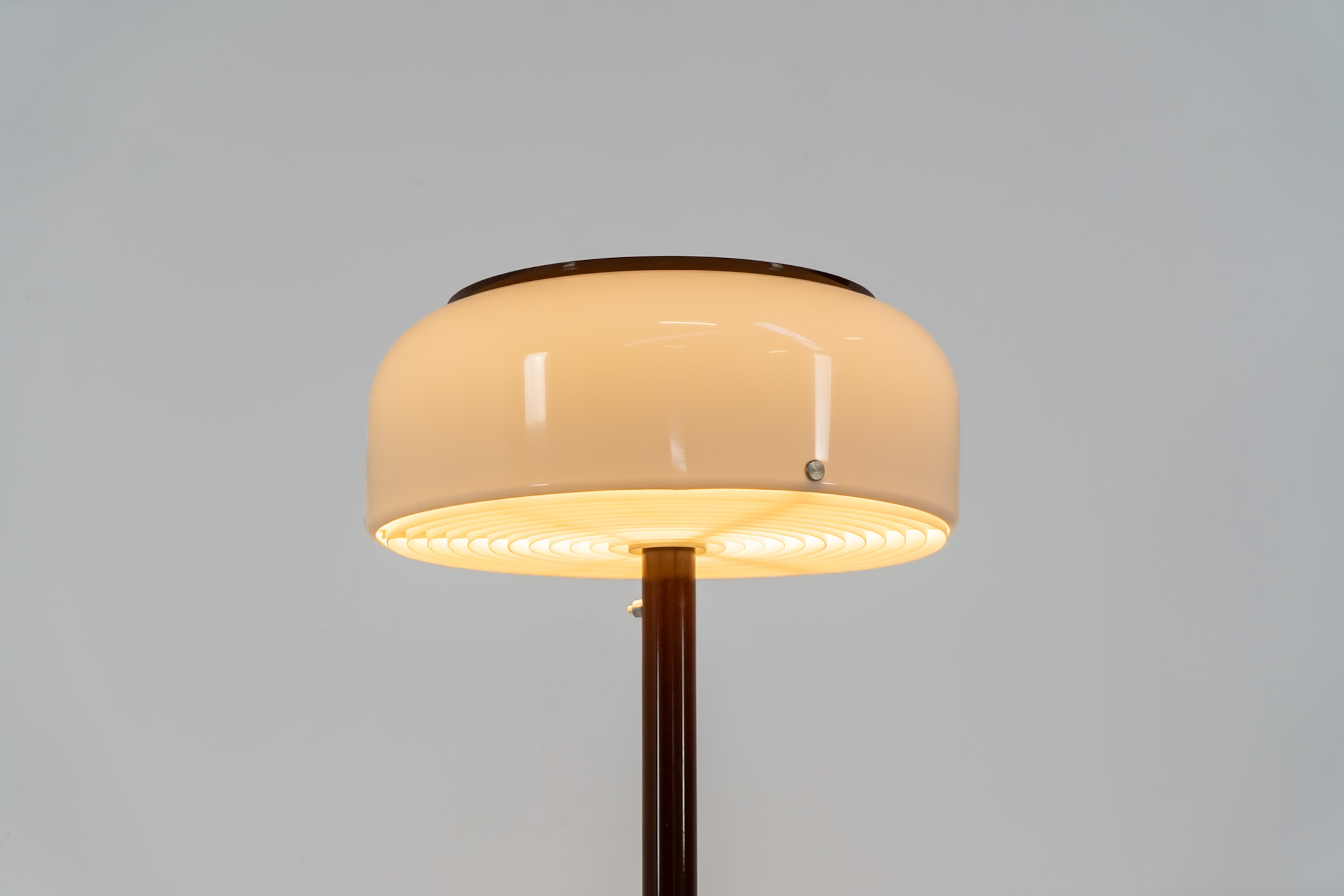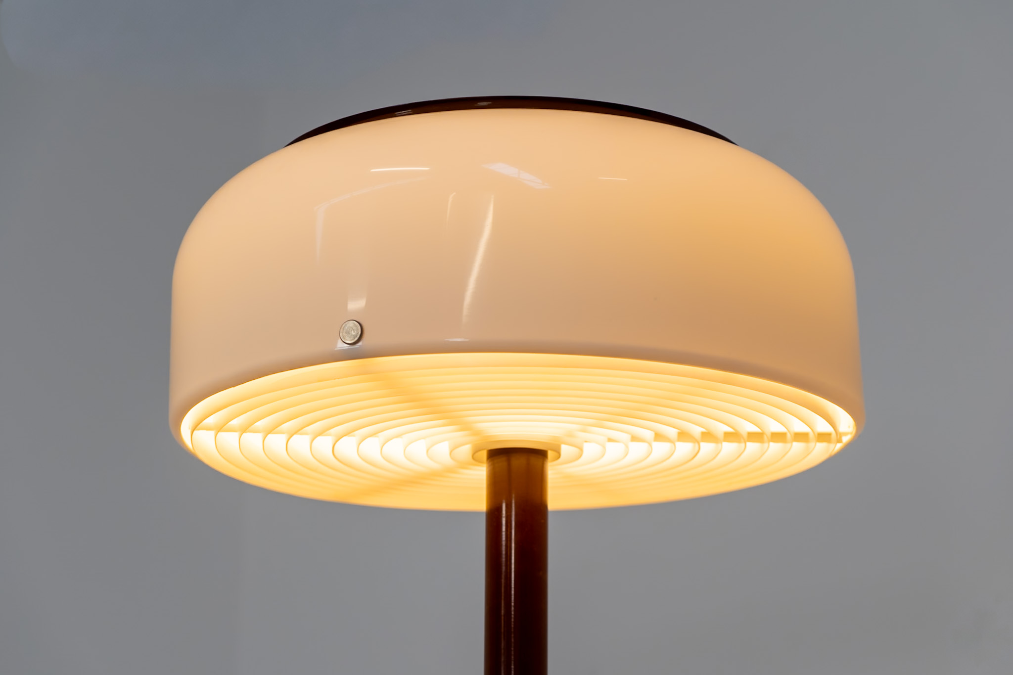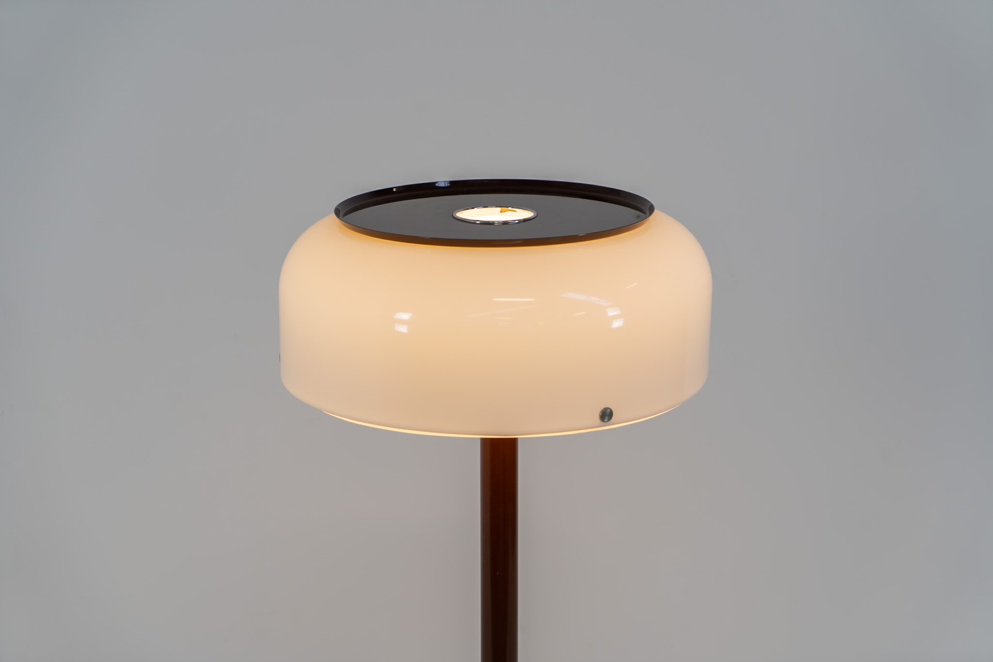 The lamp features an elegant dark brown lacquered metal base, beautifully contrasted by a generous acrylic shade. Both the shade and the internal diffuser emit light in subtly different tones, creating a layered and dynamic illumination effect. When lit, the lamp reveals a warm, atmospheric glow with remarkable depth.