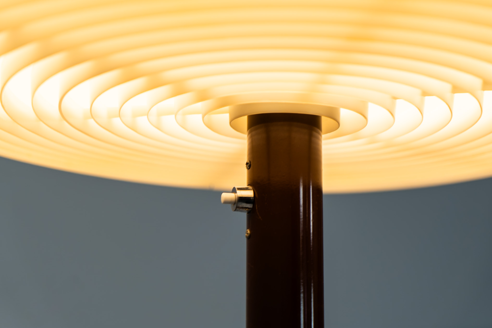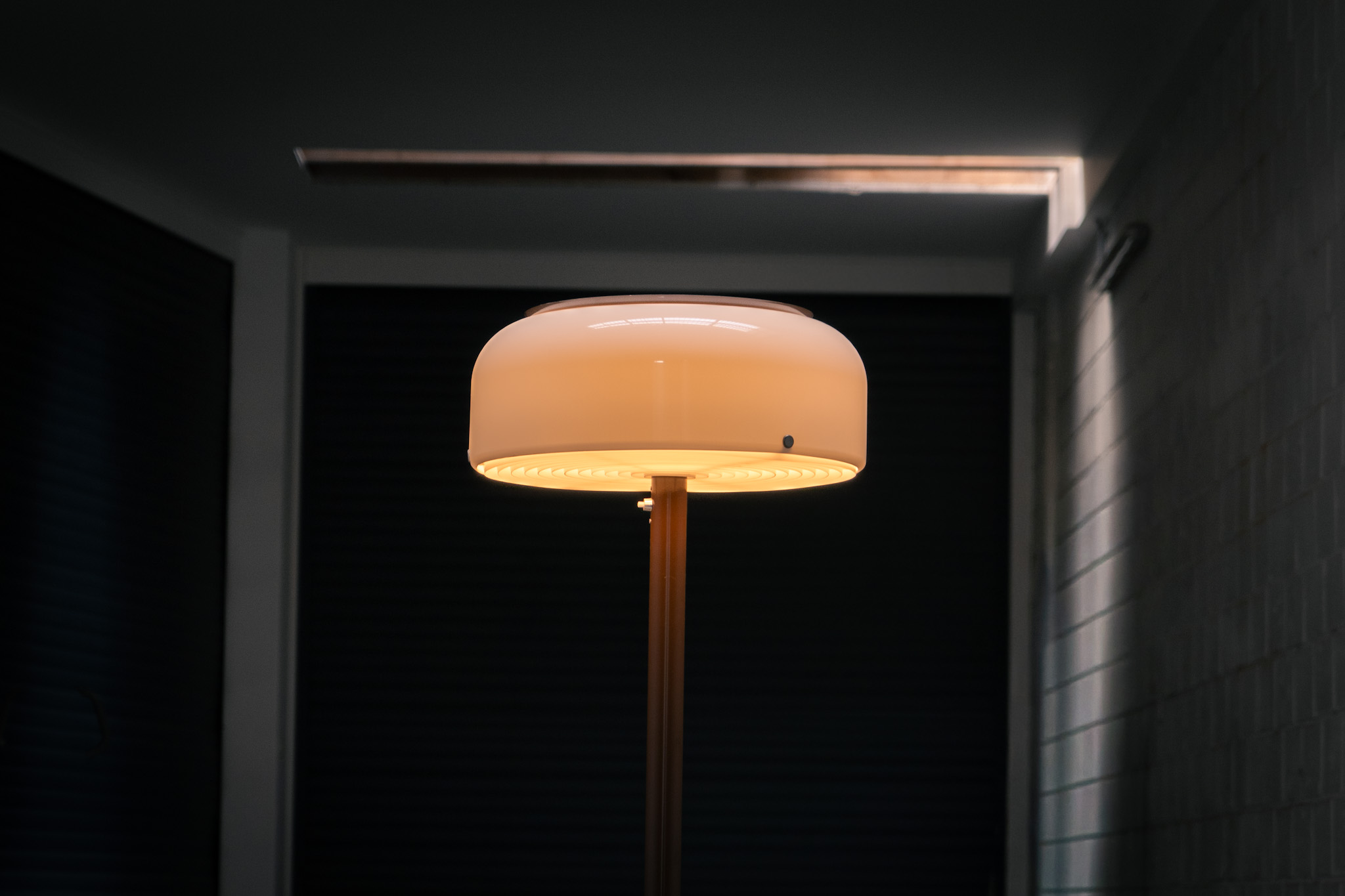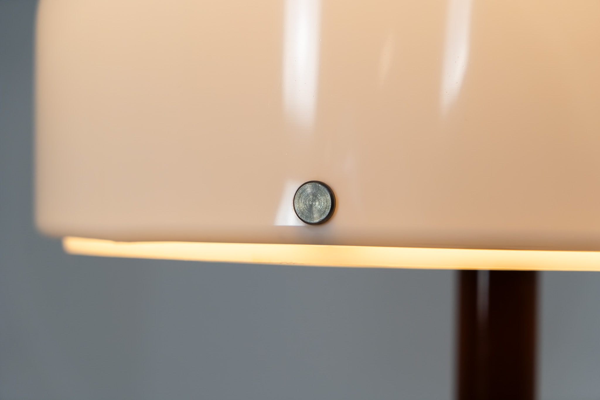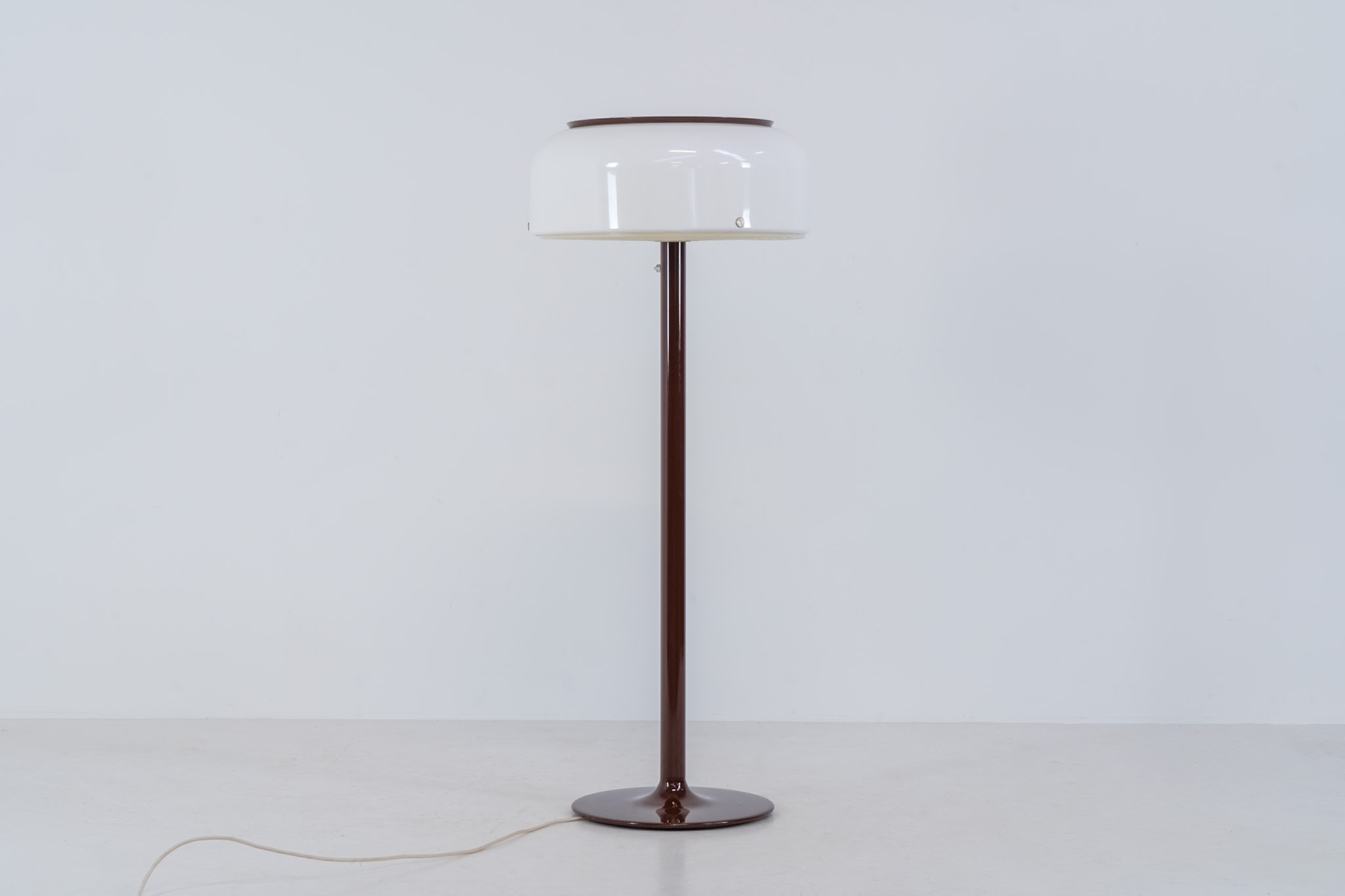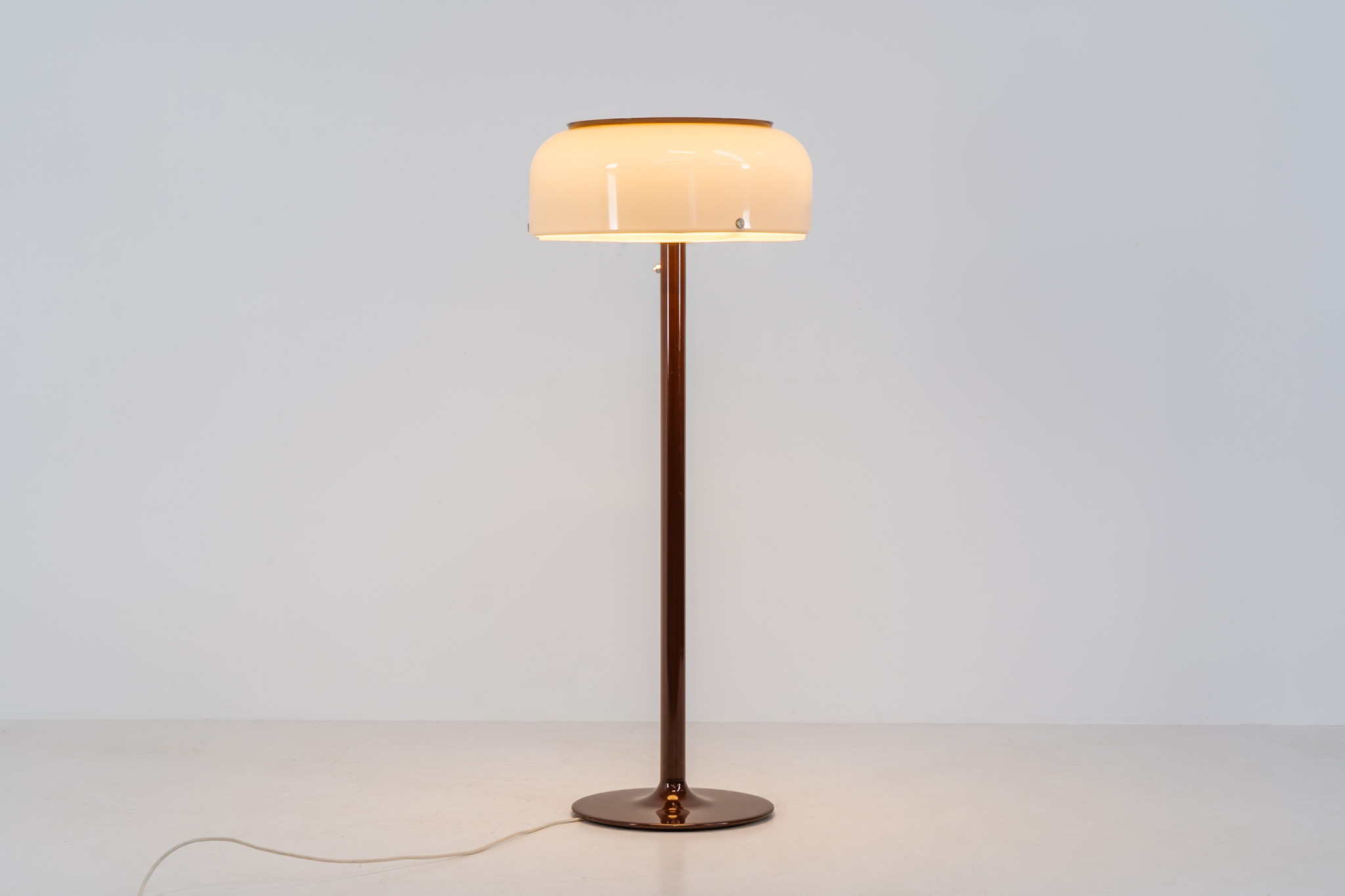 The lamp features an elegant dark brown lacquered metal base, beautifully contrasted by a generous acrylic shade. Both the shade and the internal diffuser emit light in subtly different tones, creating a layered and dynamic illumination effect. When lit, the lamp reveals a warm, atmospheric glow with remarkable depth.