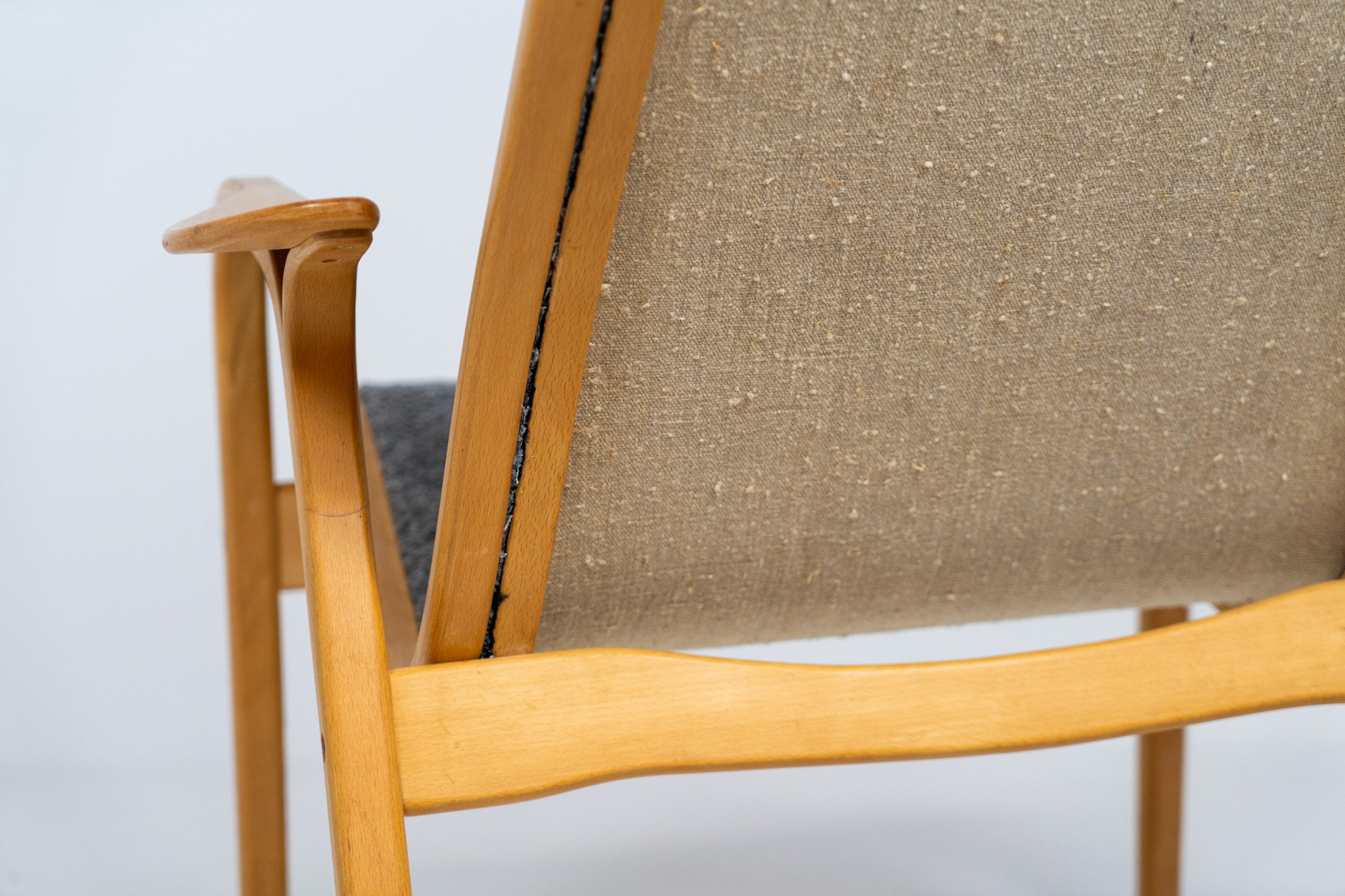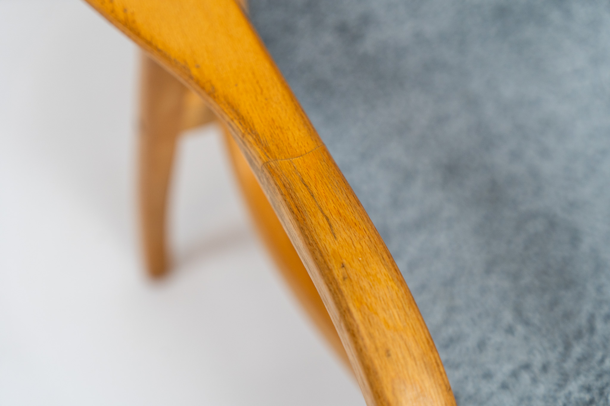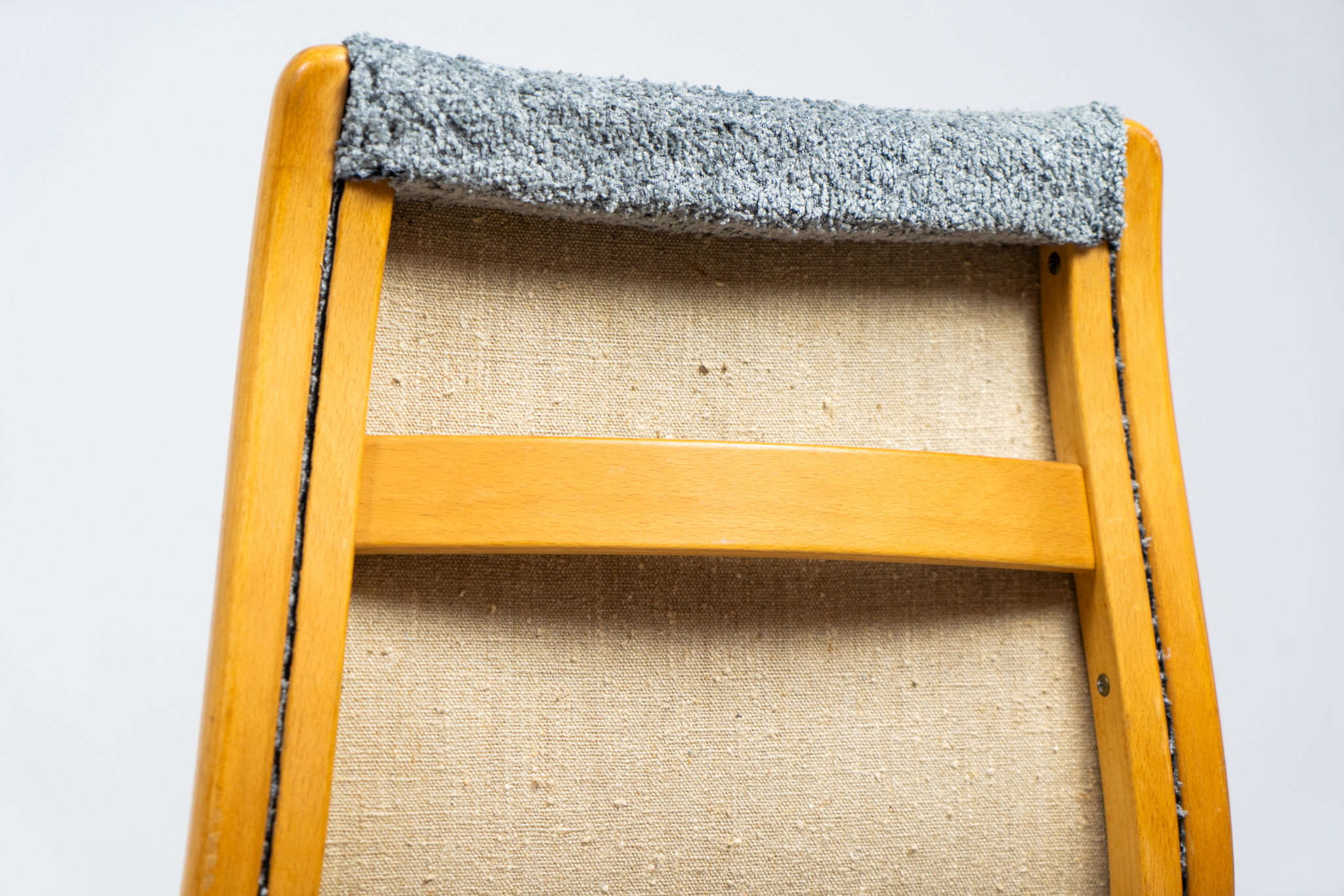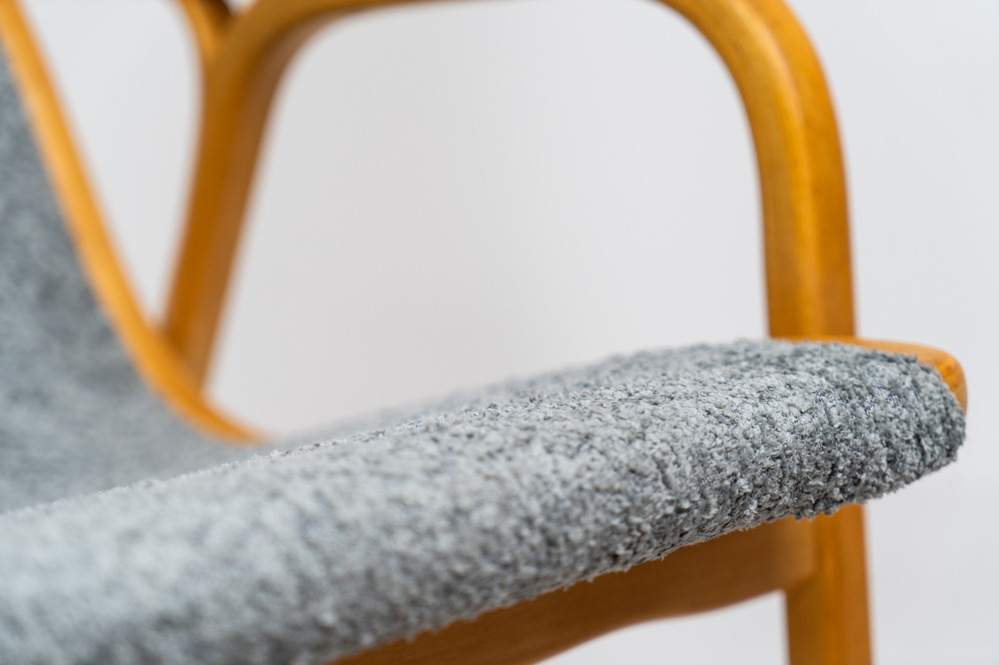 A timeless classic with a perfect mix of simplicity and comfort. It’s made out of beech wood and grey fabric.