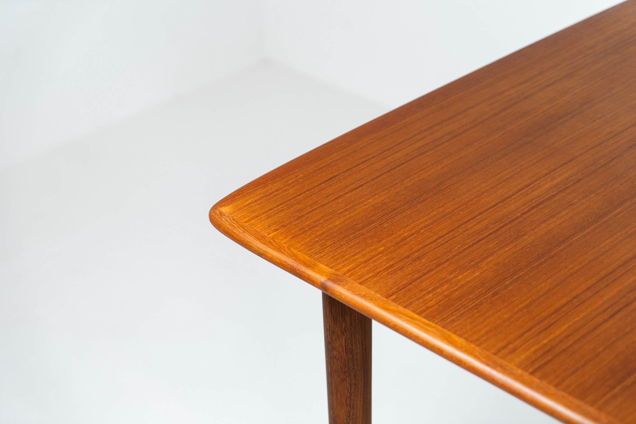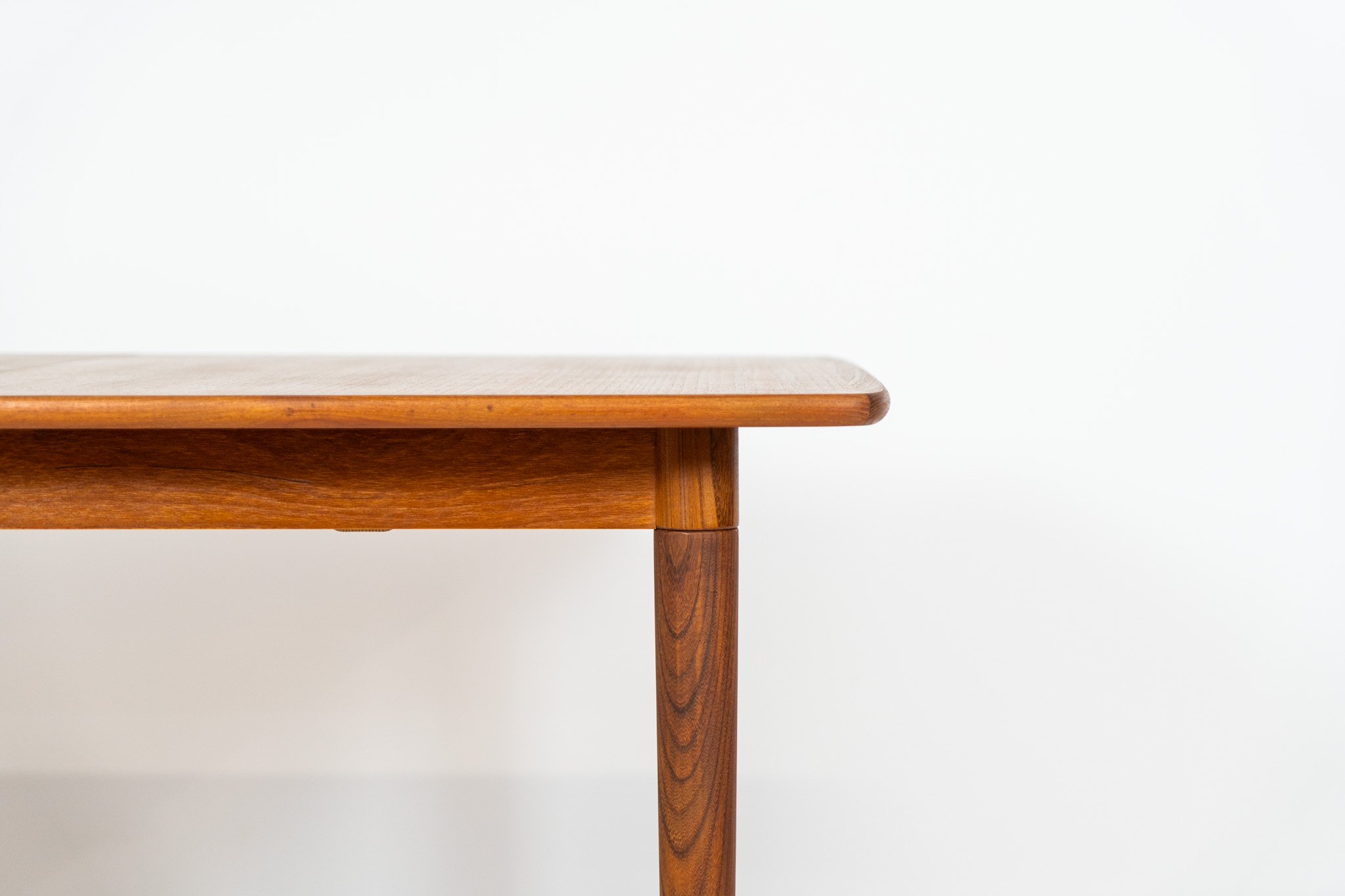 A stunning high-end teak dining table showcasing beautiful woodgrain, elegant curves, and a natural finish.
