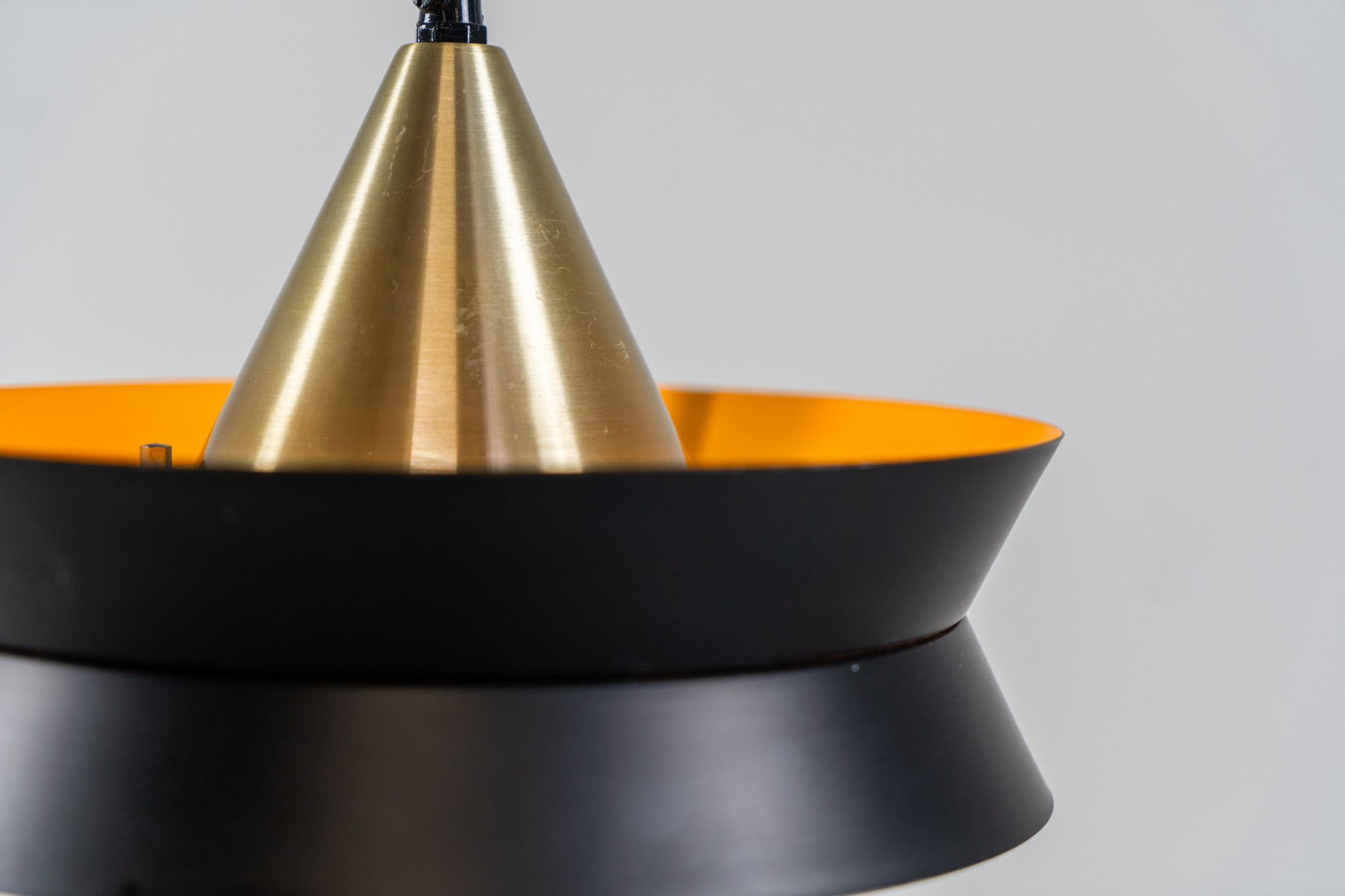 This striking mid-century lamp showcases a sophisticated blend of geometric lines and warm metallic tones. Its layered design, combining matte black and brass with a subtle orange interior, creates a stunning interplay of light and shadow.