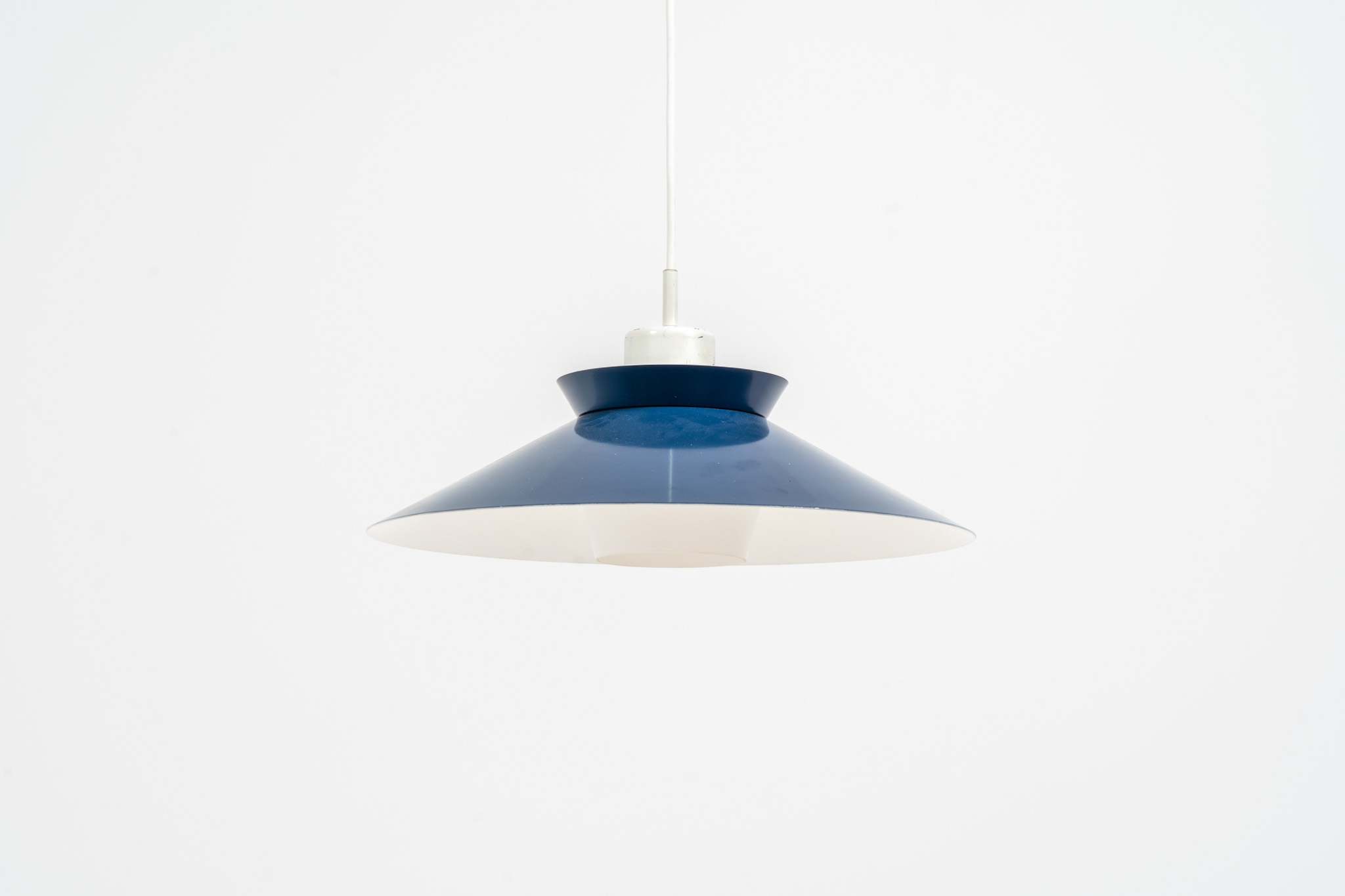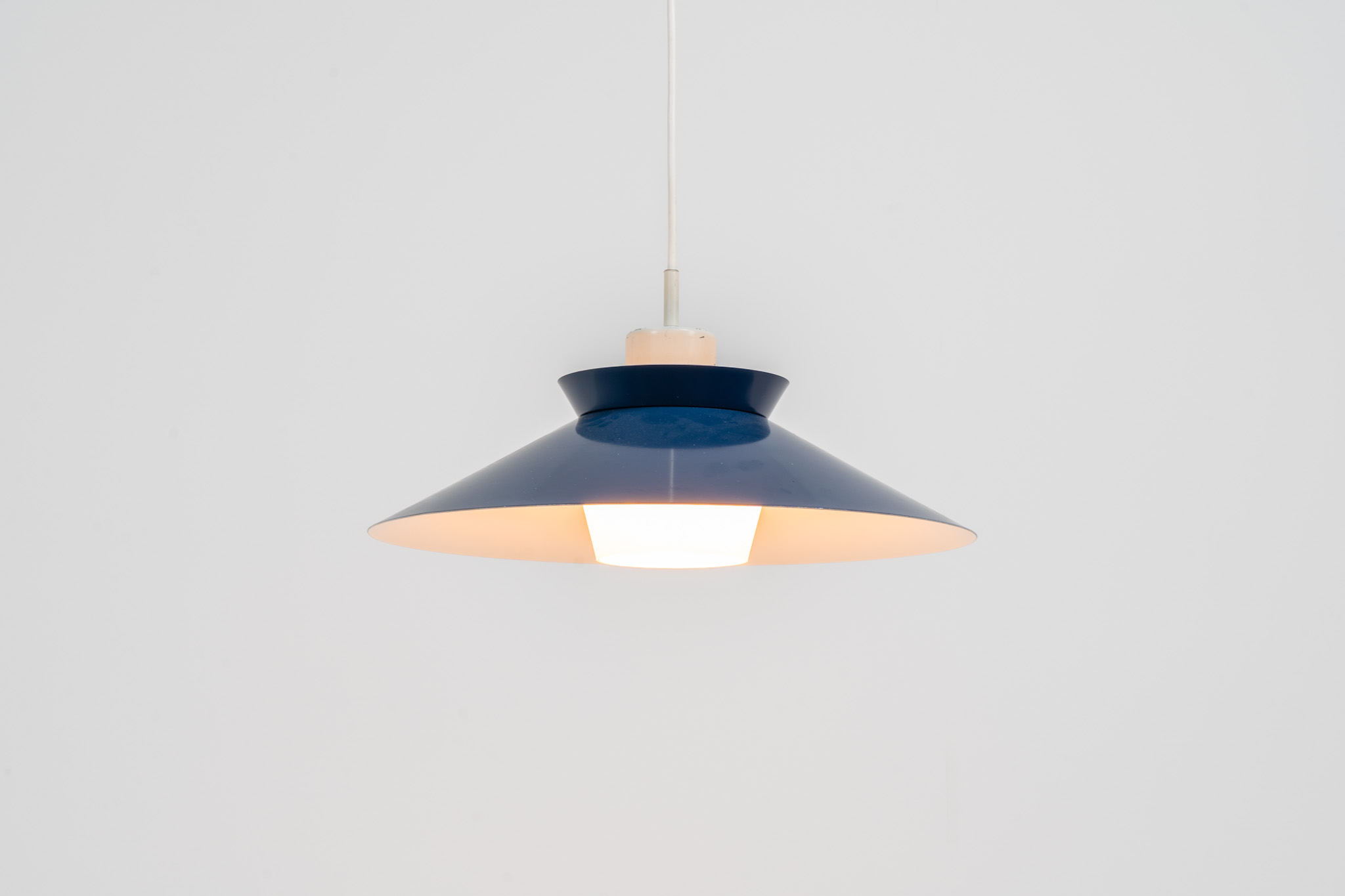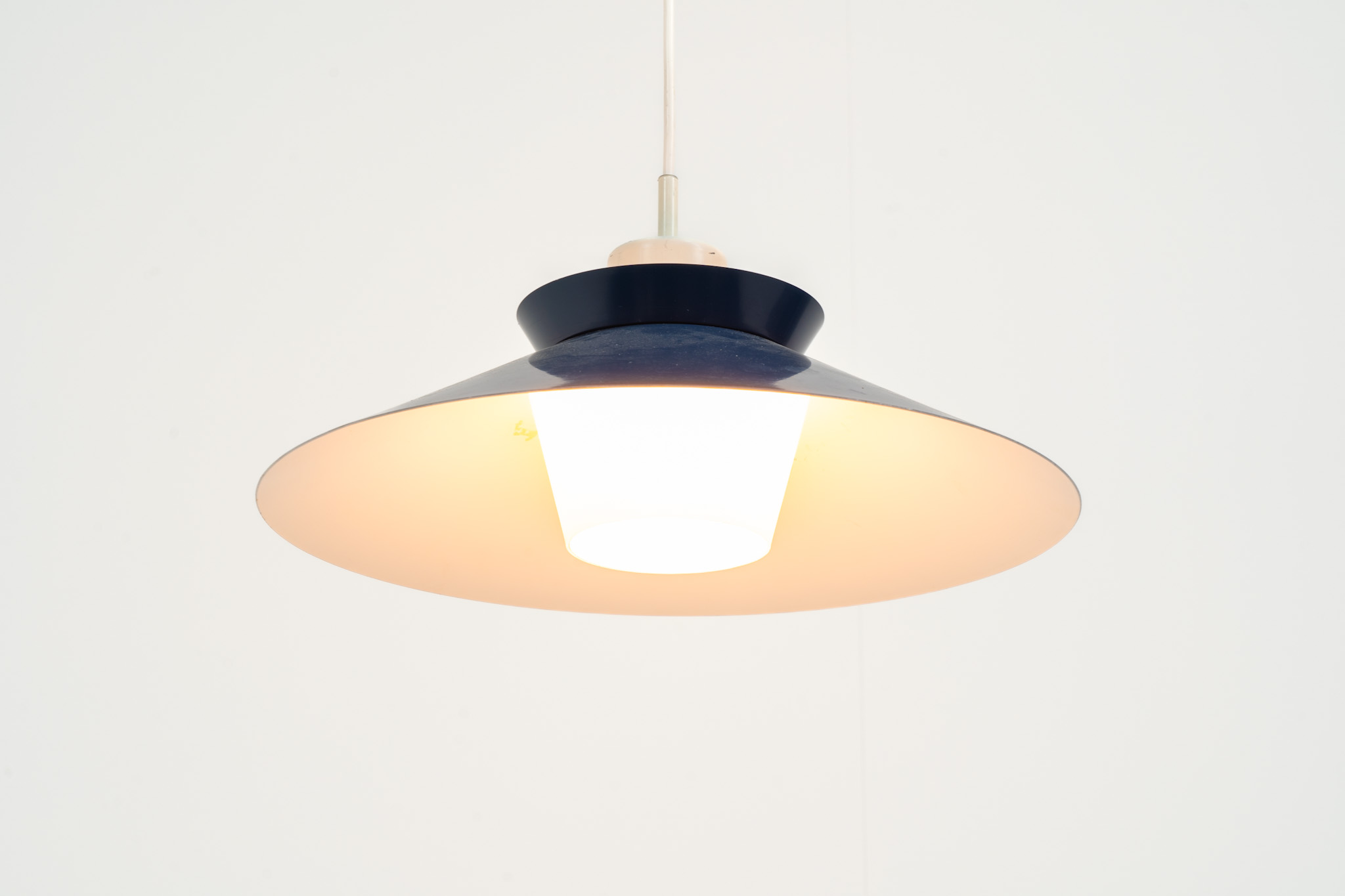 A beautiful and simple lamp made out of an opaline glass body and an aluminium lamp shade, blue on the outside, white on the inside.