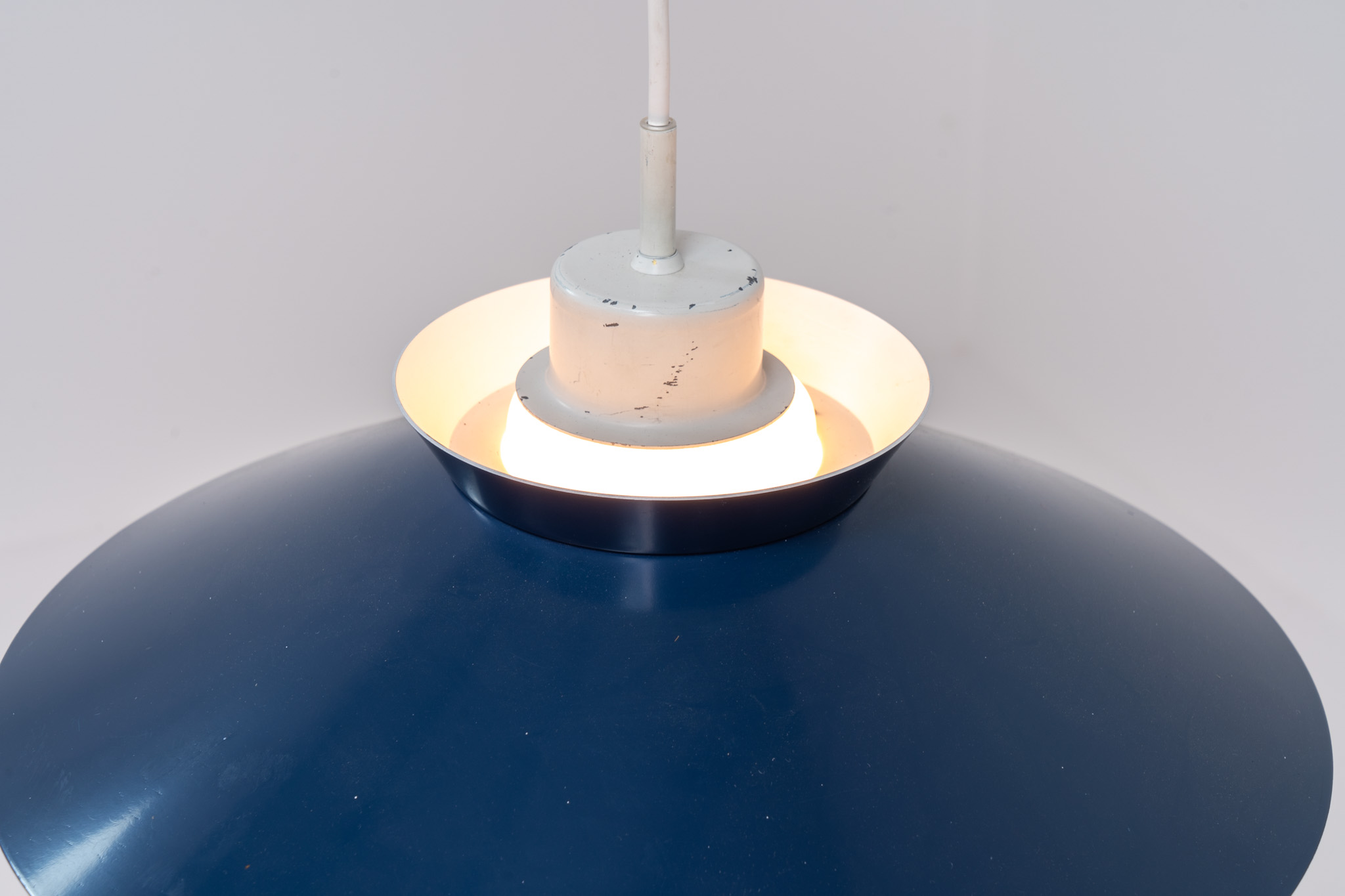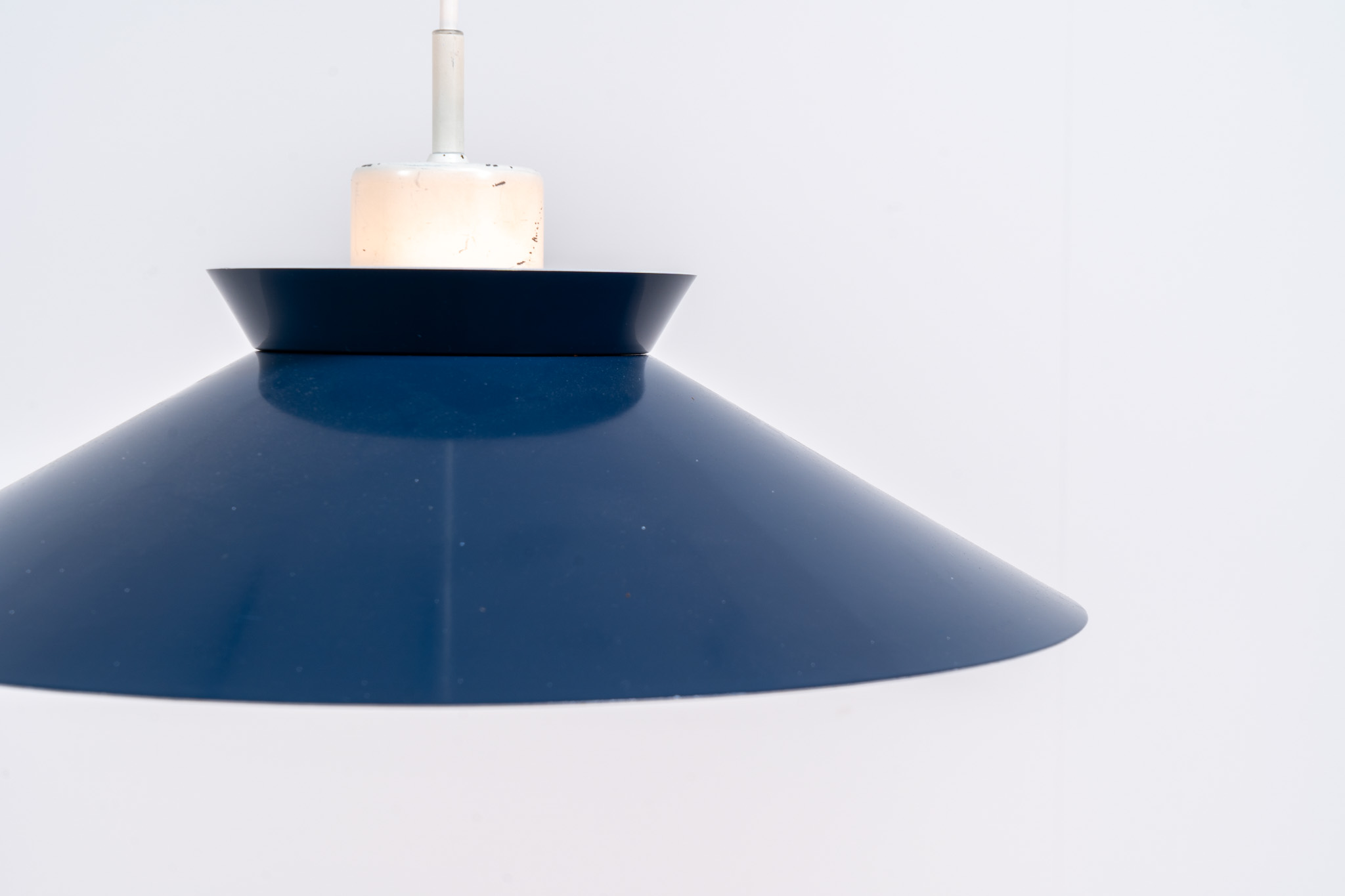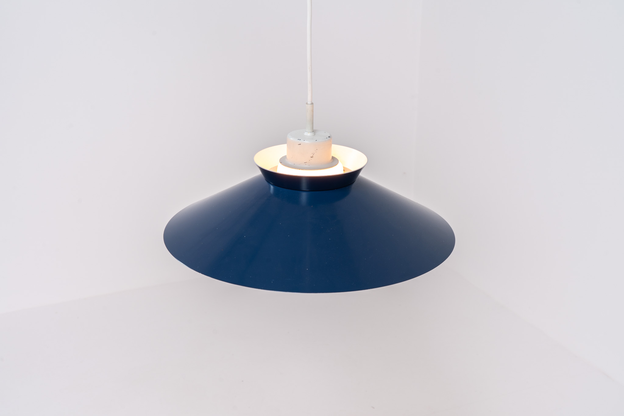 A beautiful and simple lamp made out of an opaline glass body and an aluminium lamp shade, blue on the outside, white on the inside.